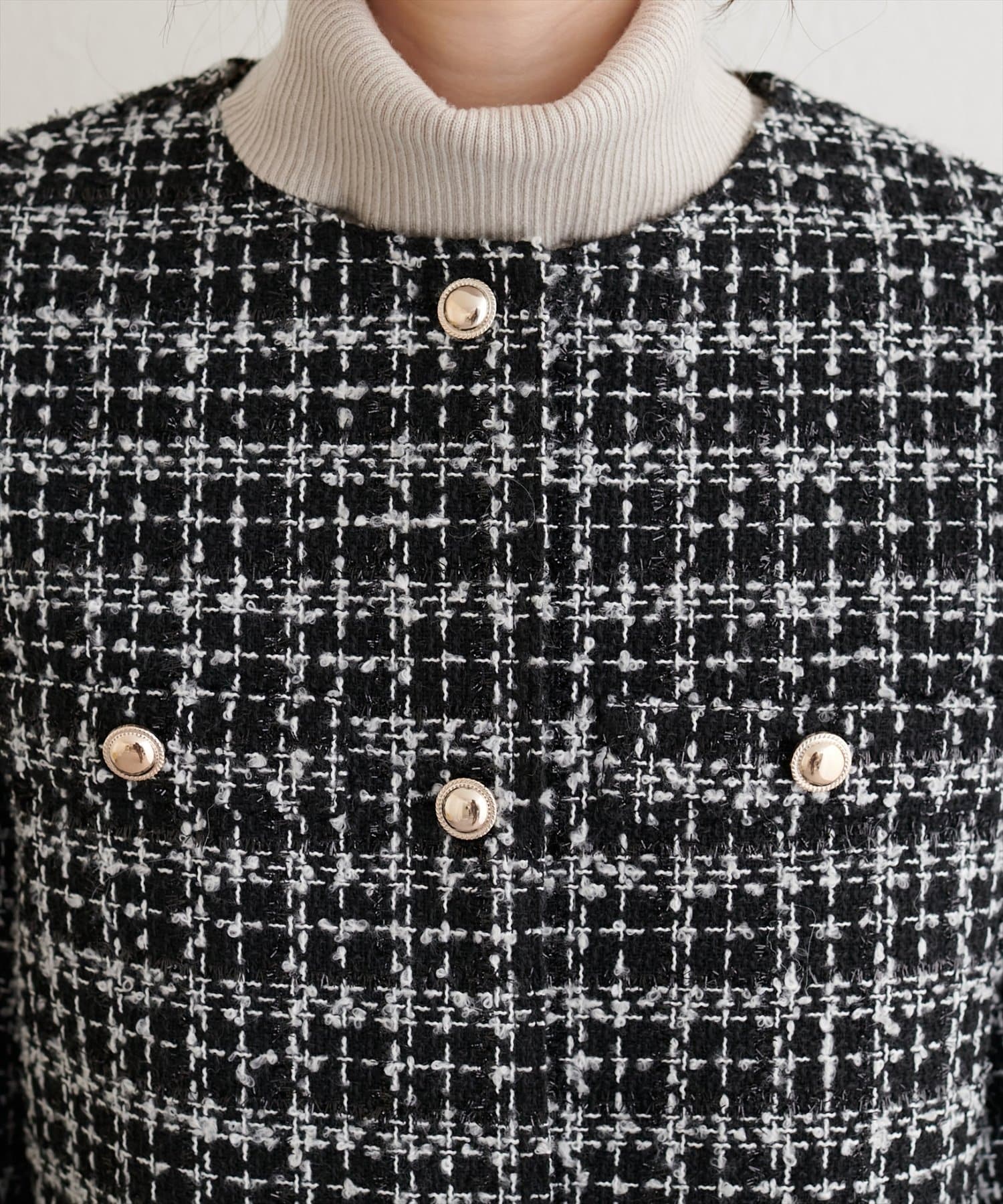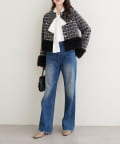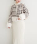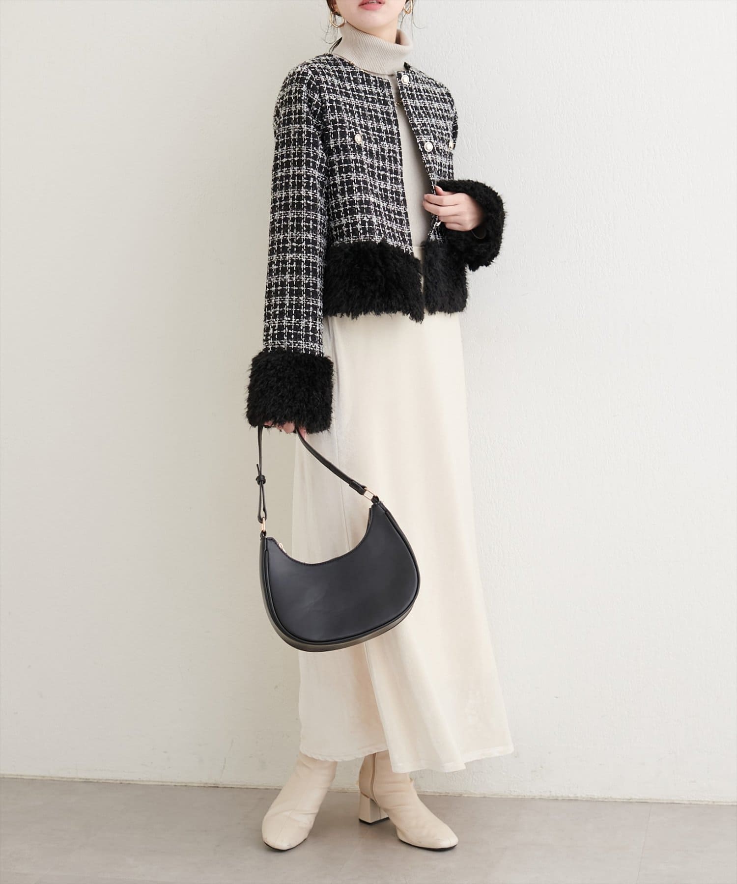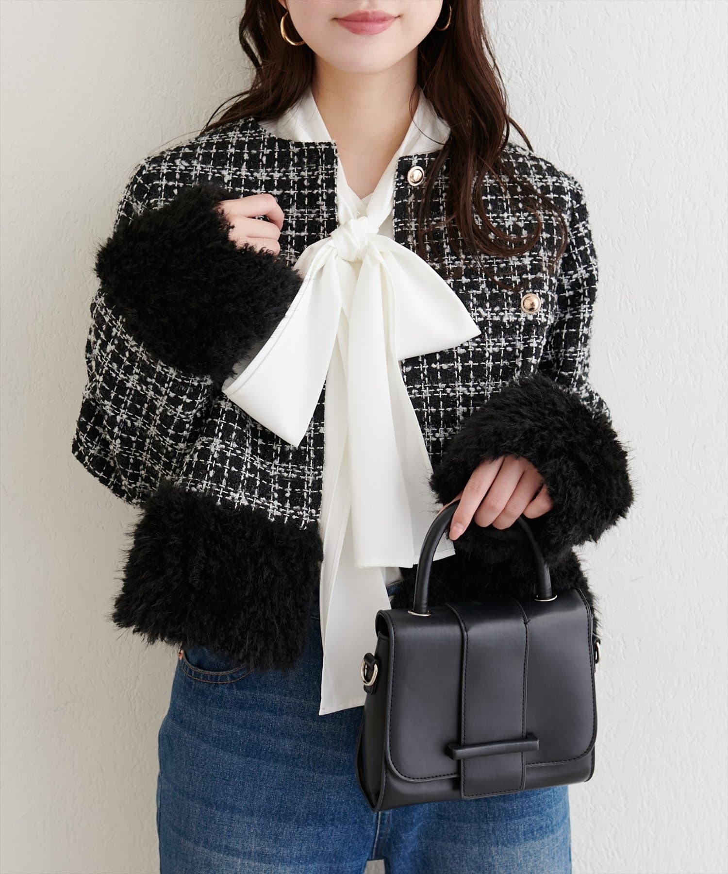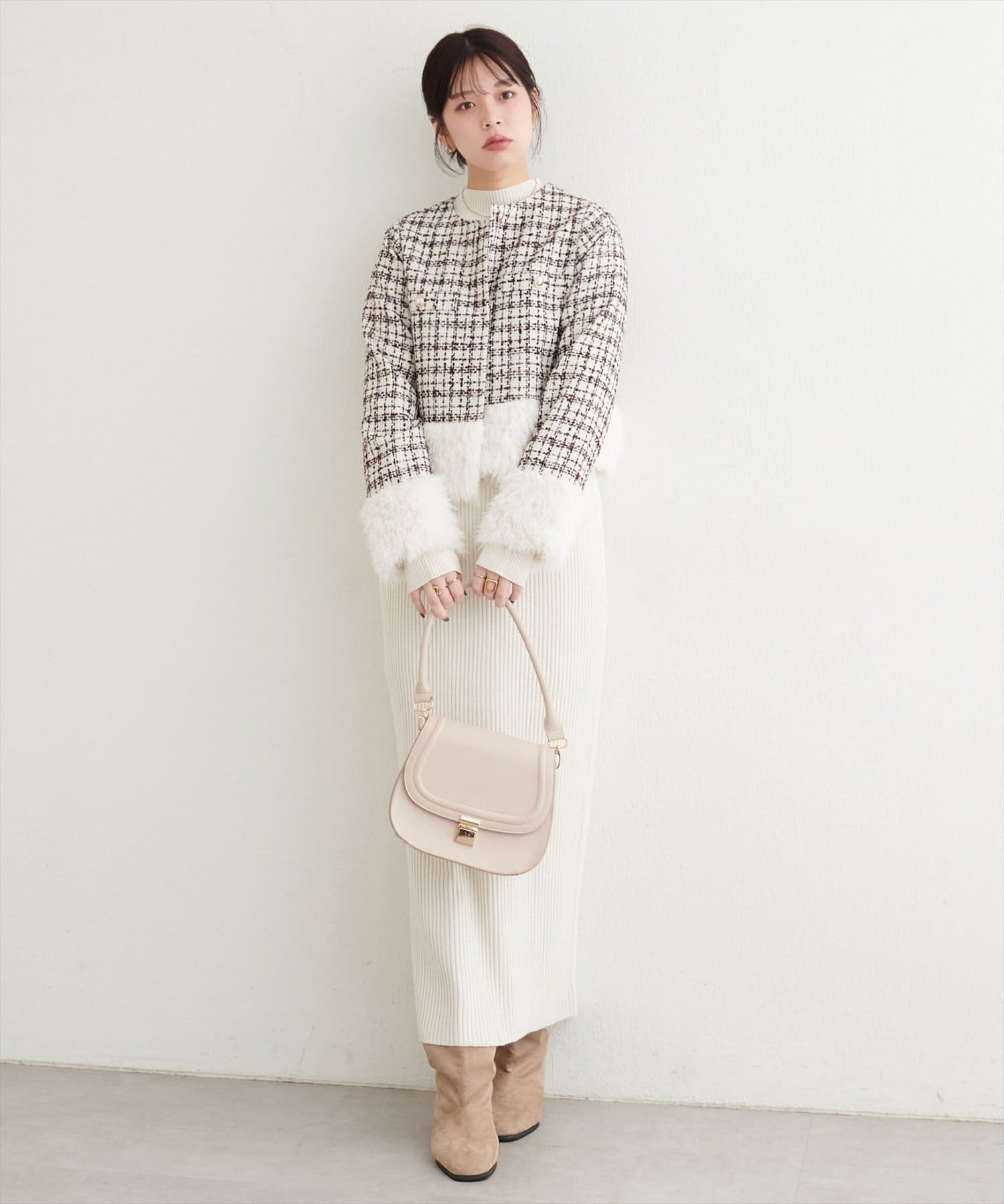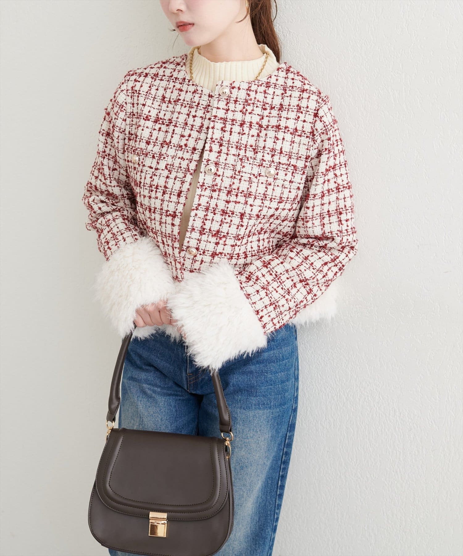 品の良いツイード生地に、裾と袖口にあしらわれたシャギーファーが、フェミニンで華やかな印象を与えます。