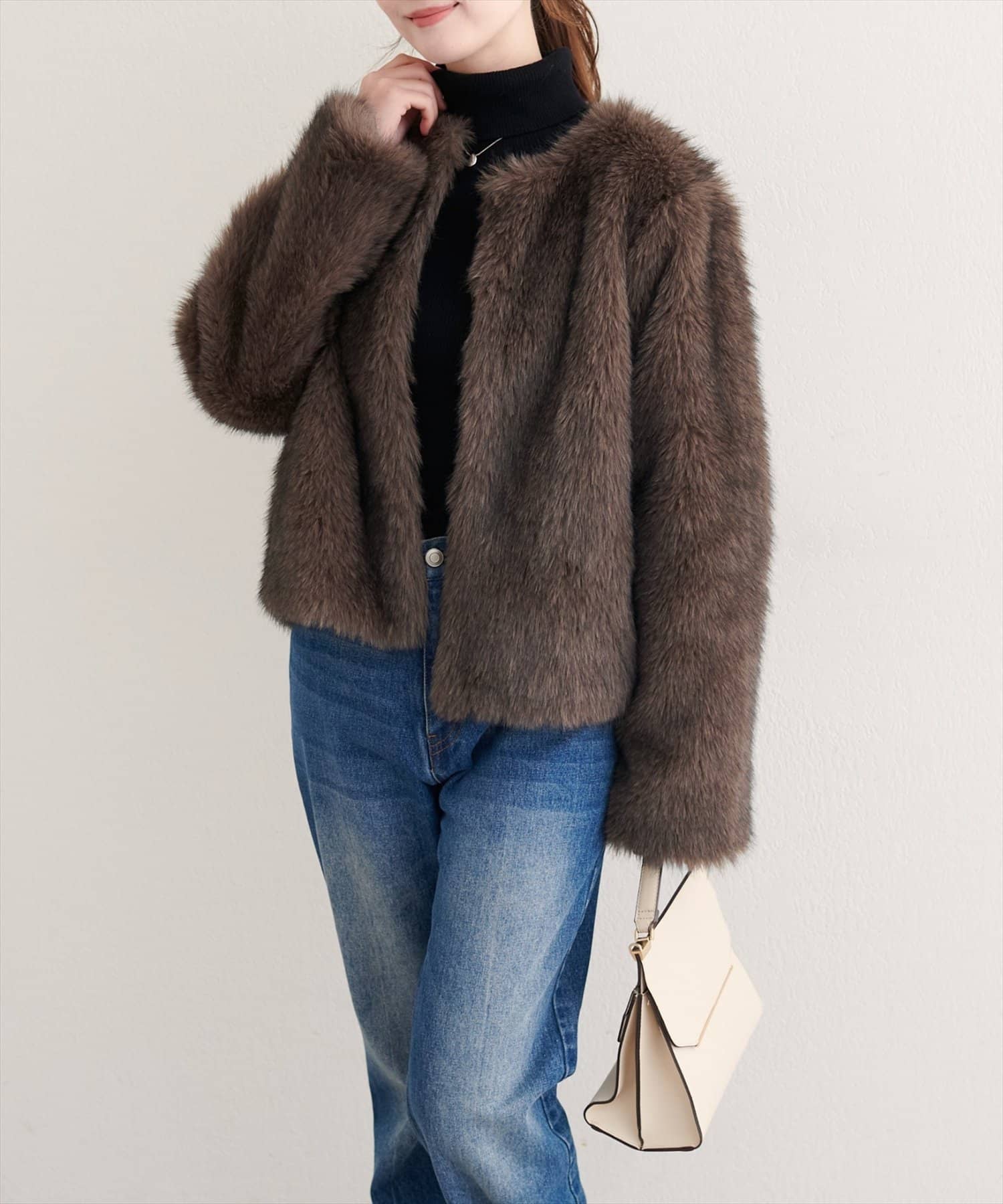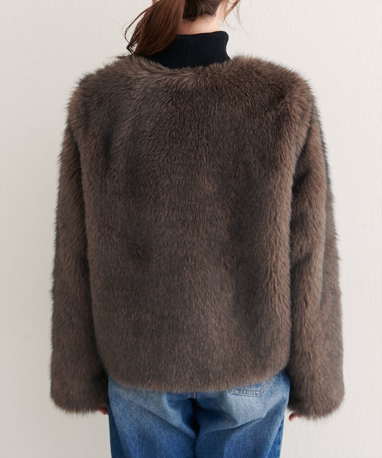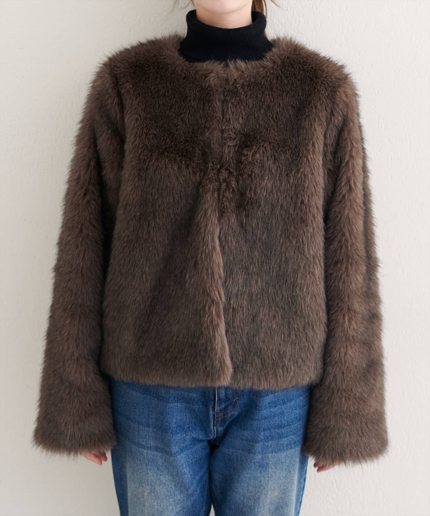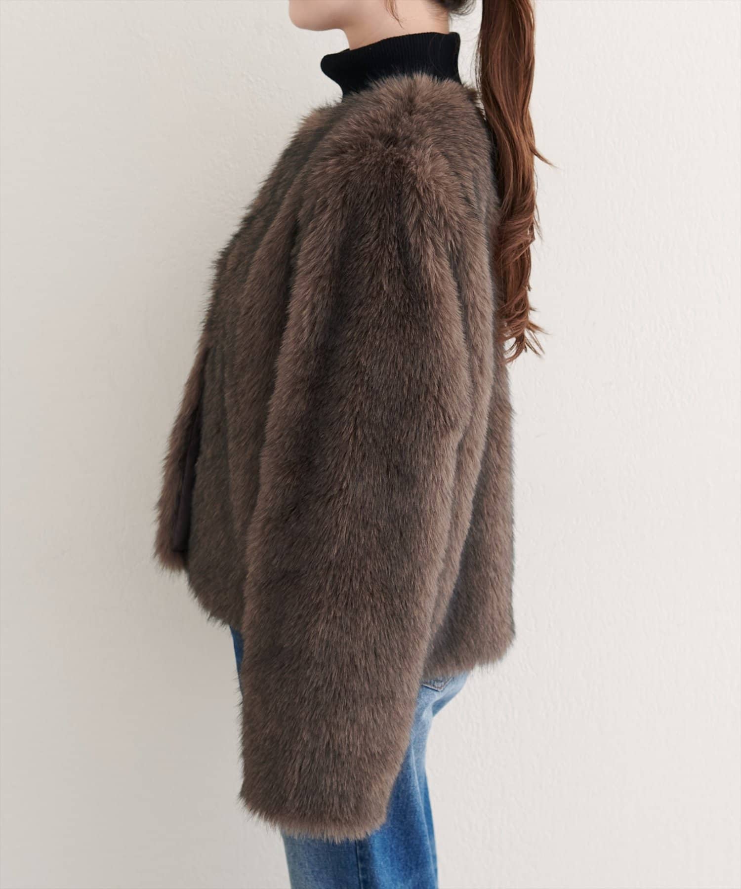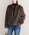 ふんわりとした柔らかな手触りが魅力の、ノーカラーファージャケット。