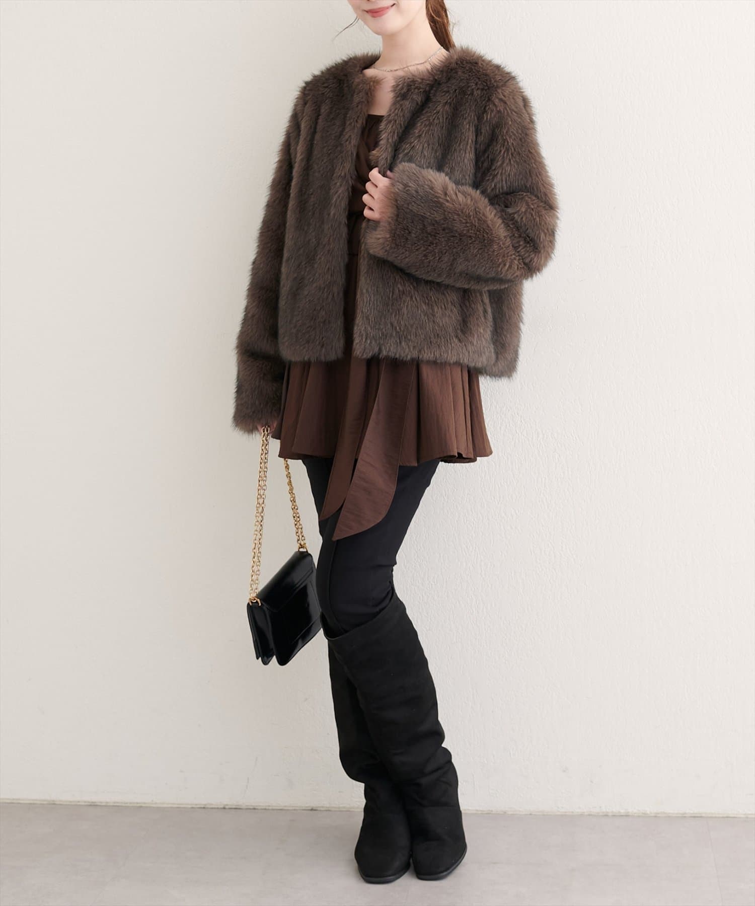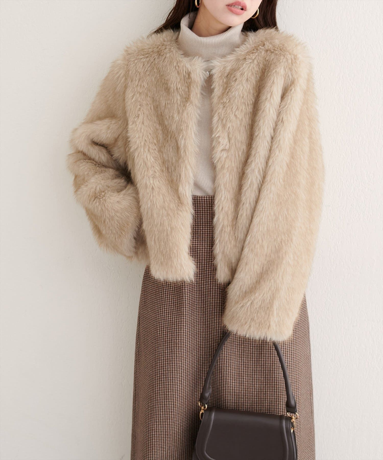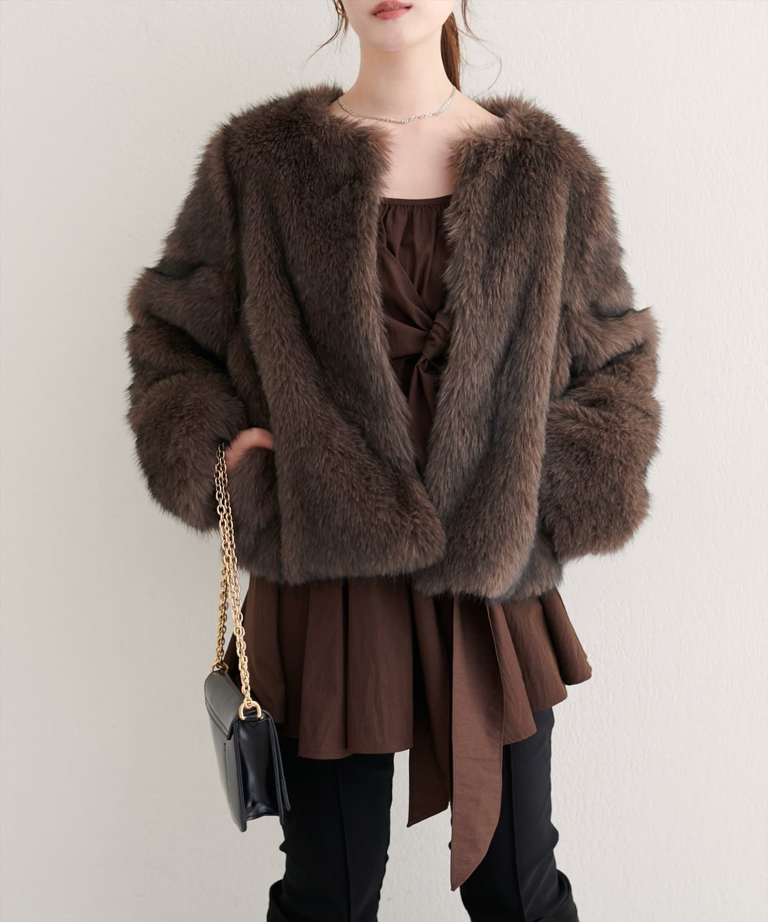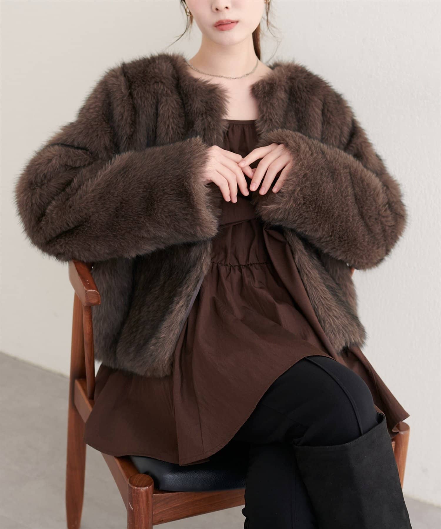 ふんわりとした柔らかな手触りが魅力の、ノーカラーファージャケット。