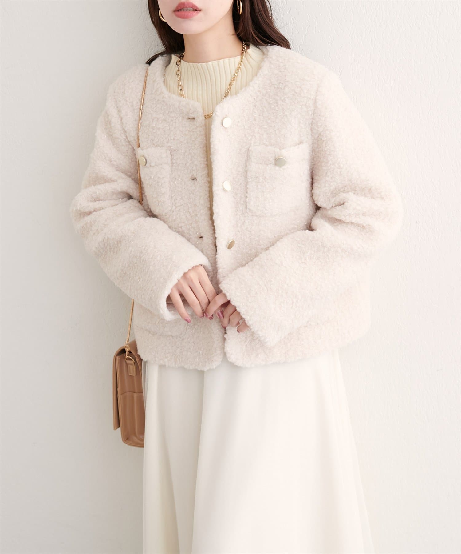 表地には、ふんわりとした柔らかなボア素材を使用。見た目にも暖かく、着心地も抜群です。