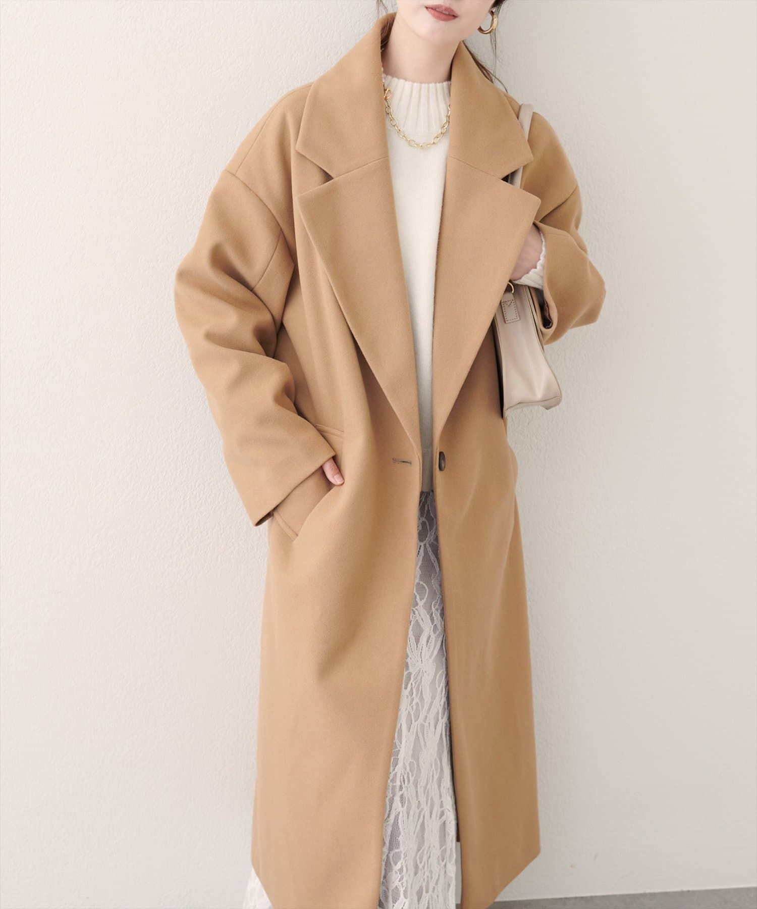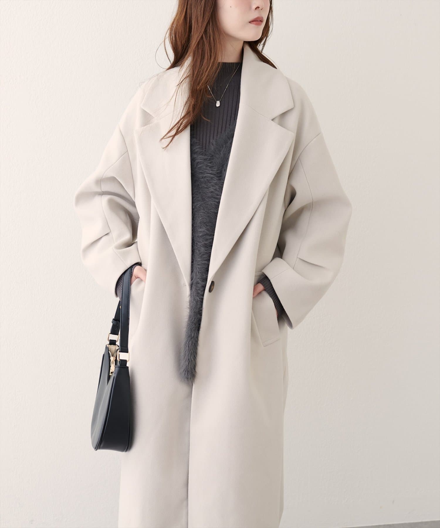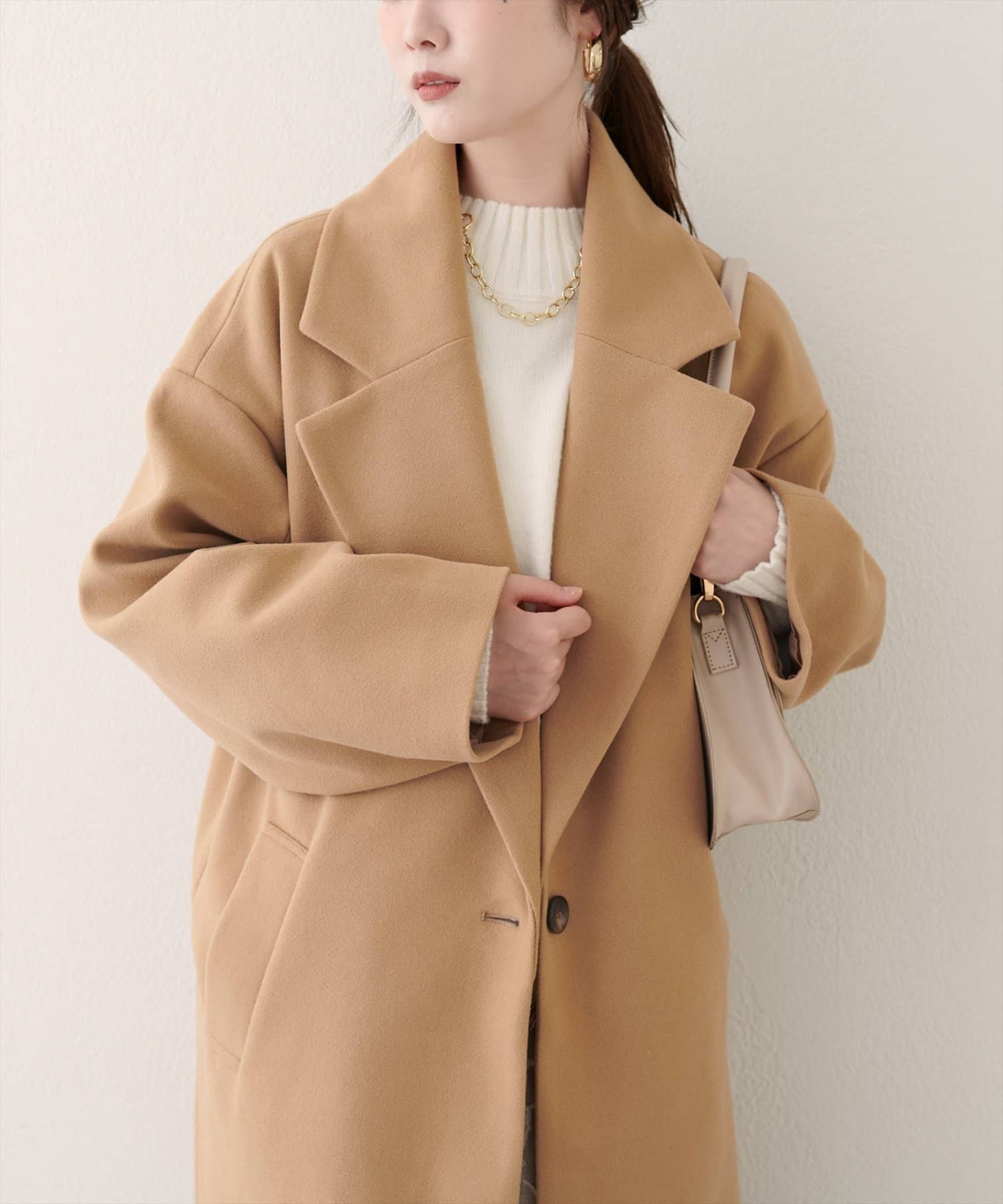 大きめの襟は顔周りをすっきりと見せ、小顔効果も期待できます。