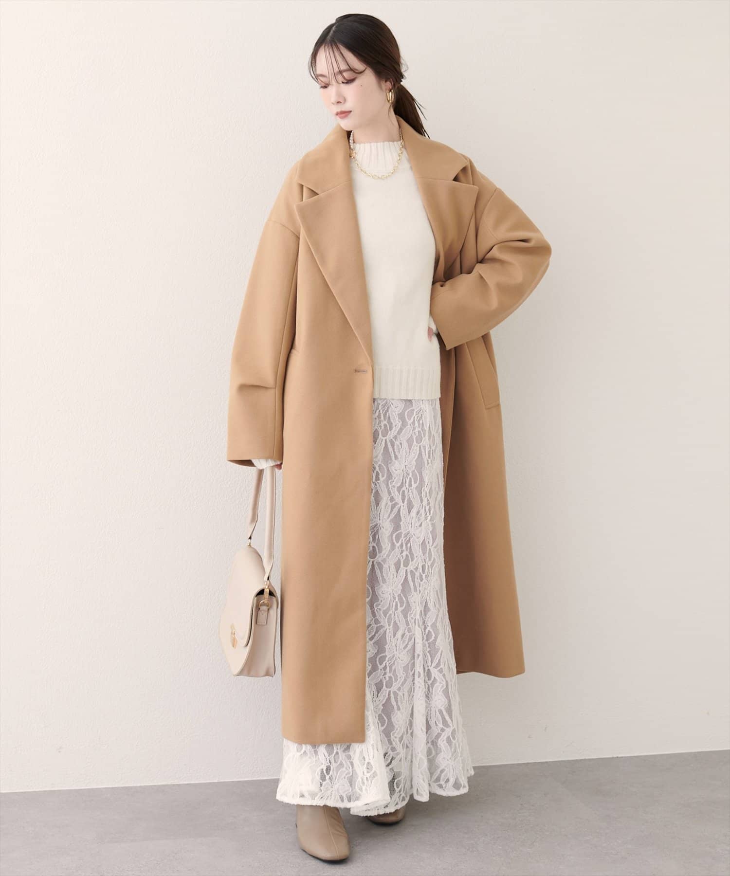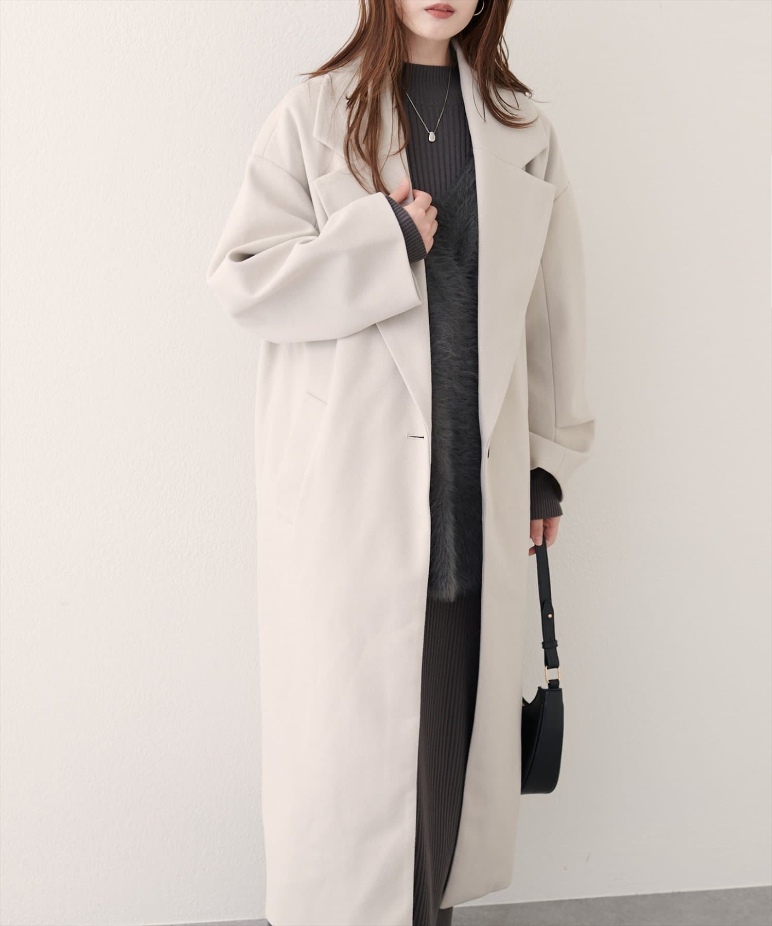 流れるようなロング丈のシルエットが、優雅で女性らしい印象を与えます。