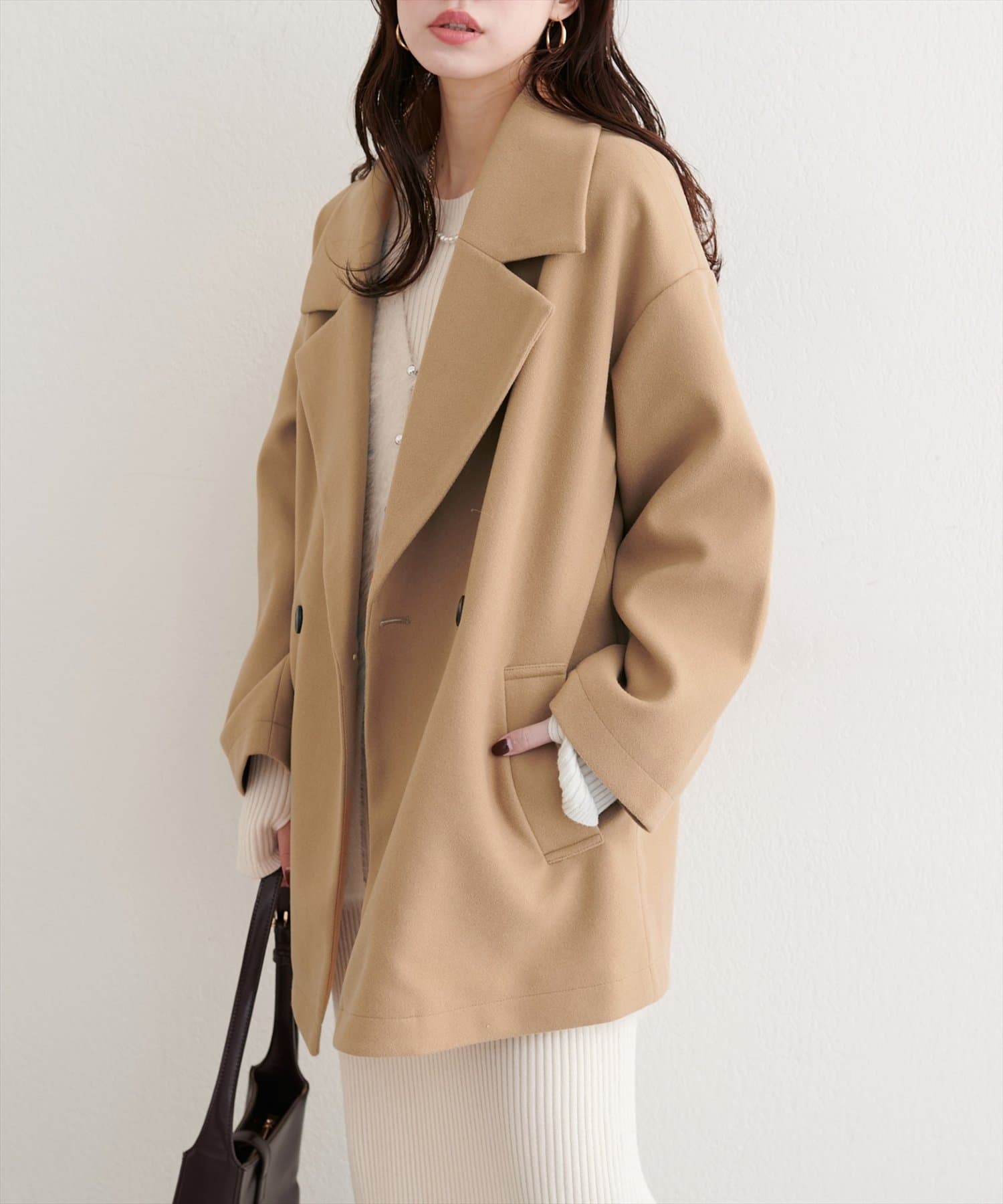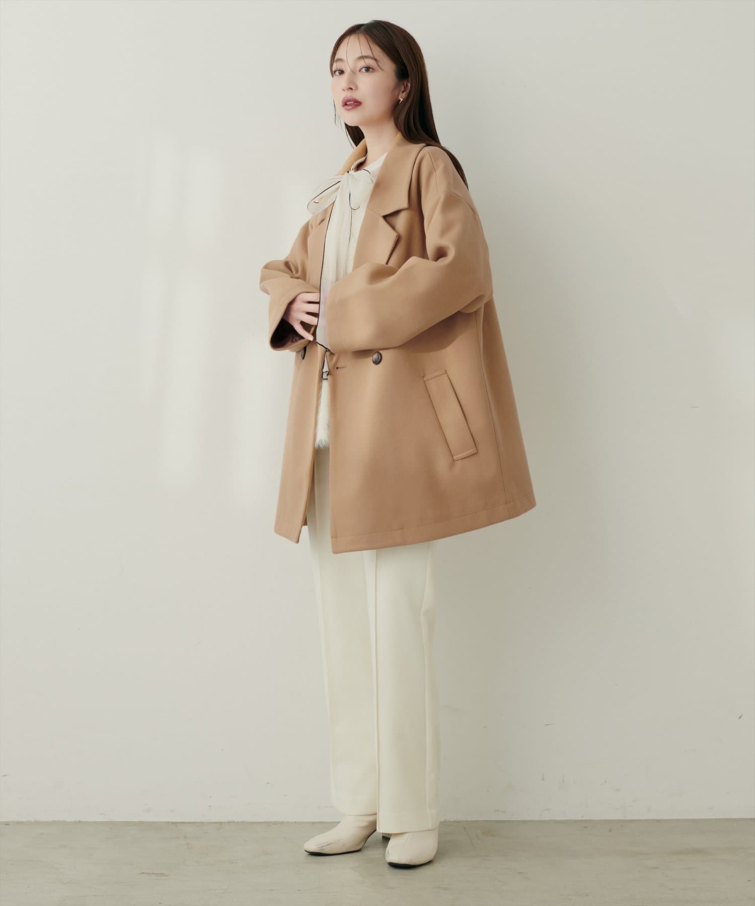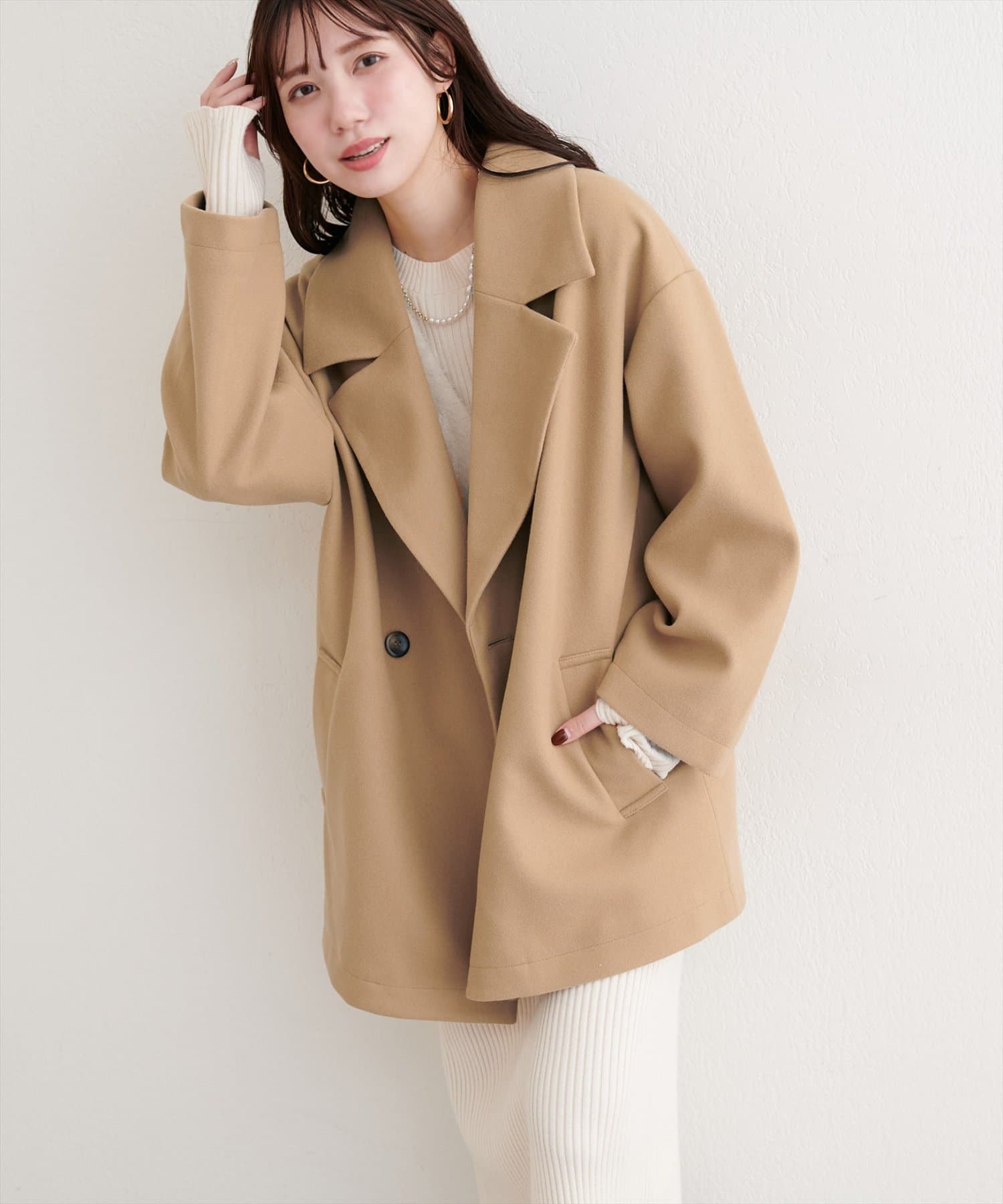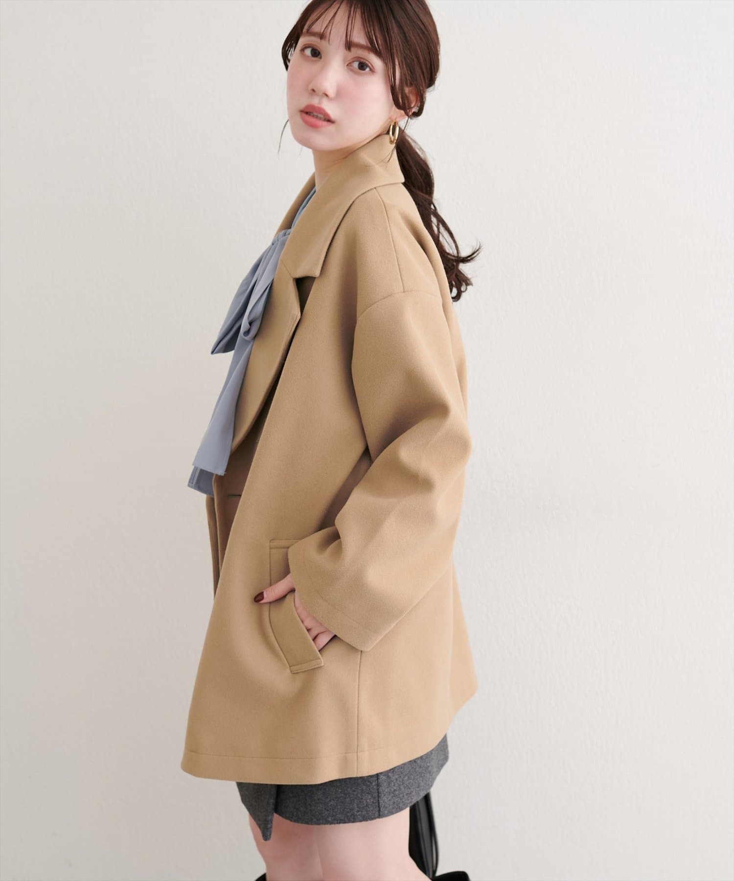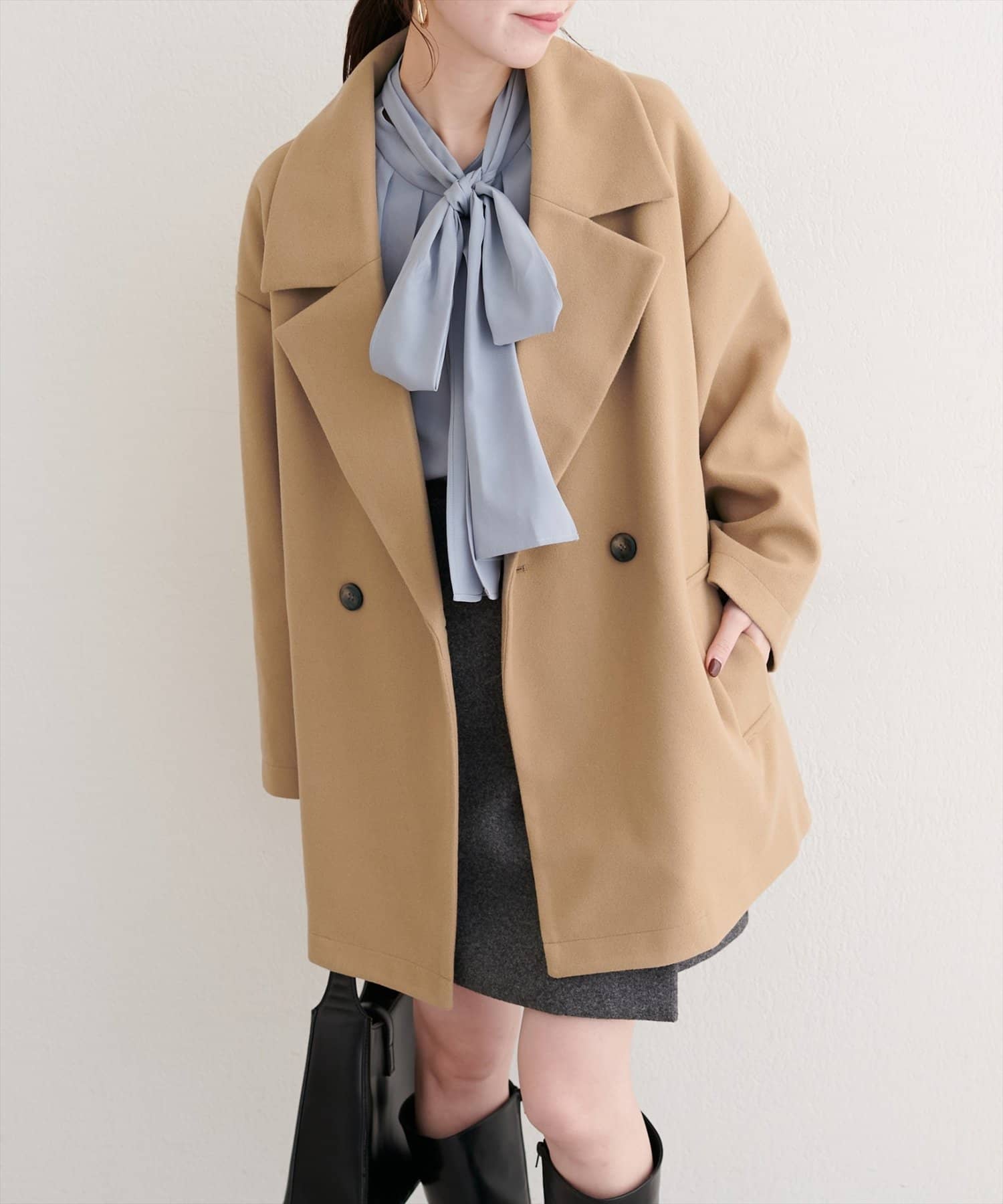 クラシカルなテーラードカラーが、顔周りをシャープに引き立てます。