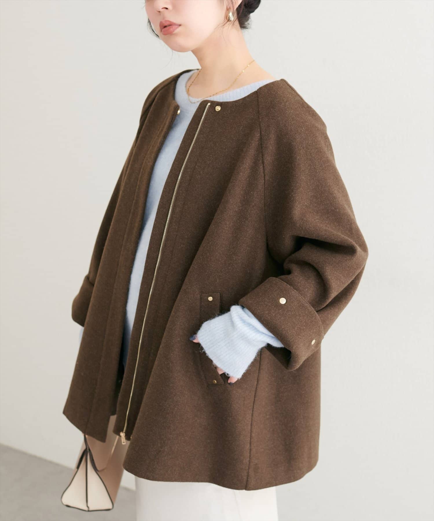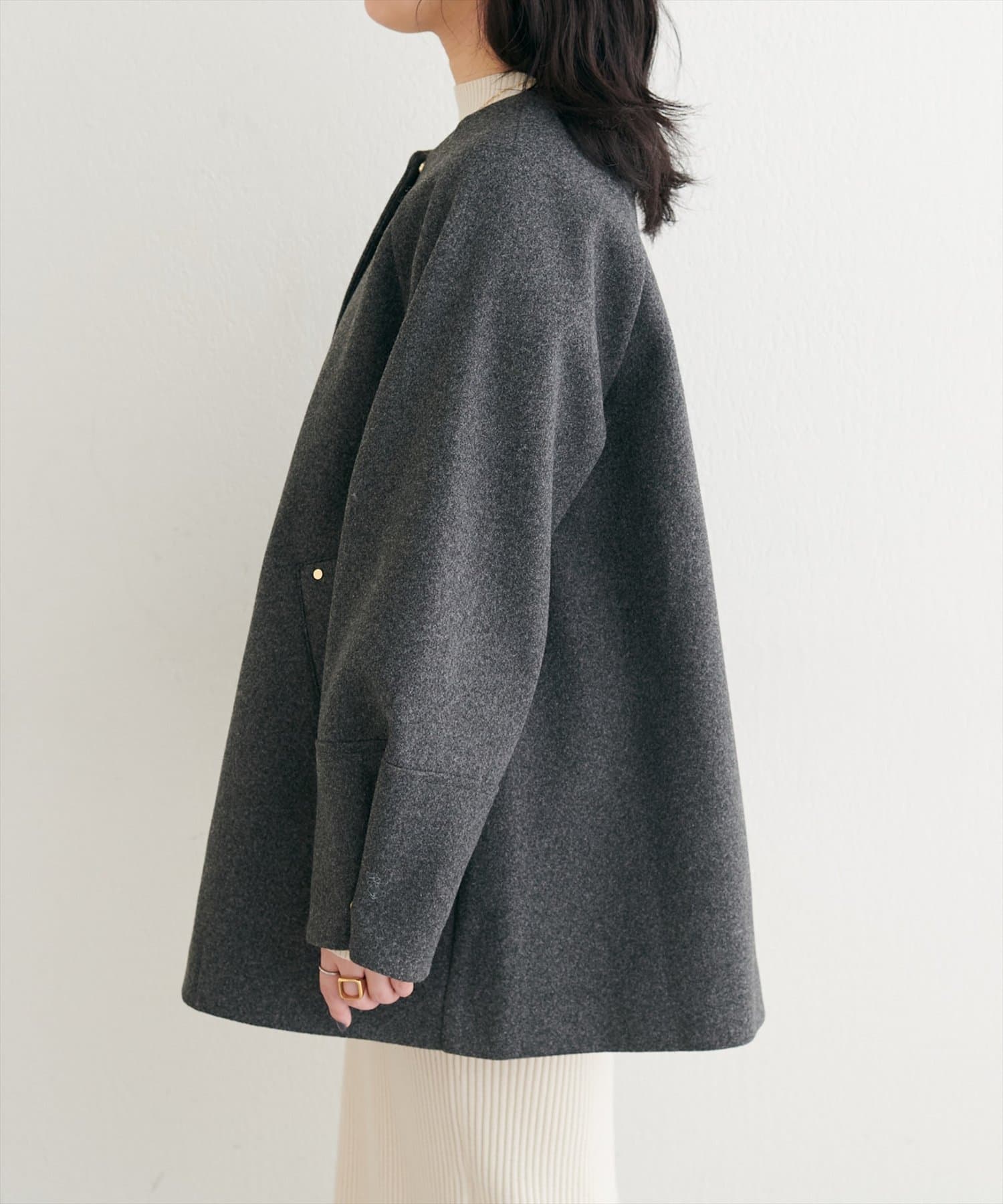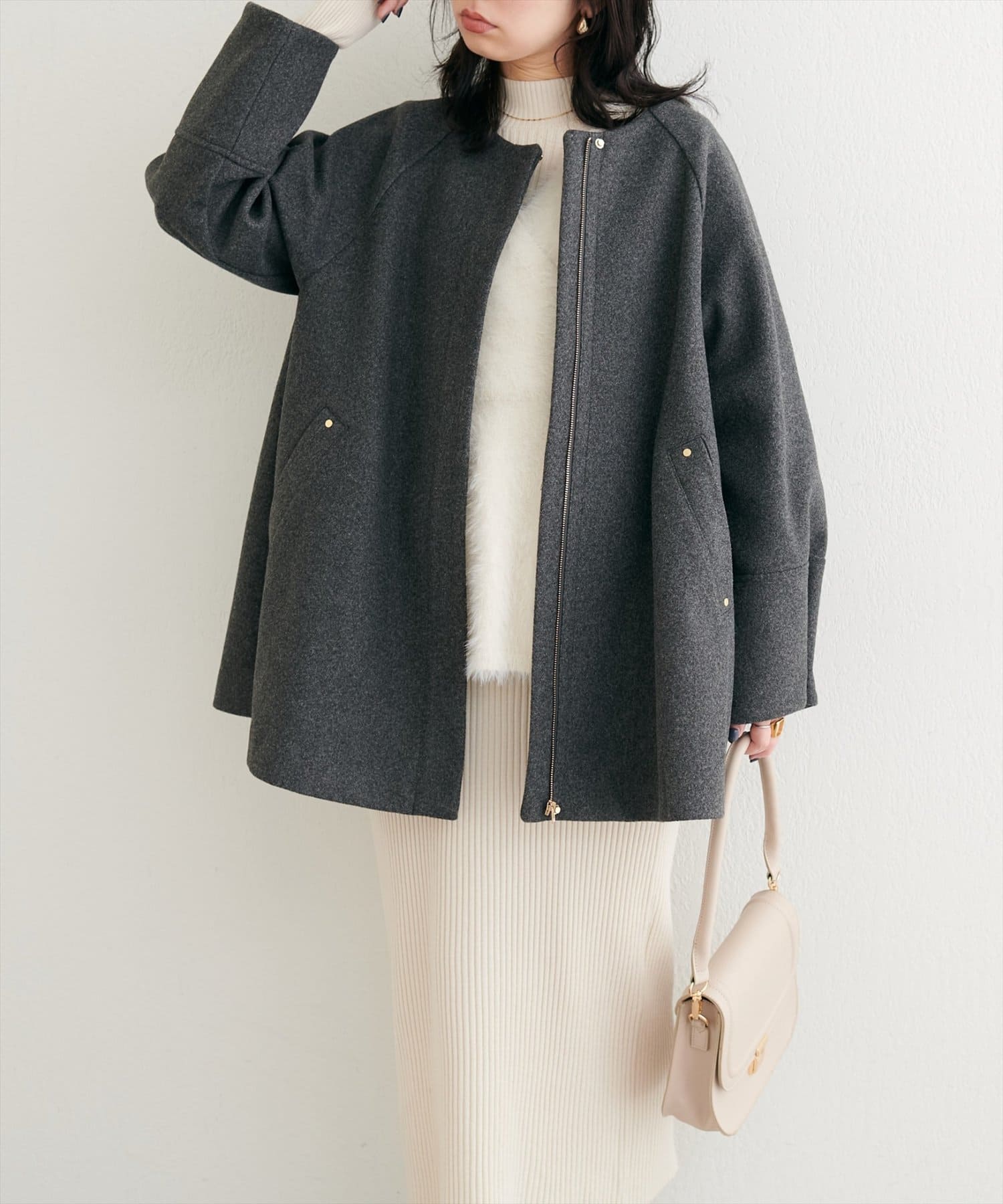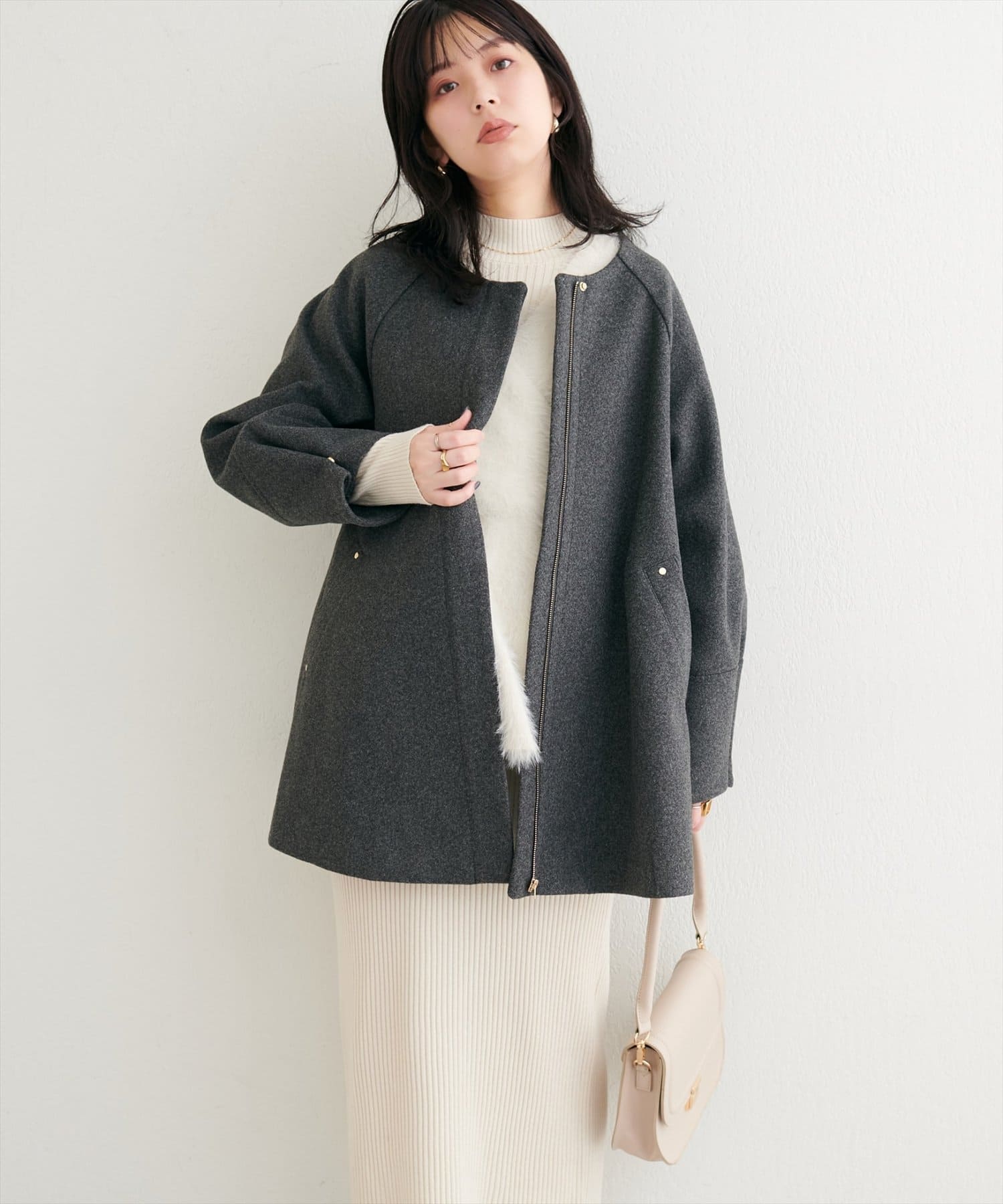 ノーカラー仕様なのでマフラーやストールを合わせてもすっきり見え、首元のアレンジも楽しめます。