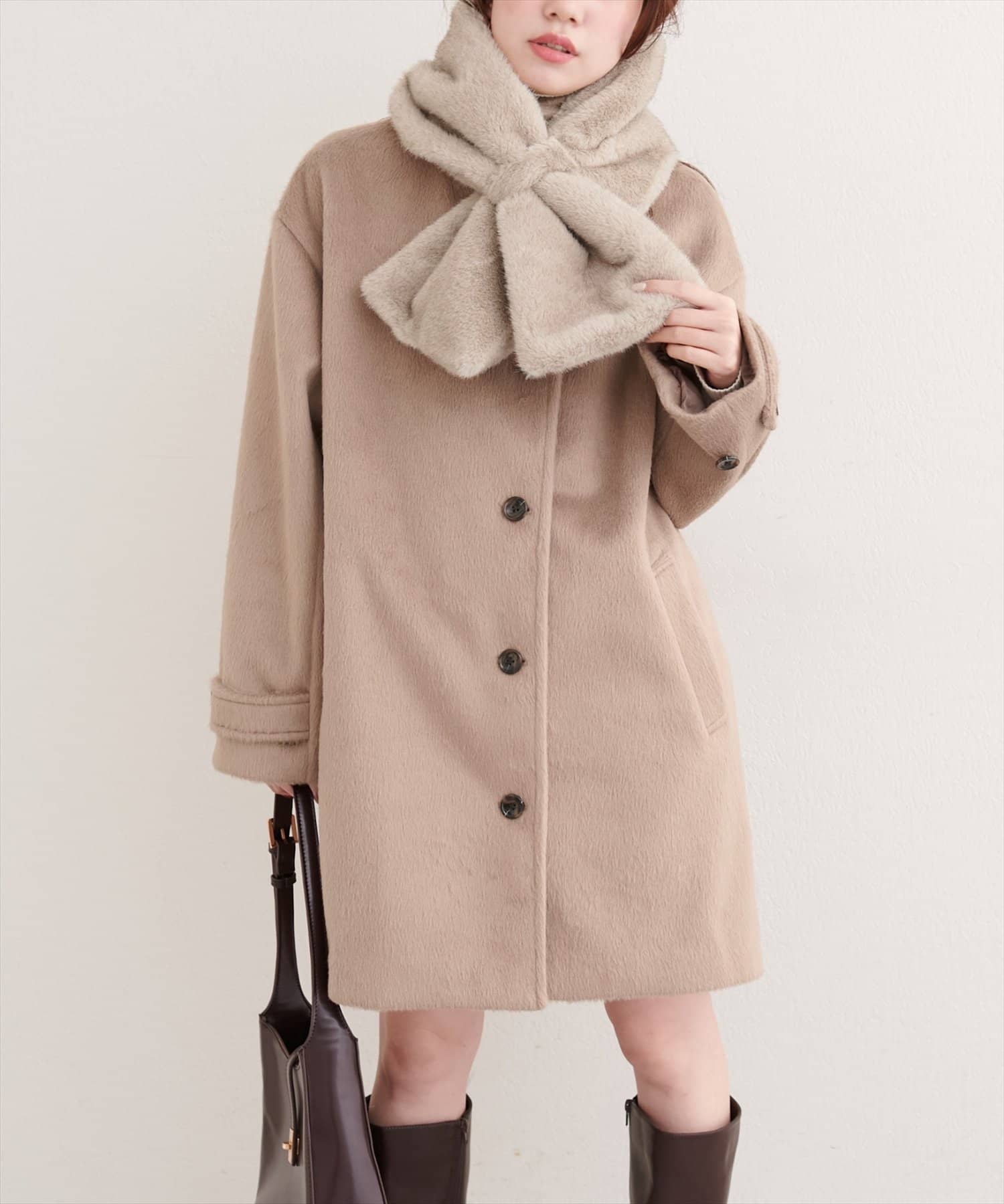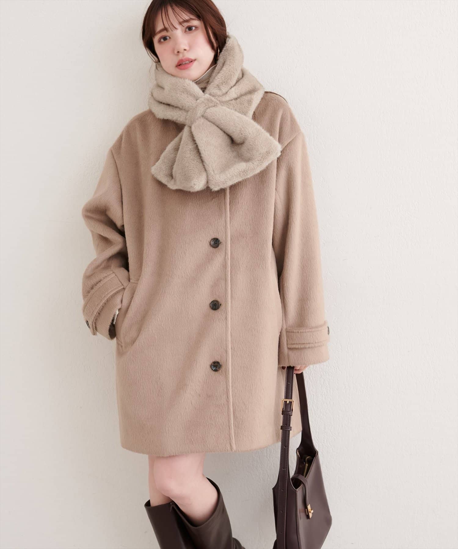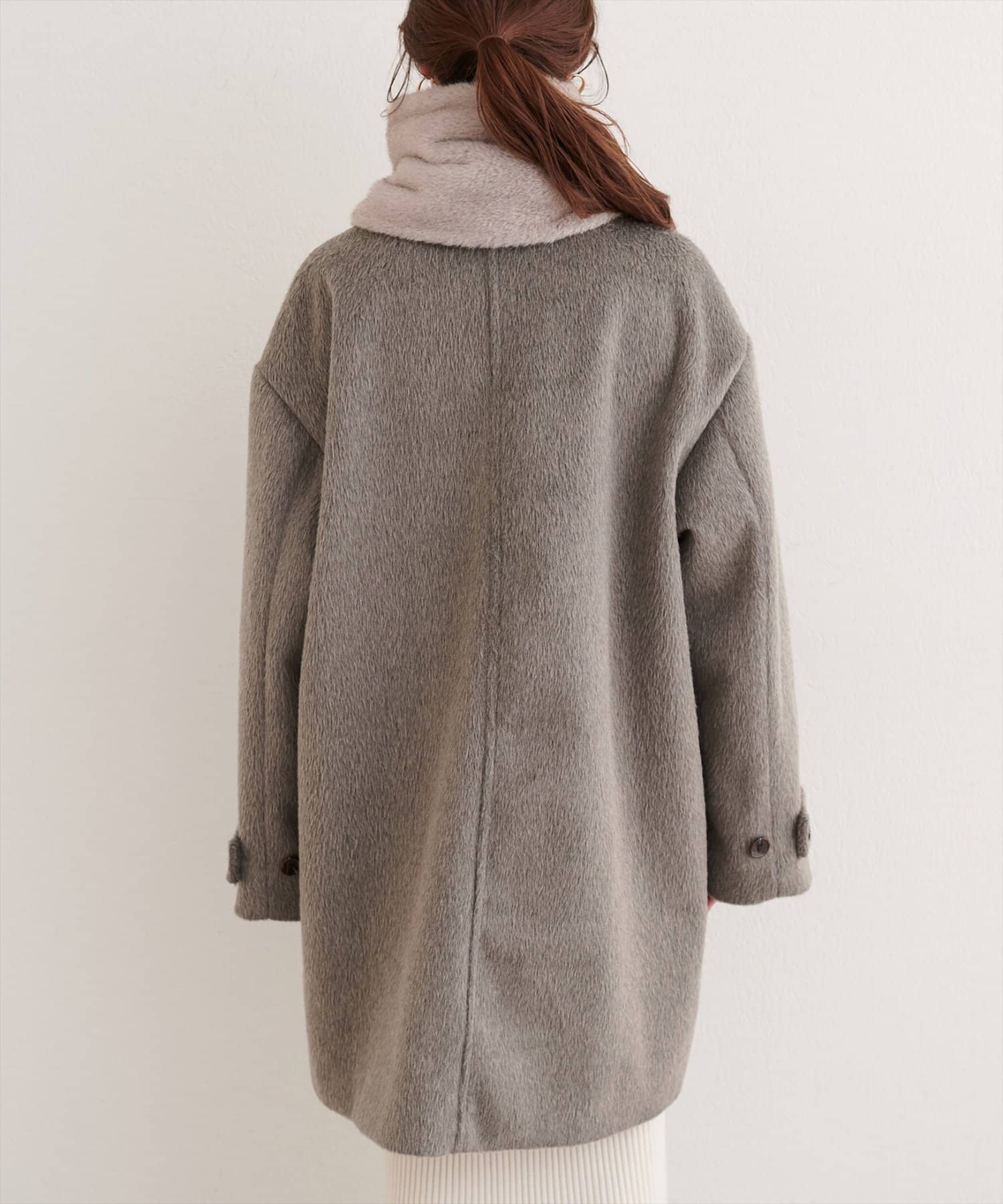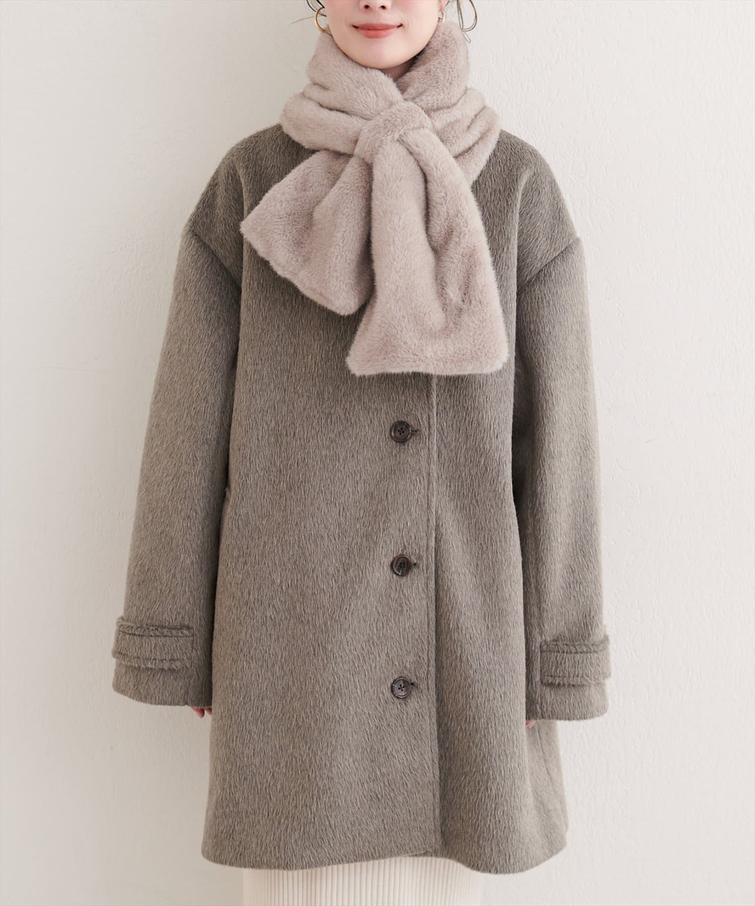 ティペットを外せば、シンプルなノーカラーコートとして、すっきりとした印象に。