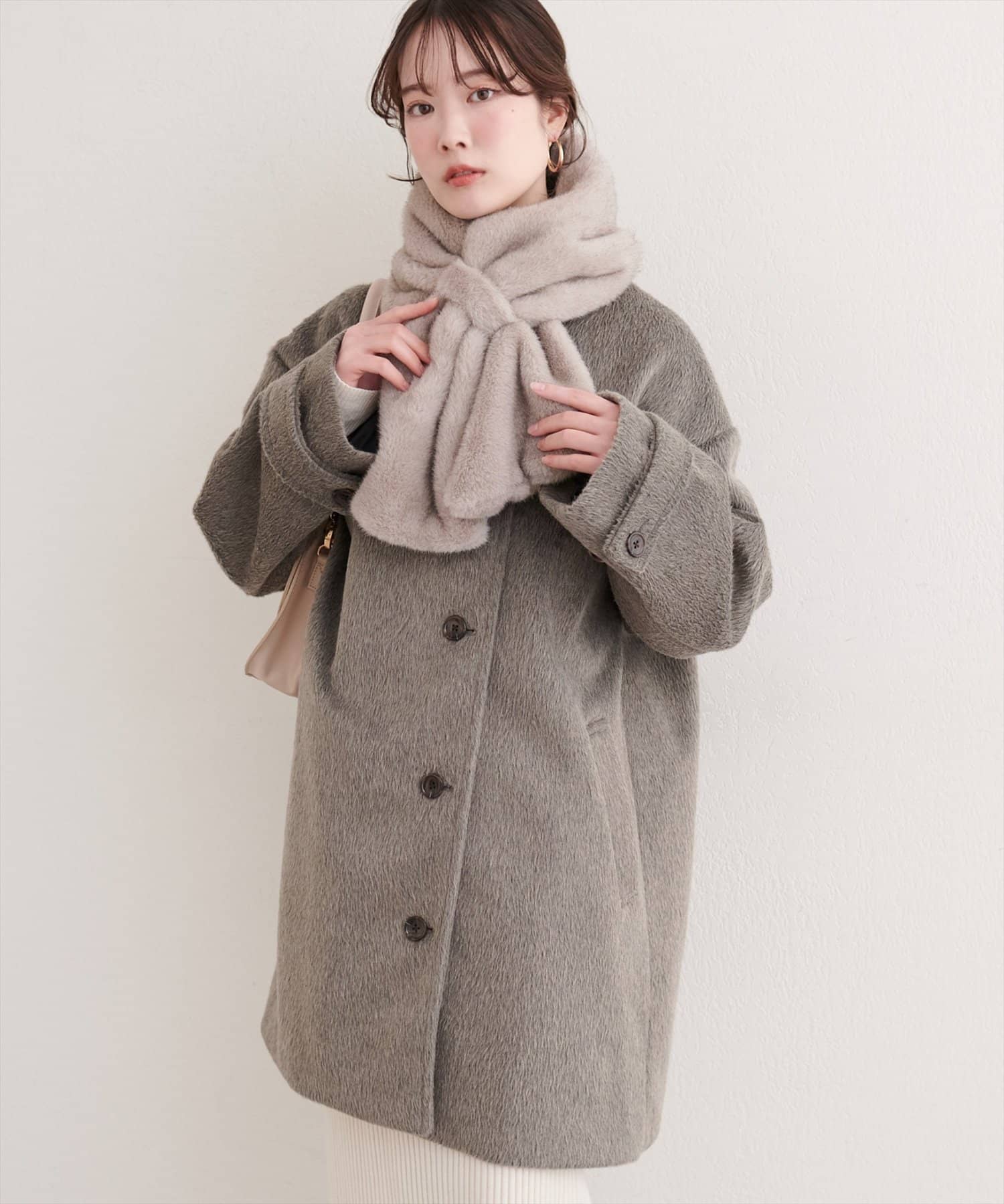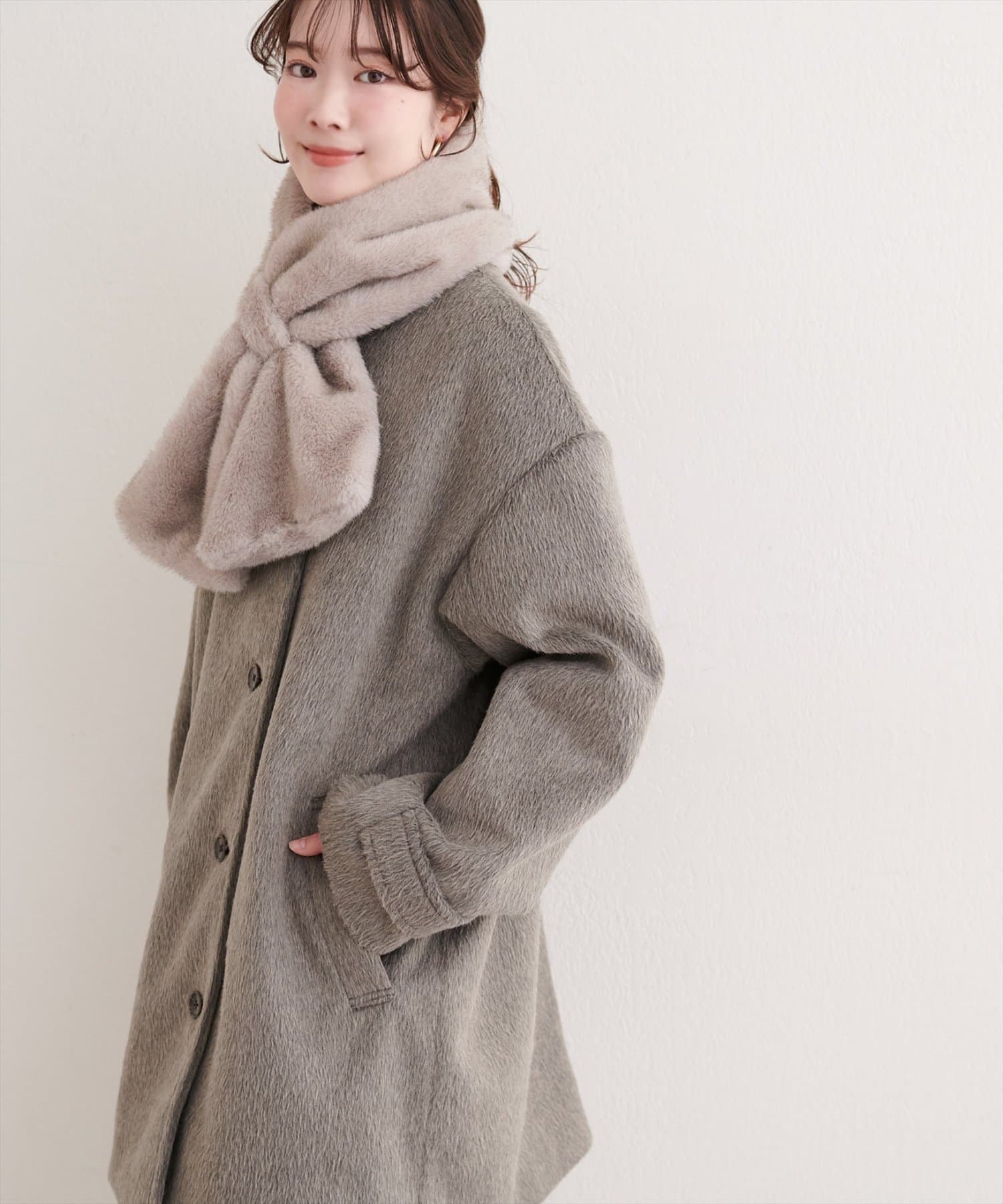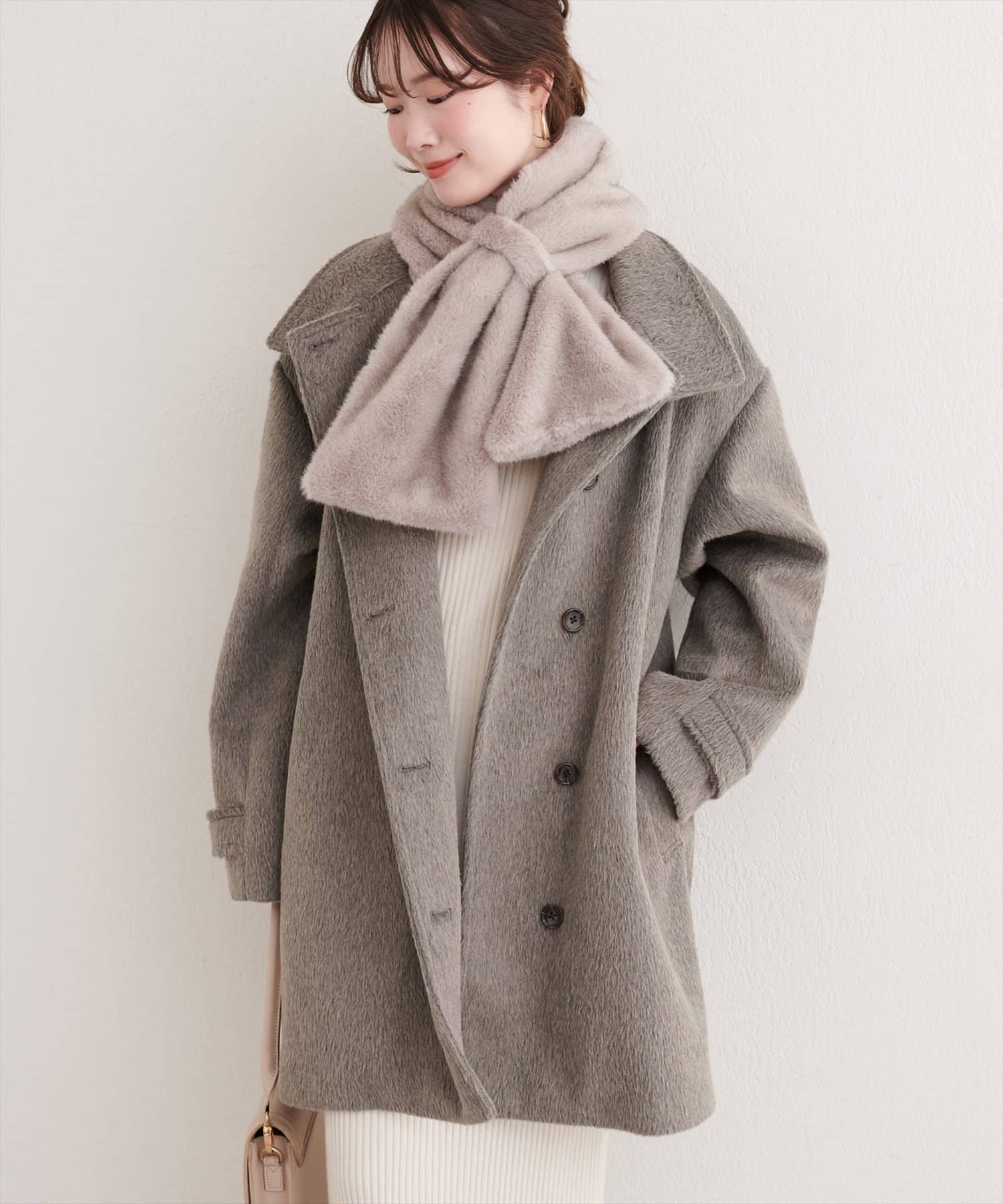 ティペットを外せば、シンプルなノーカラーコートとして、すっきりとした印象に。