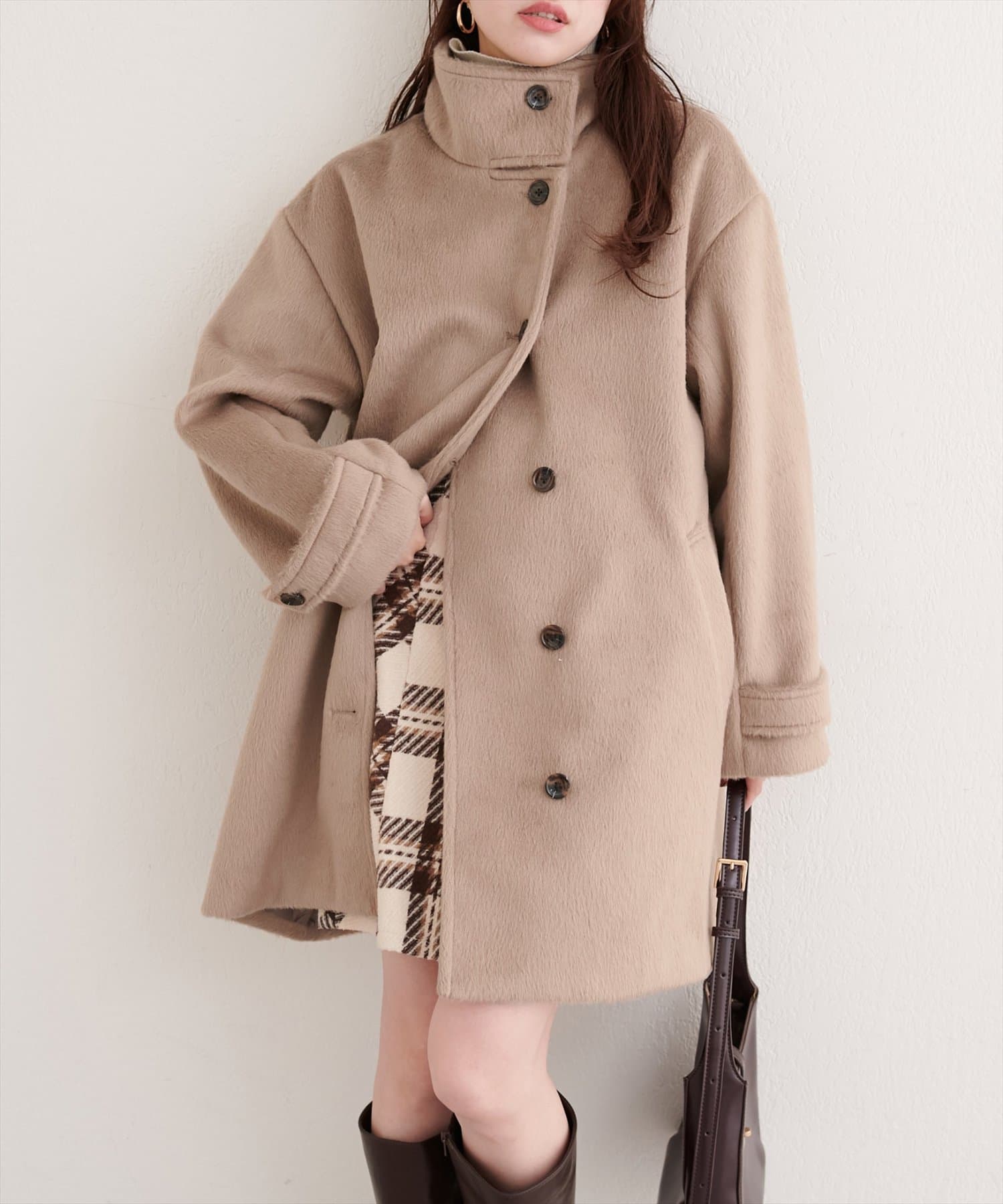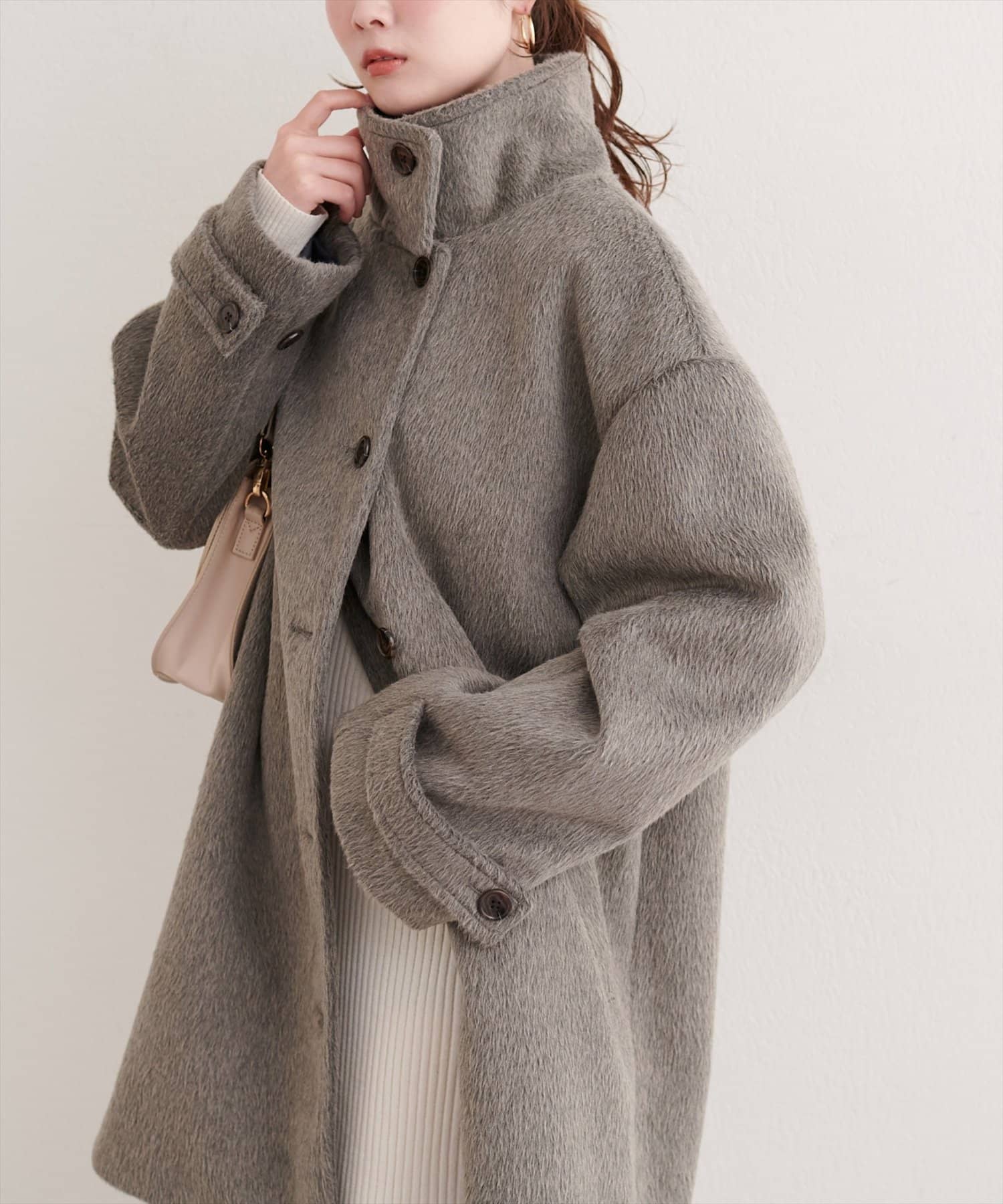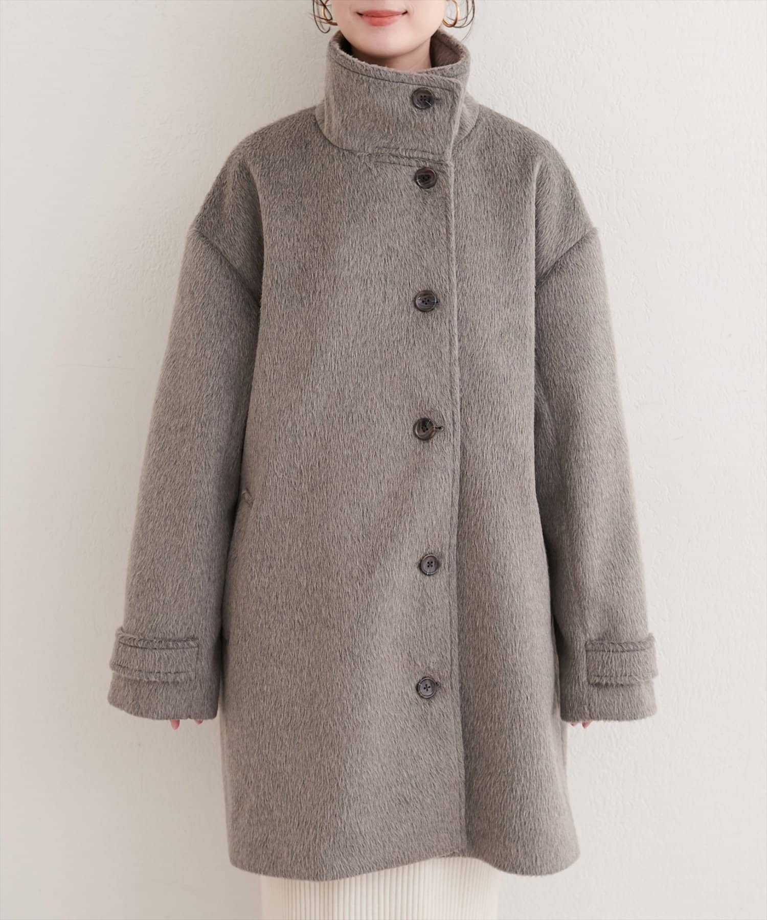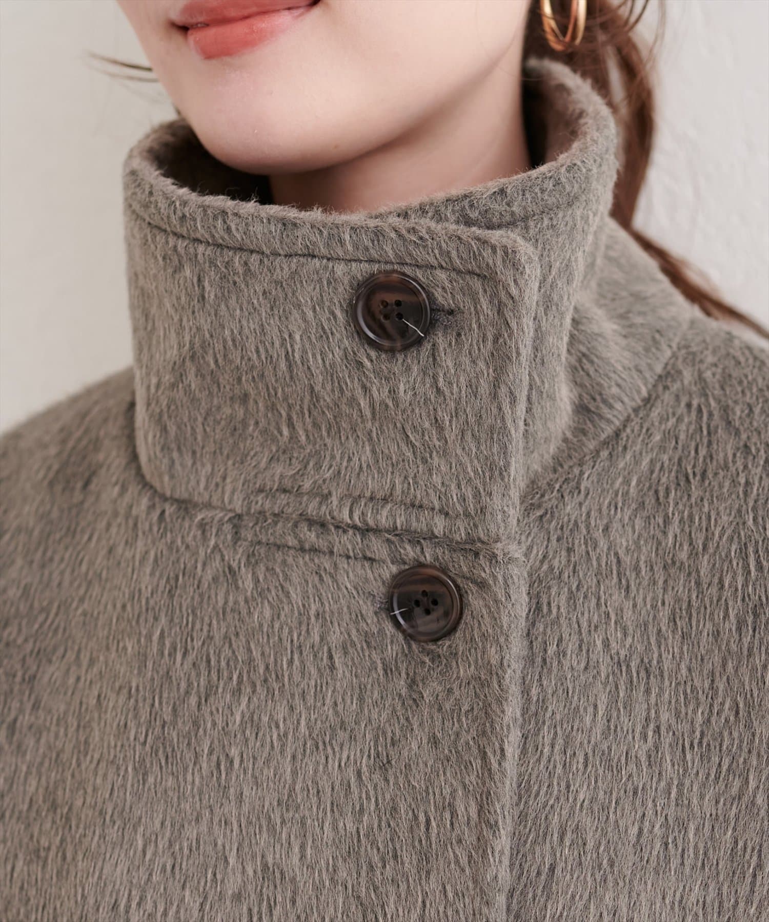 ティペットを外せば、シンプルなノーカラーコートとして、すっきりとした印象に。