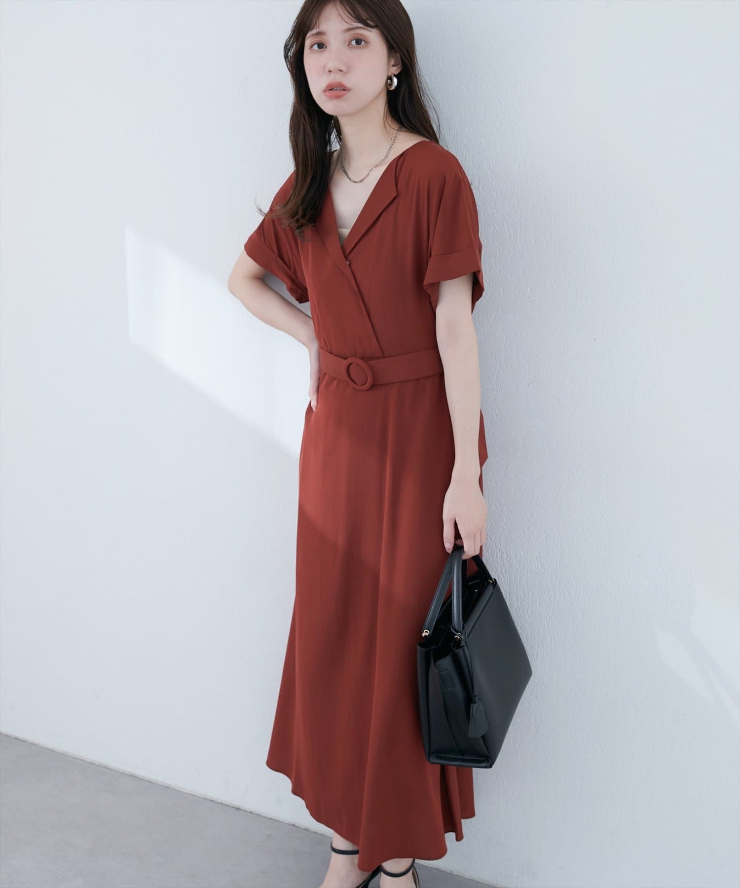 ヒールのあるパンプスやアクセサリーと合わせると、エレガントスタイルが完成します。