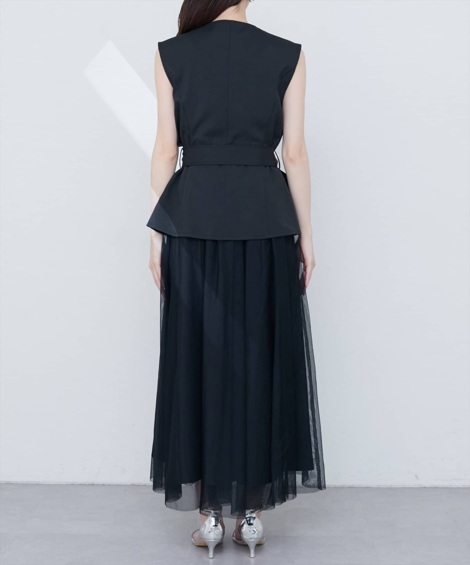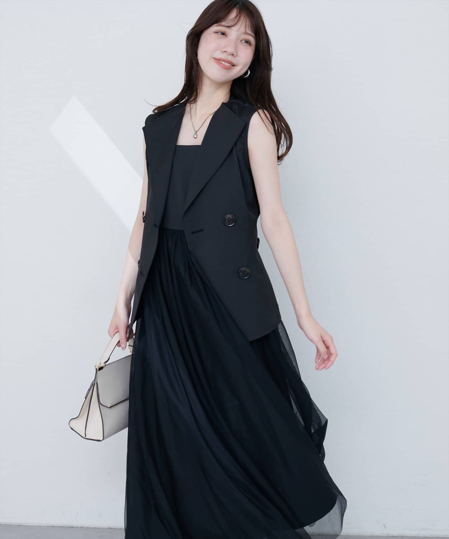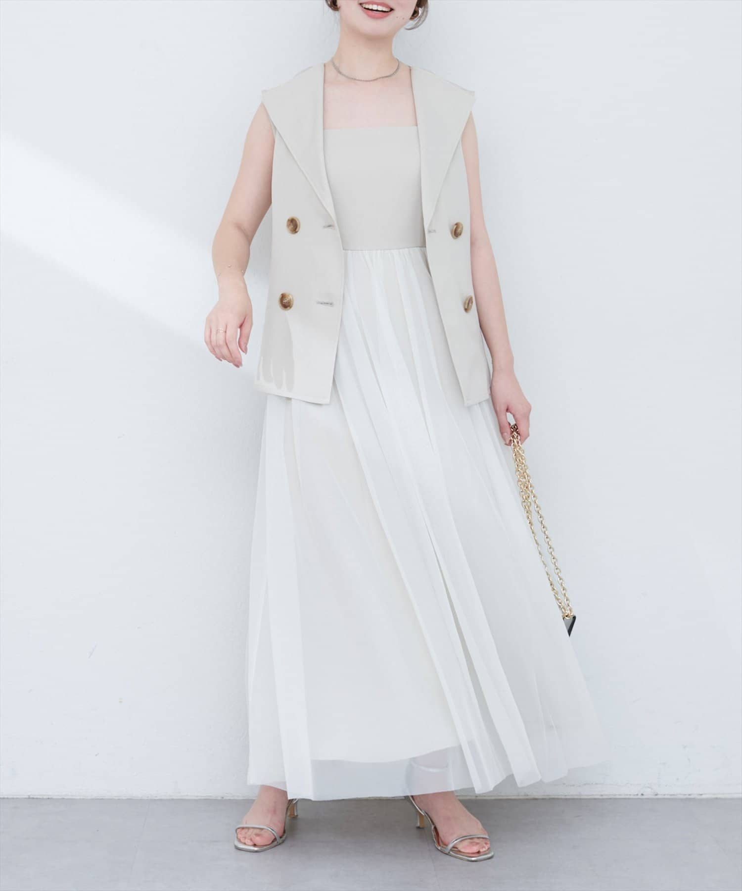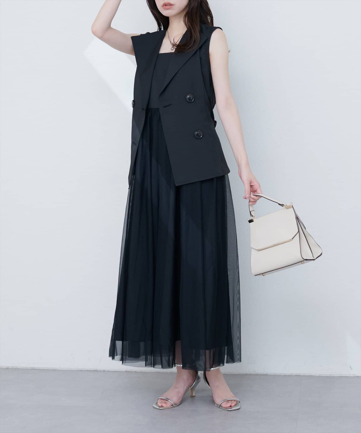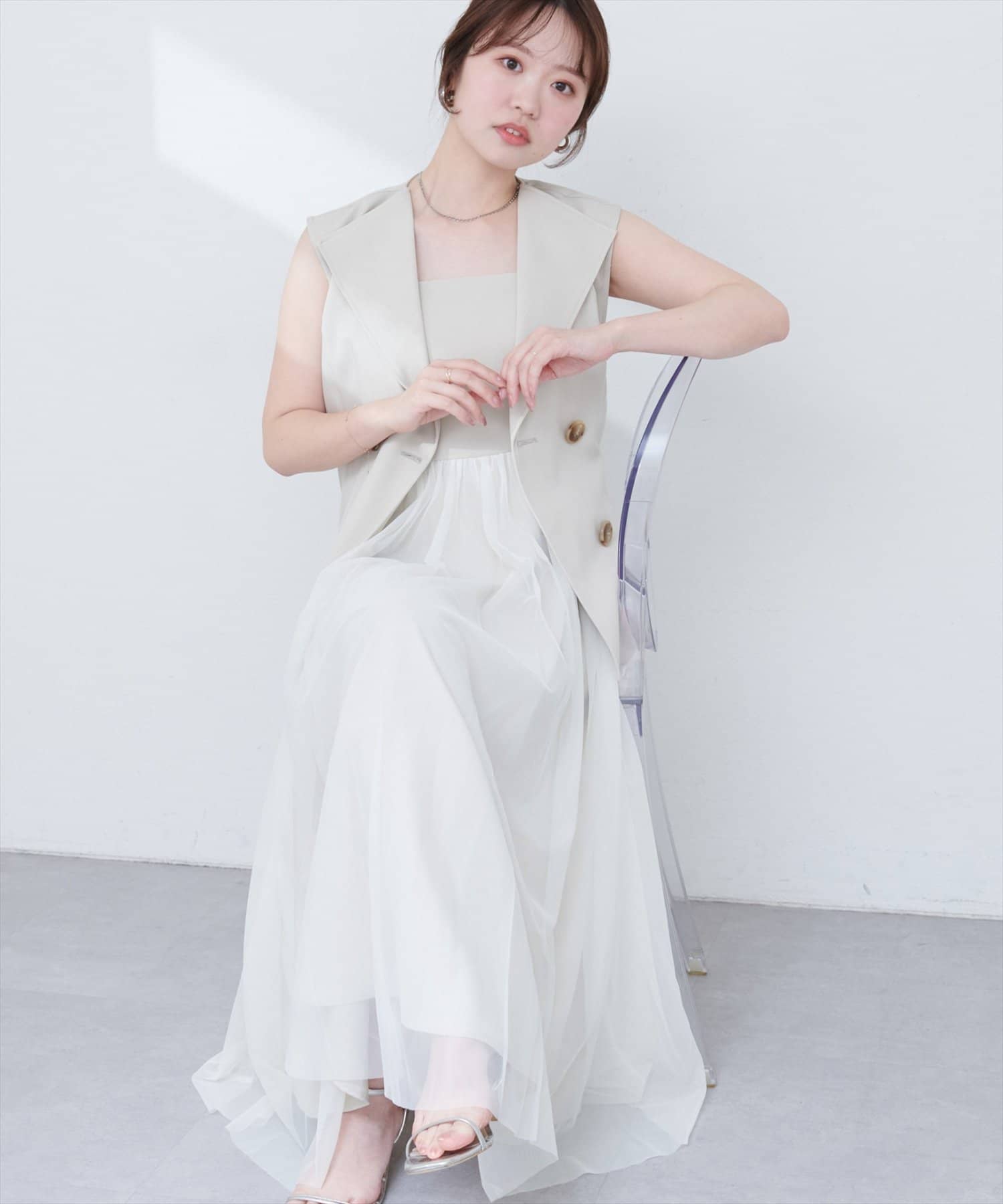 繊細なチュール素材を重ねた軽やかな印象のキャミワンピースに、同色、同素材のベストがセットになったアイテム。
