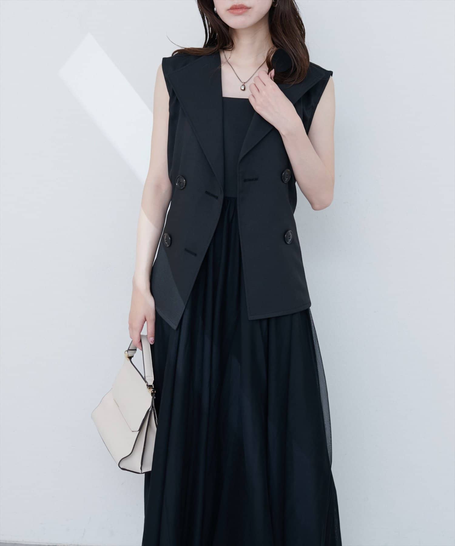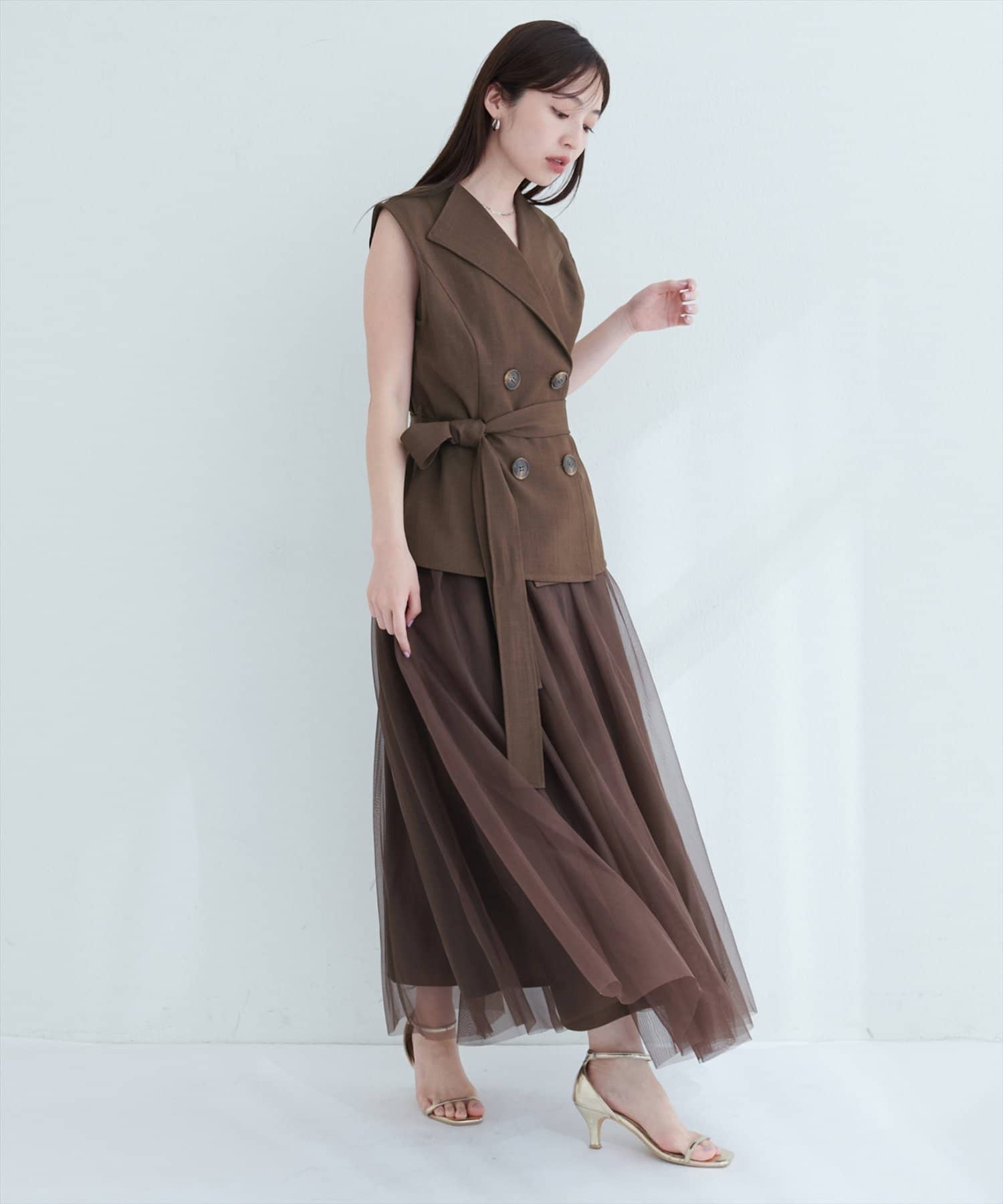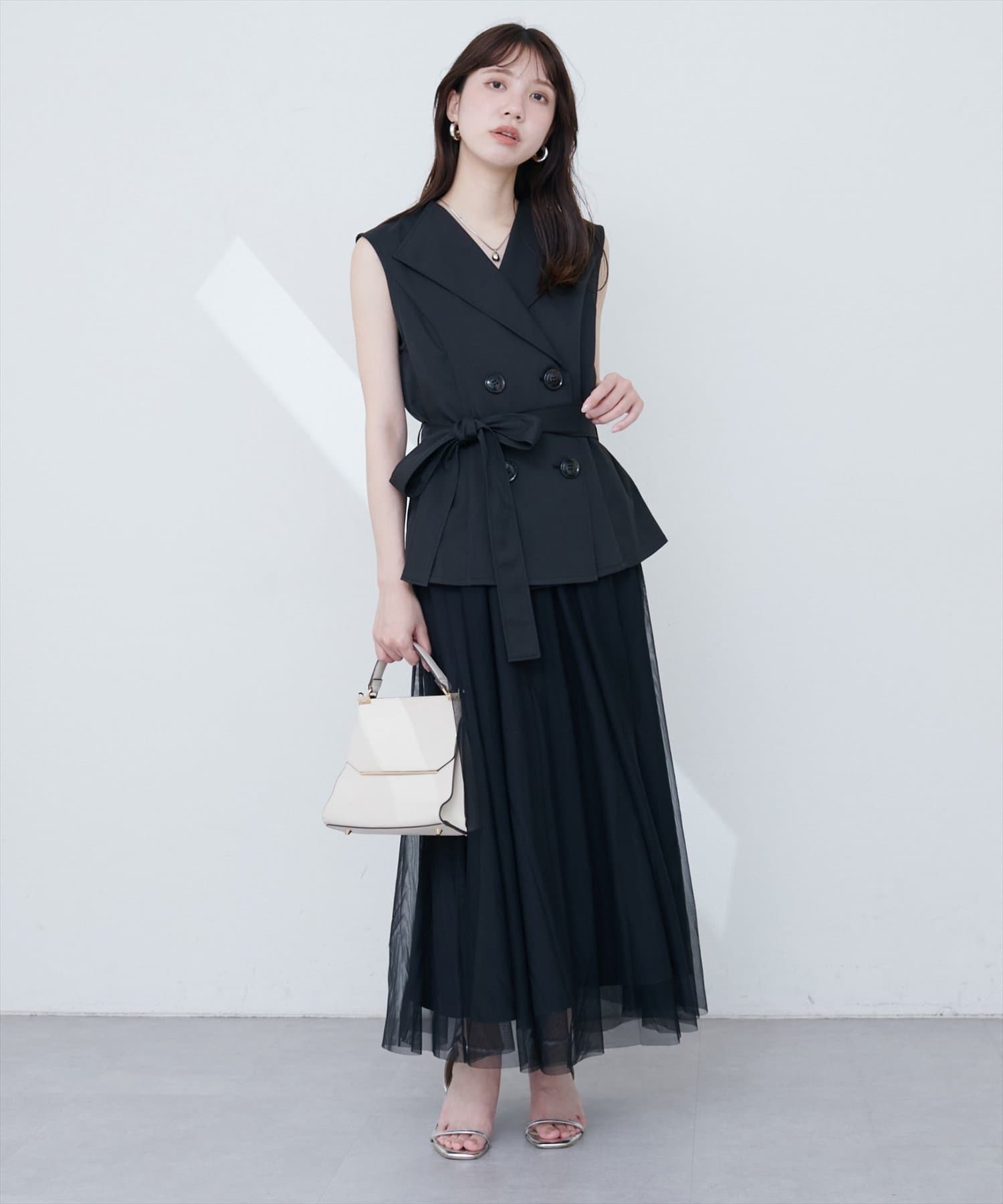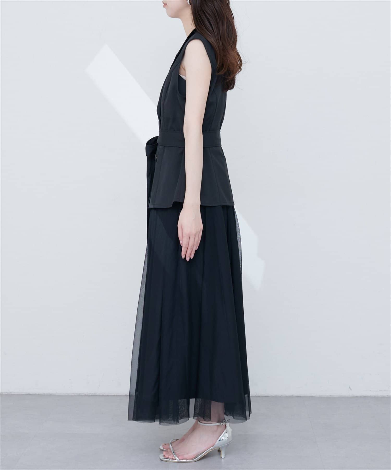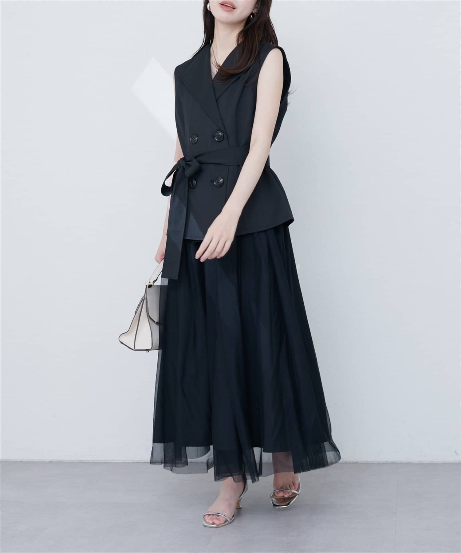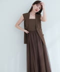 繊細なチュール素材を重ねた軽やかな印象のキャミワンピースに、同色、同素材のベストがセットになったアイテム。
