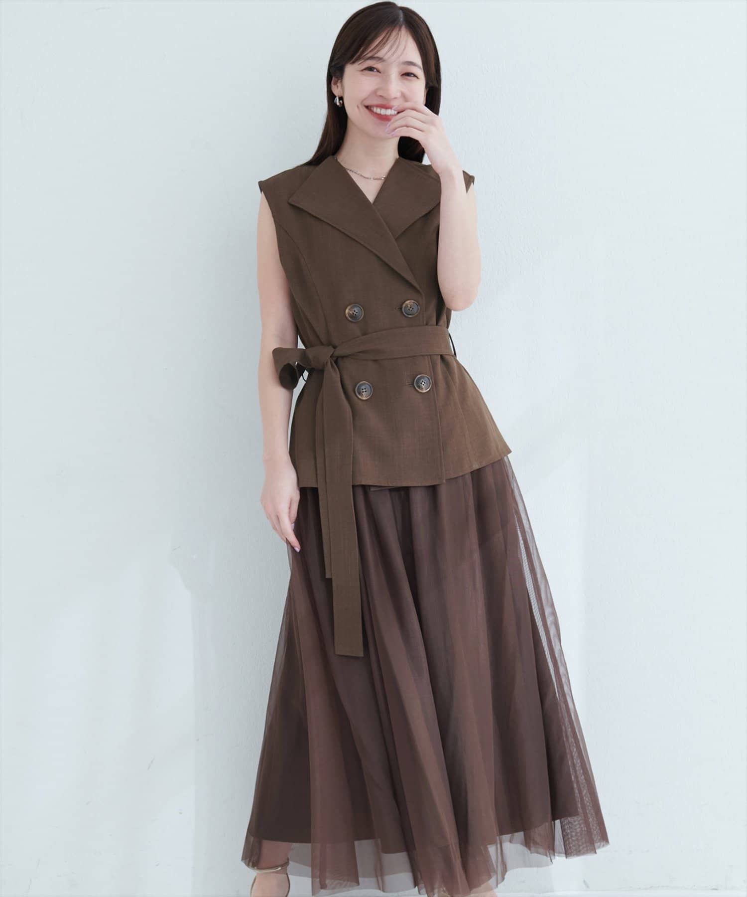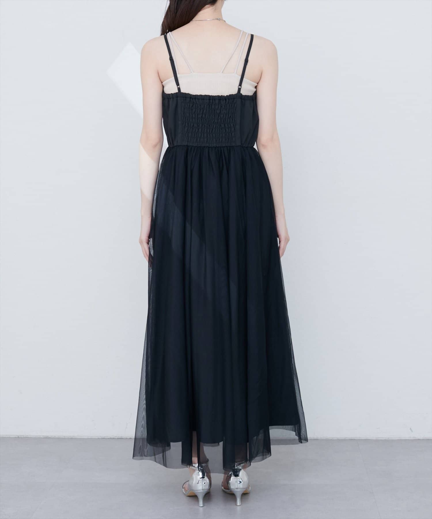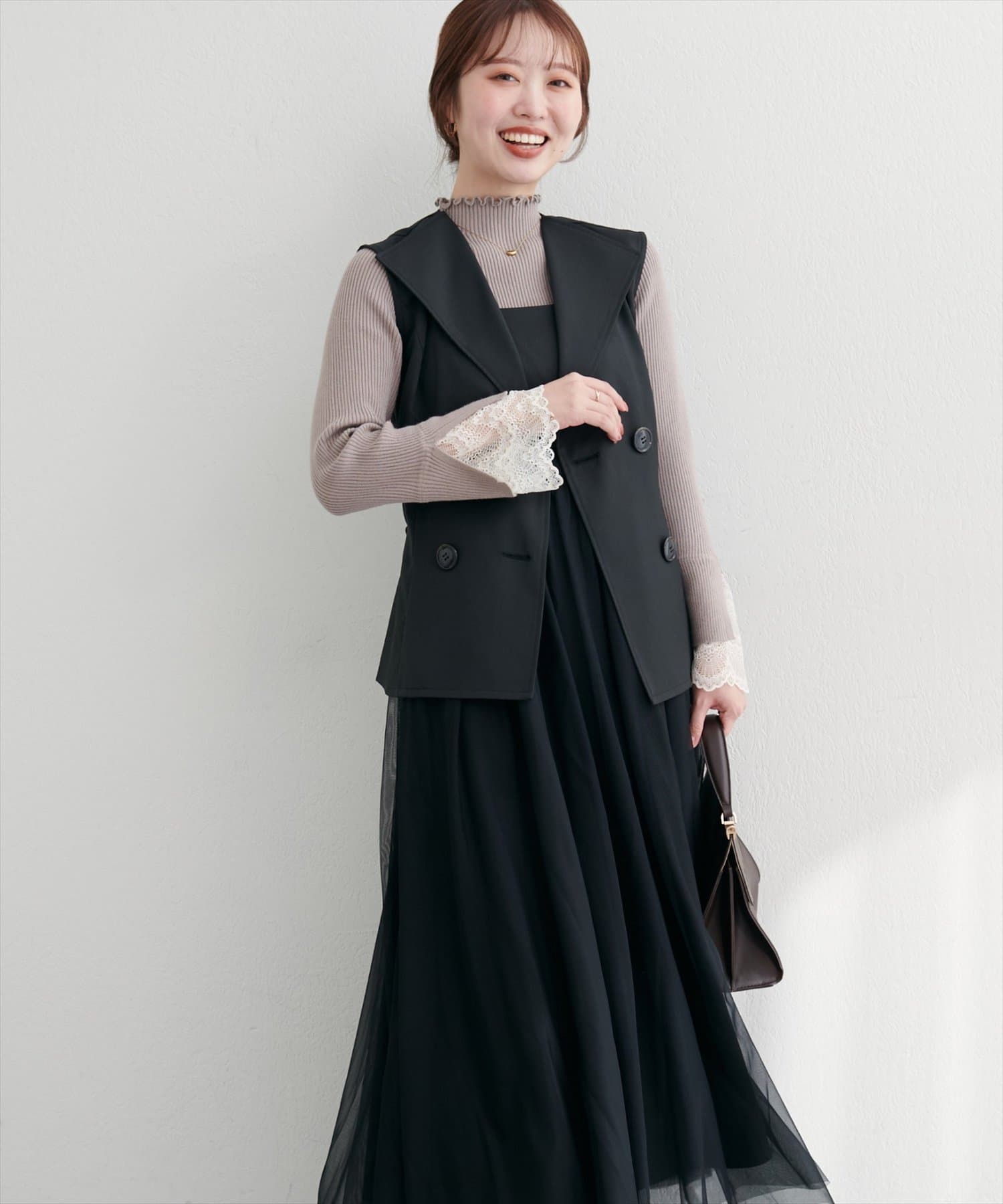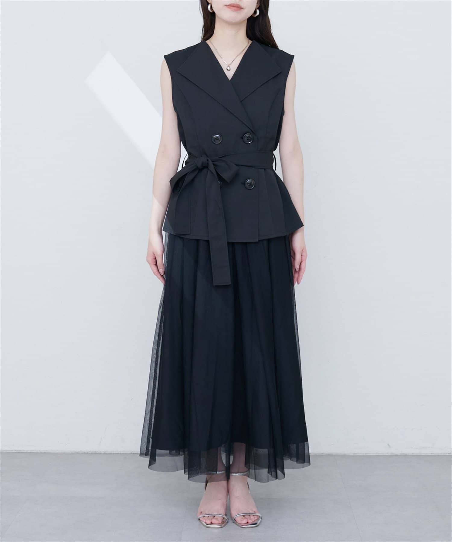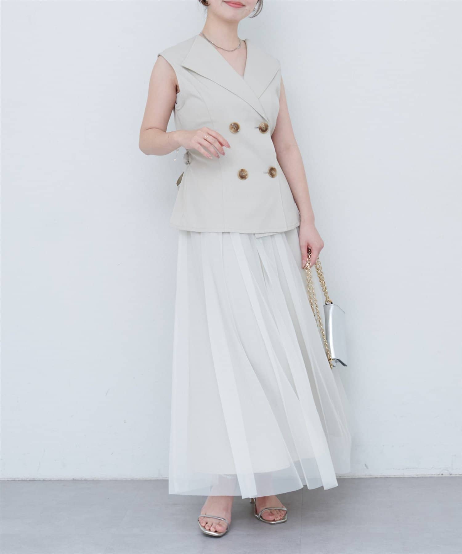 繊細なチュール素材を重ねた軽やかな印象のキャミワンピースに、同色、同素材のベストがセットになったアイテム。
