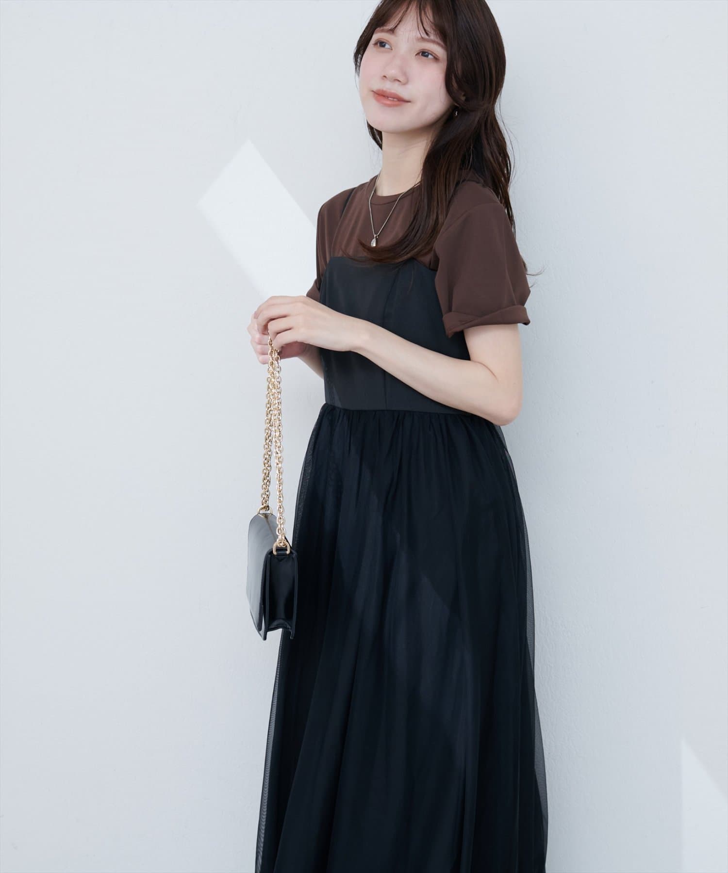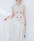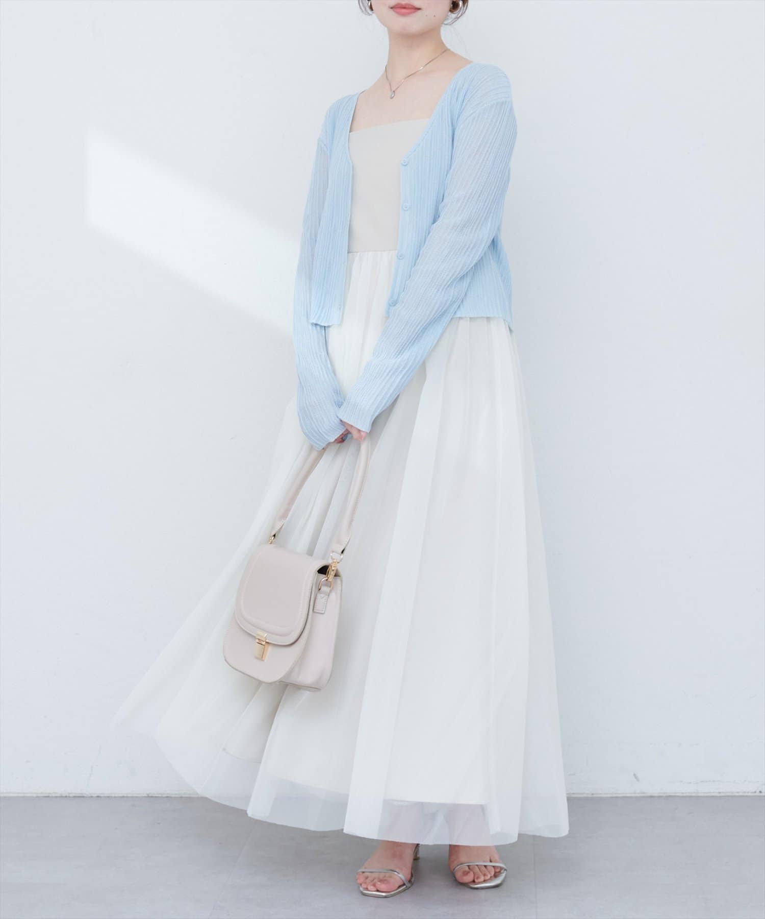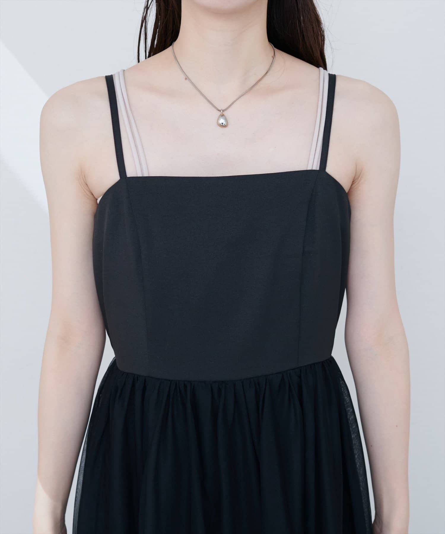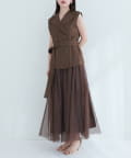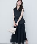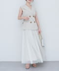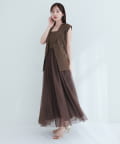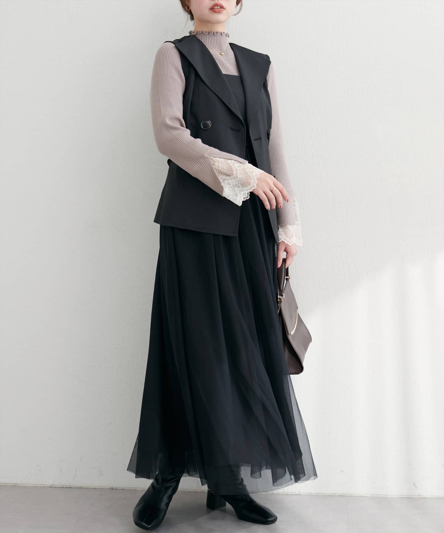 繊細なチュール素材を重ねた軽やかな印象のキャミワンピースに、同色、同素材のベストがセットになったアイテム。