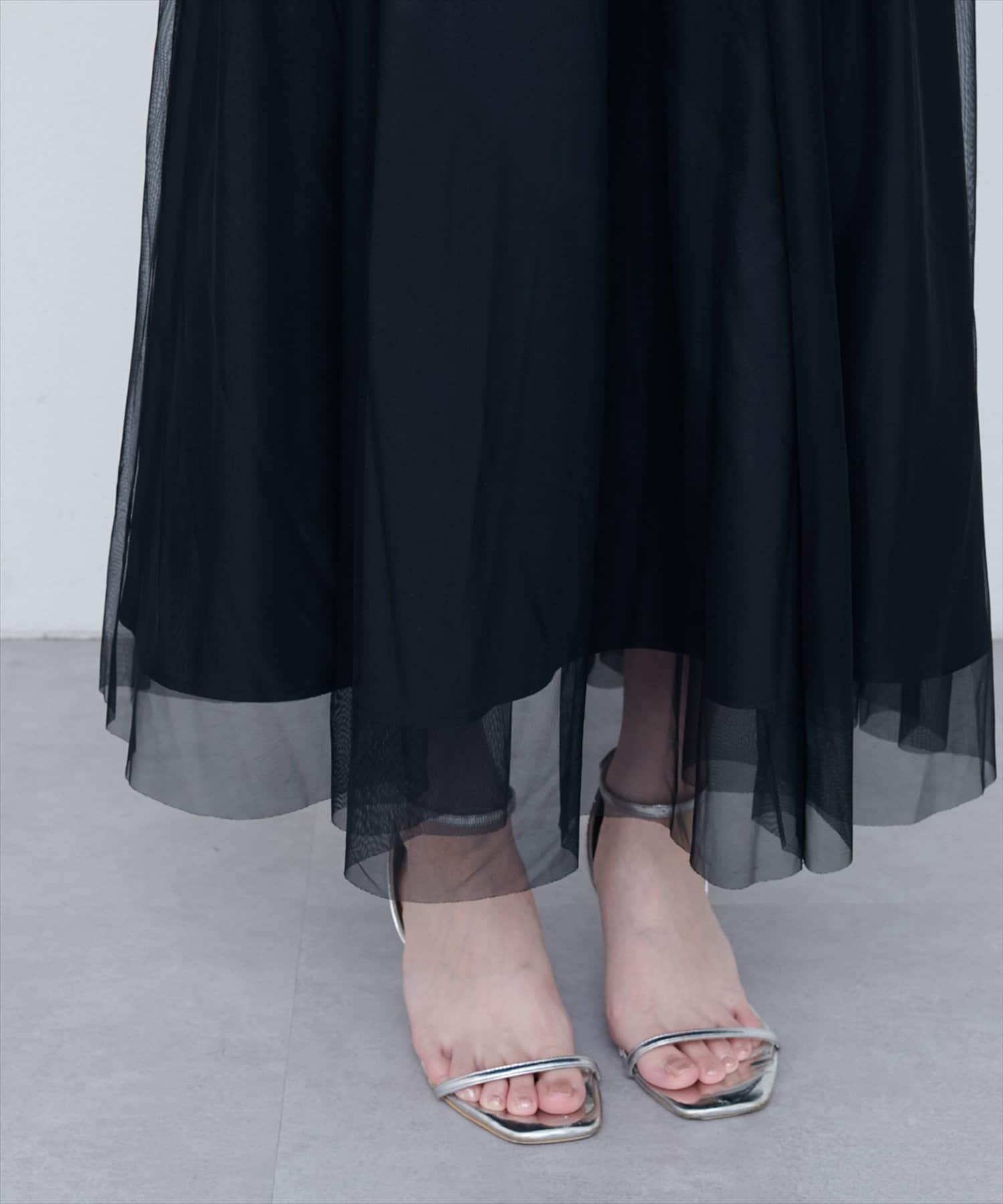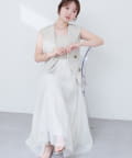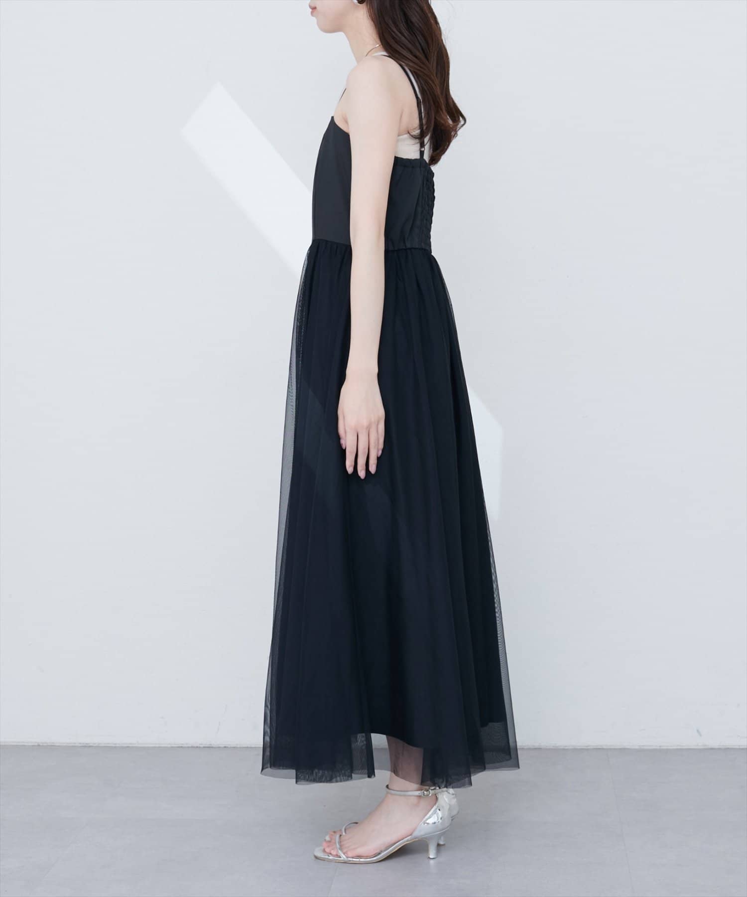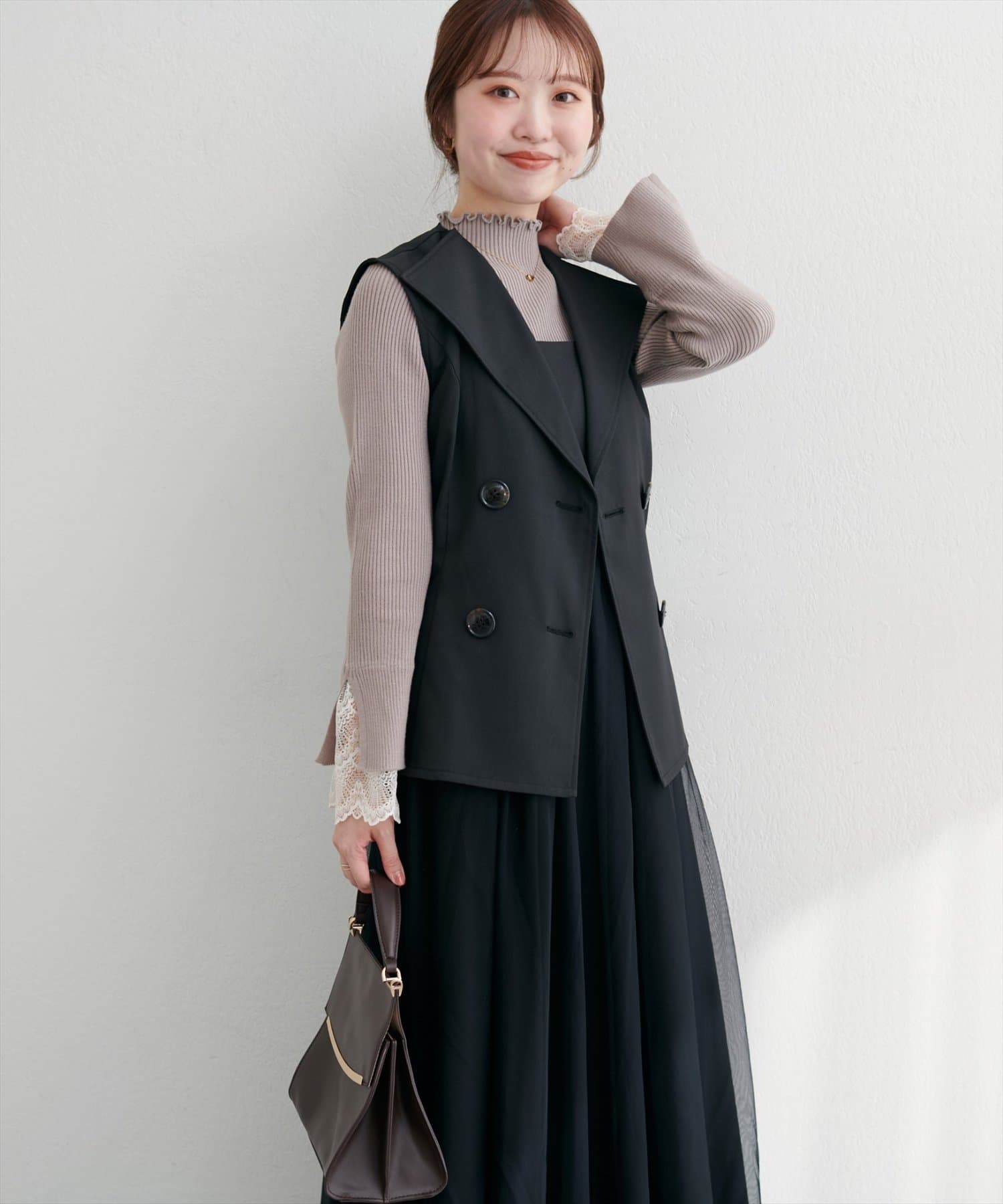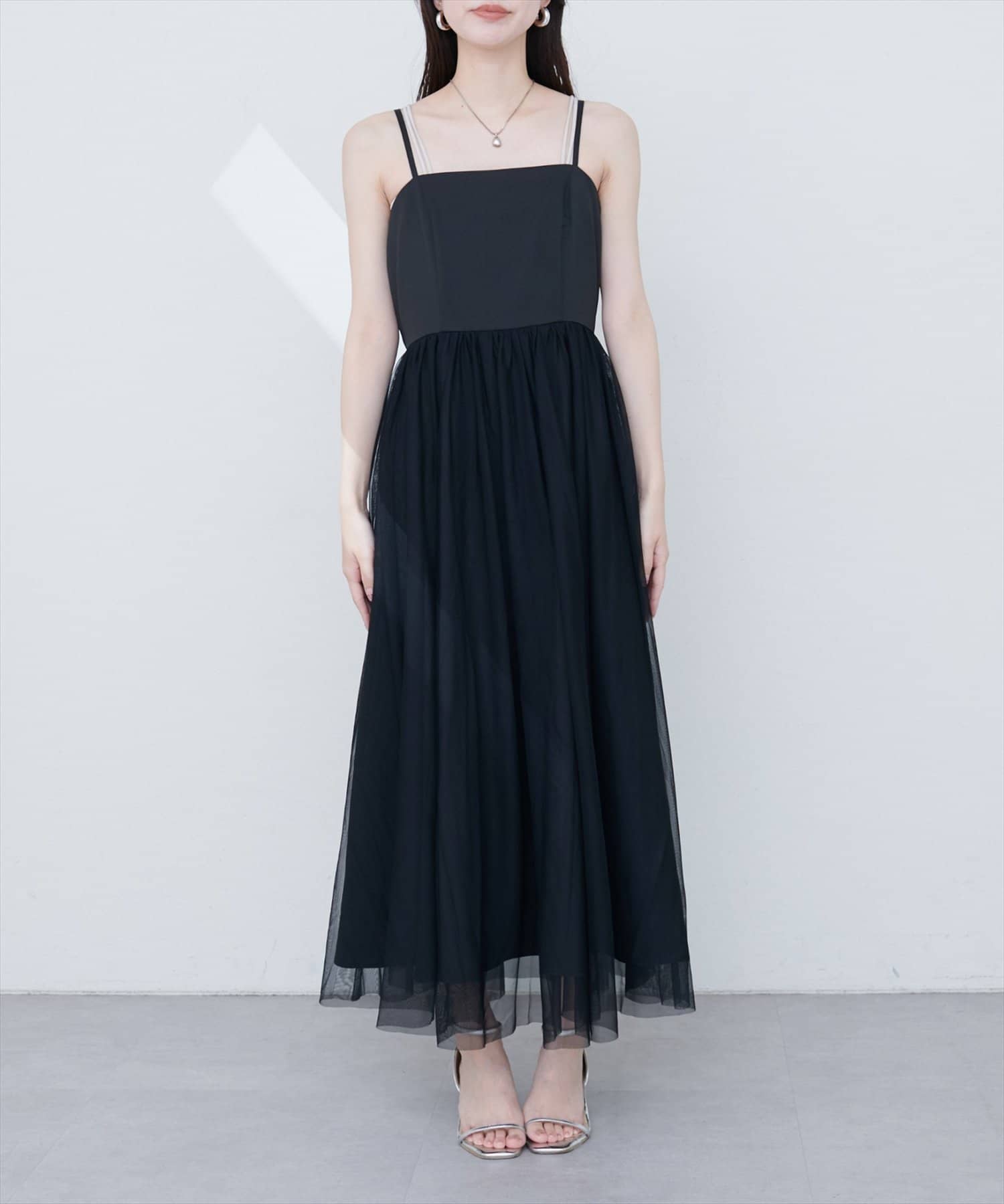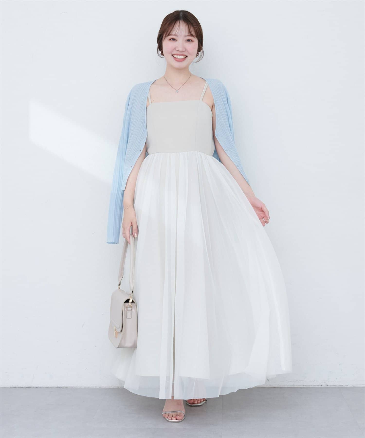 繊細なチュール素材を重ねた軽やかな印象のキャミワンピースに、同色、同素材のベストがセットになったアイテム。