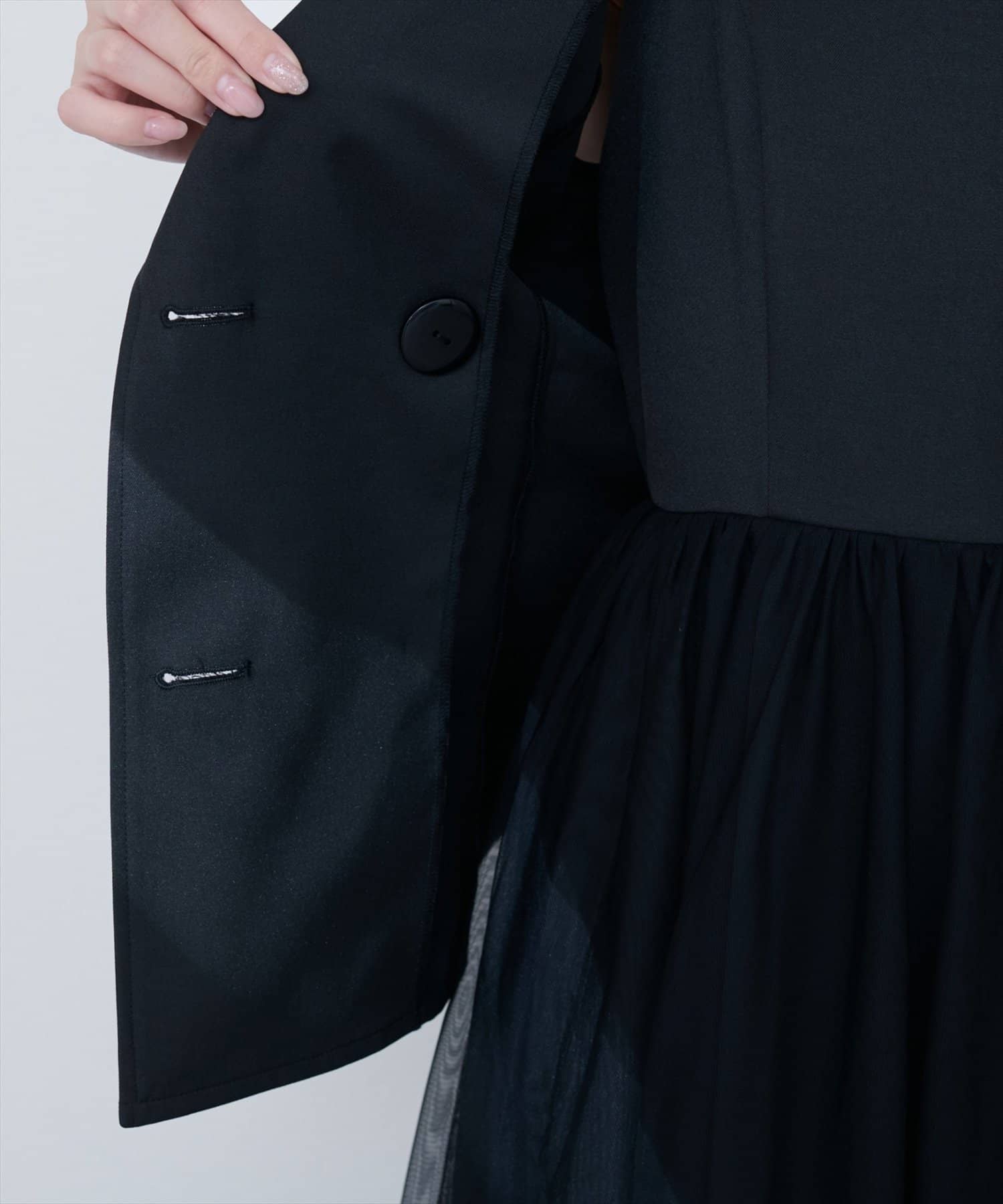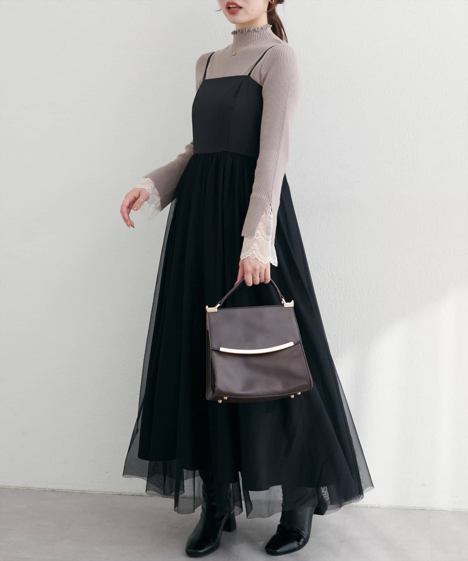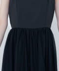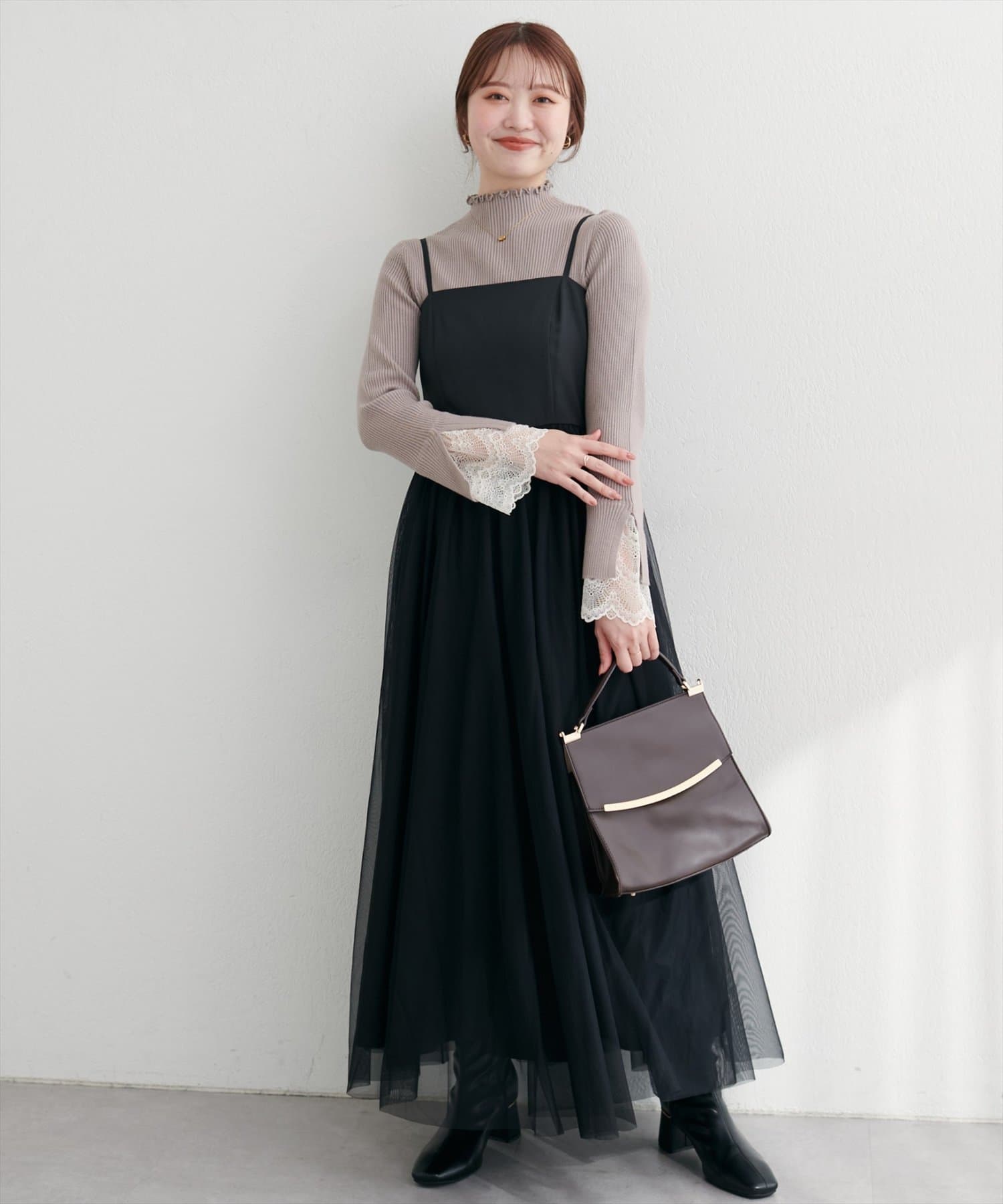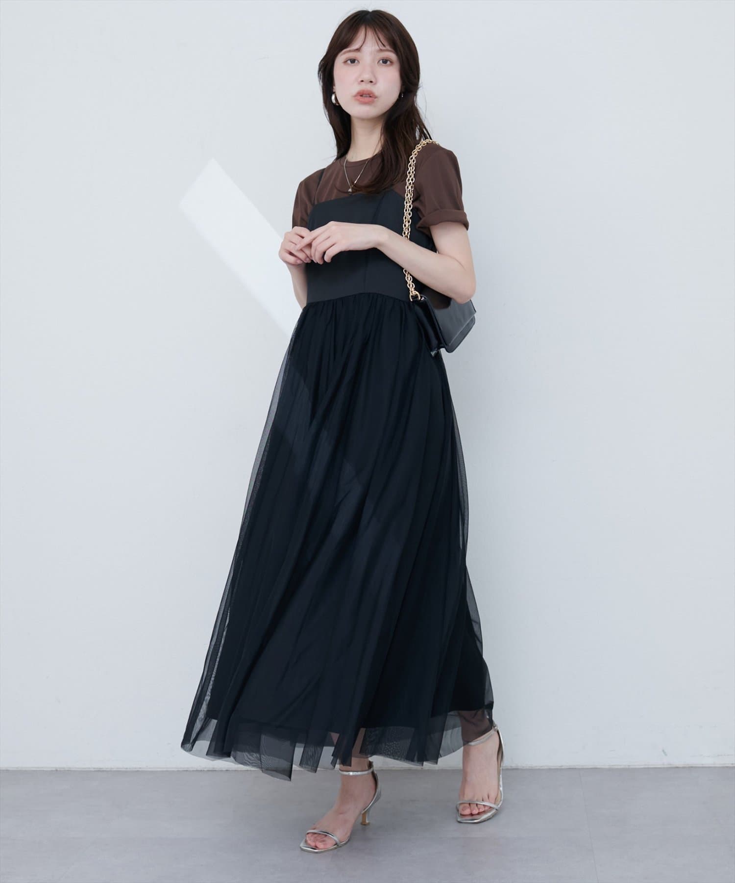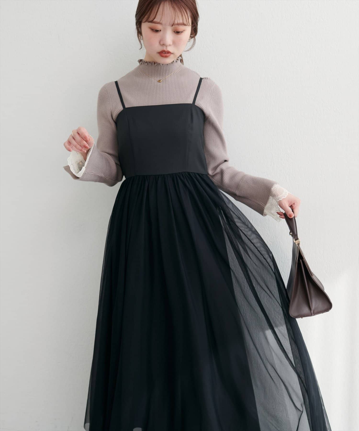 繊細なチュール素材を重ねた軽やかな印象のキャミワンピースに、同色、同素材のベストがセットになったアイテム。