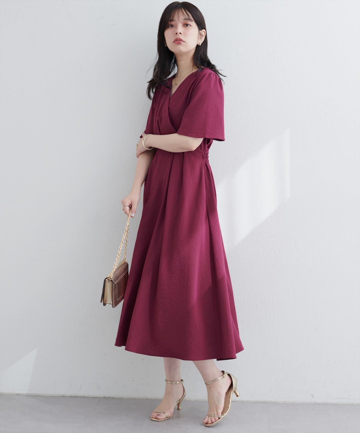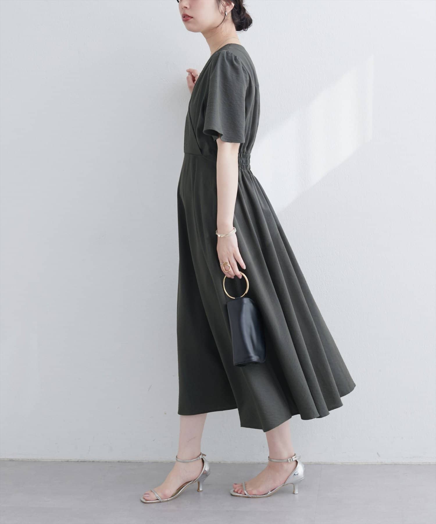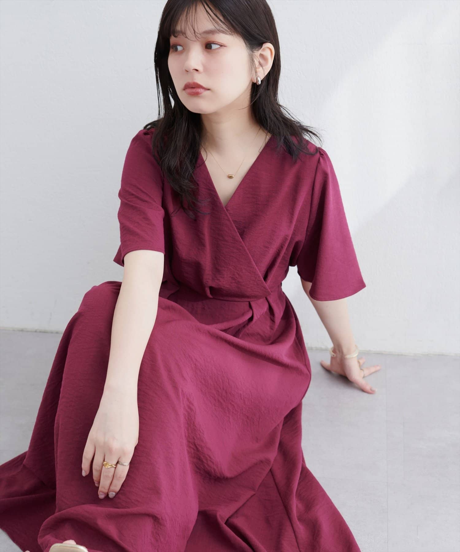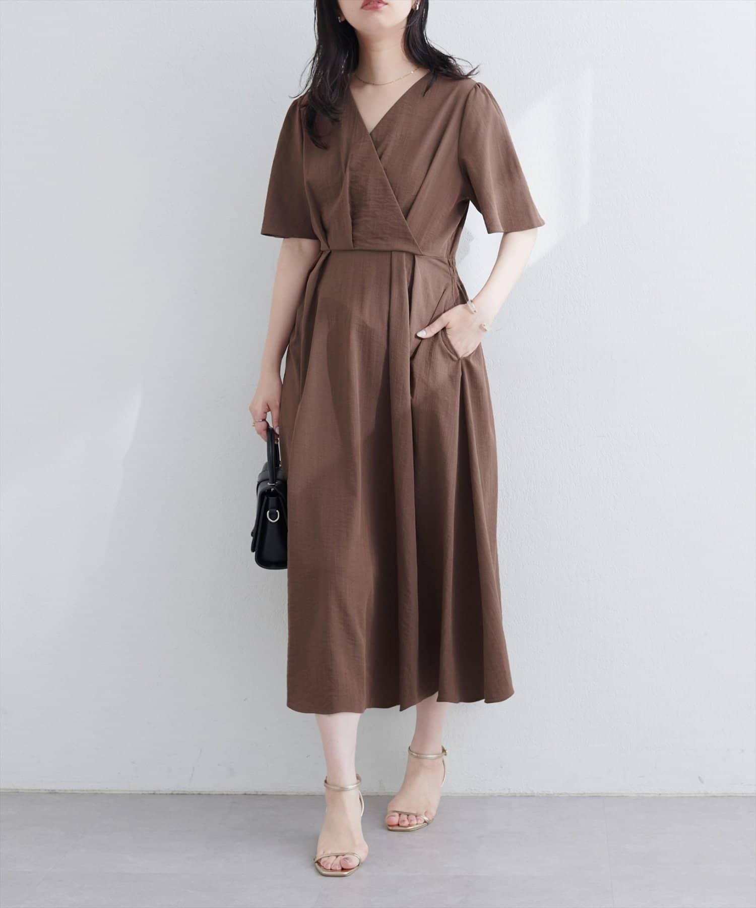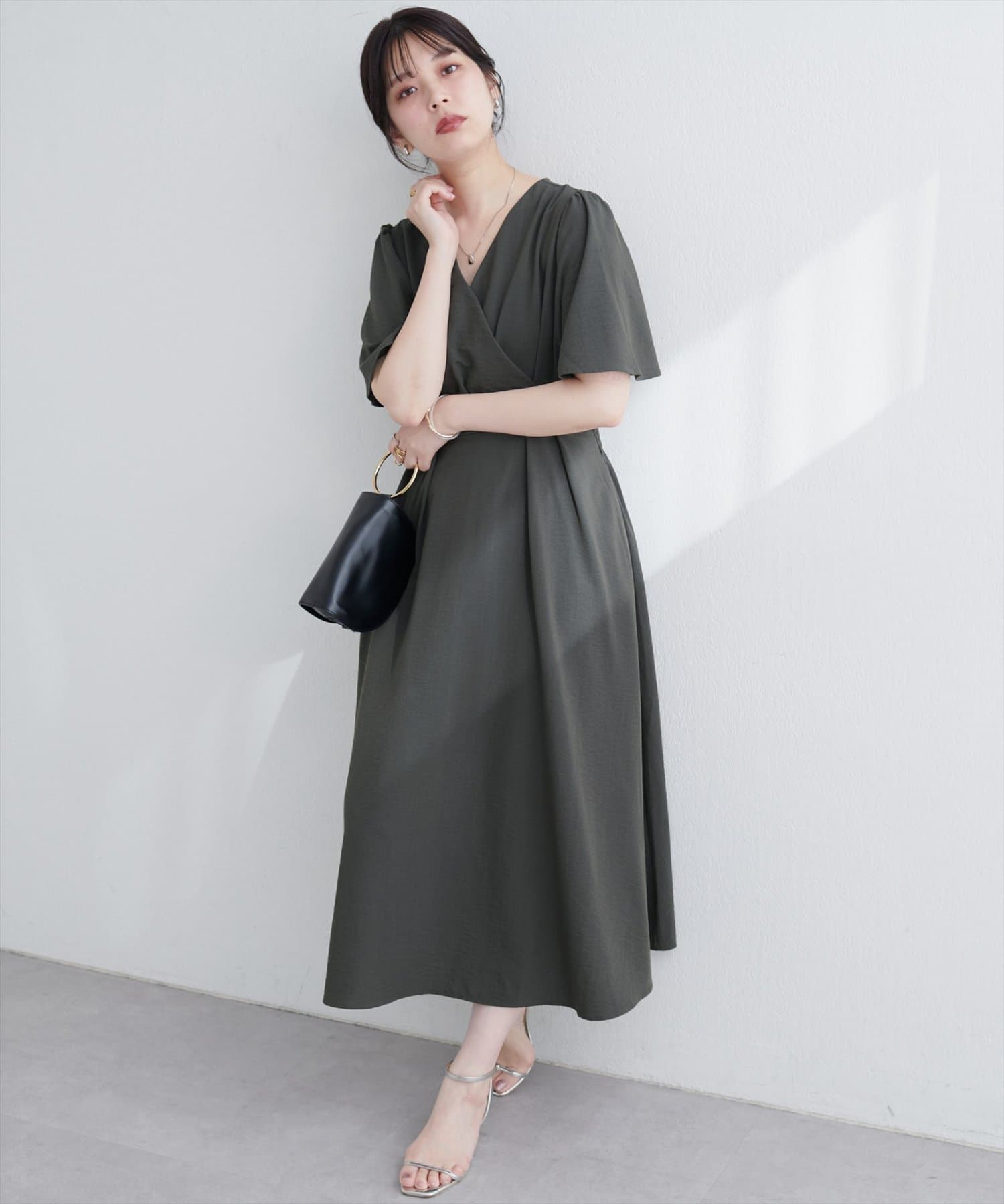 カシュクールデザインがシンプルすぎず、デコルテを程よく見せてくれることでヘルシーで女性らしくスタイリングしてくれます。
