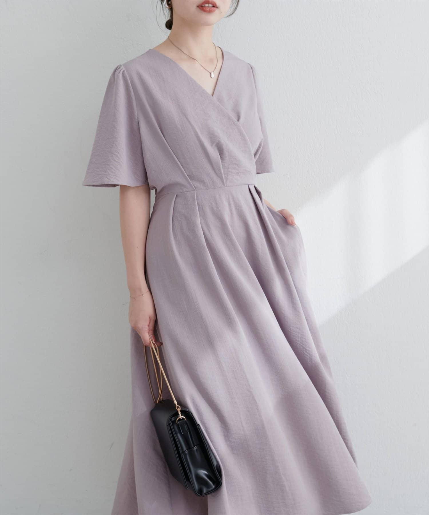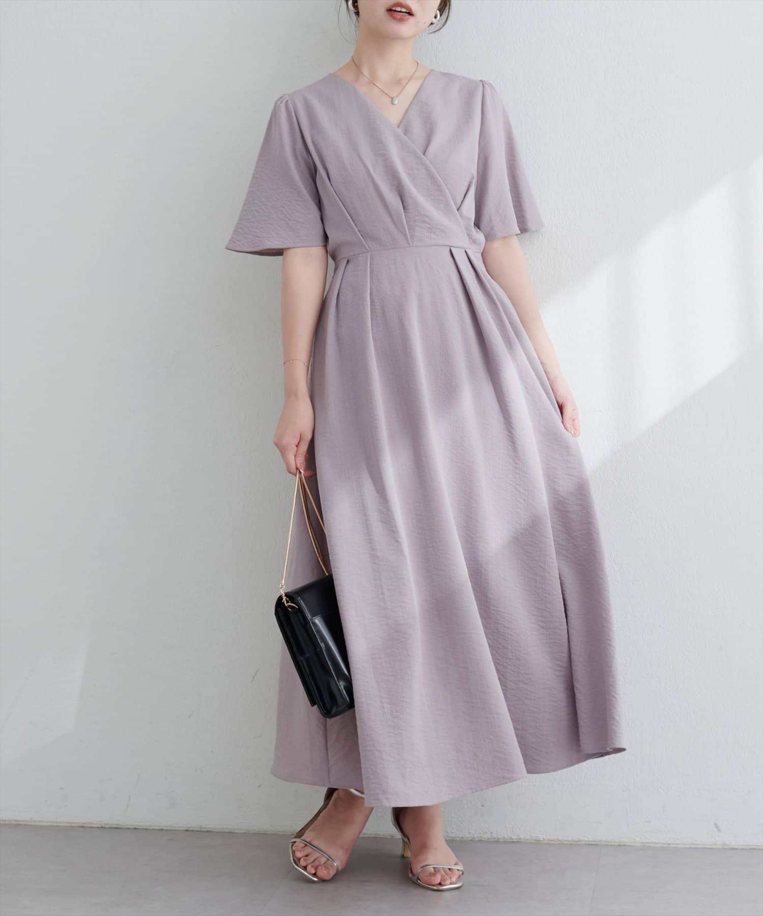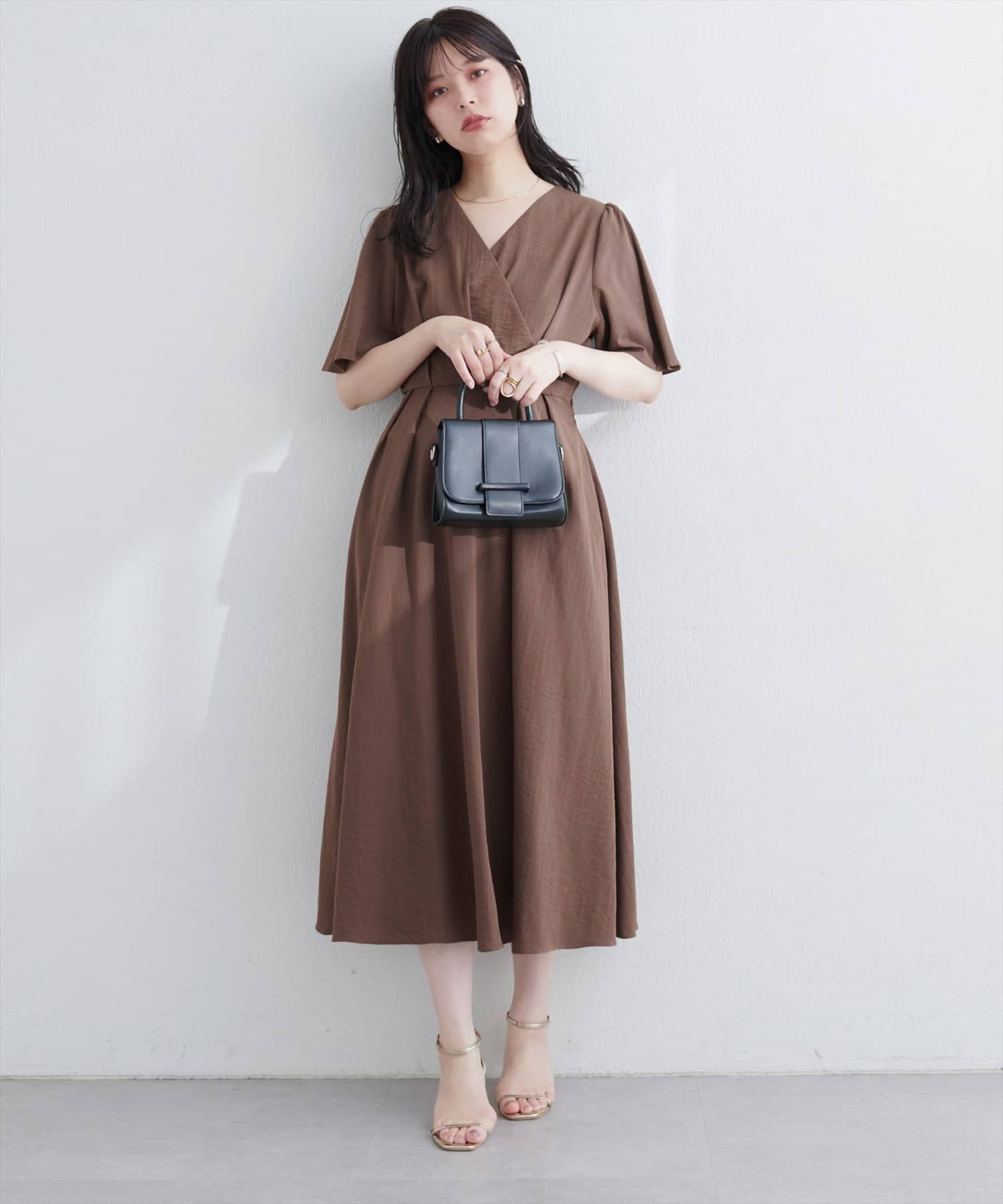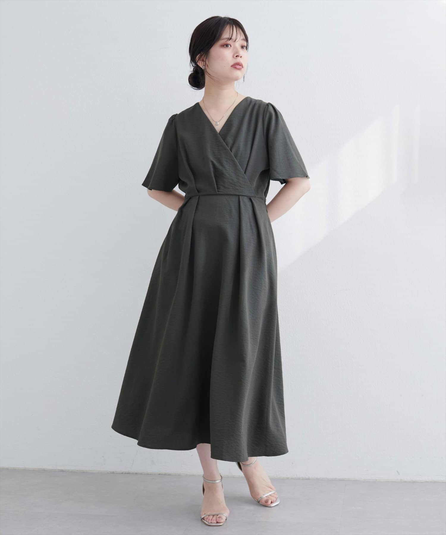 カシュクールデザインがシンプルすぎず、デコルテを程よく見せてくれることでヘルシーで女性らしくスタイリングしてくれます。