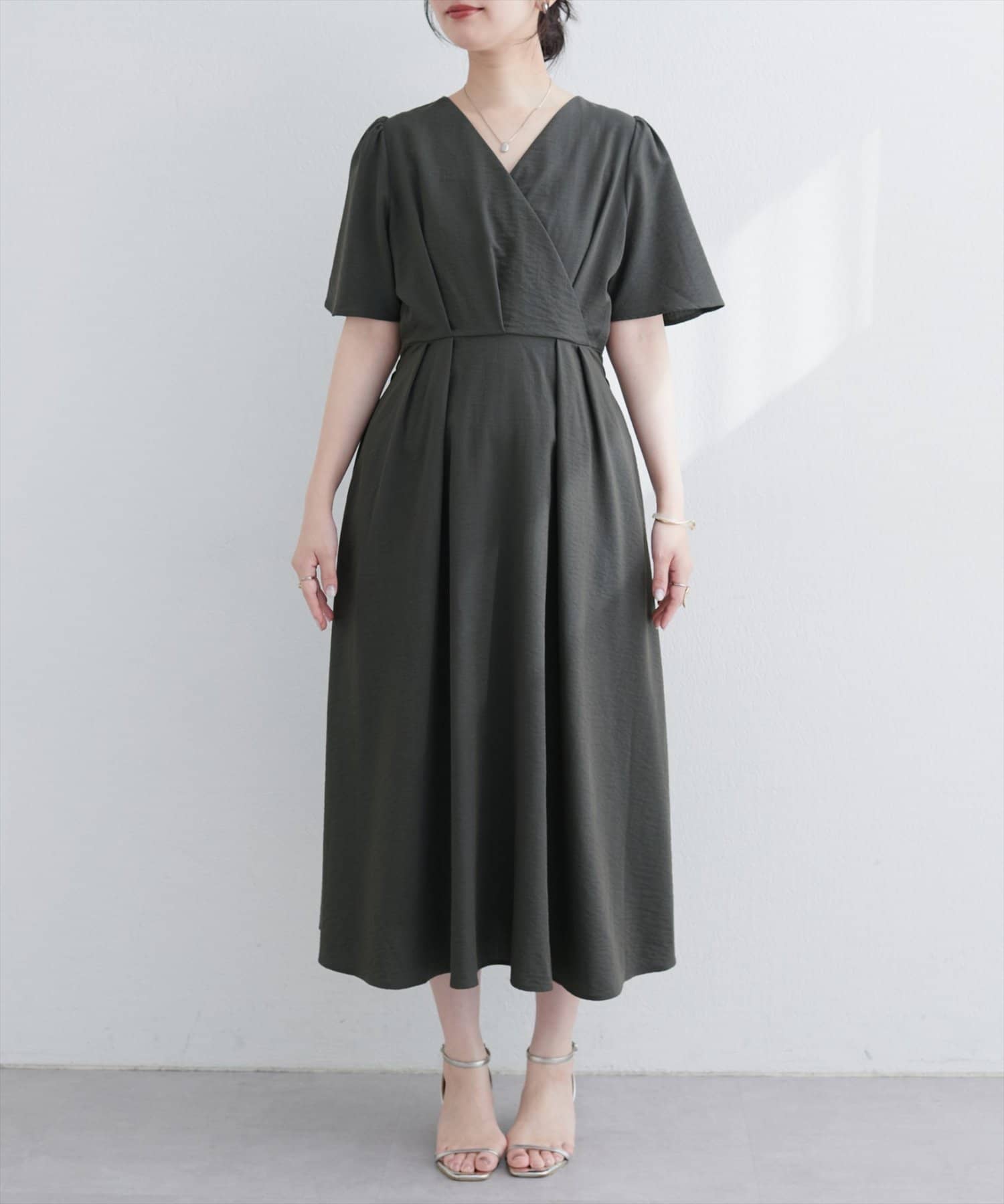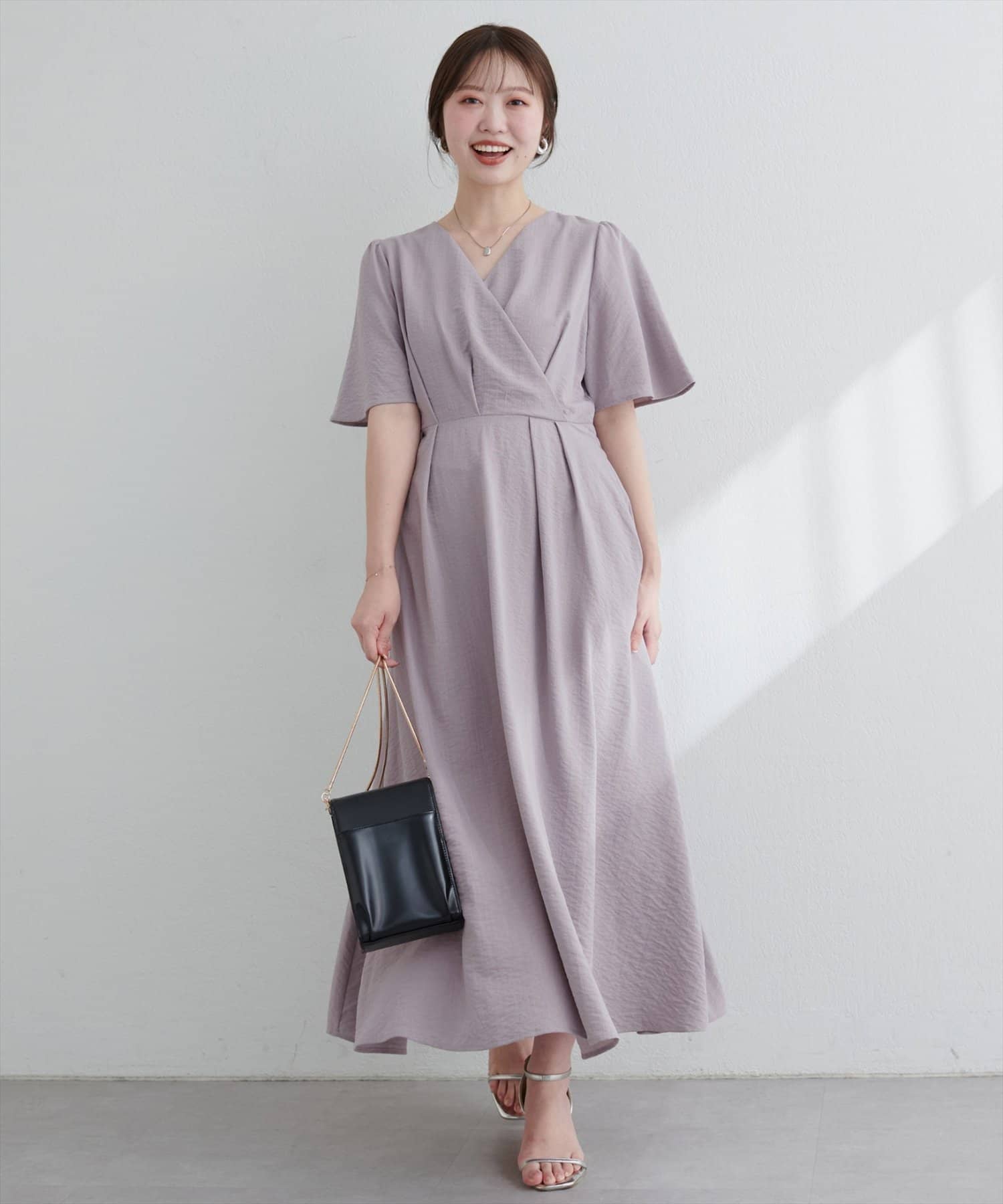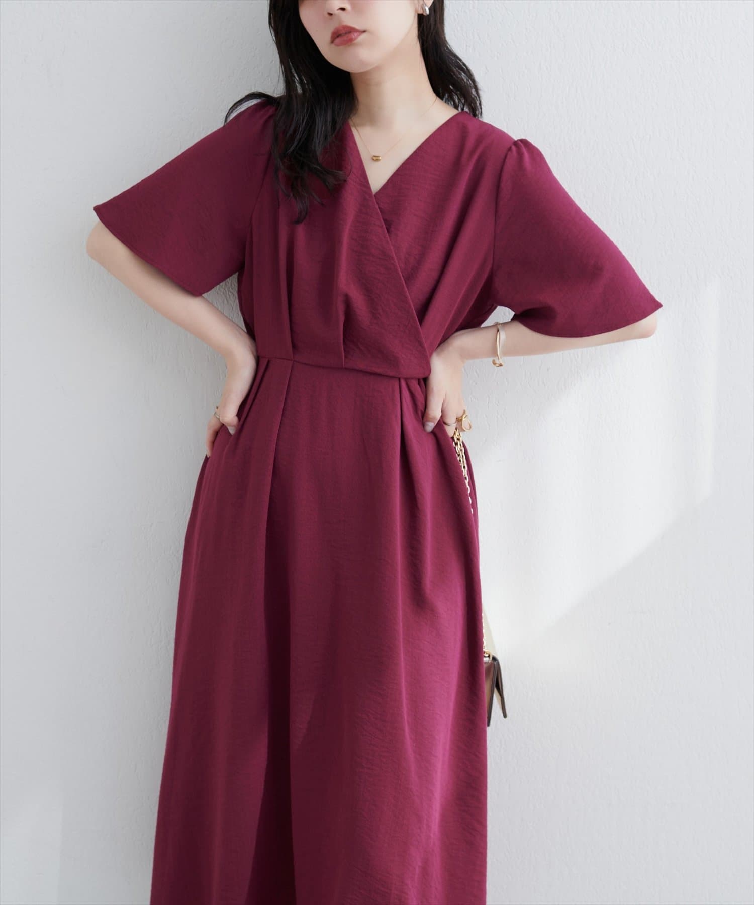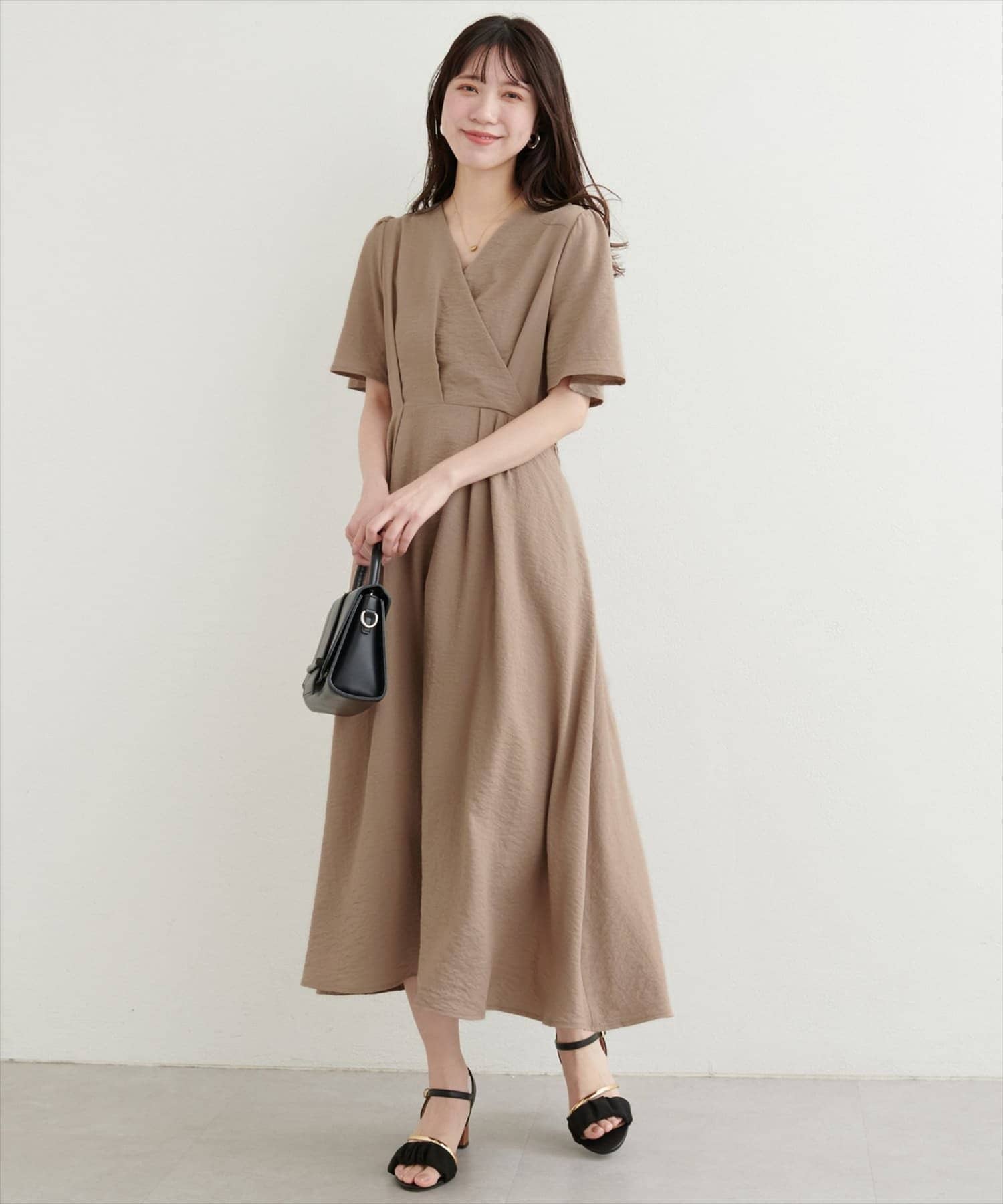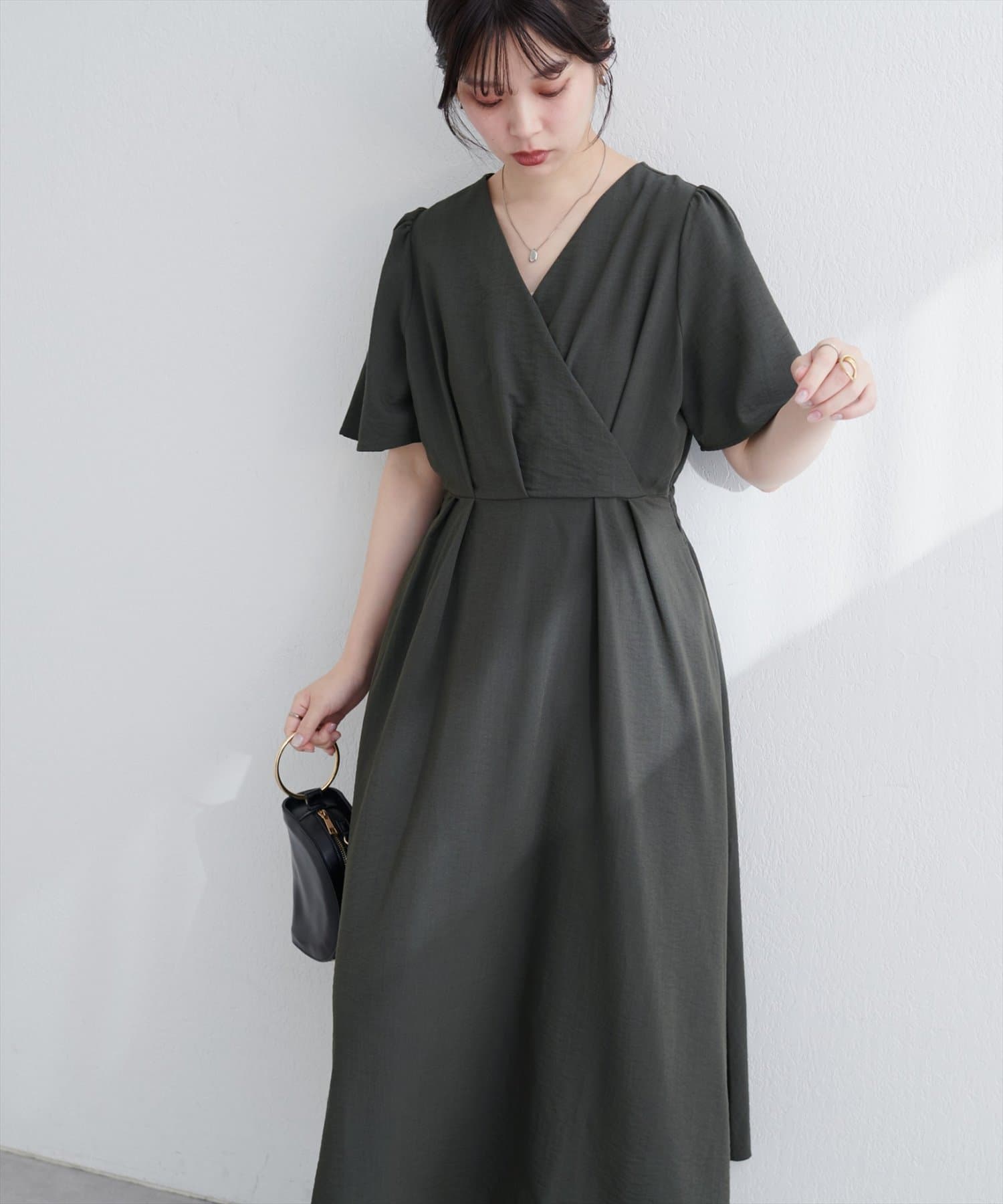 カシュクールデザインがシンプルすぎず、デコルテを程よく見せてくれることでヘルシーで女性らしくスタイリングしてくれます。