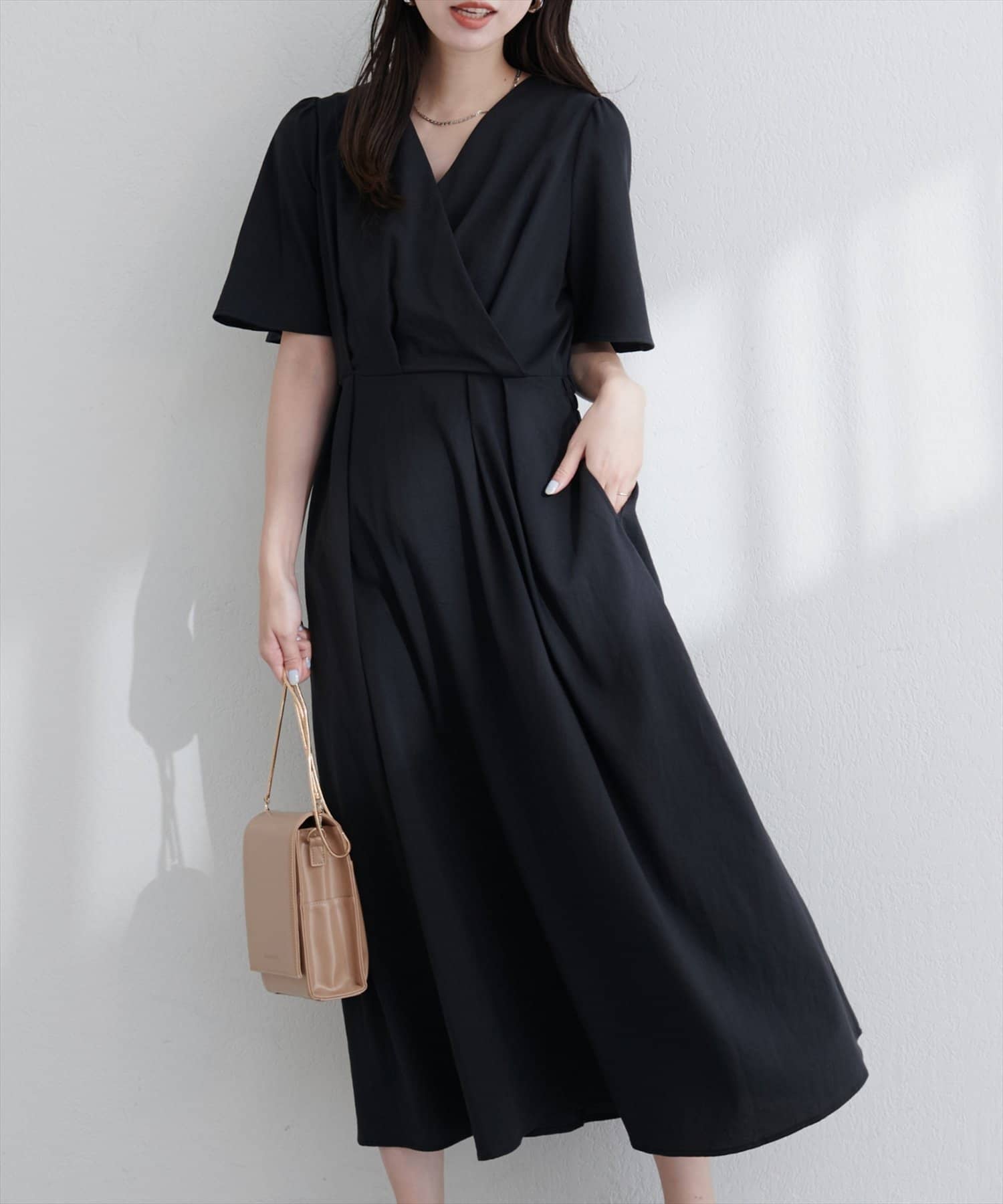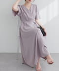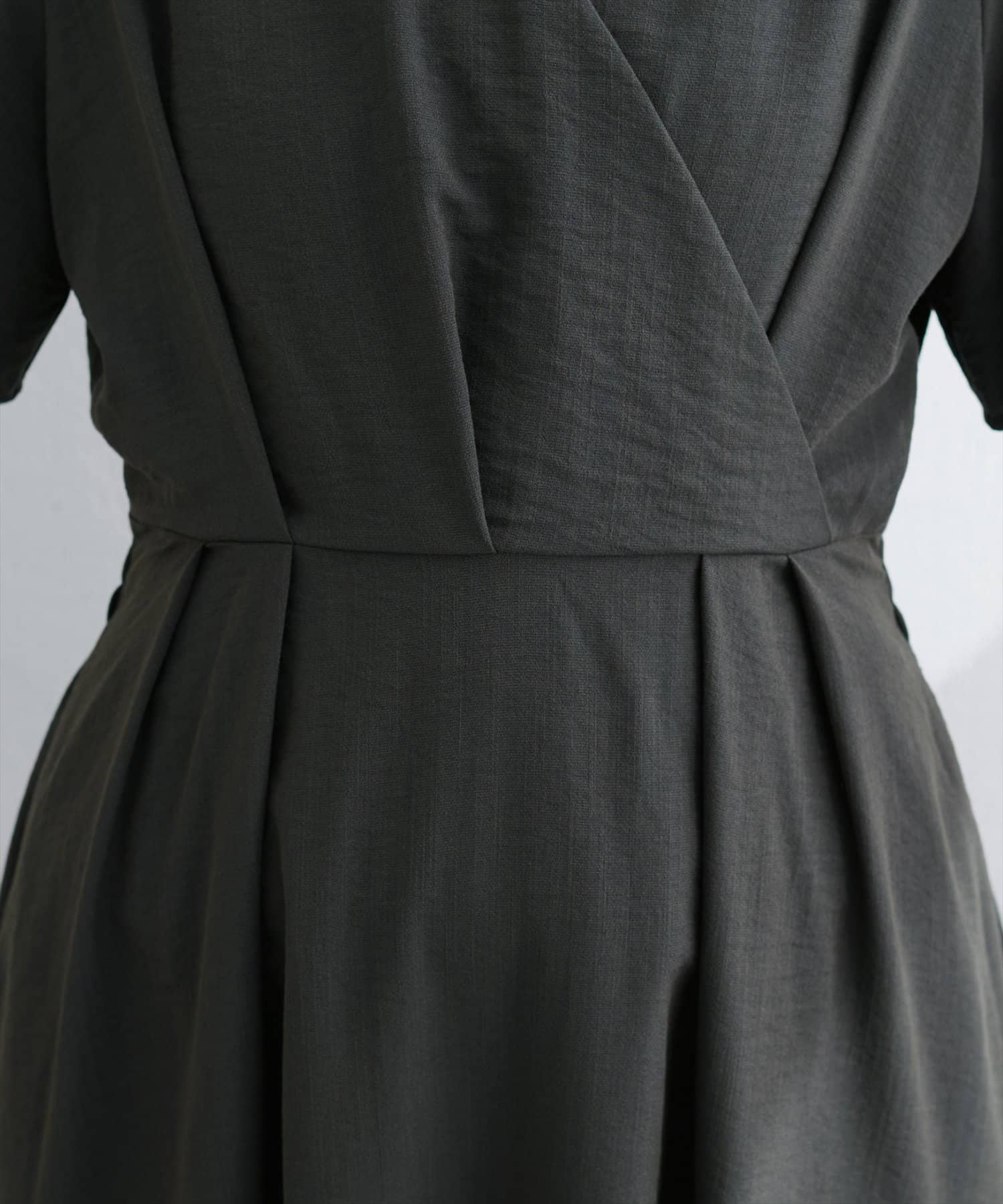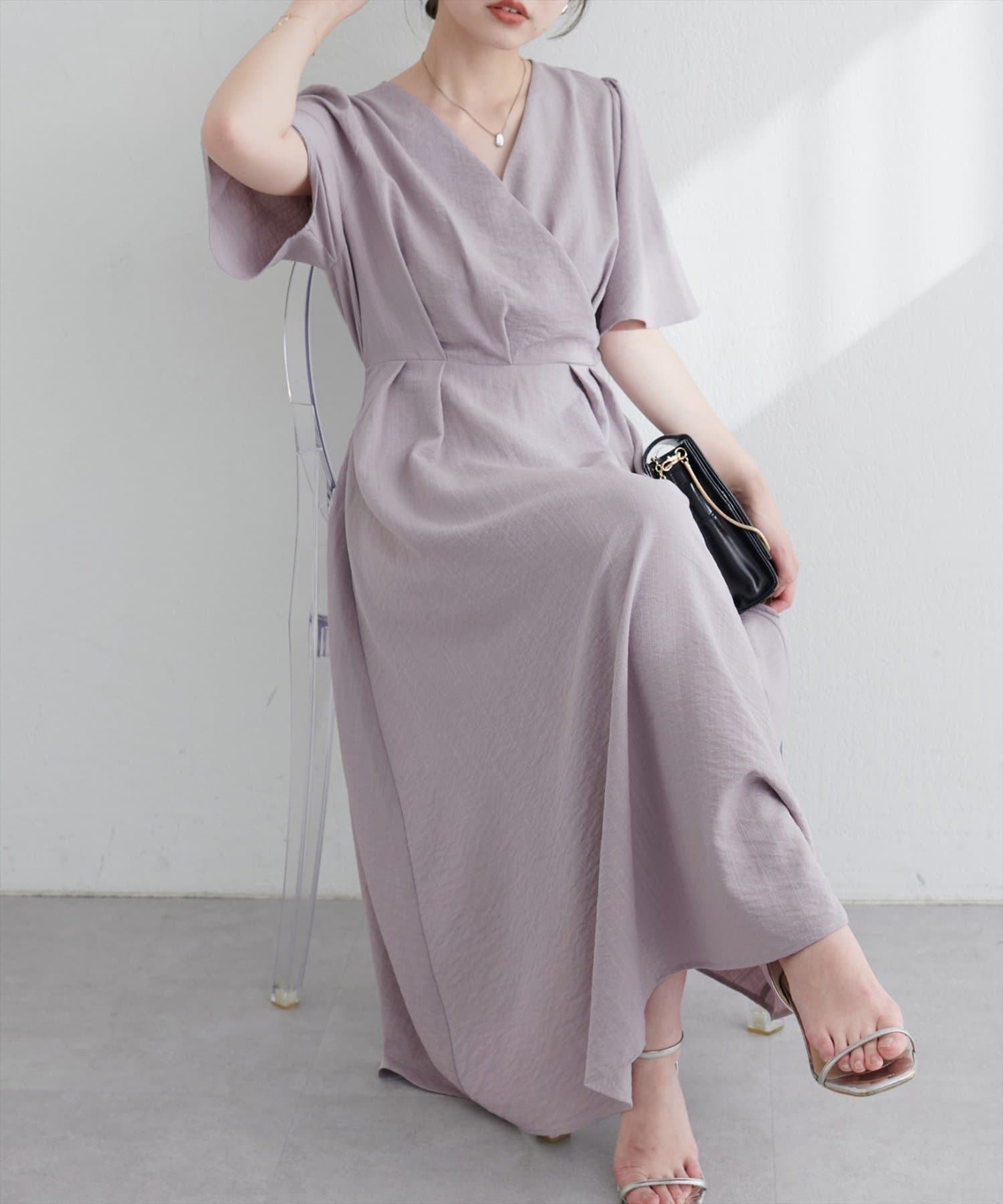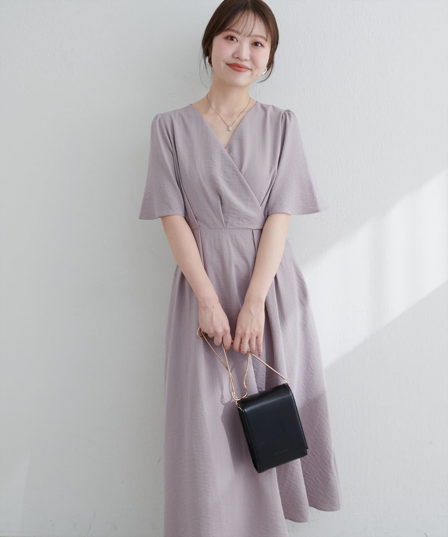 カシュクールデザインがシンプルすぎず、デコルテを程よく見せてくれることでヘルシーで女性らしくスタイリングしてくれます。