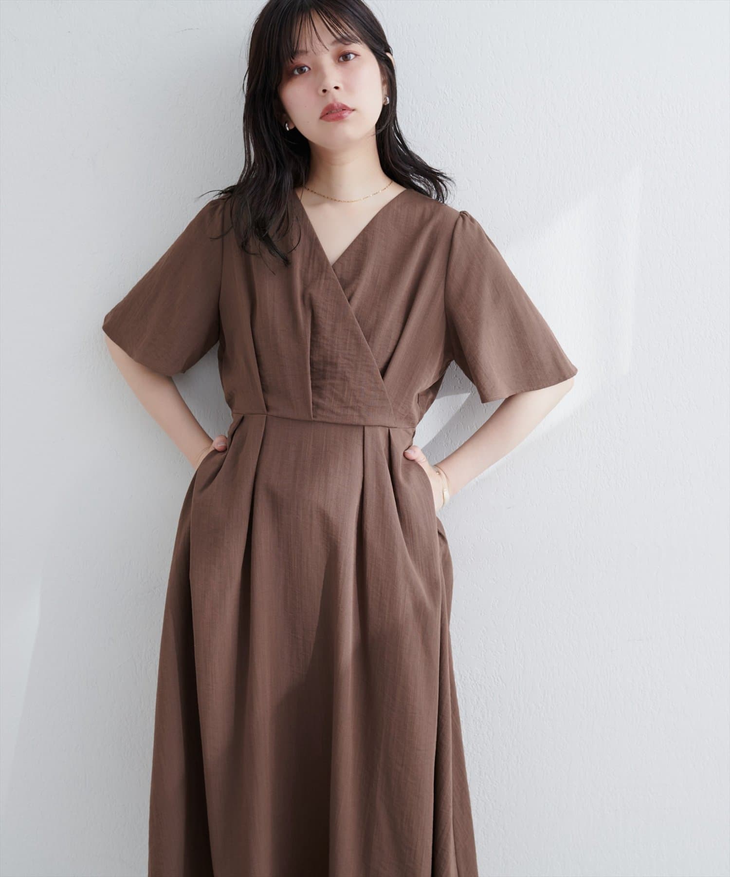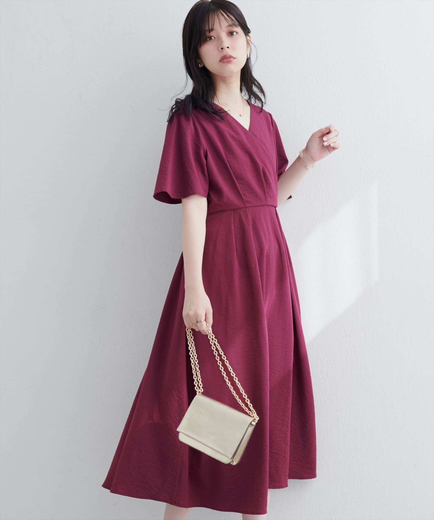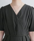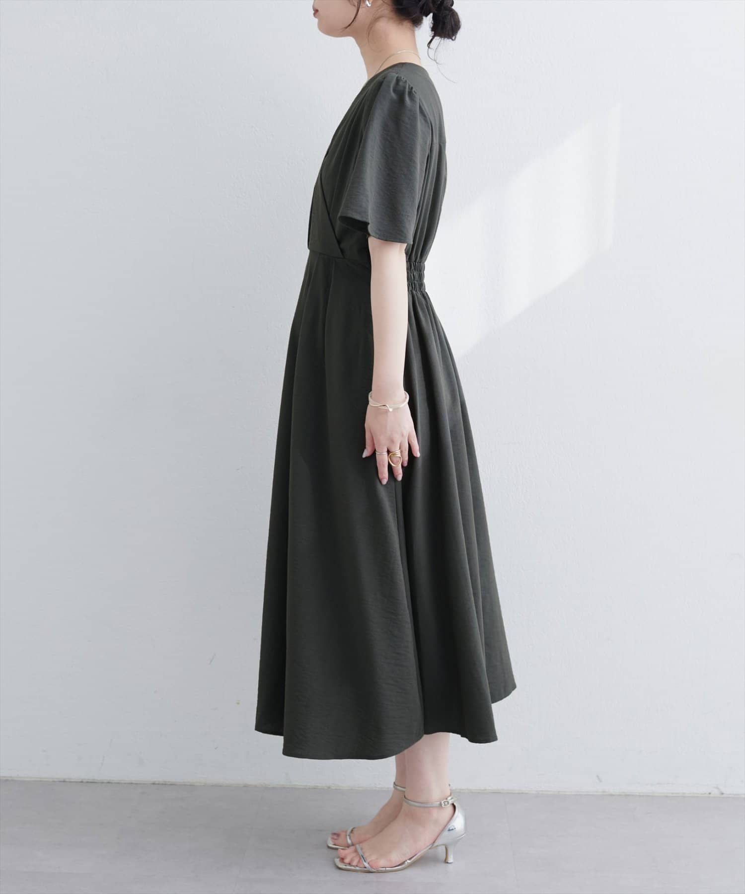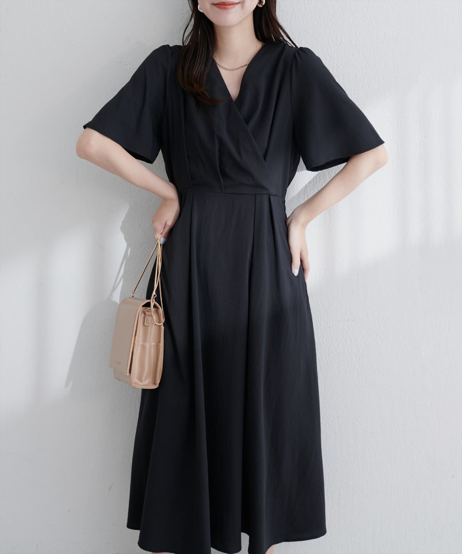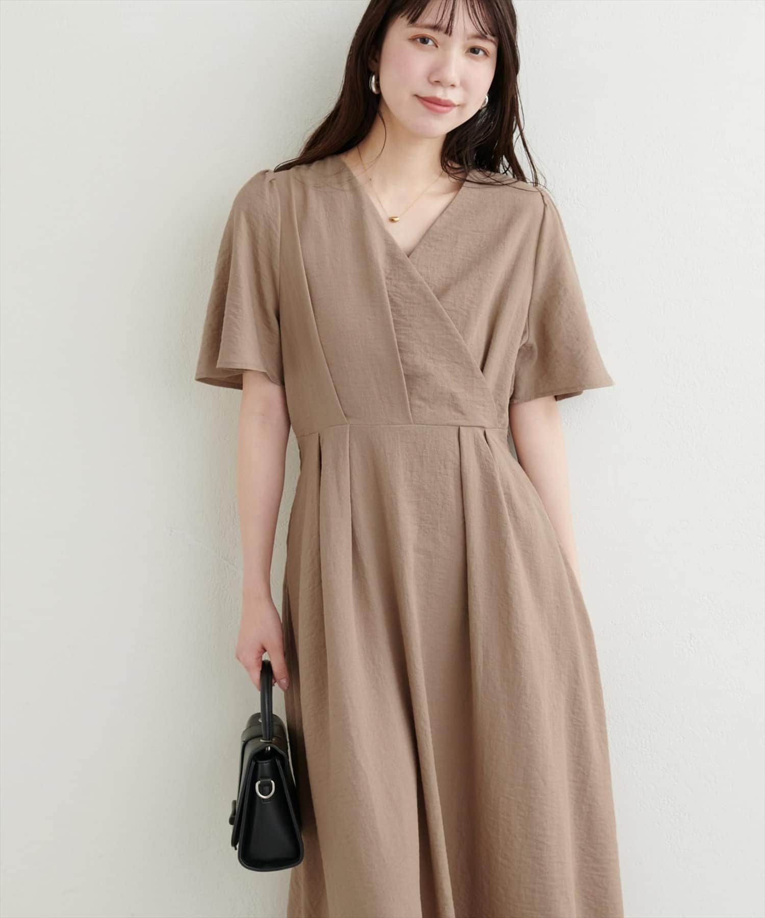 カシュクールデザインがシンプルすぎず、デコルテを程よく見せてくれることでヘルシーで女性らしくスタイリングしてくれます。