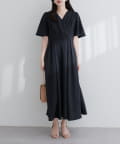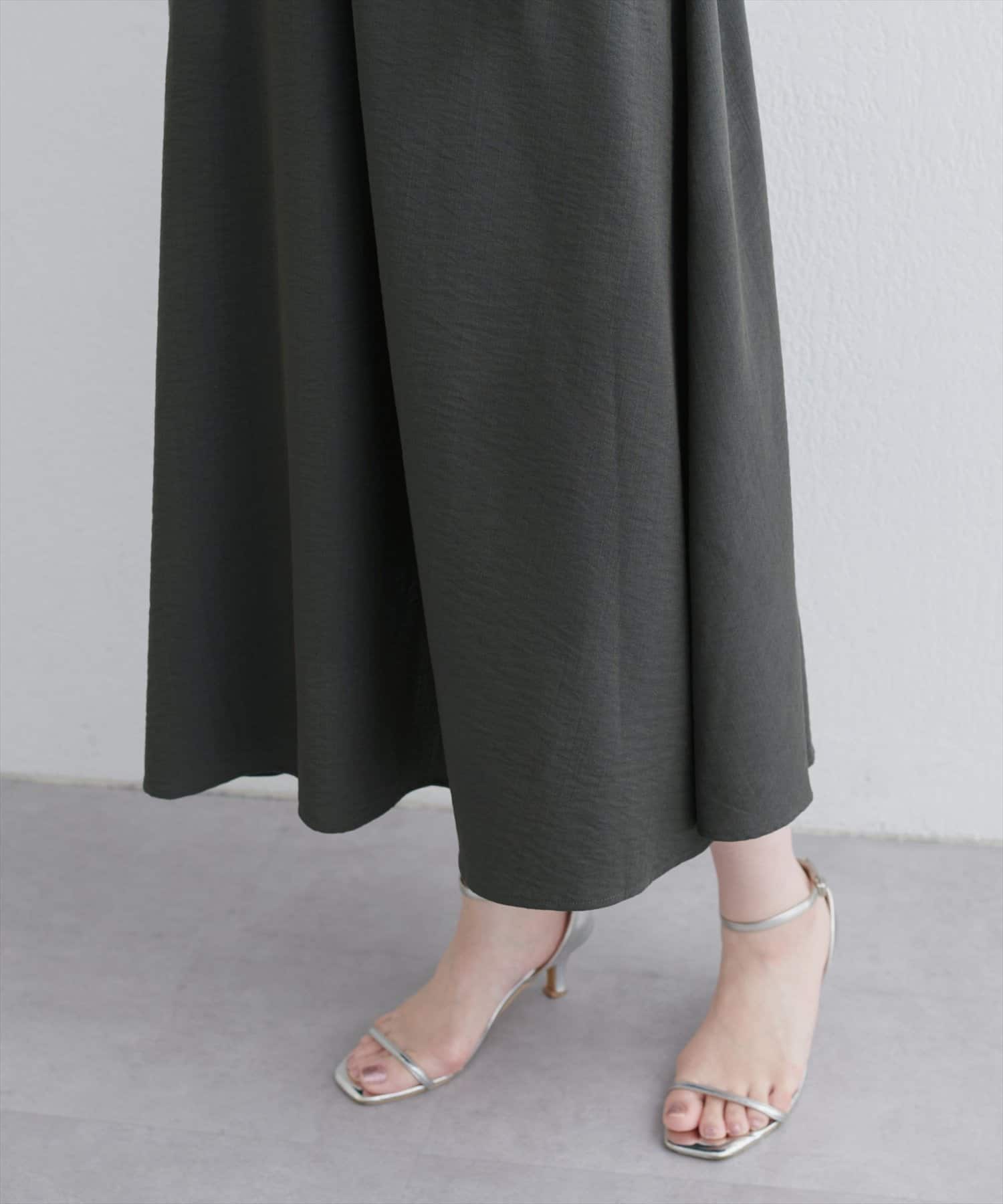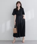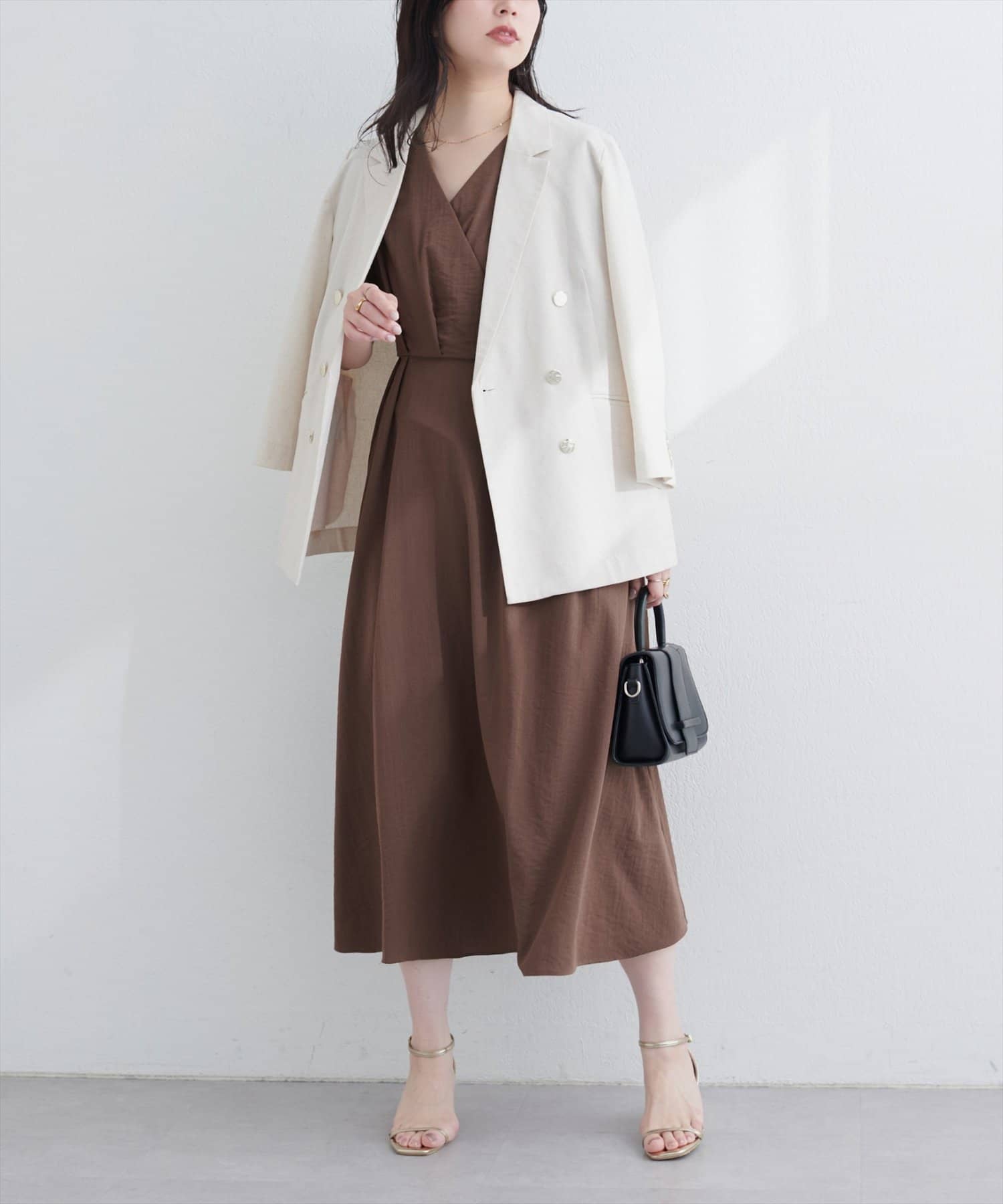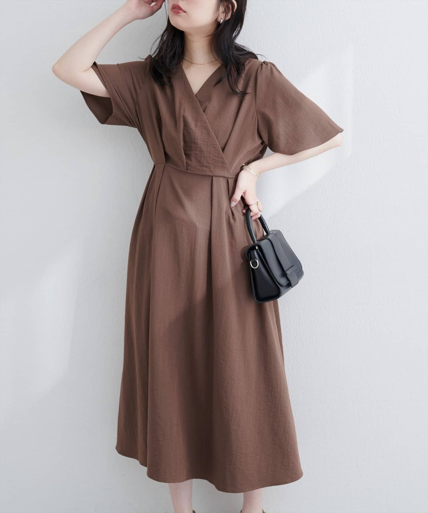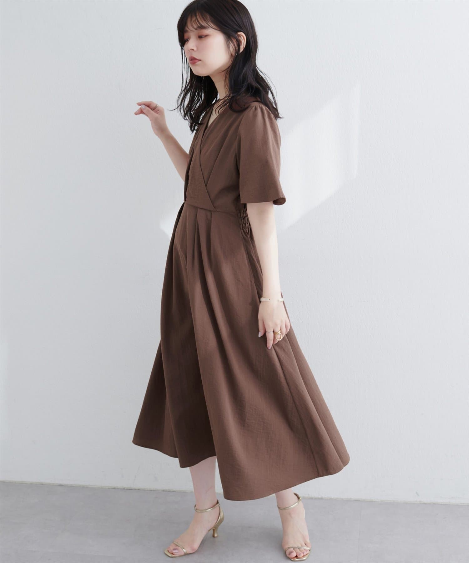 カシュクールデザインがシンプルすぎず、デコルテを程よく見せてくれることでヘルシーで女性らしくスタイリングしてくれます。