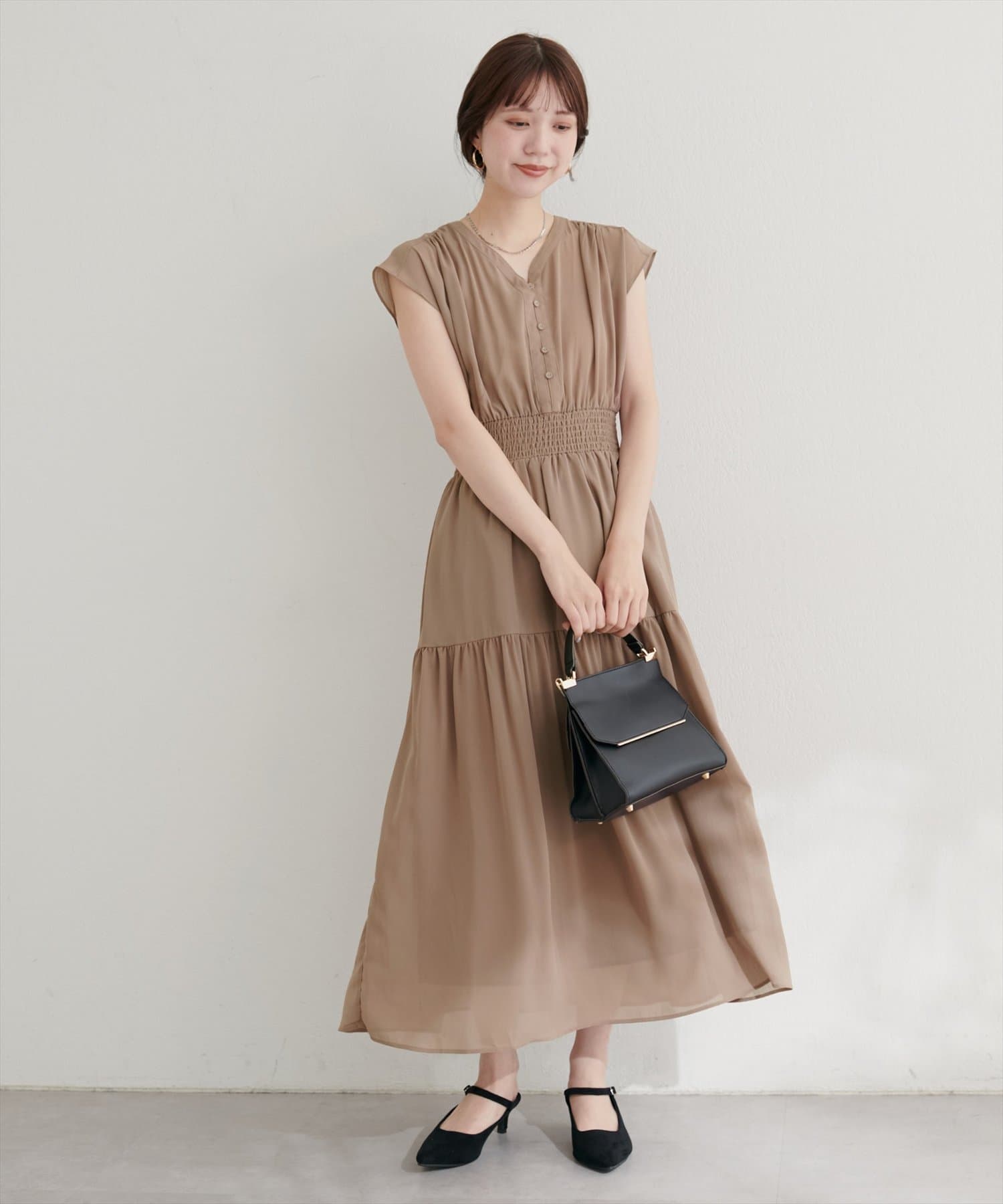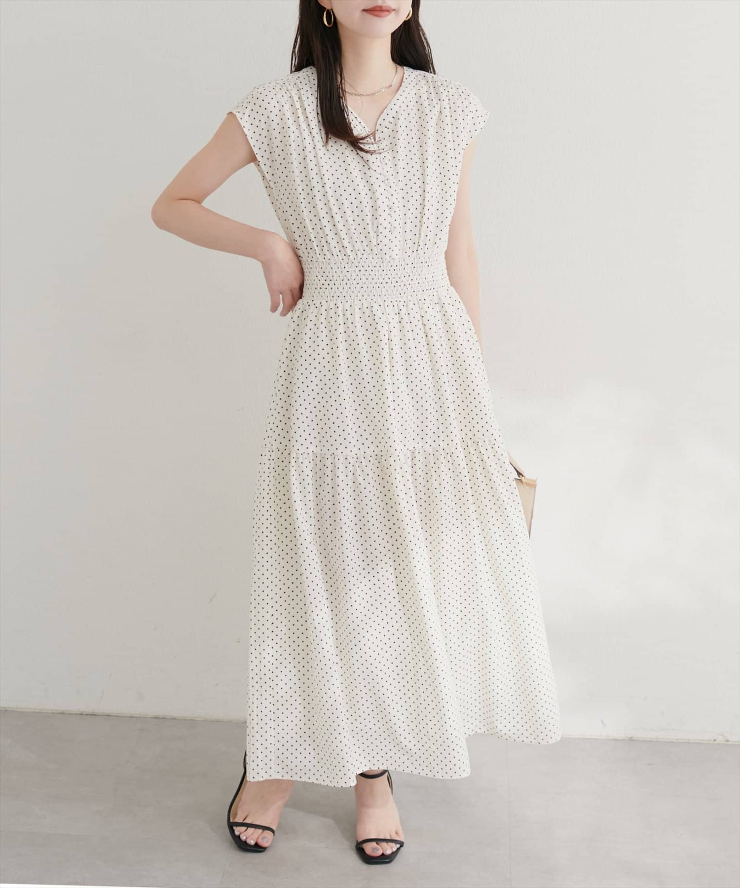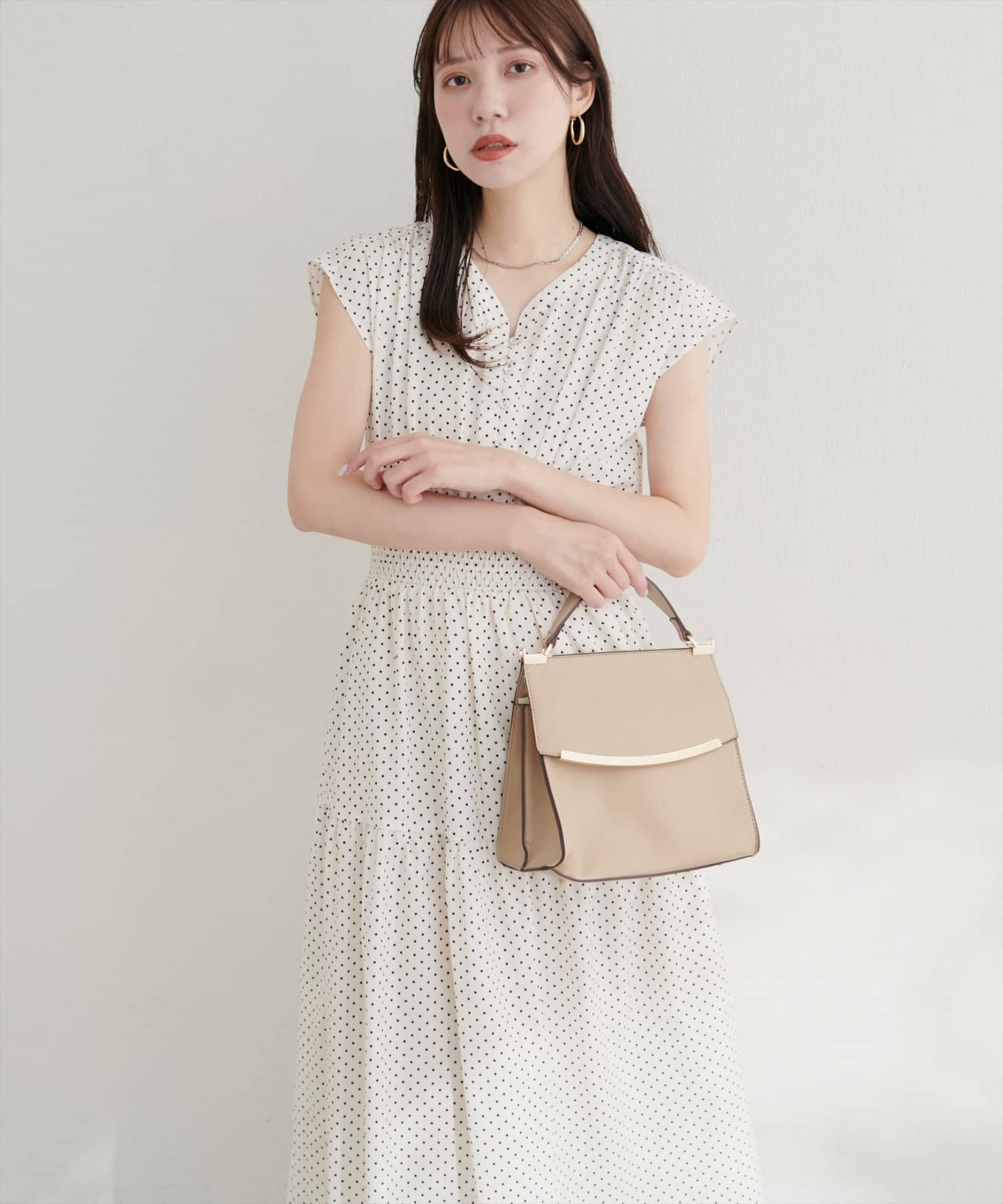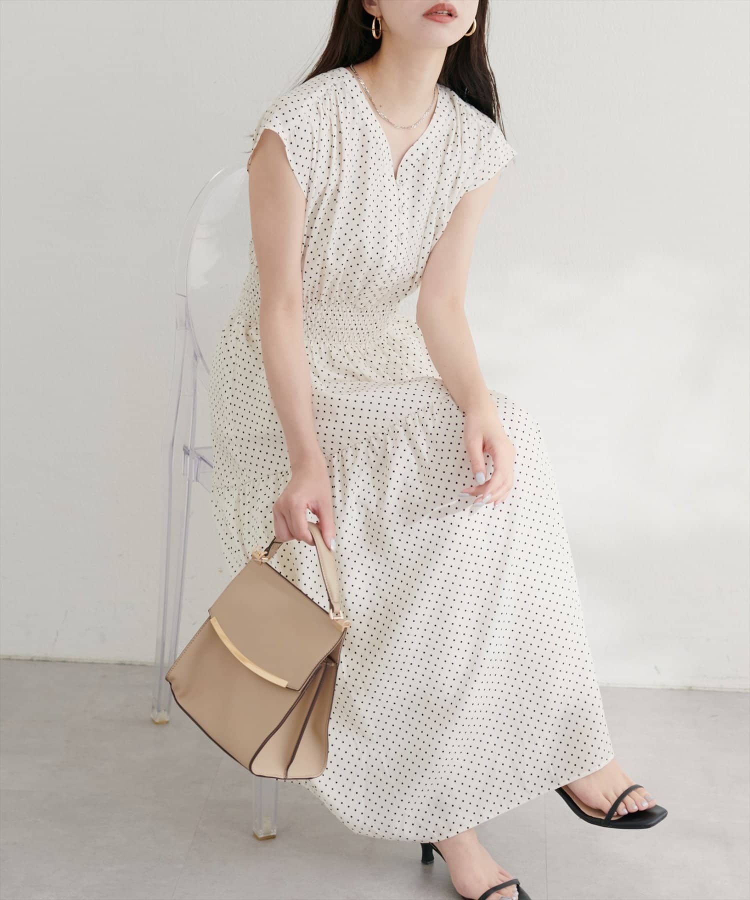 足元はサンダルやミュール、デザイン性ある1枚なので小物はシンプルにまとめてあげると上品なスタイリングに仕上がります。