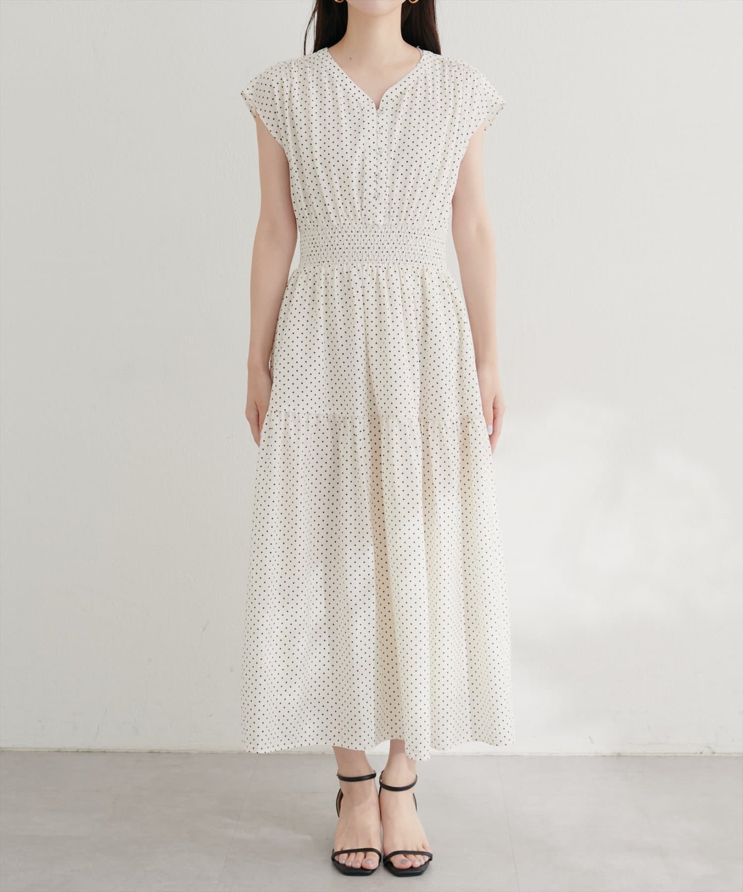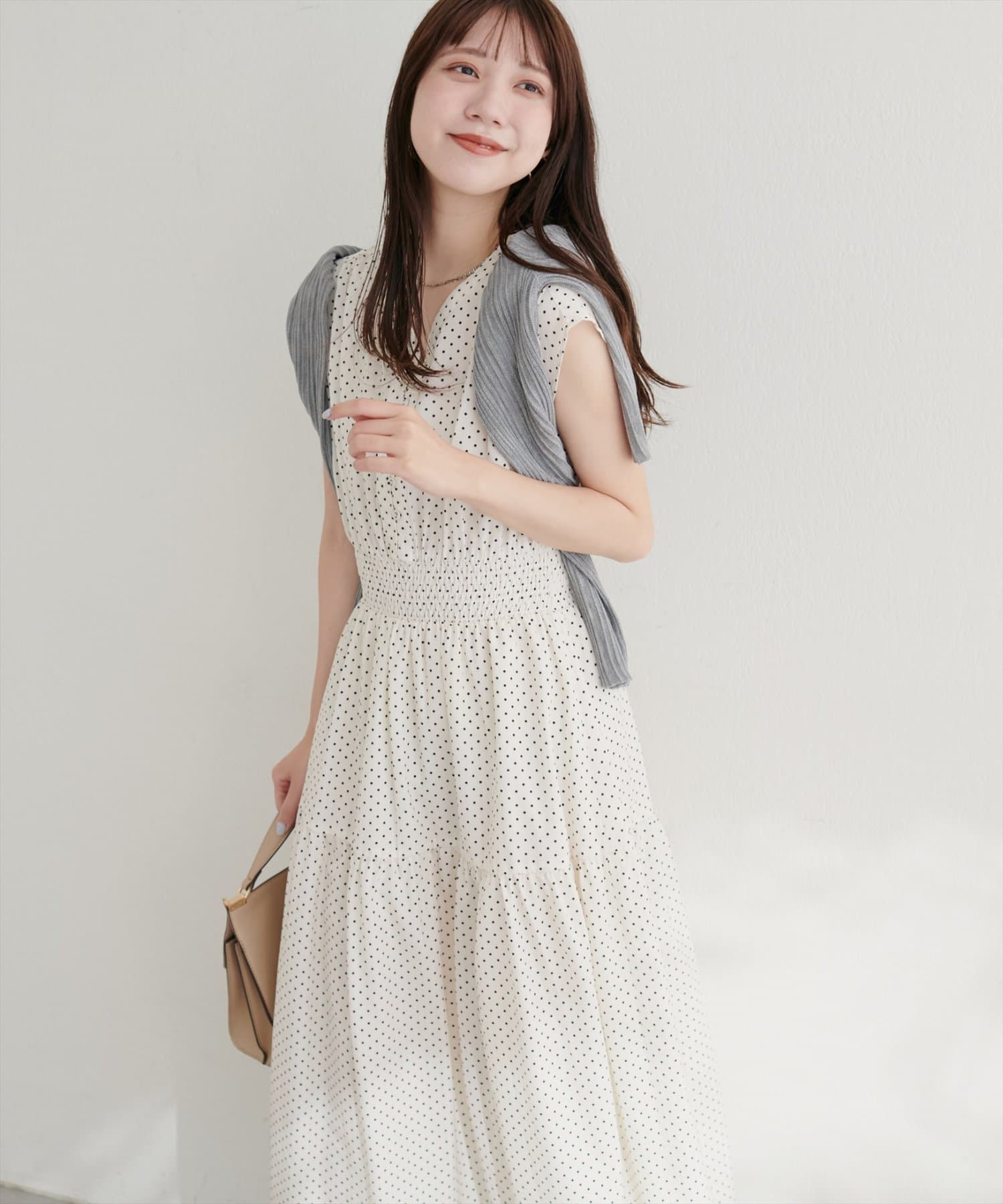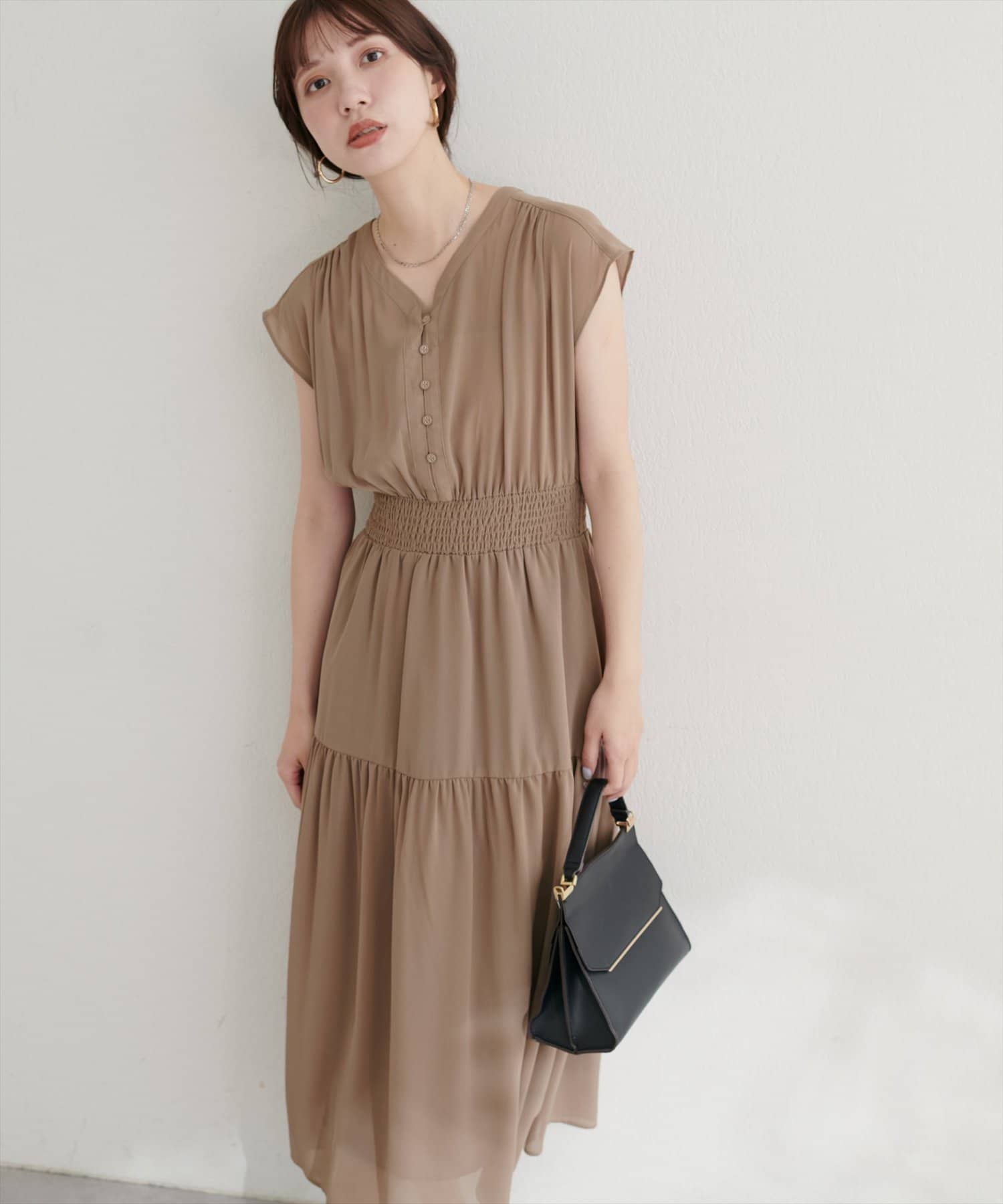 足元はサンダルやミュール、デザイン性ある1枚なので小物はシンプルにまとめてあげると上品なスタイリングに仕上がります。
