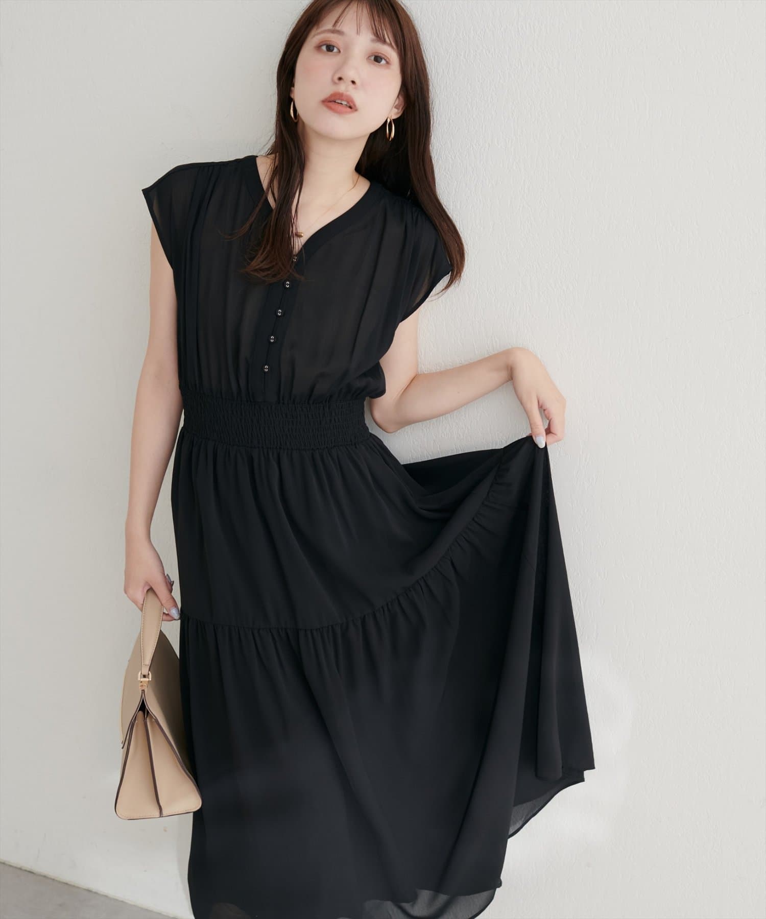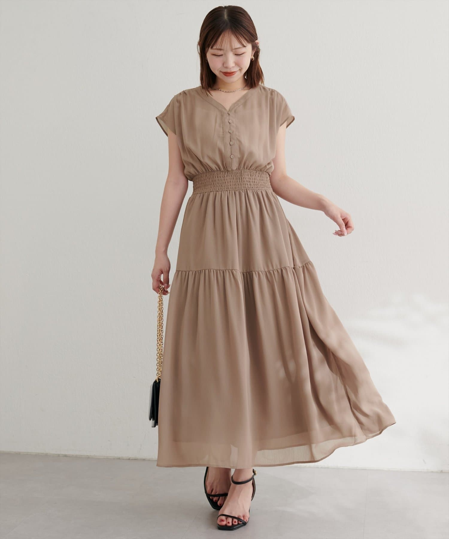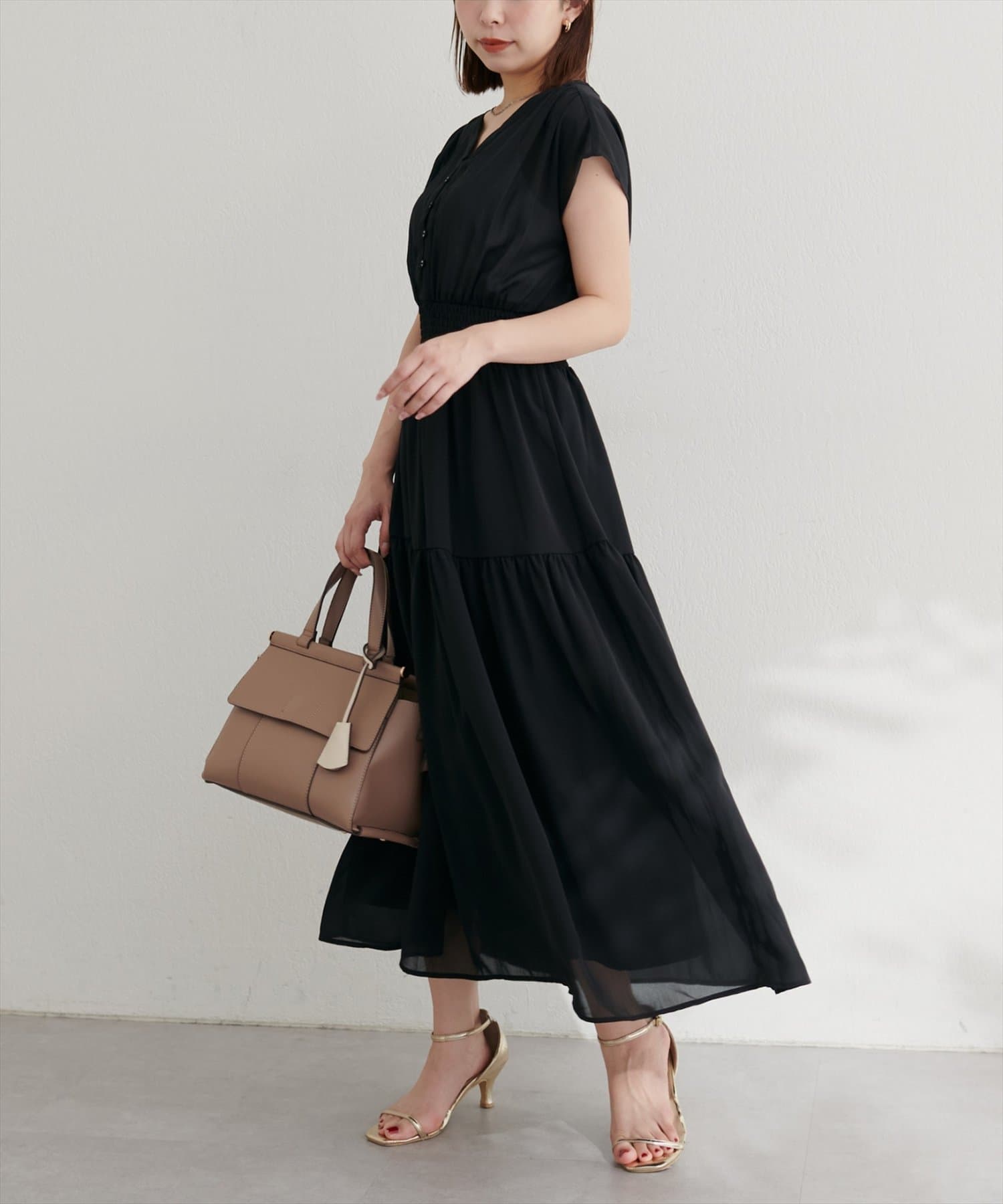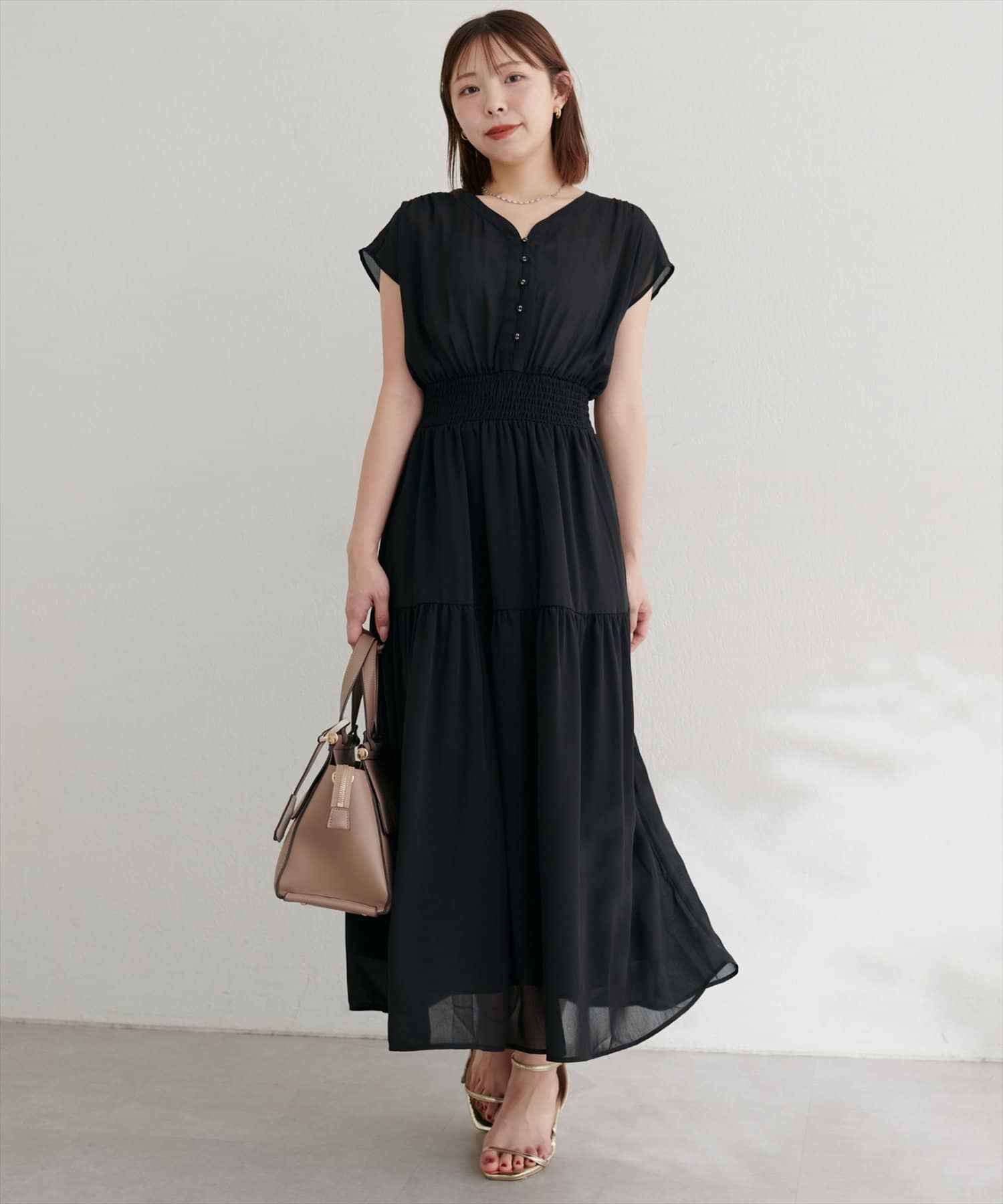 足元はサンダルやミュール、デザイン性ある1枚なので小物はシンプルにまとめてあげると上品なスタイリングに仕上がります。