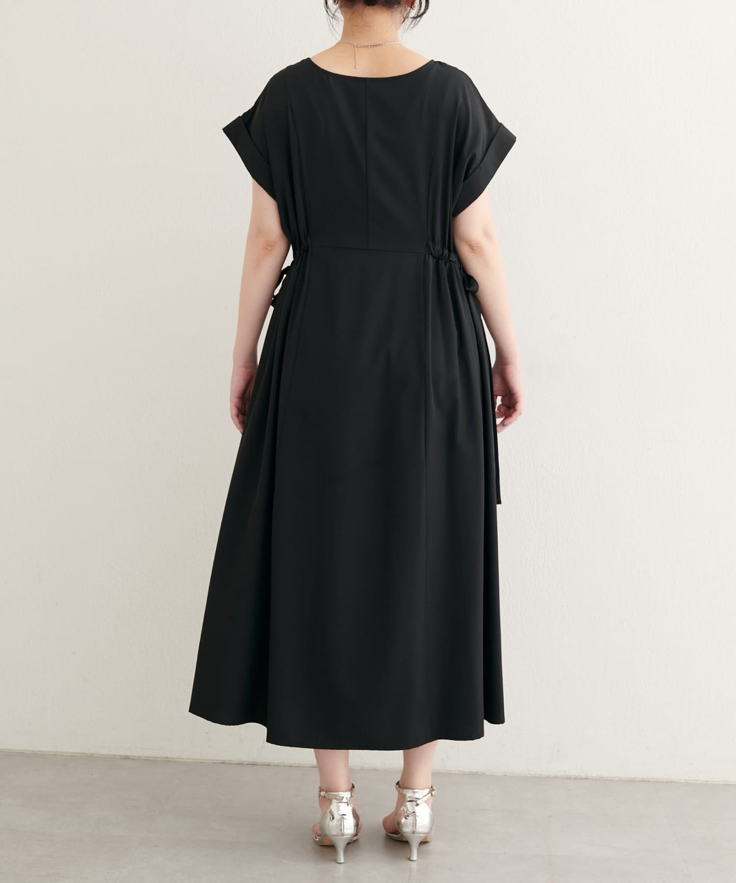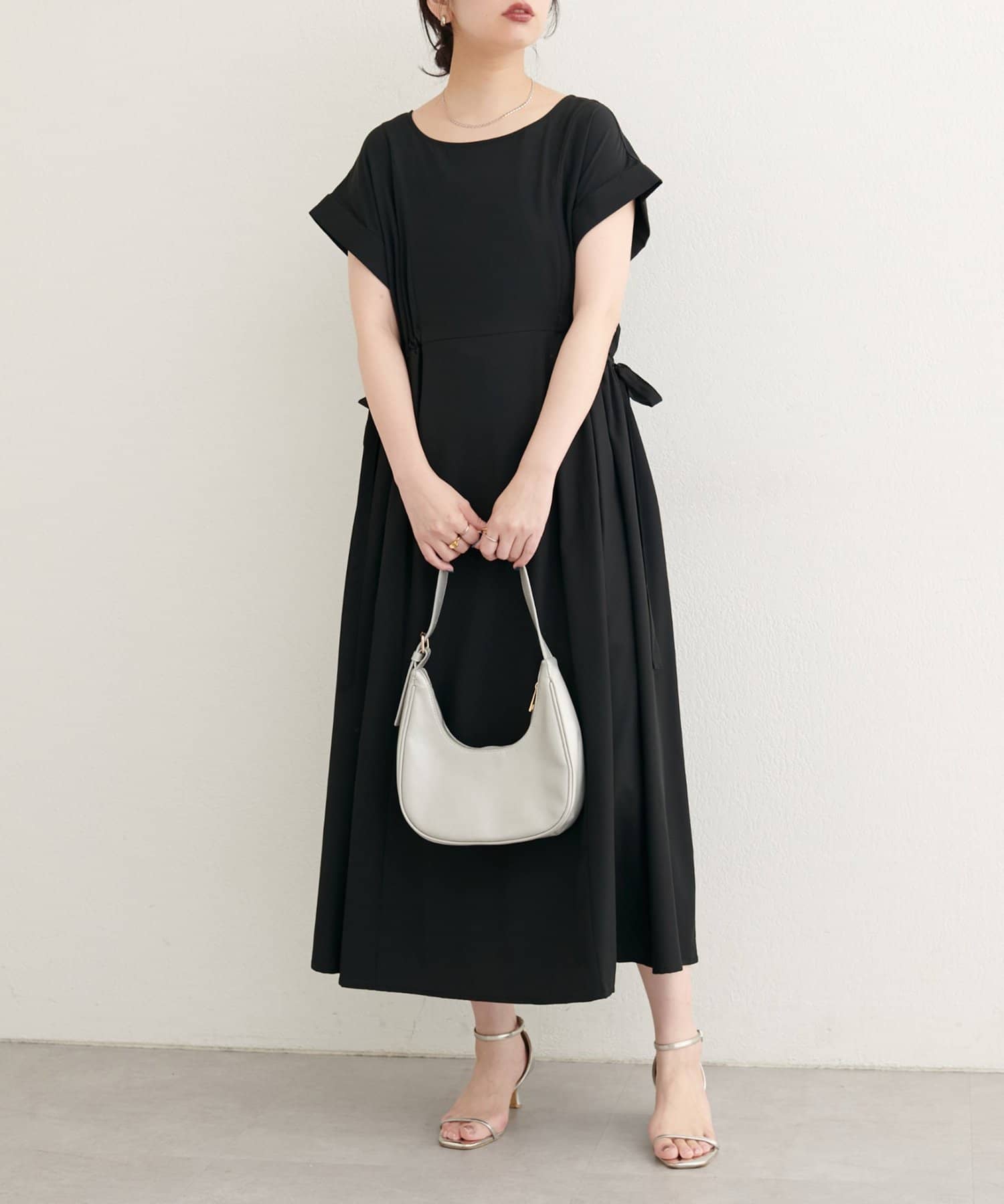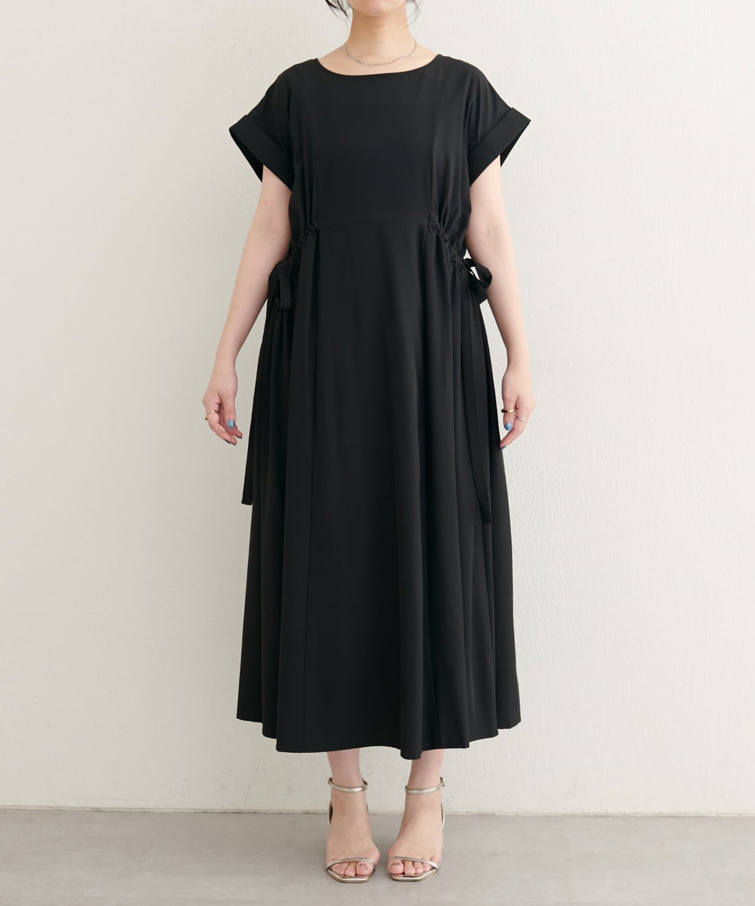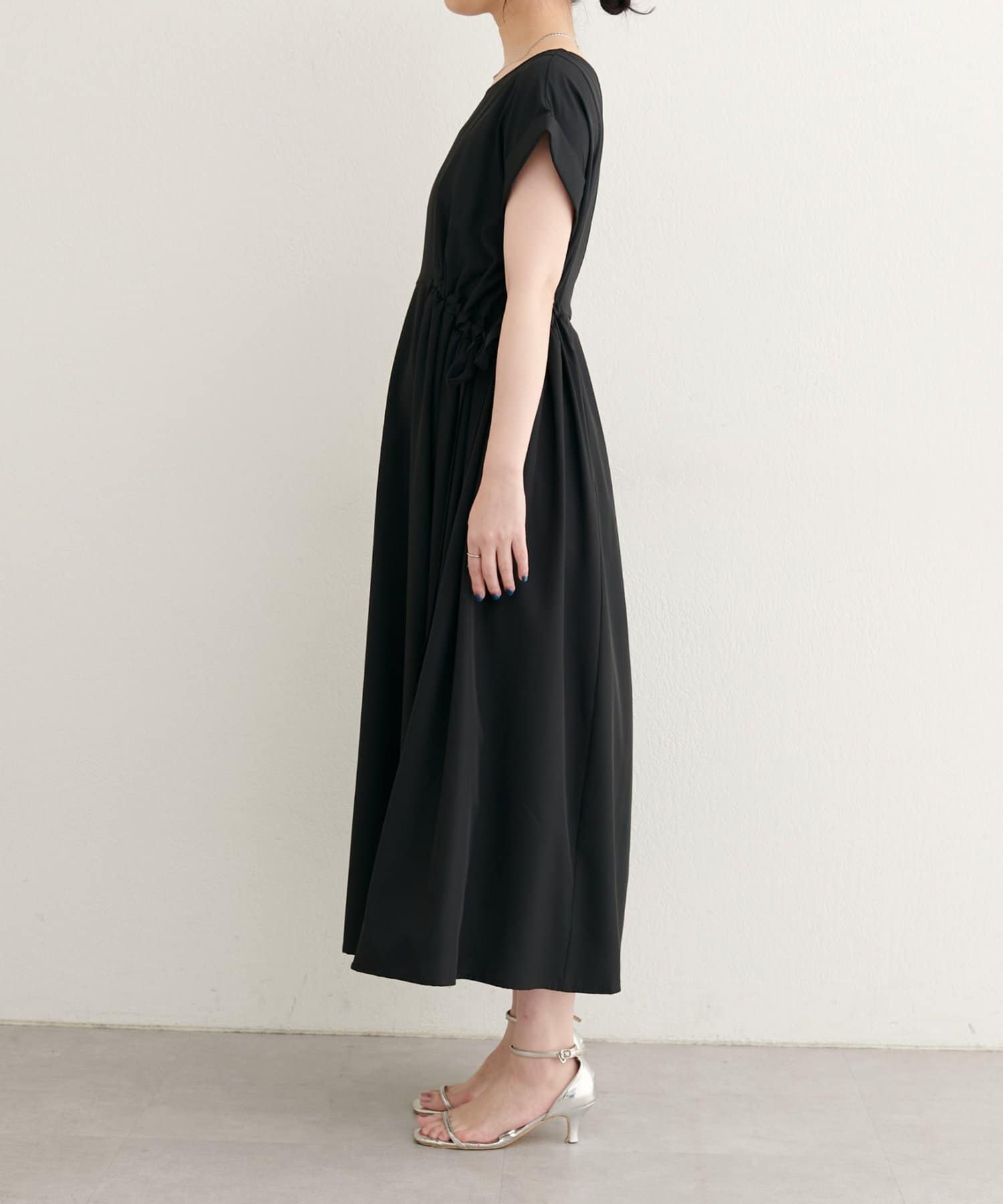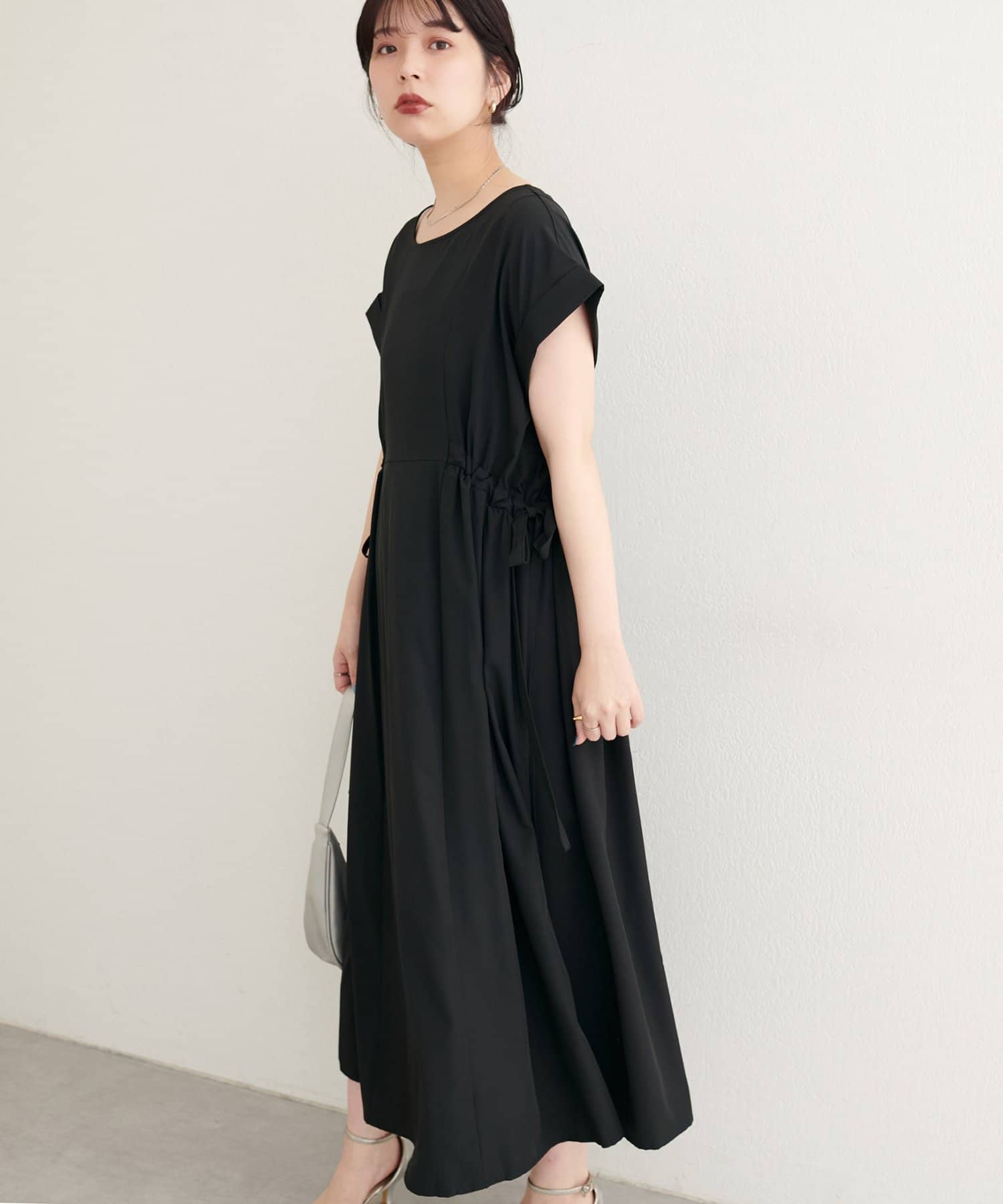 シンプルなデザインながらも、サイドのドロストがアクセントになったワンピース。