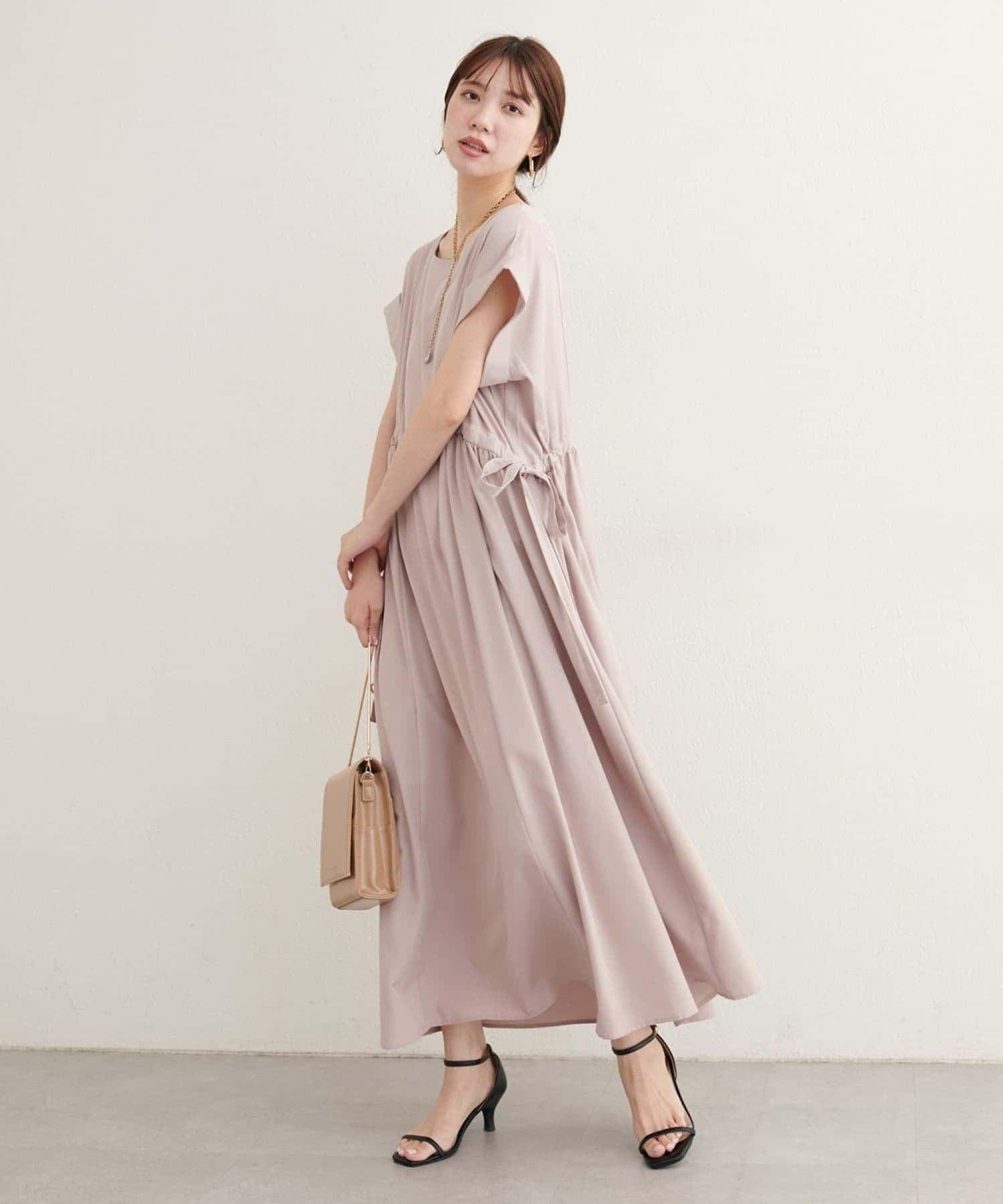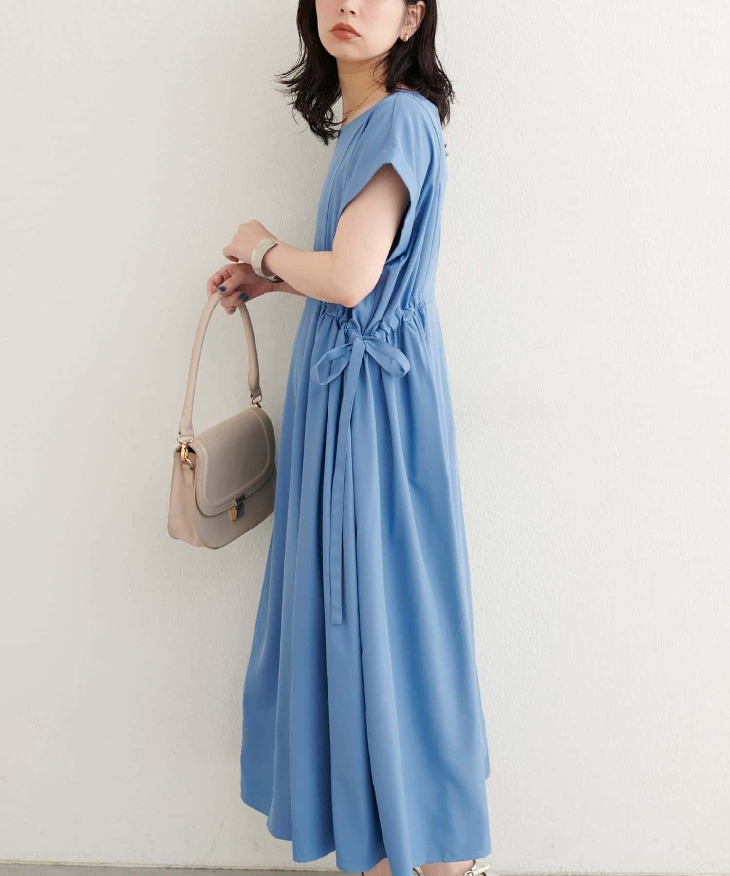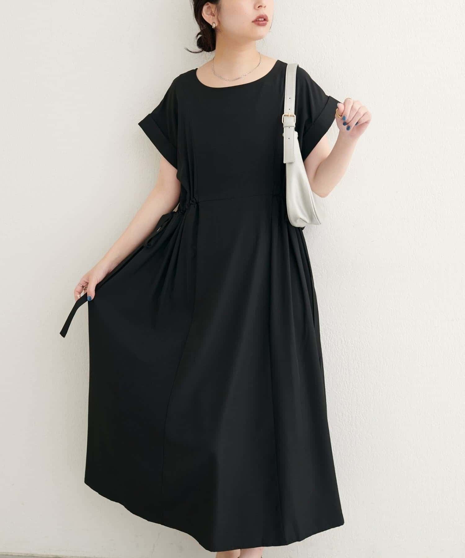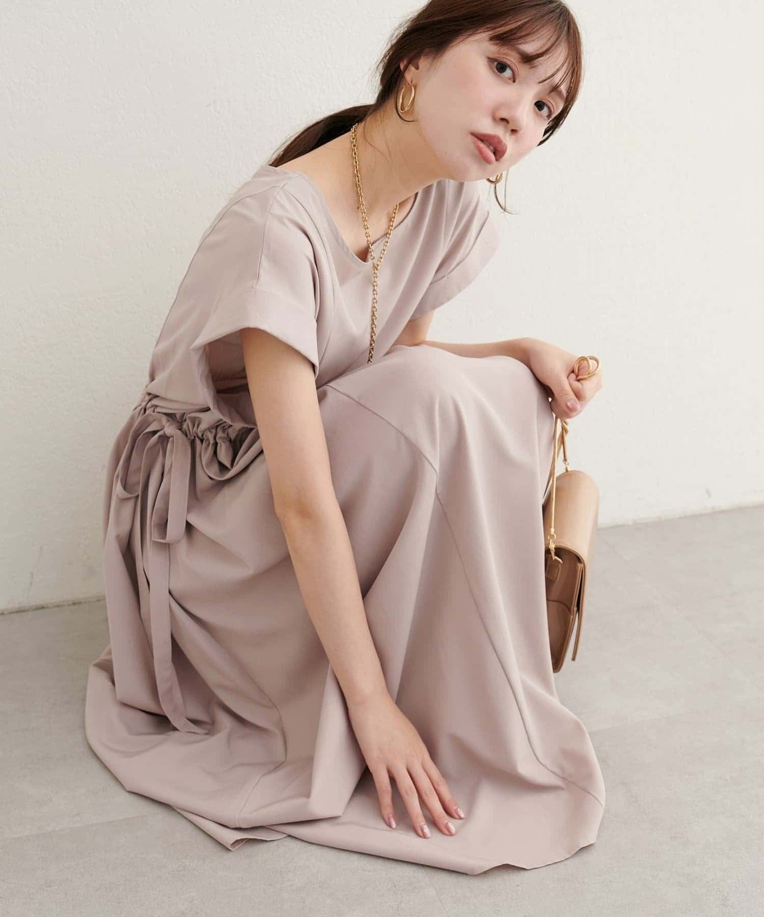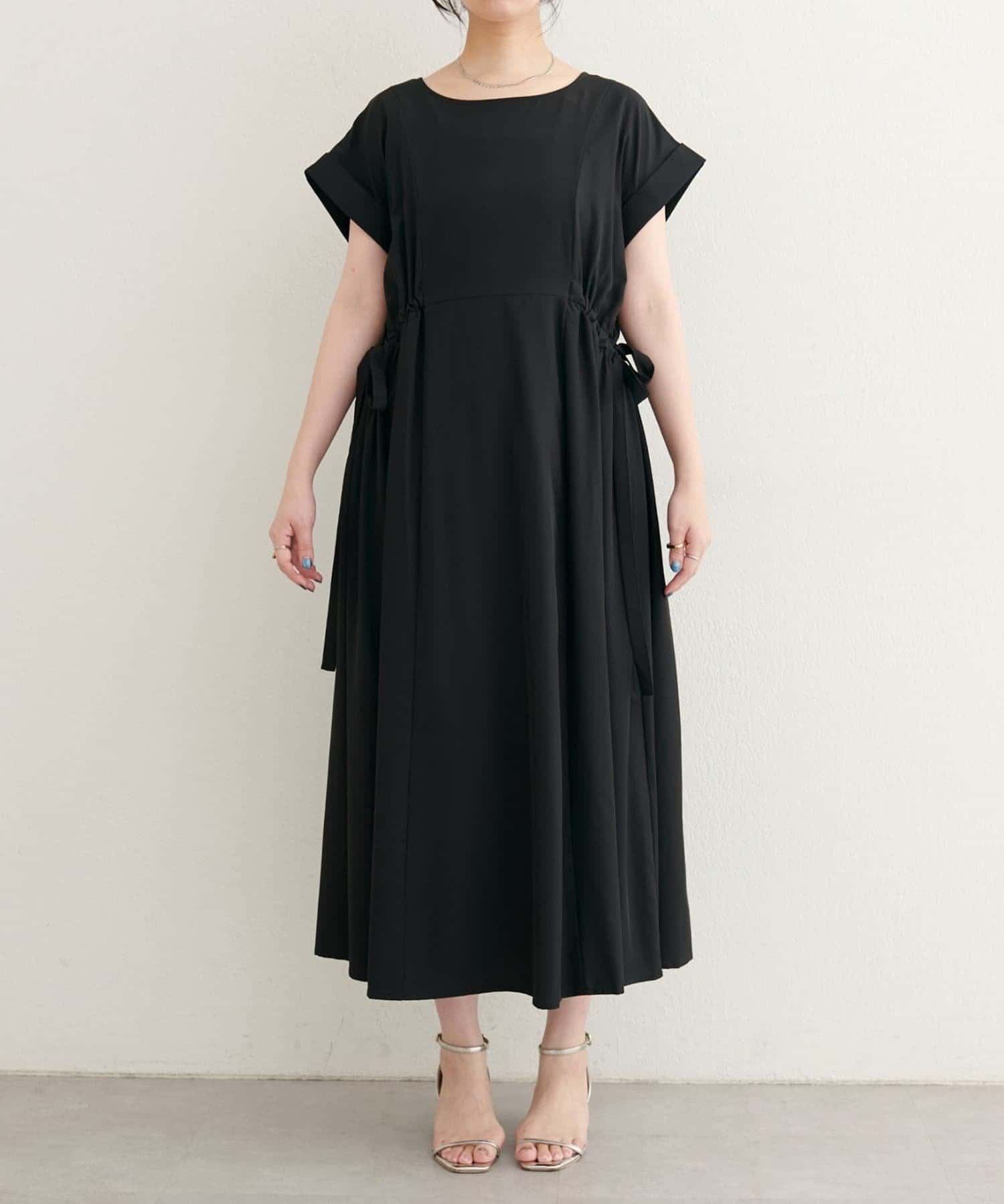 シンプルなデザインながらも、サイドのドロストがアクセントになったワンピース。