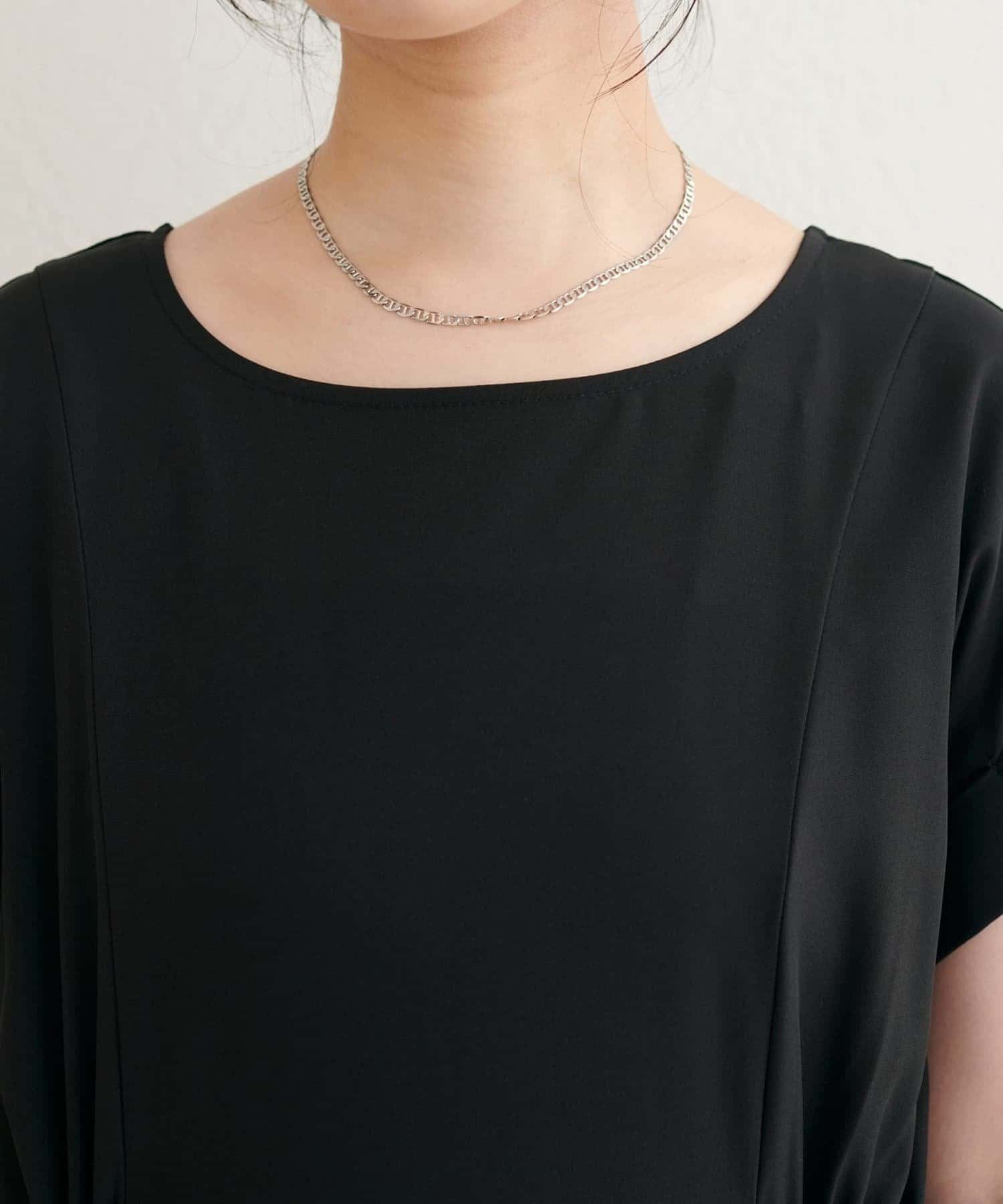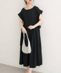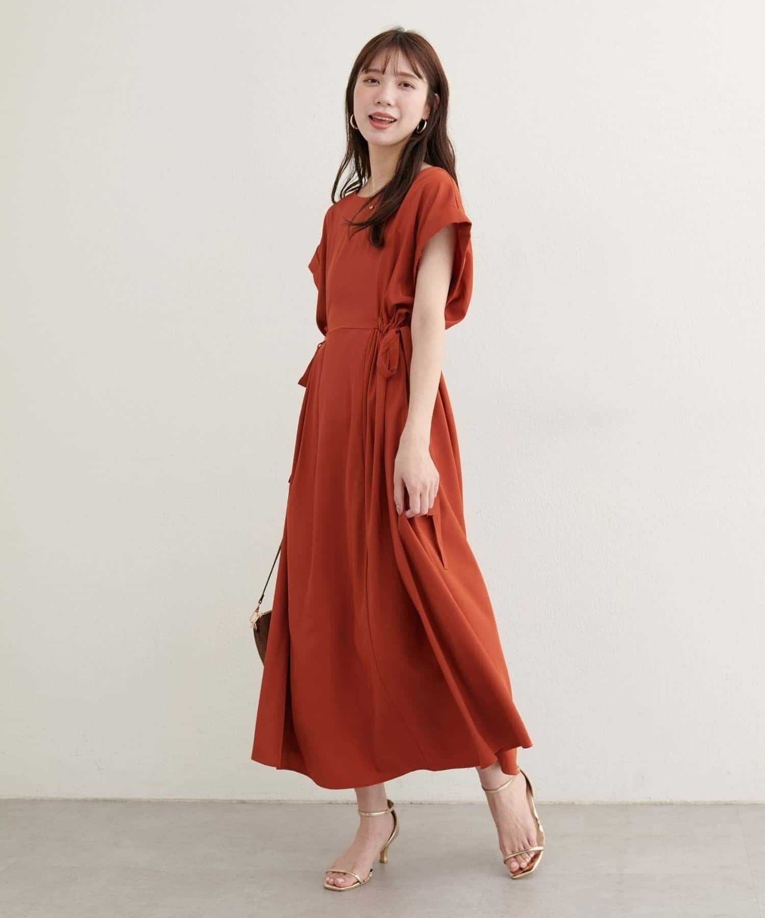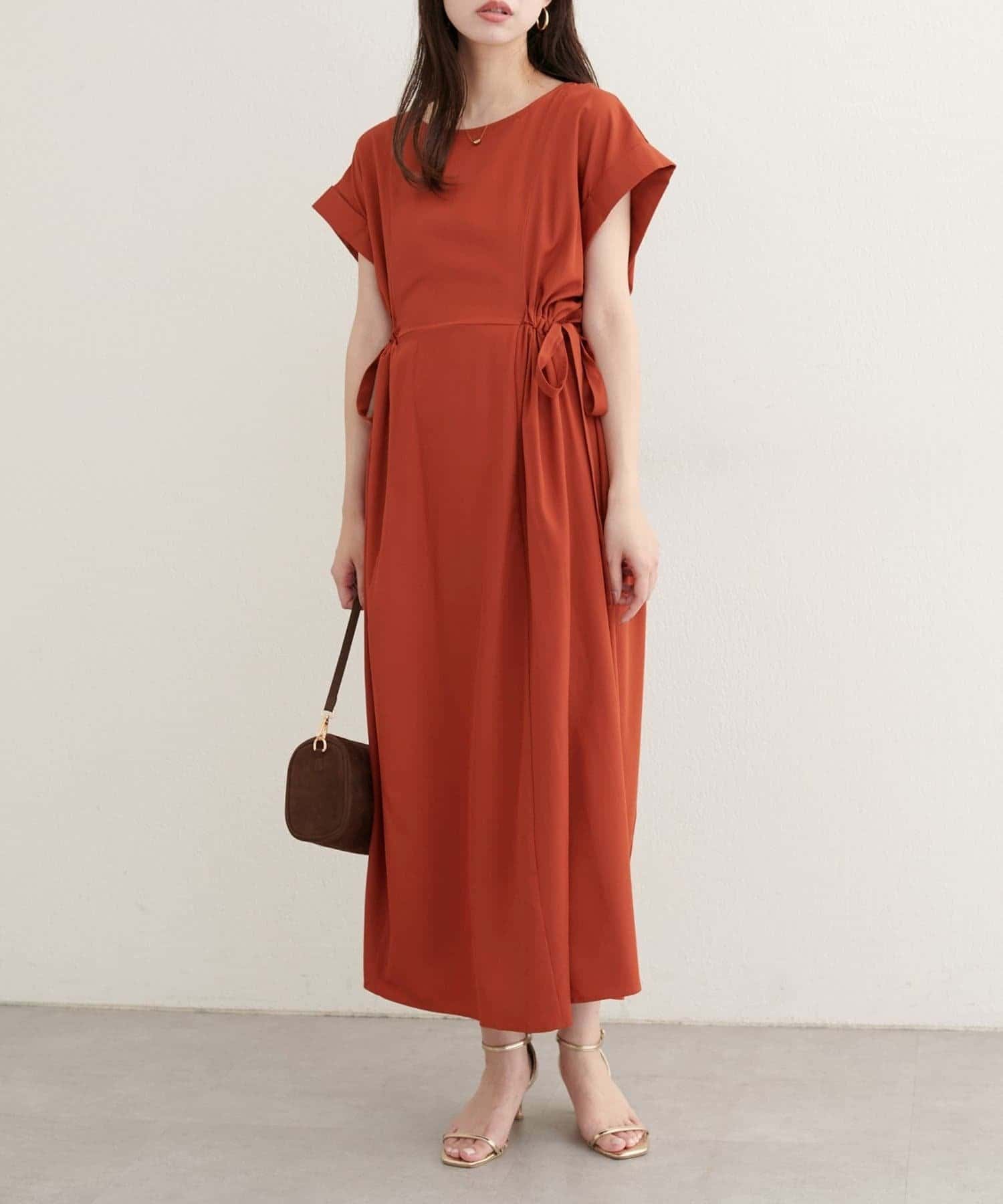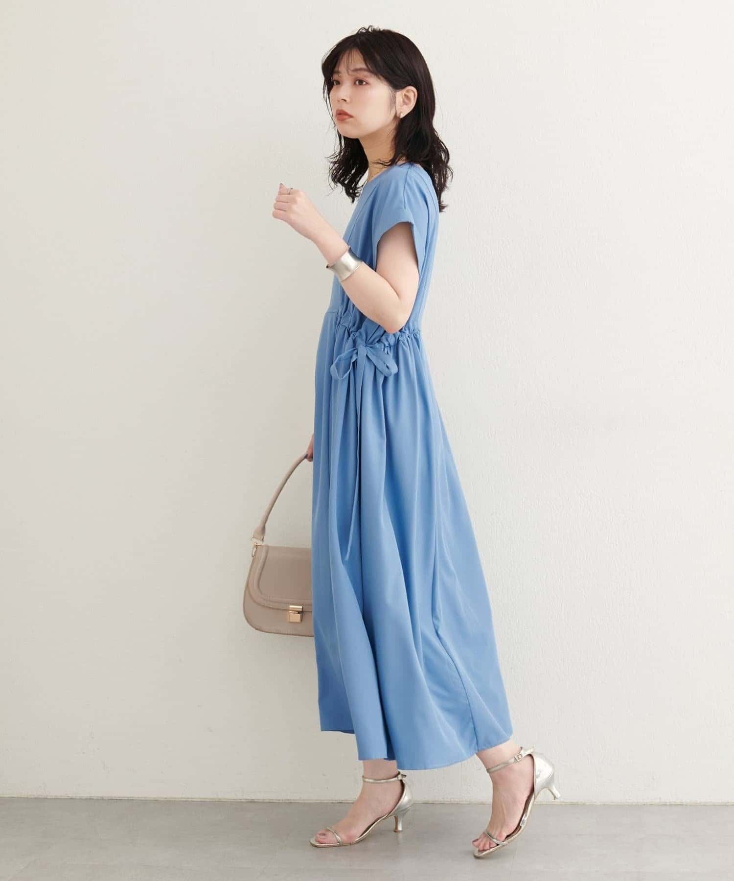 シンプルなデザインながらも、サイドのドロストがアクセントになったワンピース。