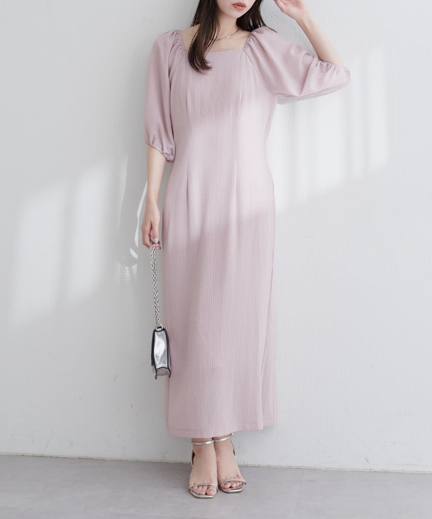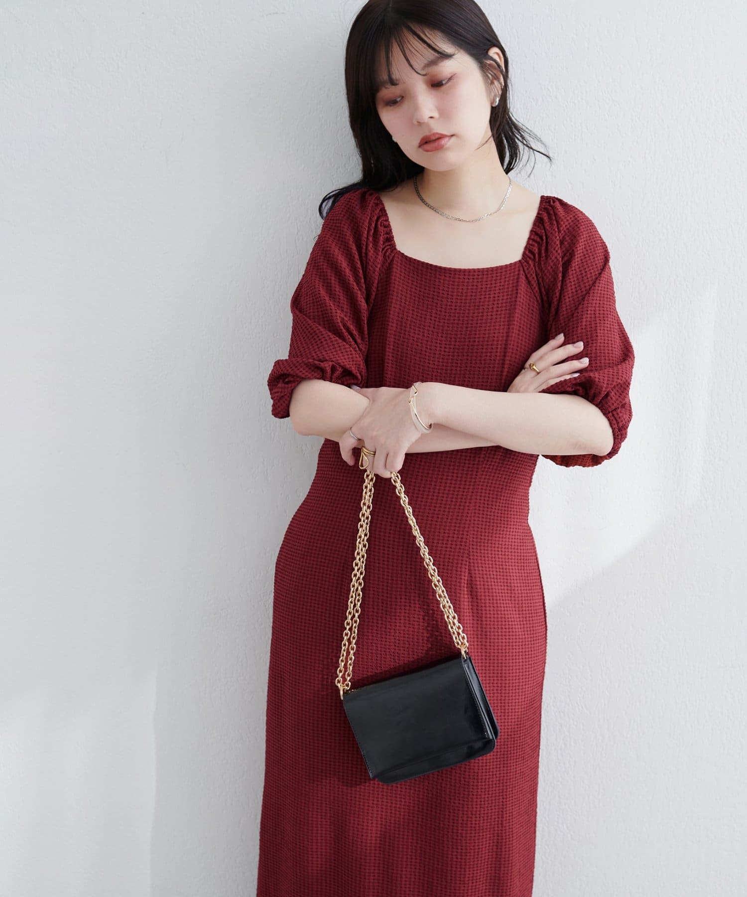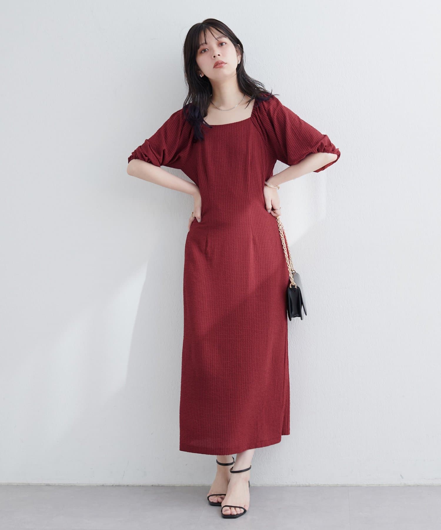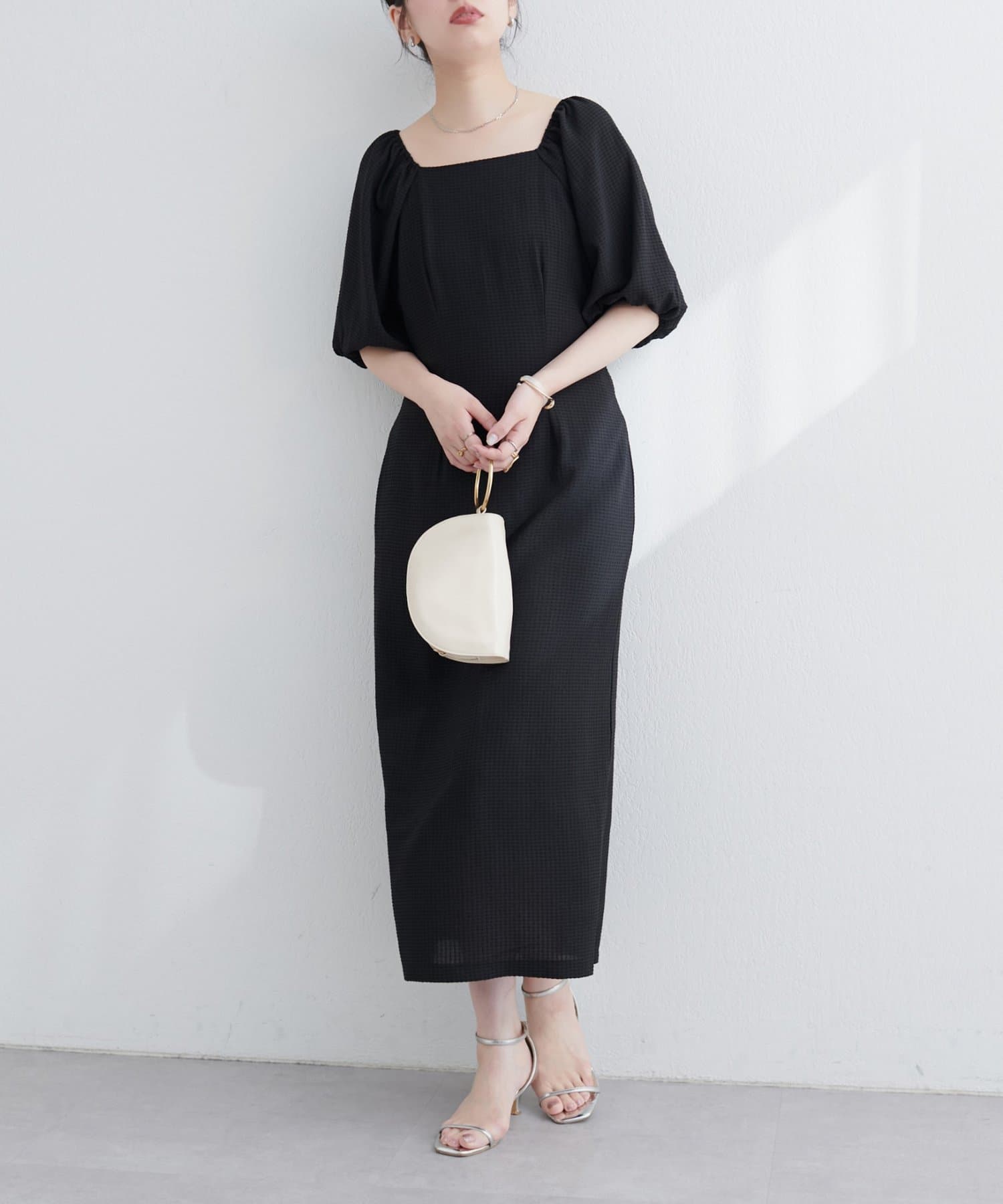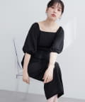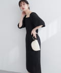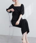 スクエアネックのタイトワンピースで 首元スッキリ、魅力的に着痩せが叶う1枚です。
