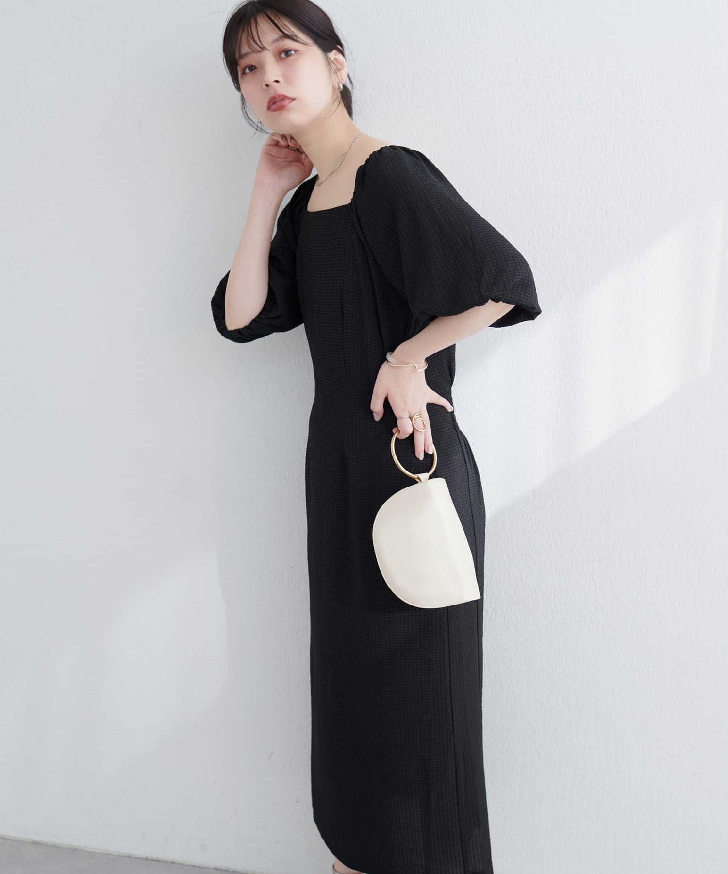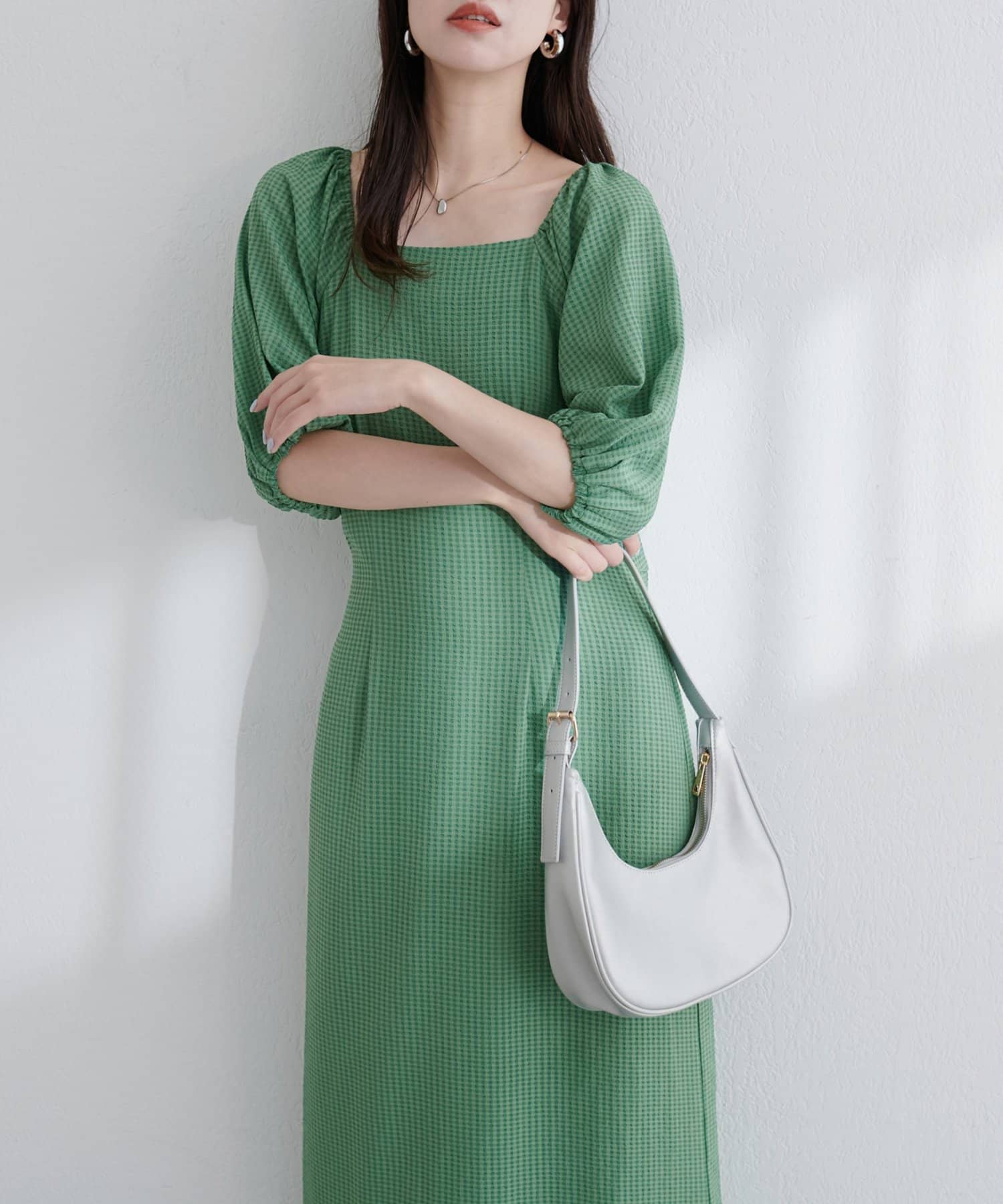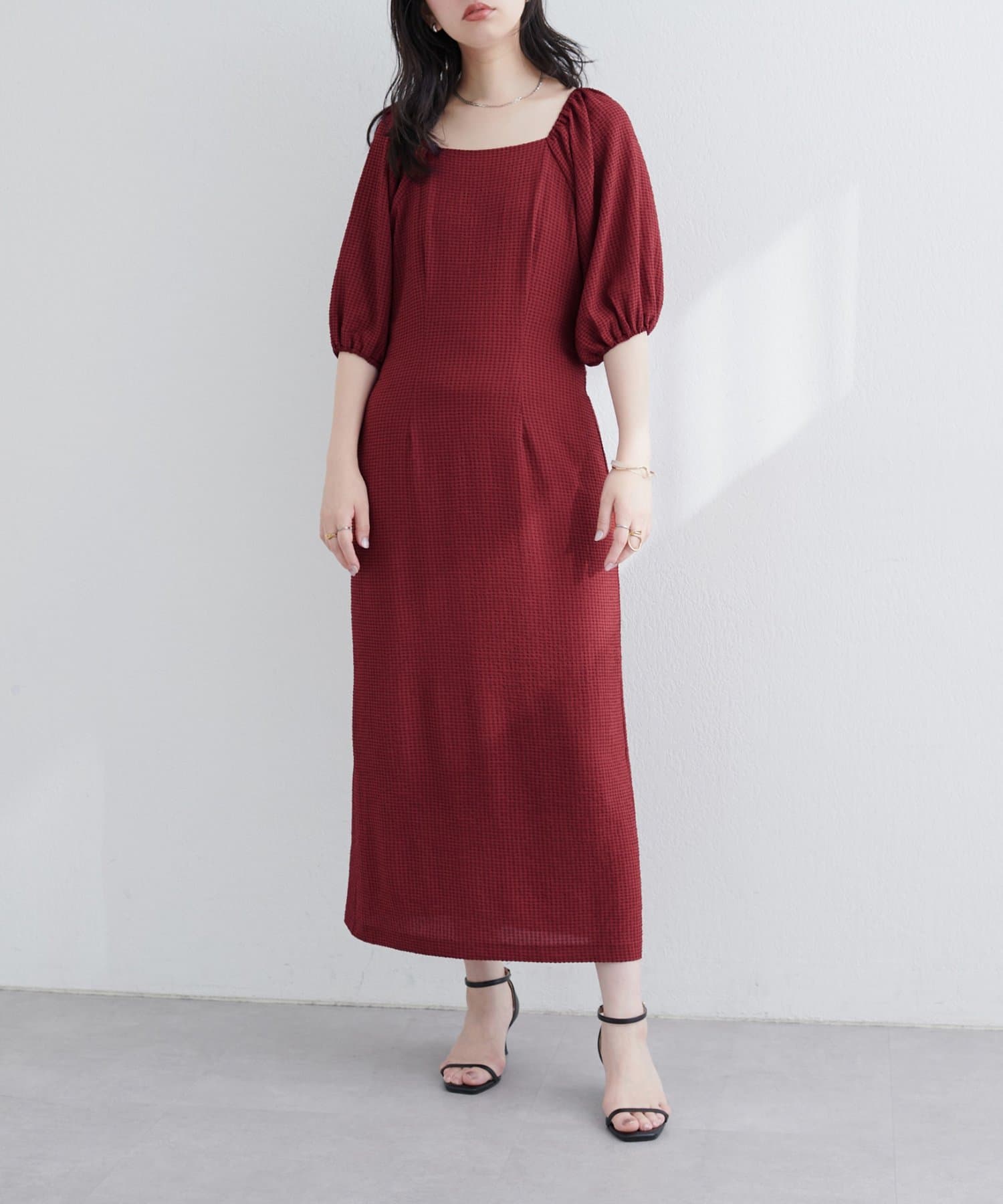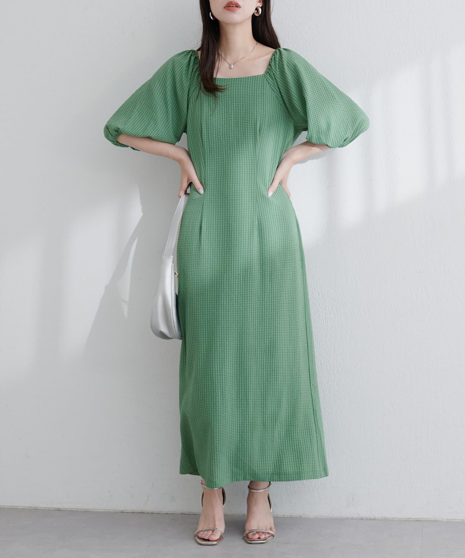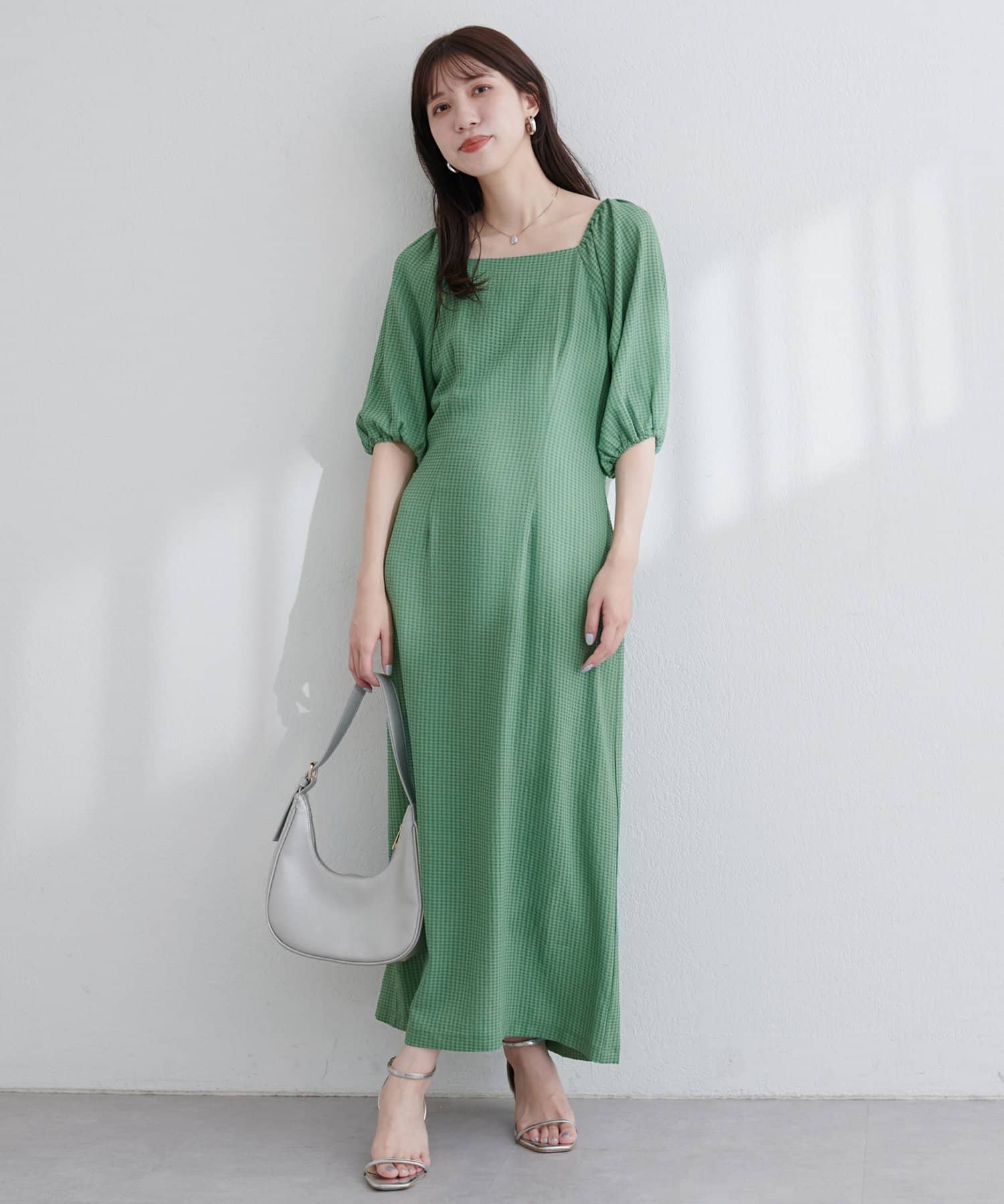 スクエアネックのタイトワンピースで 首元スッキリ、魅力的に着痩せが叶う1枚です。