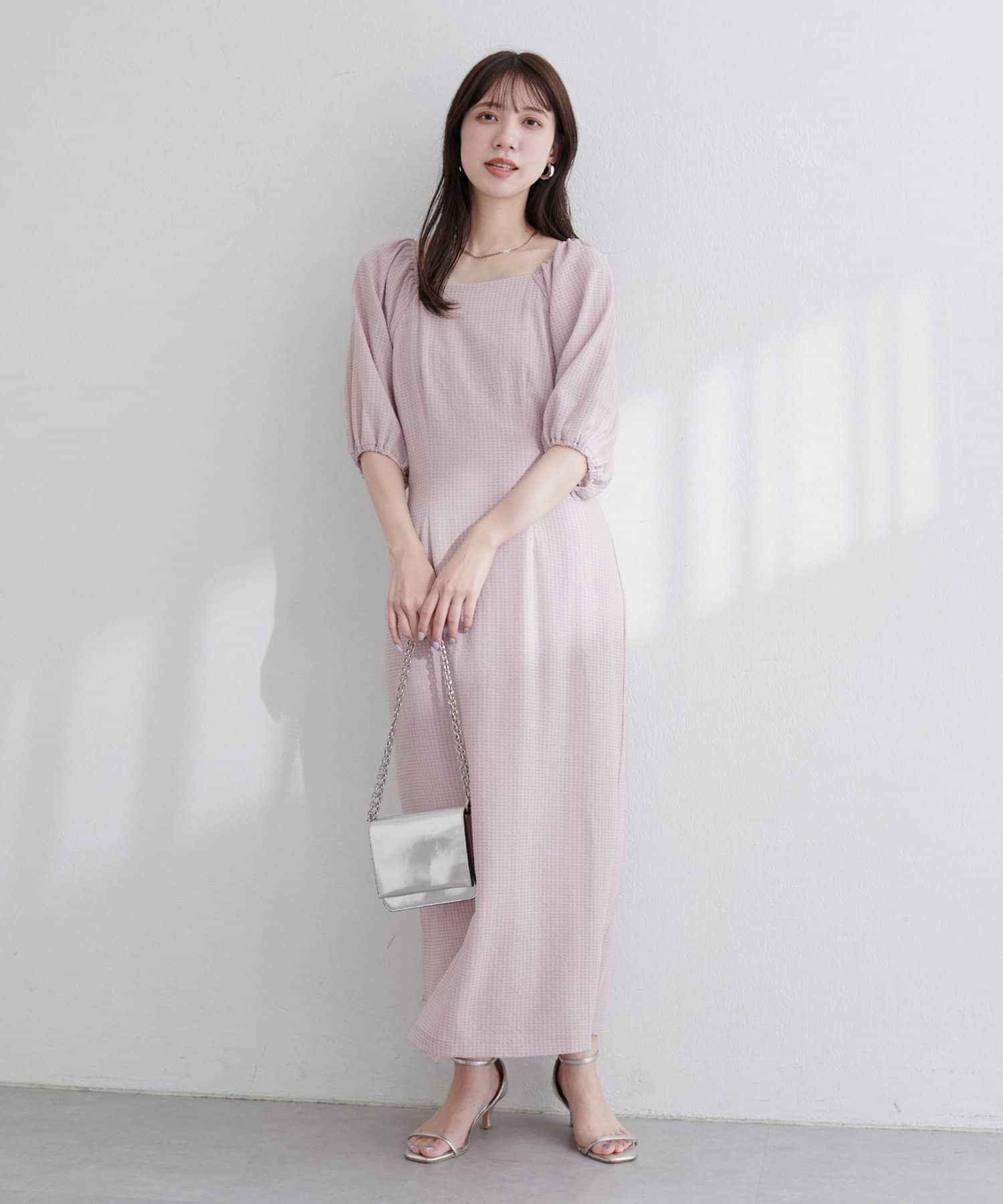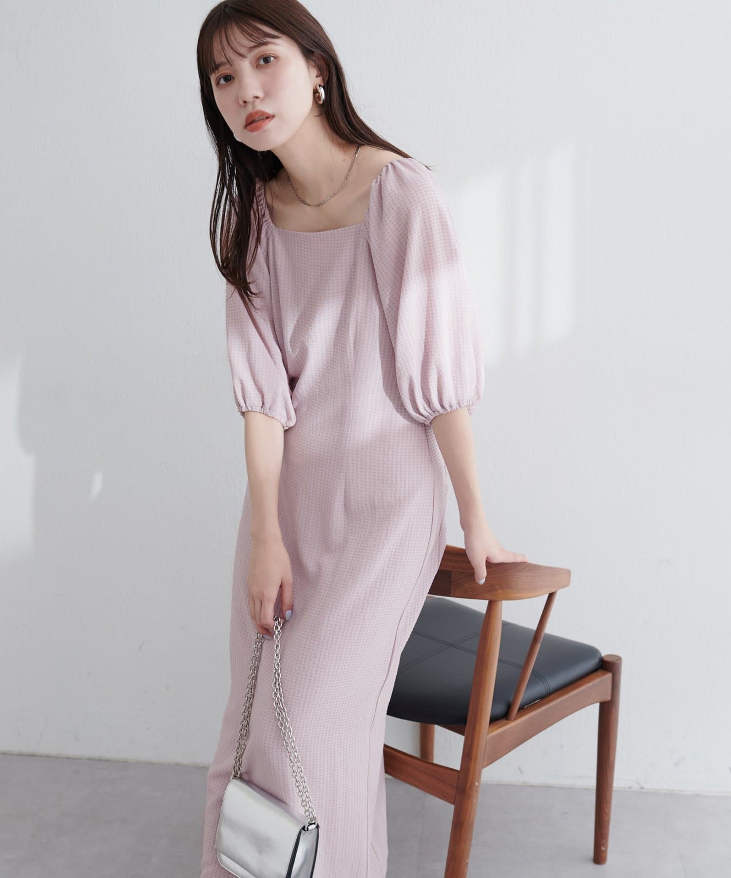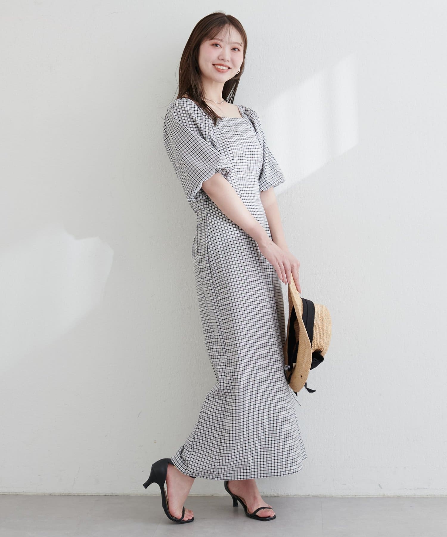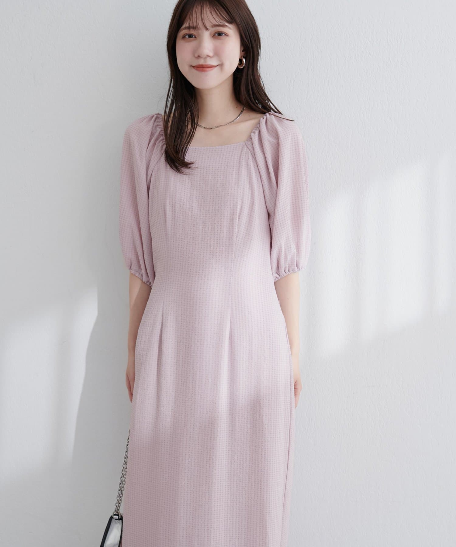 スクエアネックのタイトワンピースで 首元スッキリ、魅力的に着痩せが叶う1枚です。