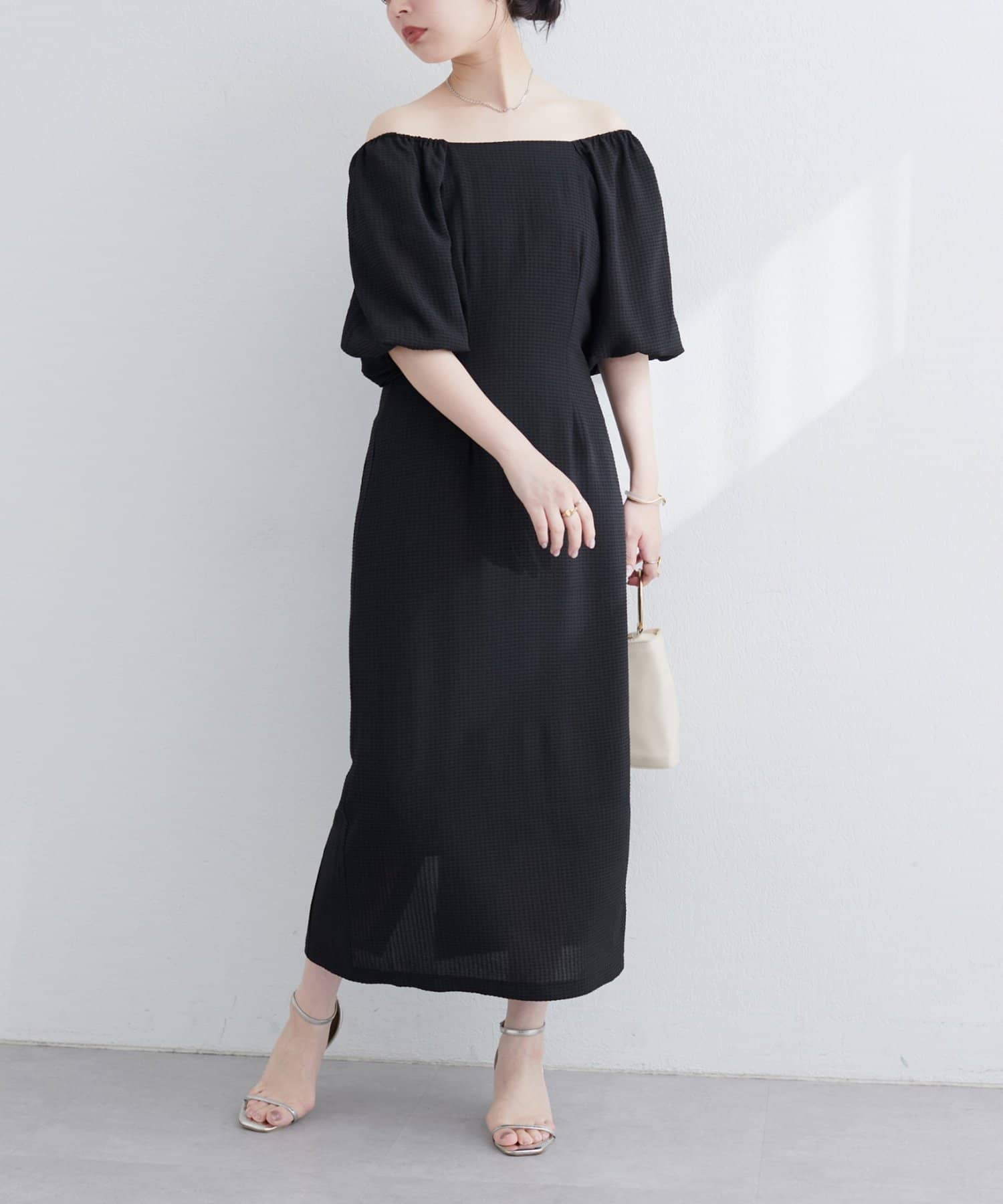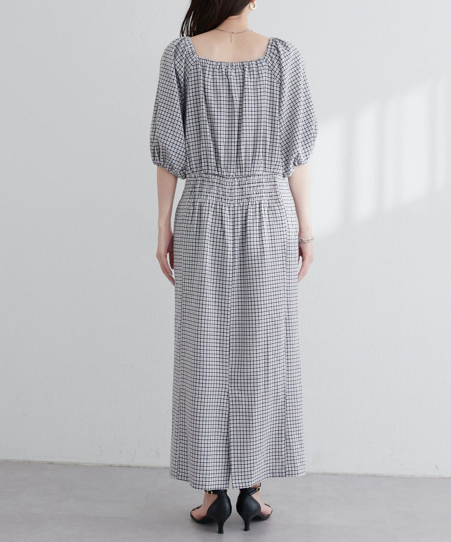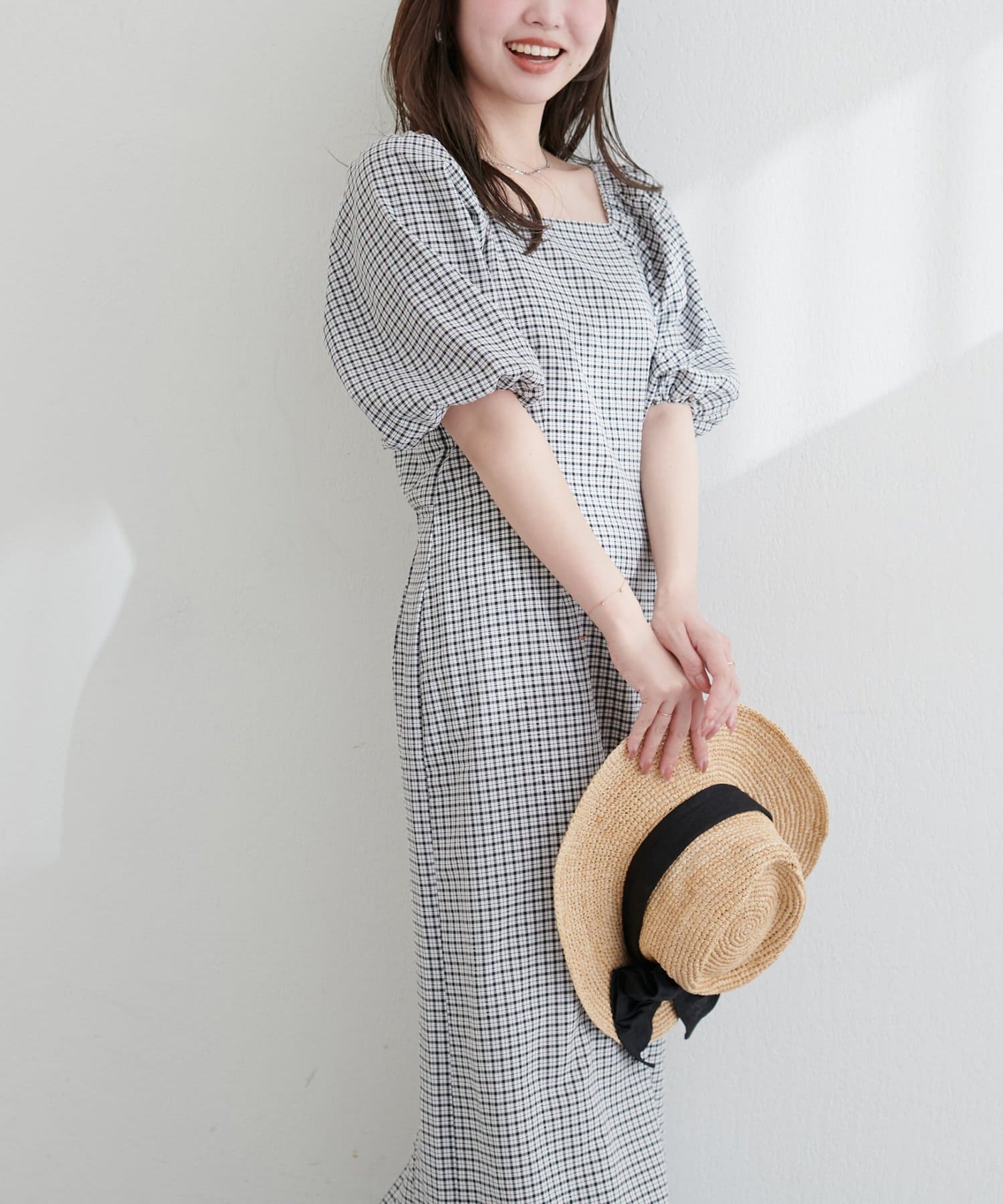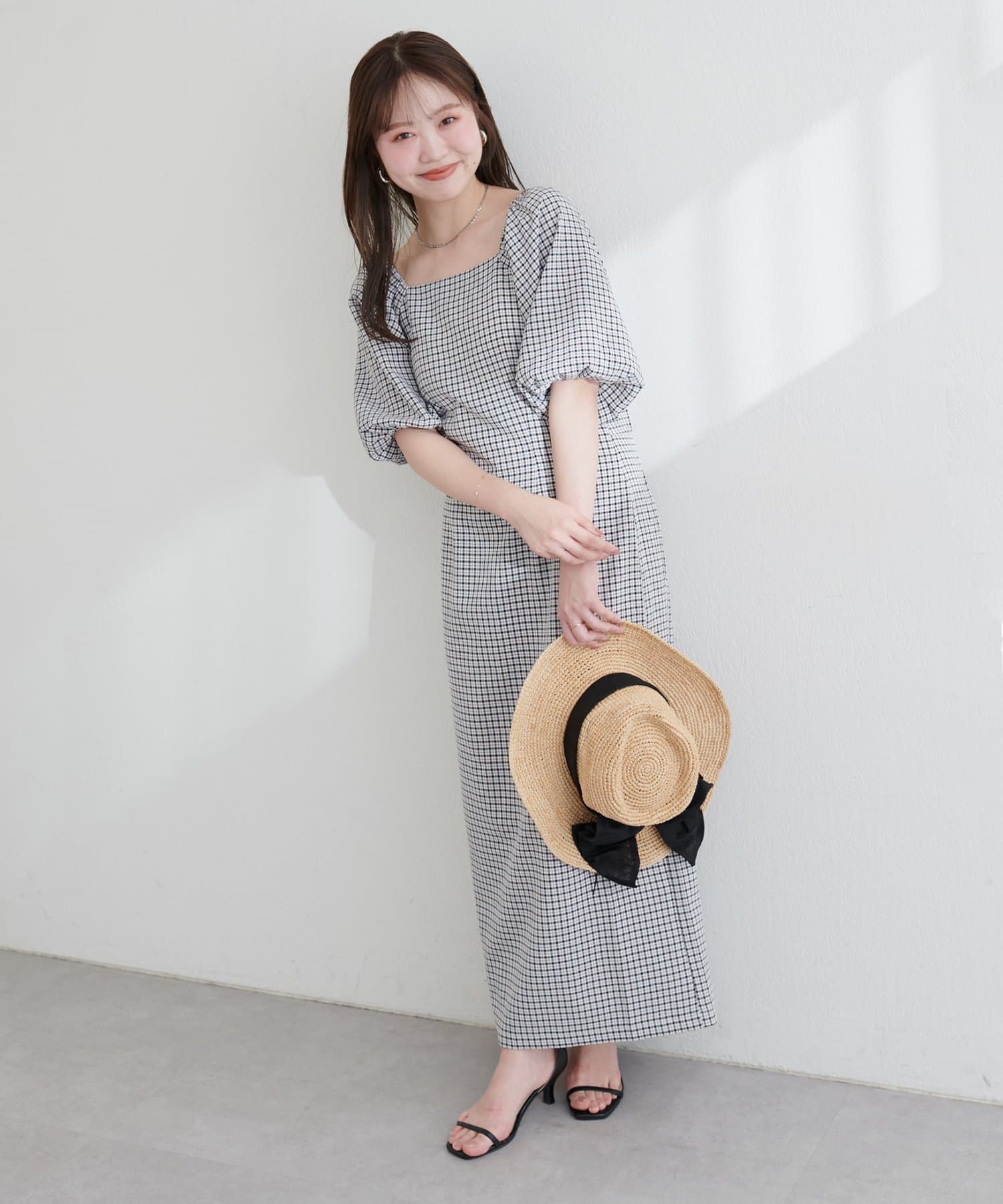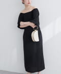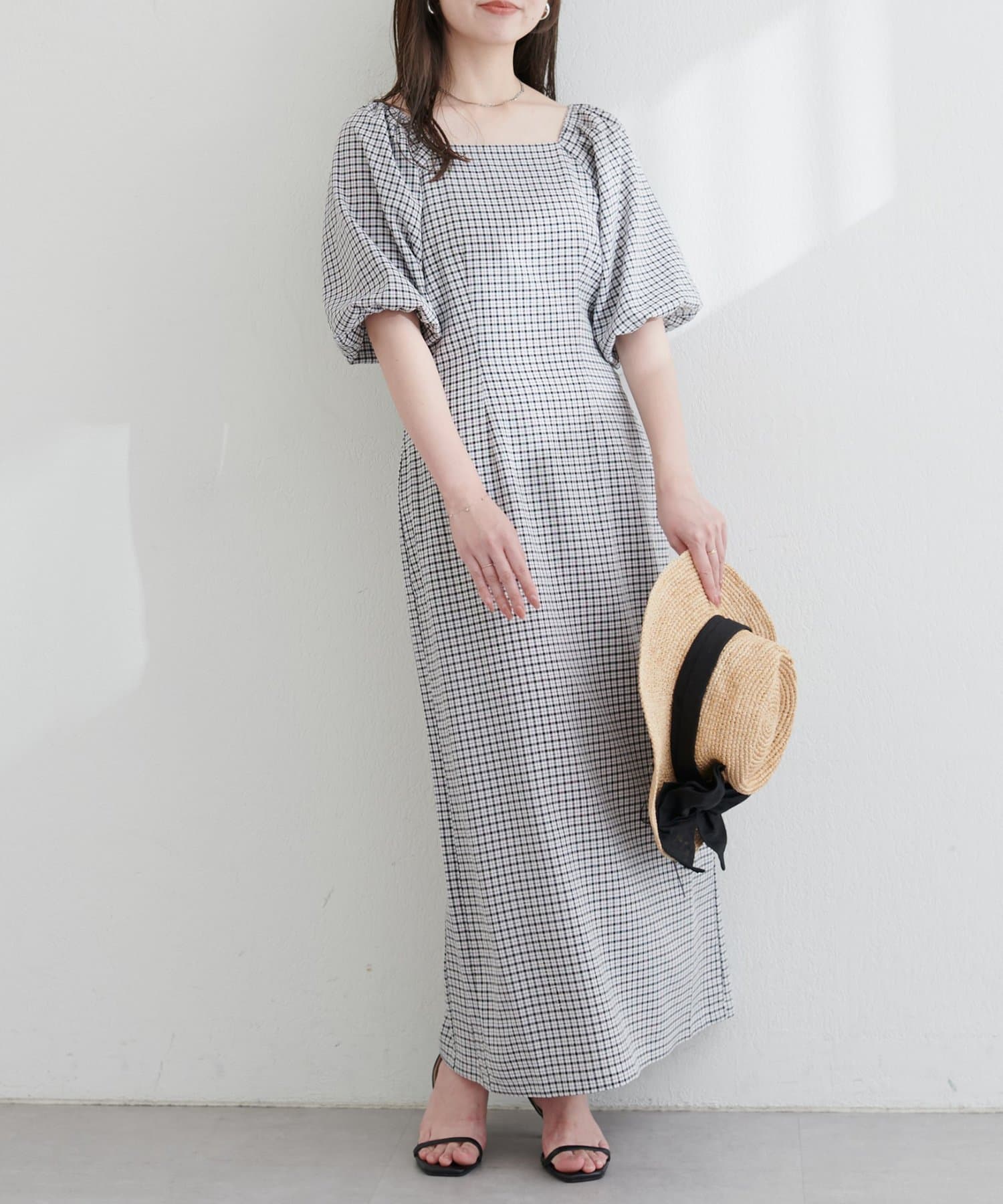 スクエアネックのタイトワンピースで 首元スッキリ、魅力的に着痩せが叶う1枚です。