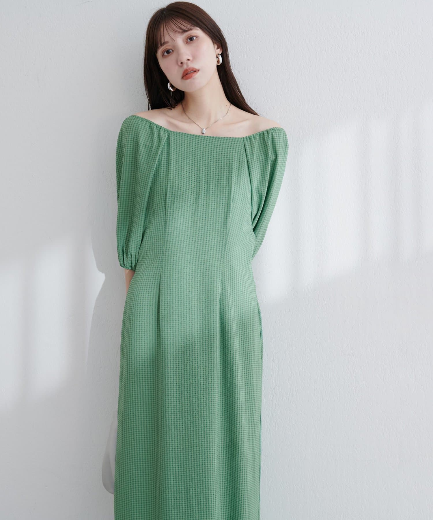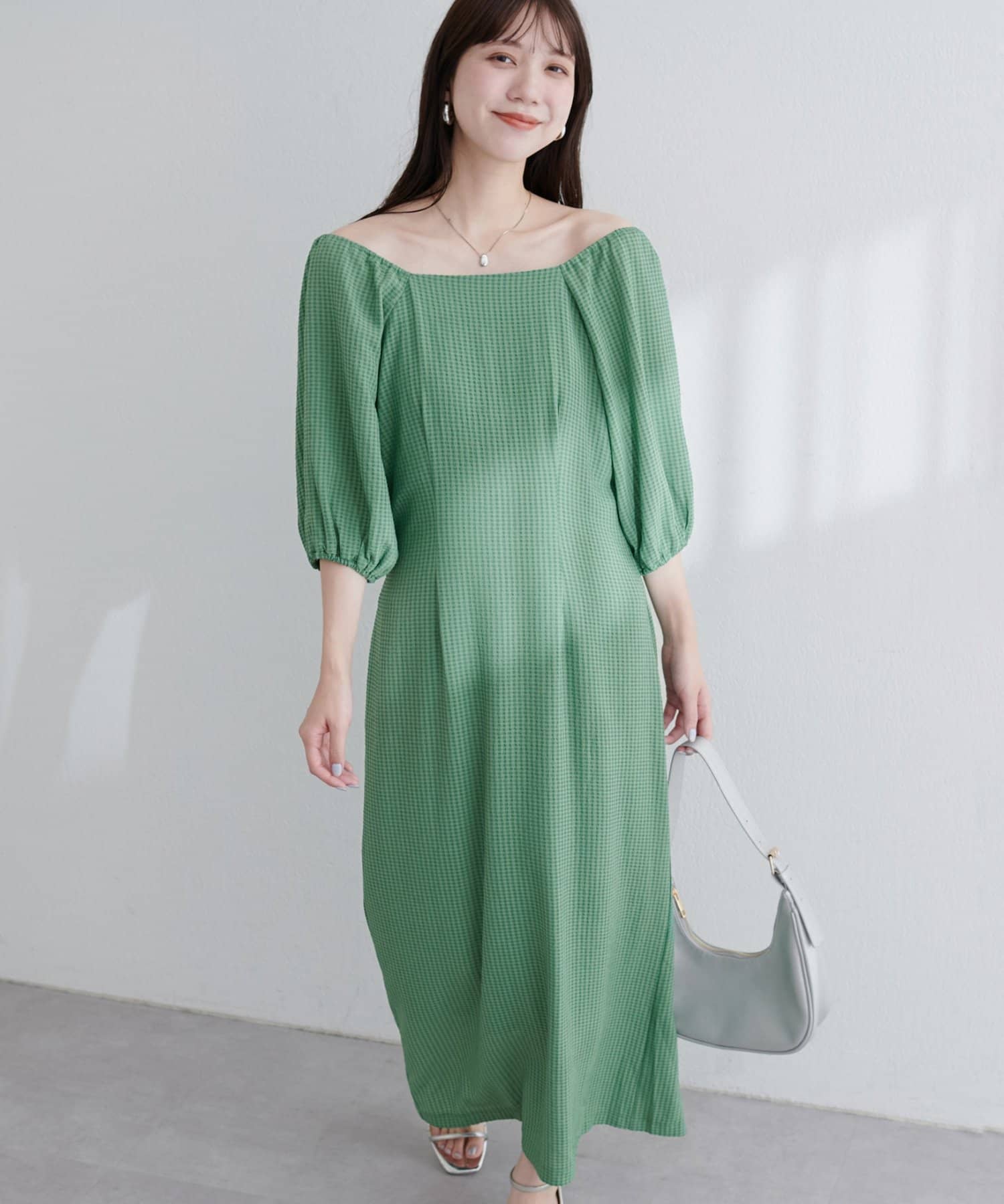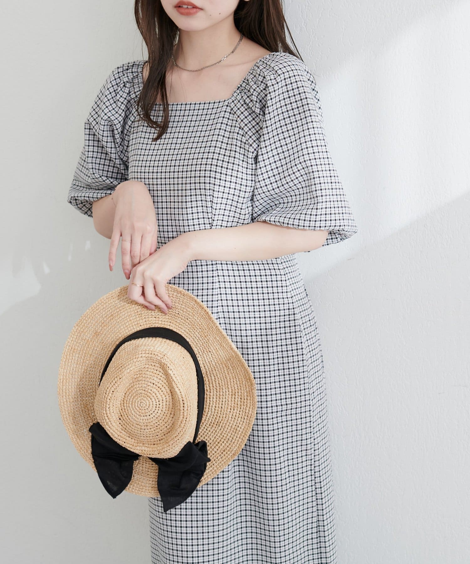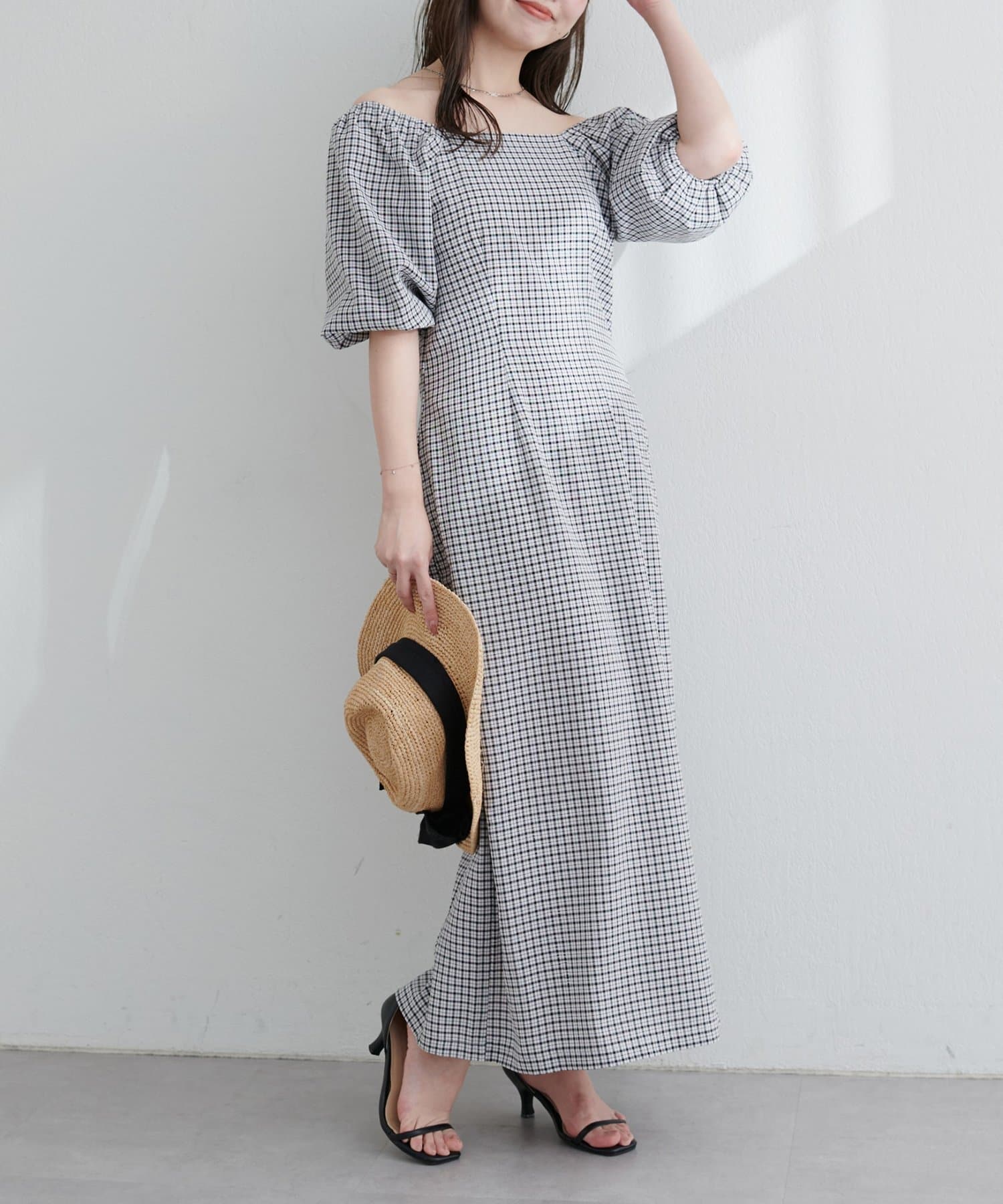 スクエアネックのタイトワンピースで 首元スッキリ、魅力的に着痩せが叶う1枚です。