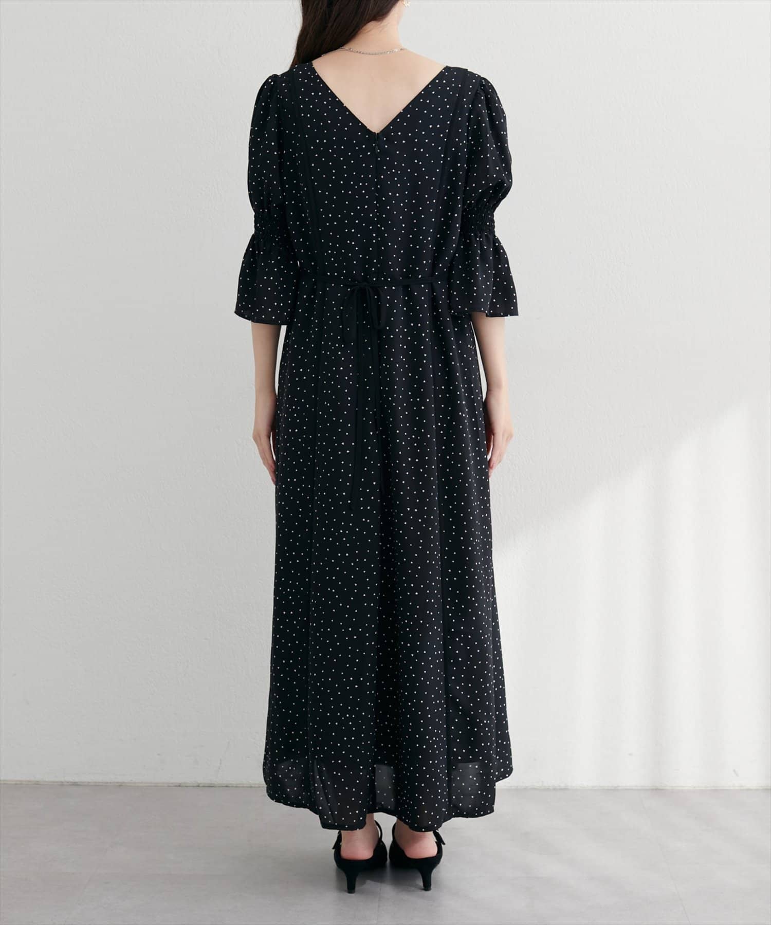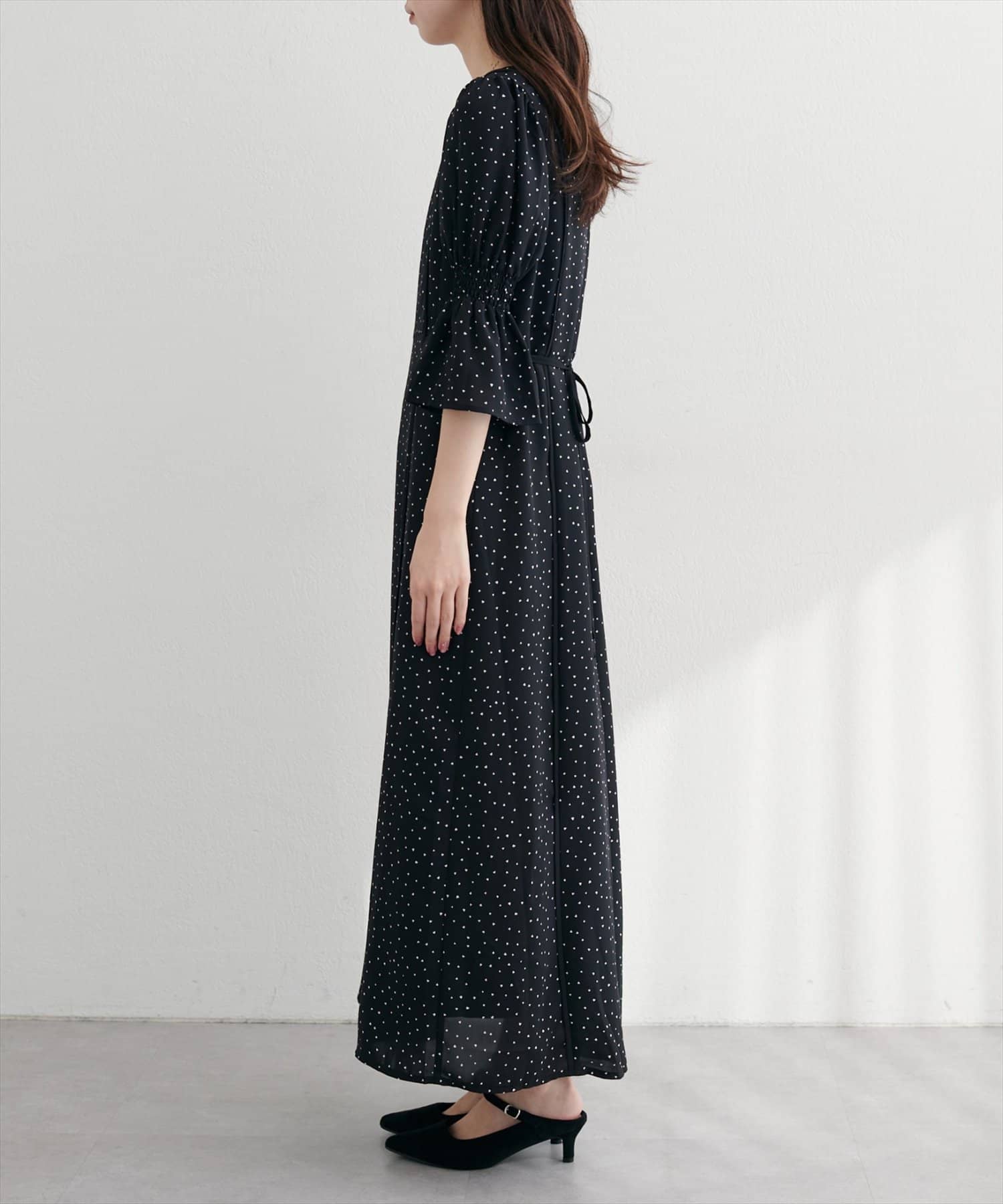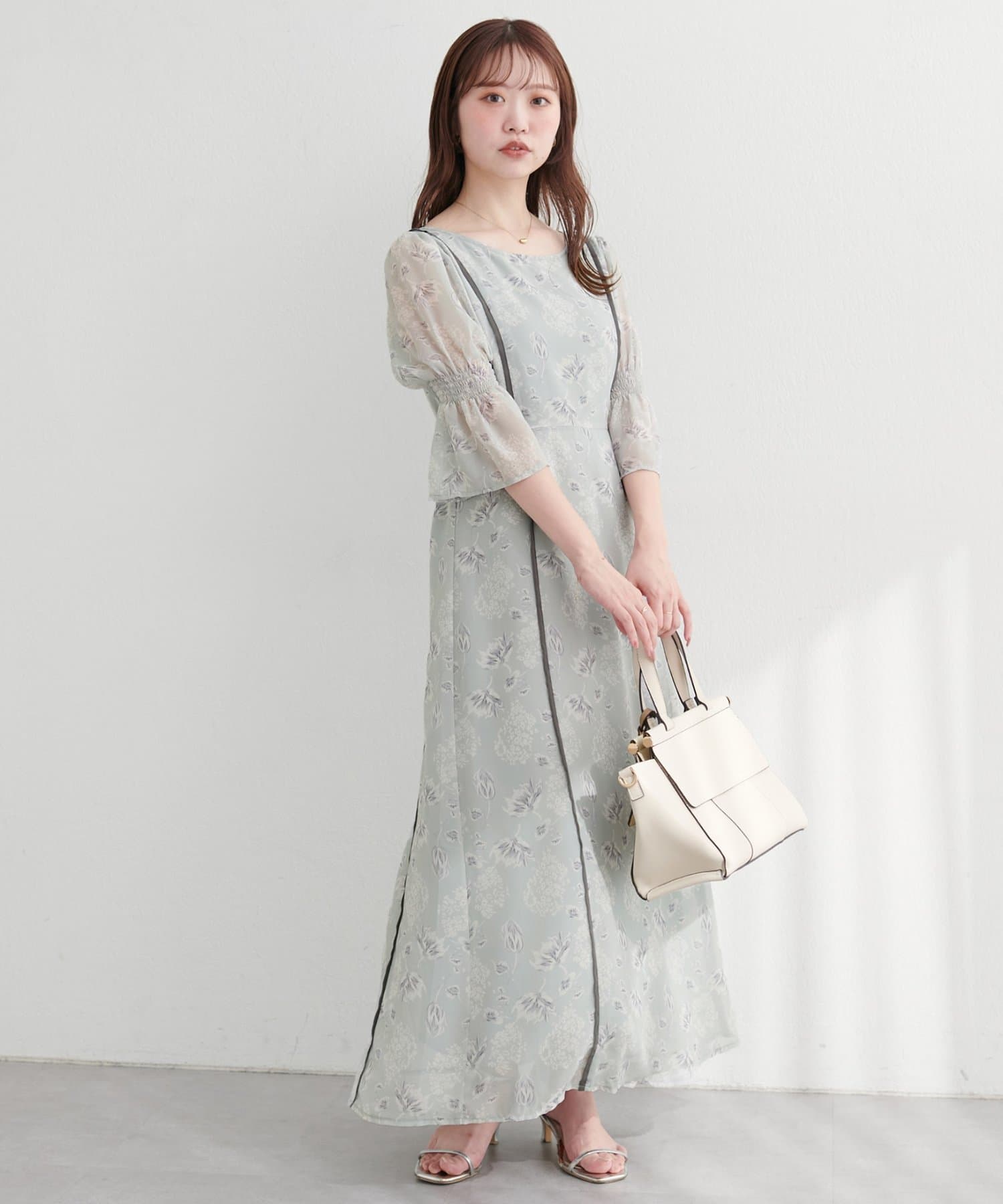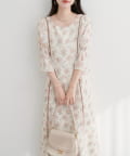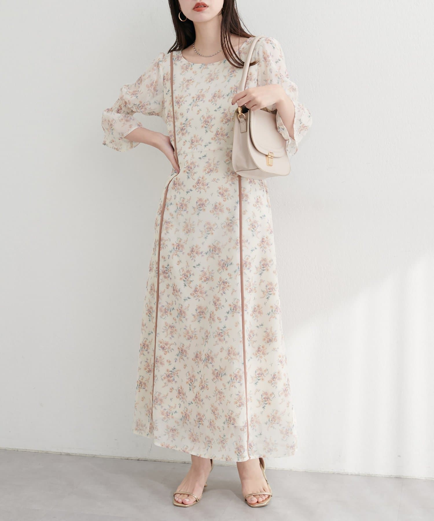全体を流れるように彩る、繊細な花柄が上品な甘さが魅力的なワンピース。