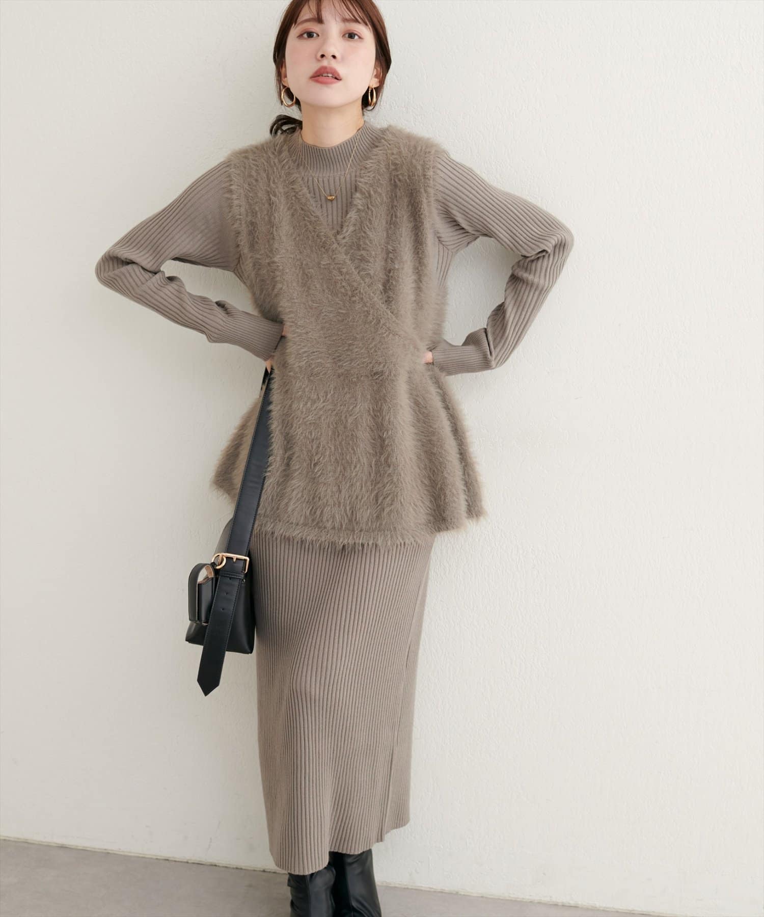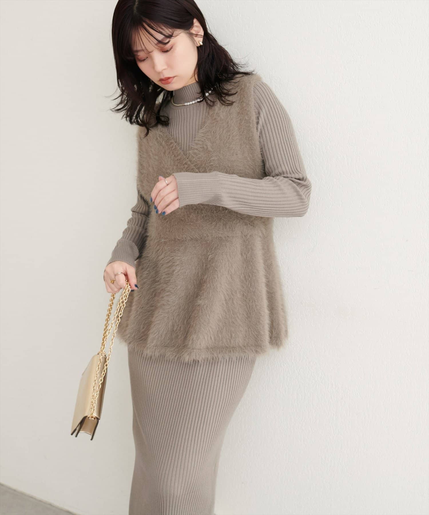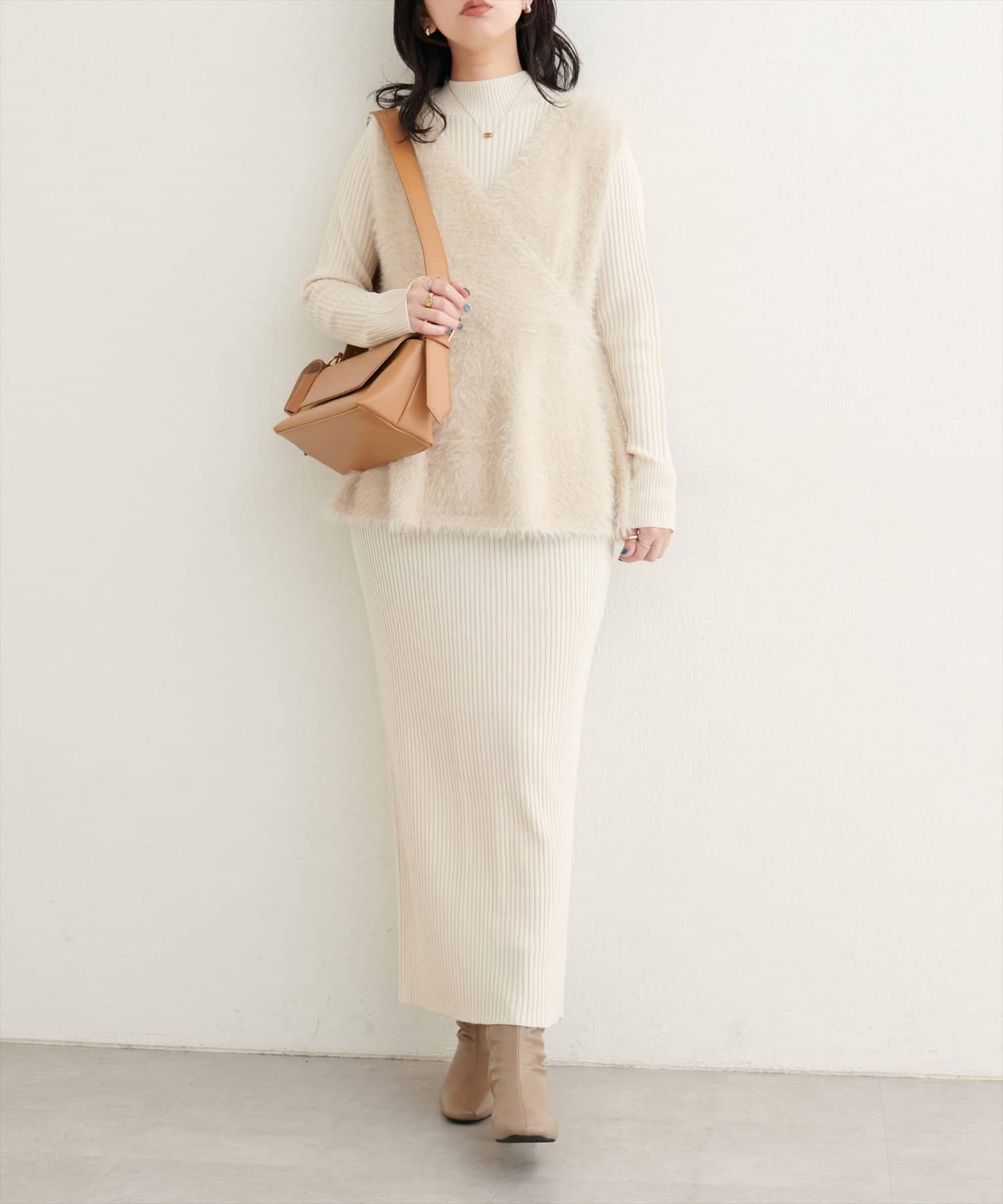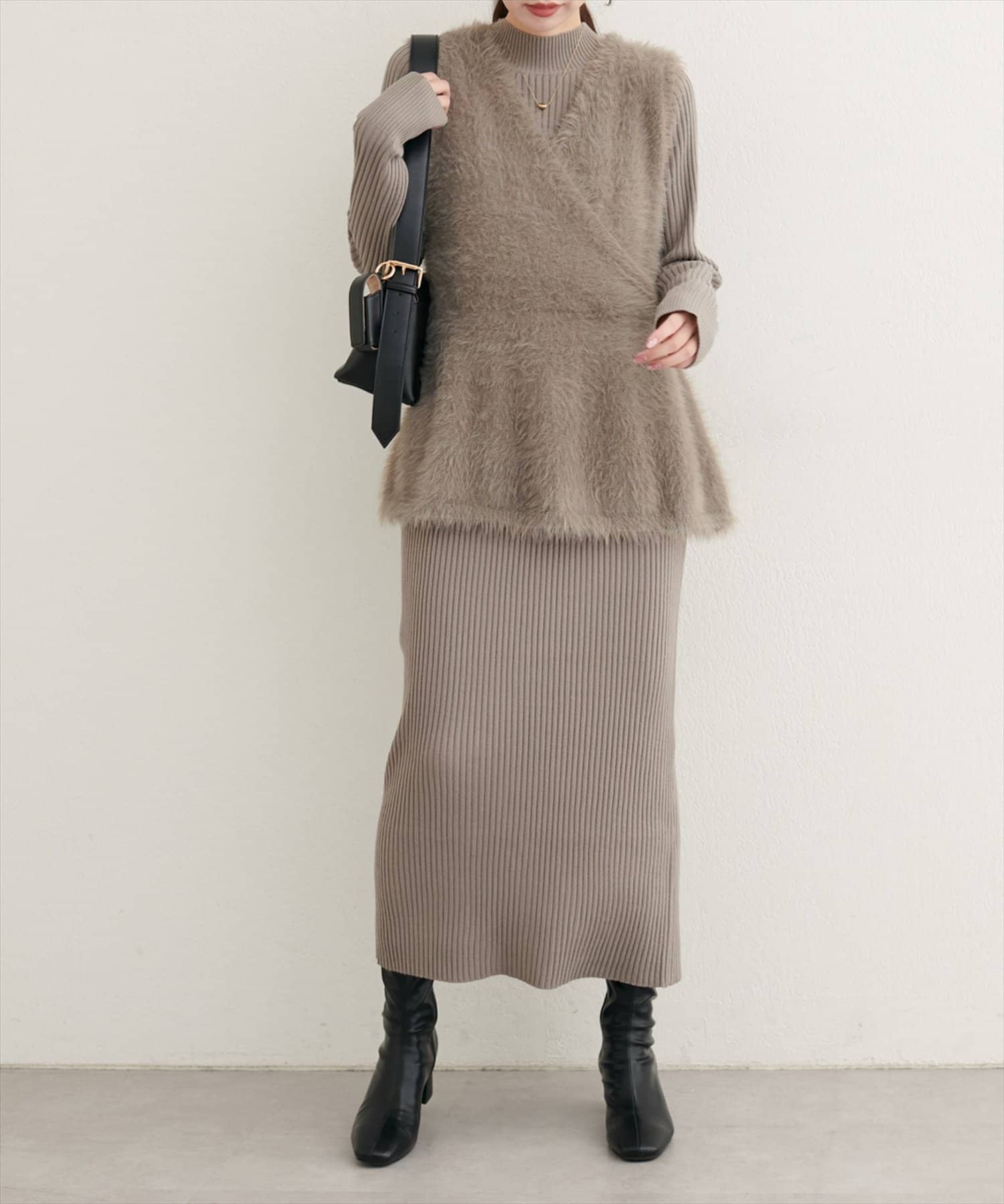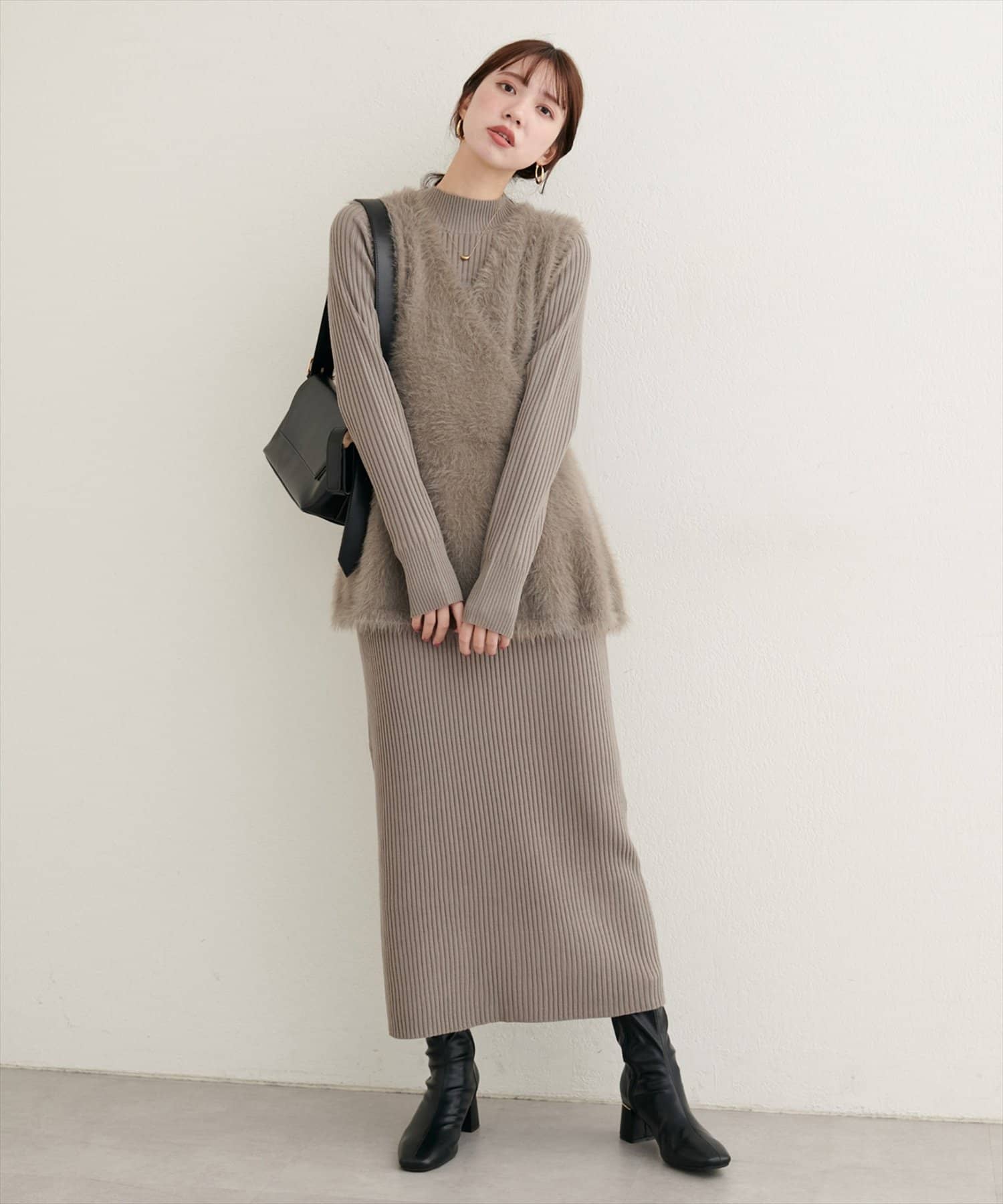 セットのワンピースはもちろん、シンプルなニットなどに合わせてもこなれ感のあるレイヤードスタイルが完成します。