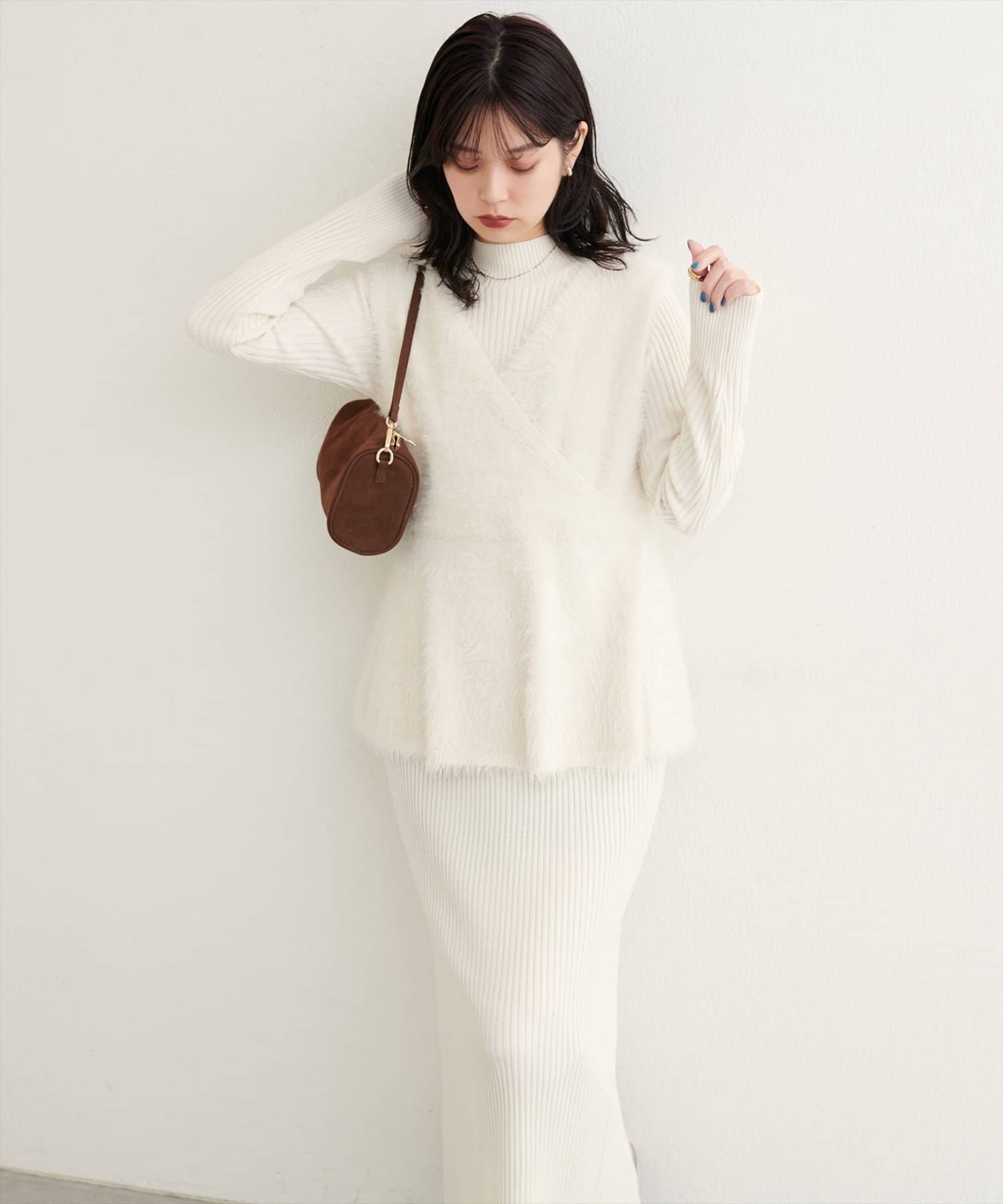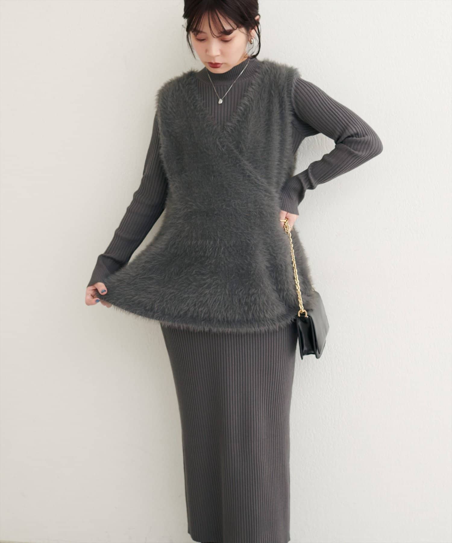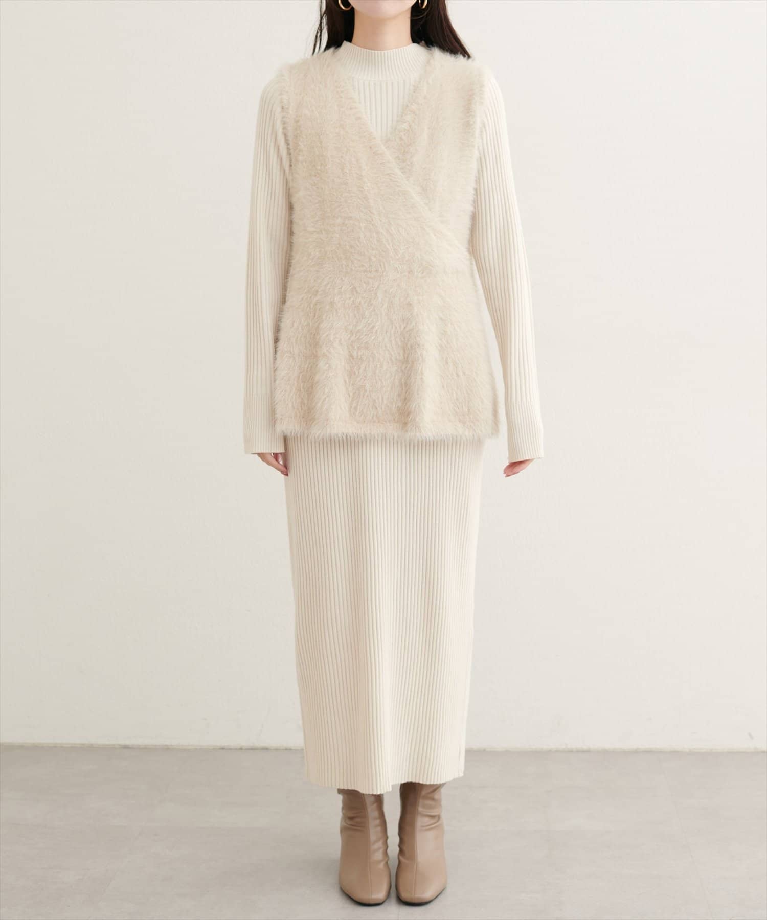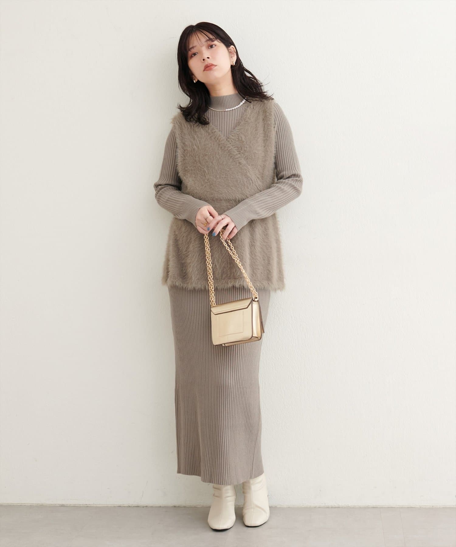 セットのワンピースはもちろん、シンプルなニットなどに合わせてもこなれ感のあるレイヤードスタイルが完成します。