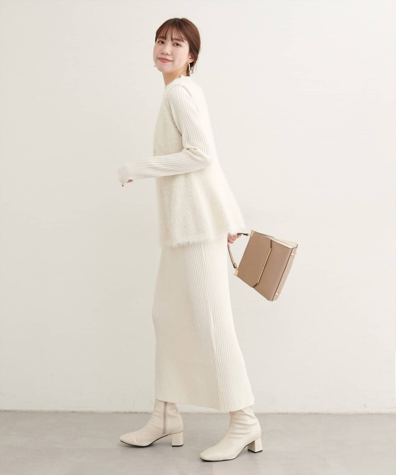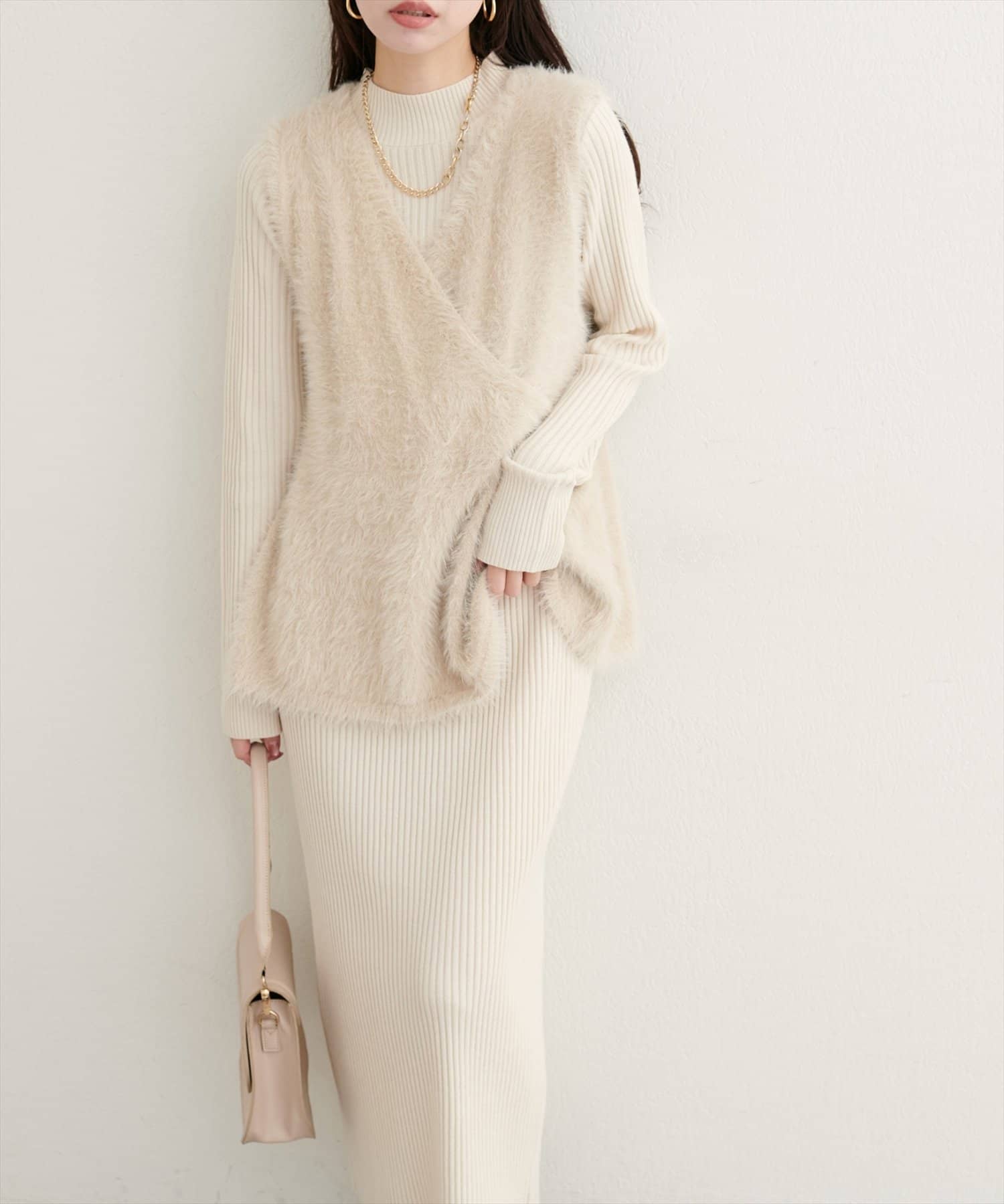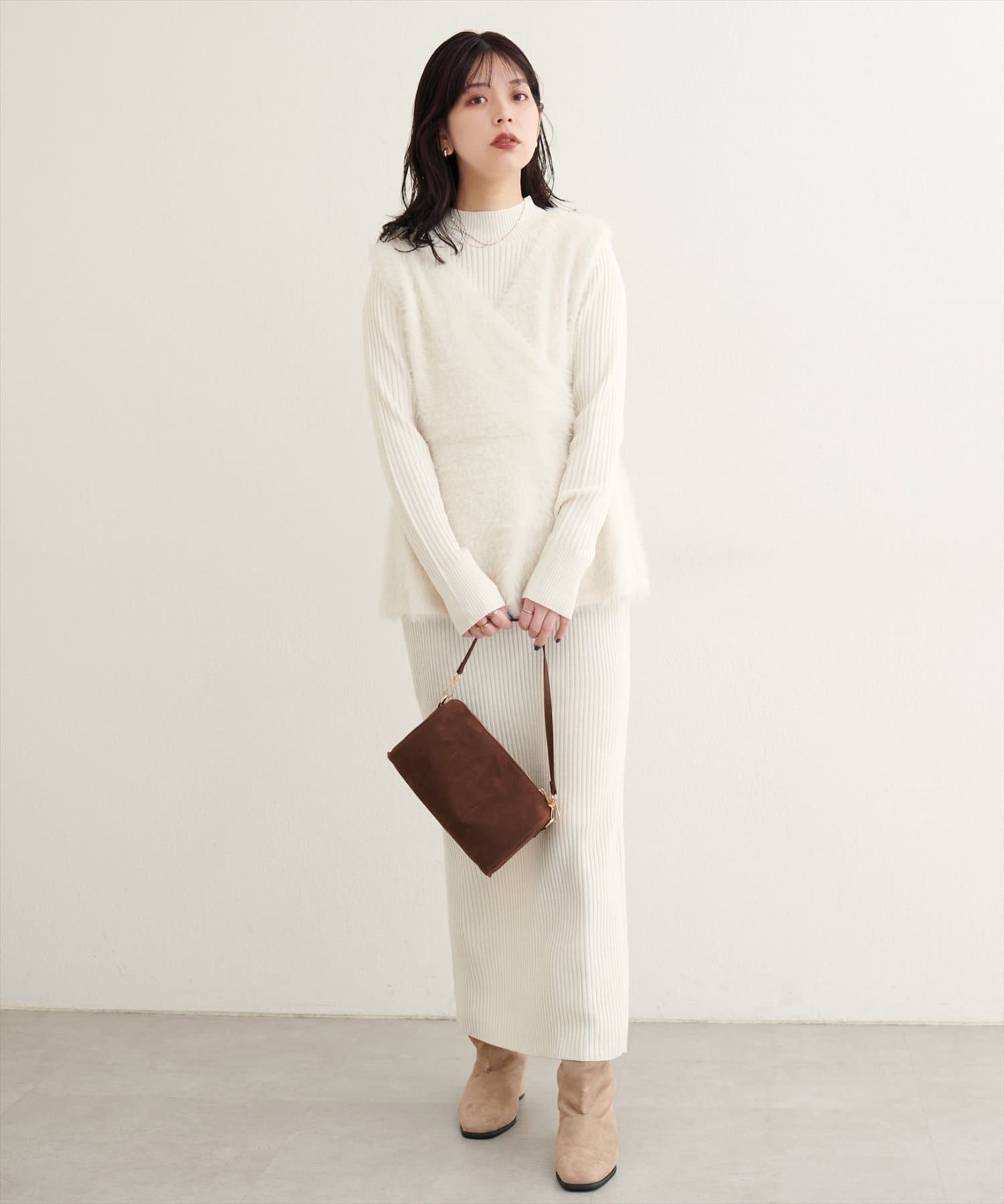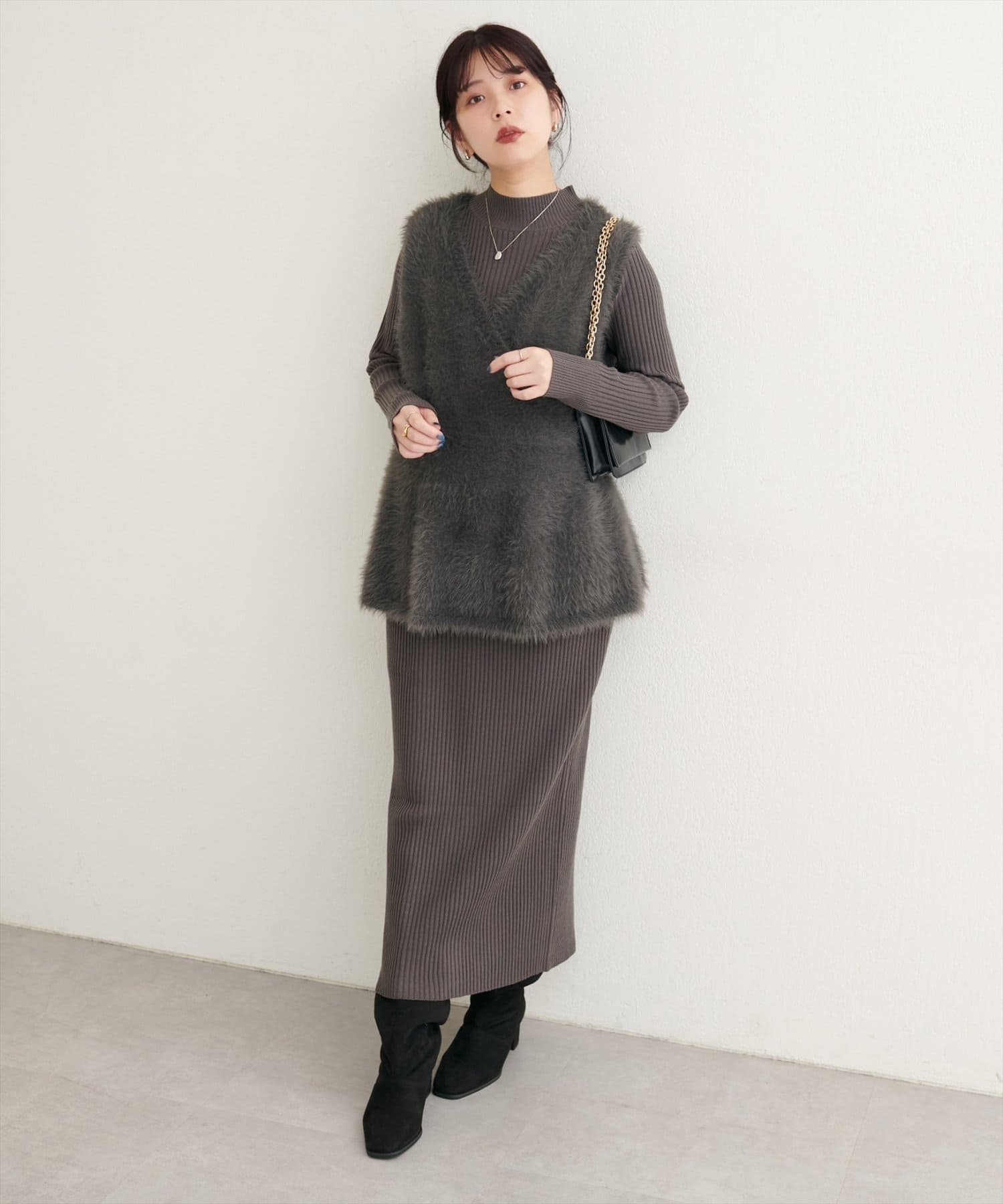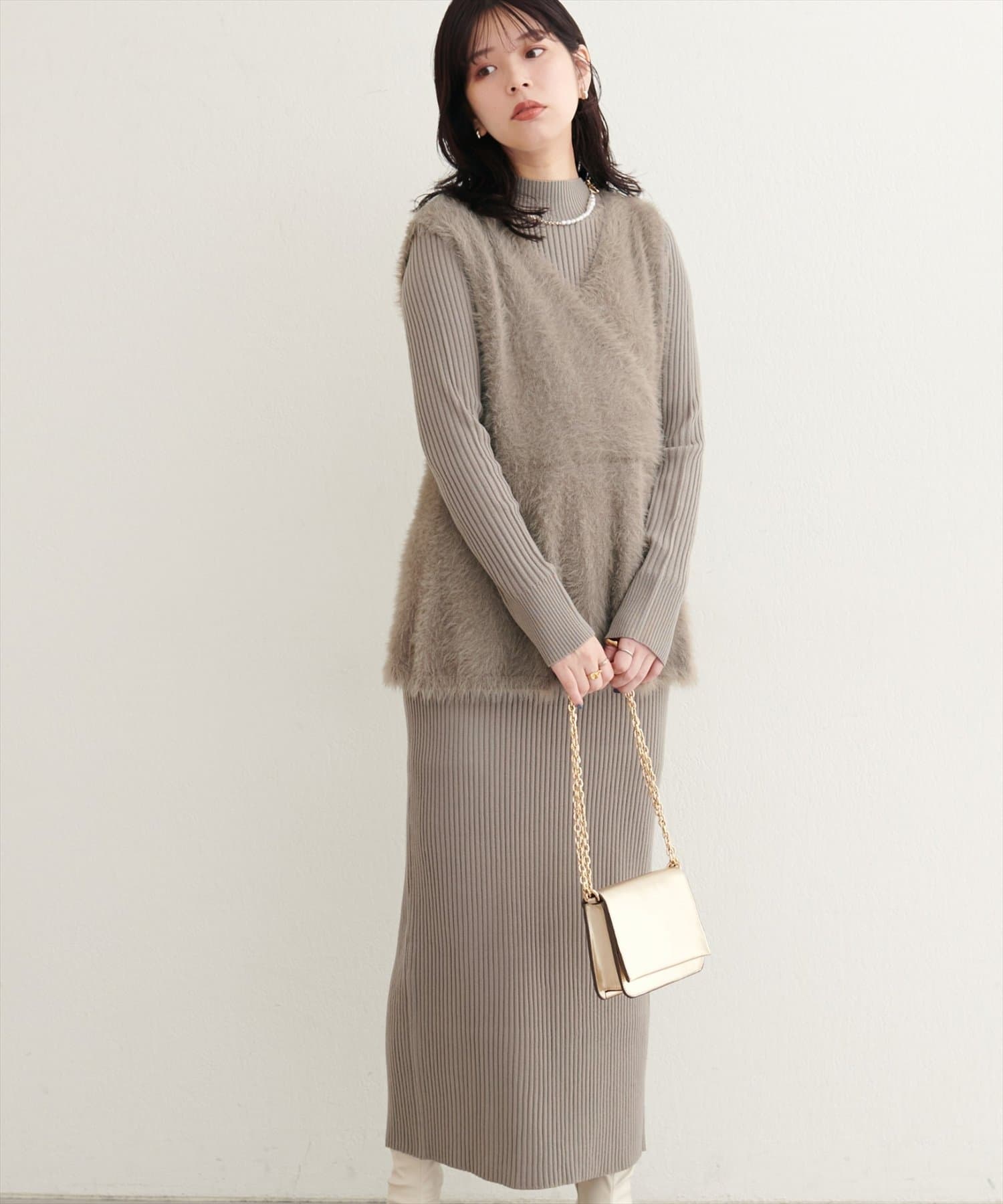セットのワンピースはもちろん、シンプルなニットなどに合わせてもこなれ感のあるレイヤードスタイルが完成します。
