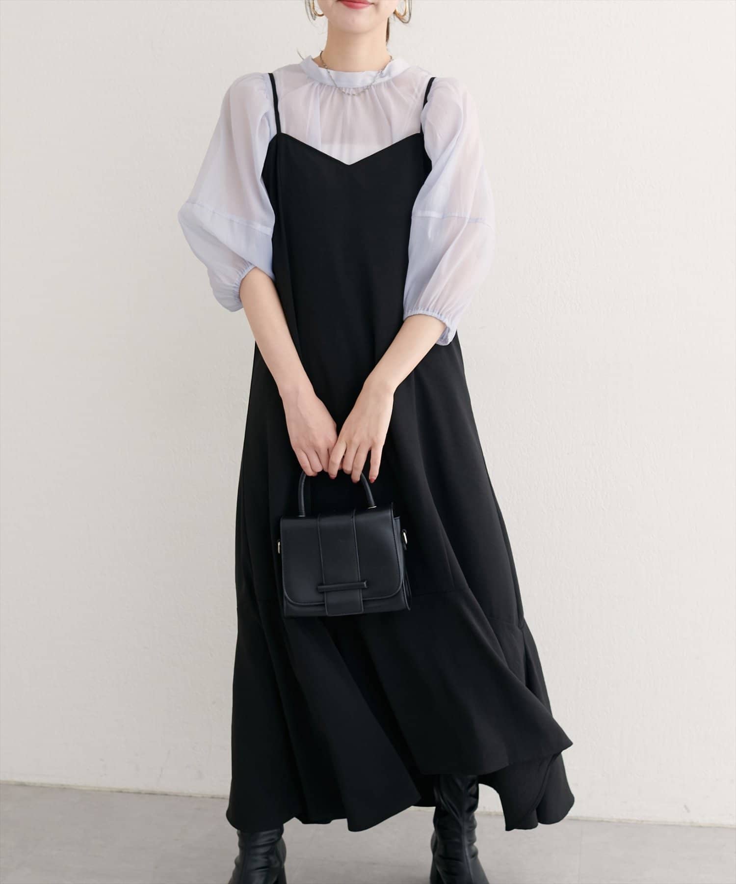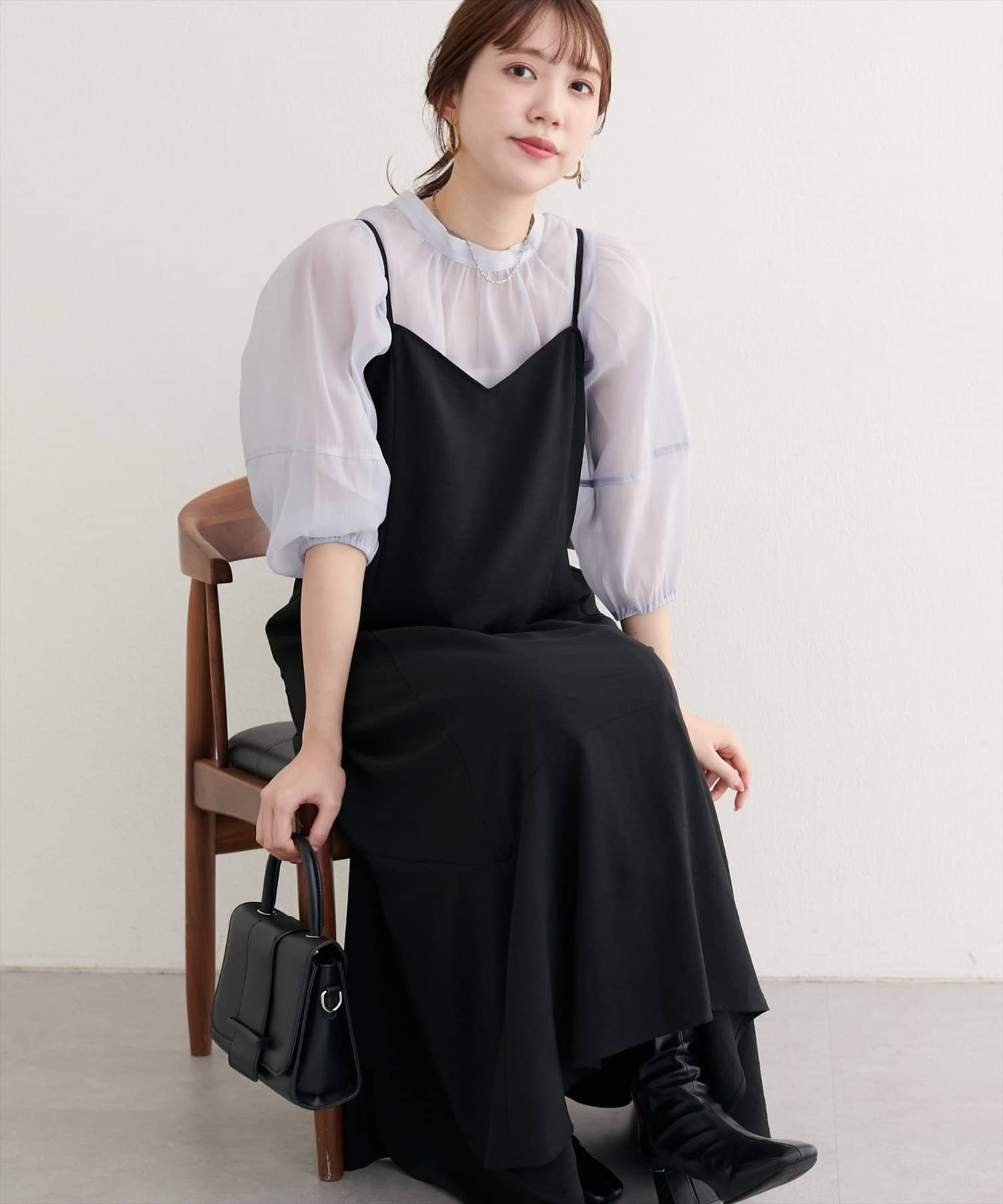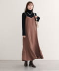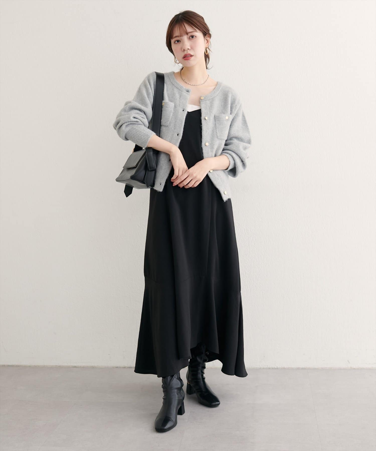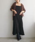 ワンピースの上から、ざっくりニットやカーディガンを羽織って、リラックス感のあるスタイリングに。