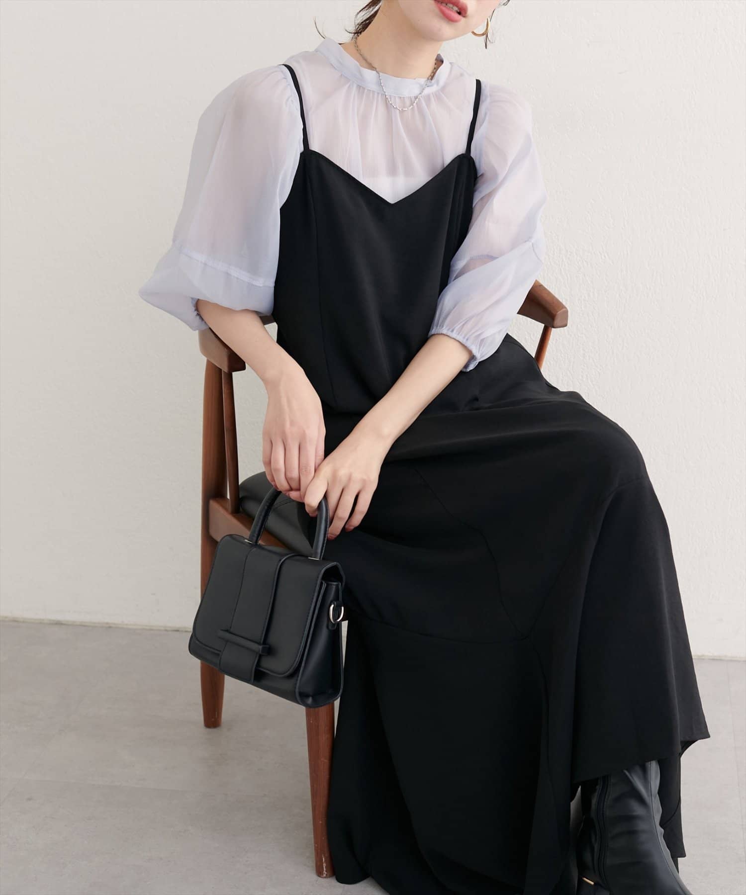 細めの肩紐が、女性らしい華奢な雰囲気を演出。