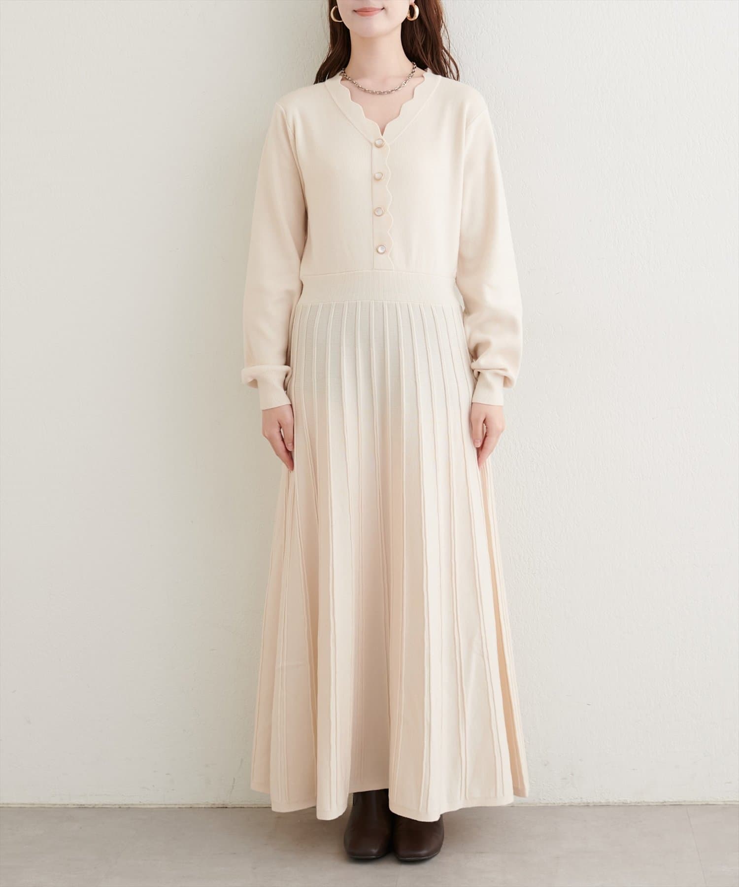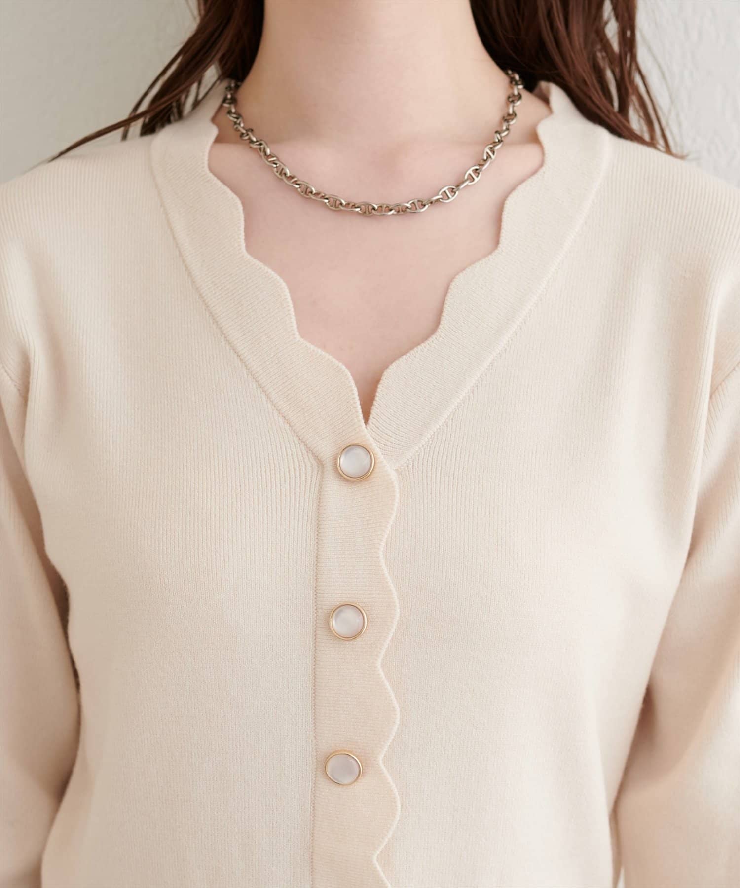デコルテを美しく魅せるスカラップネックが、顔周りを華やかに演出。