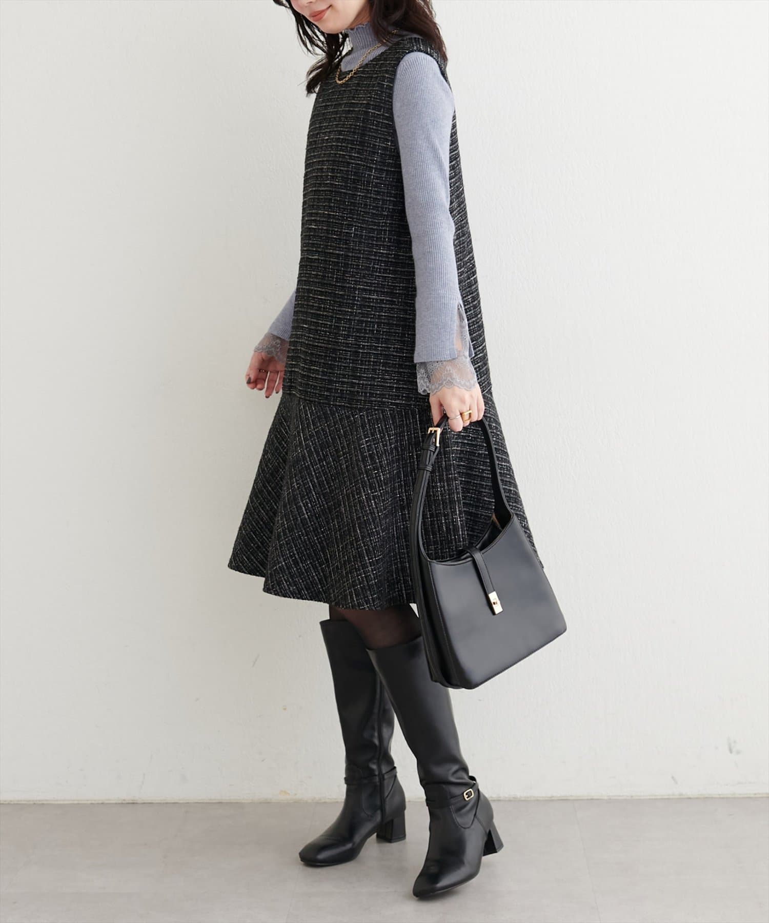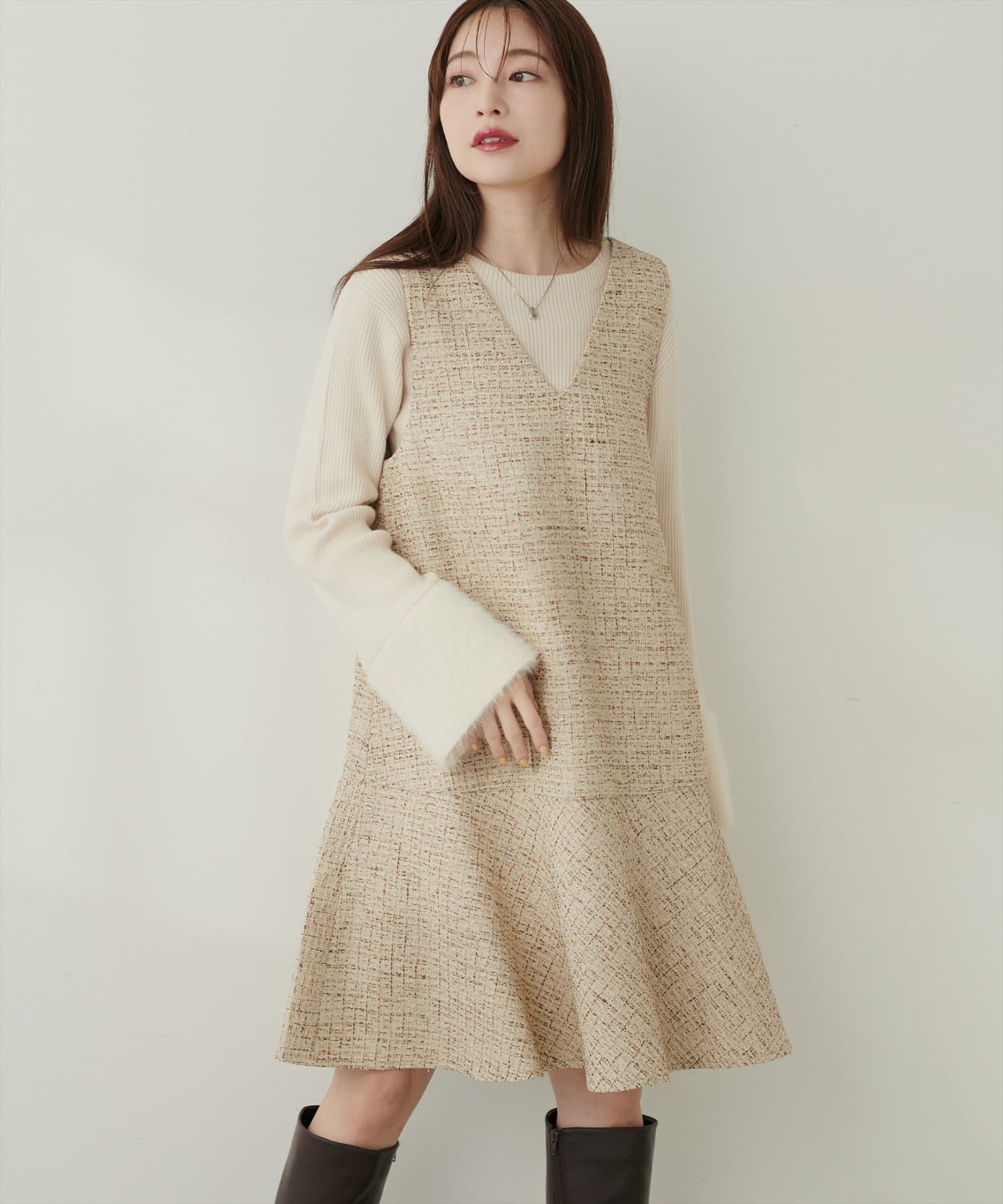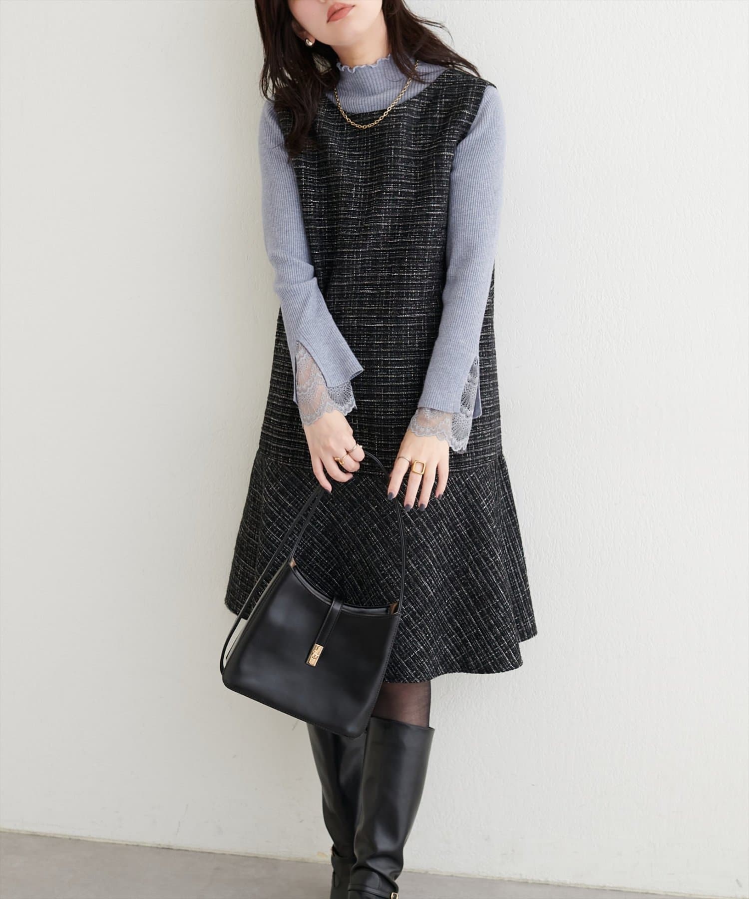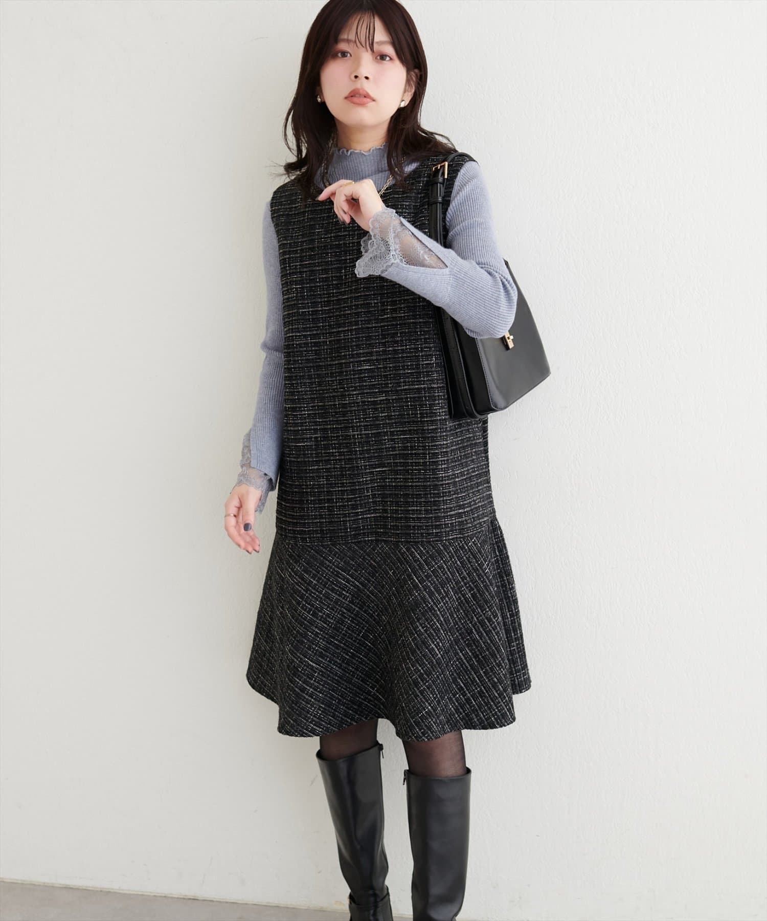 上品に華やかさを与えてくれるツイードを使用した、秋冬のお出かけにピッタリの1枚。