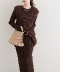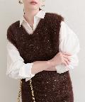 ベストは、繊細なラメが上品に煌めくフェザーニット。ふわふわとした素材感が、女性らしさを引き立てます。