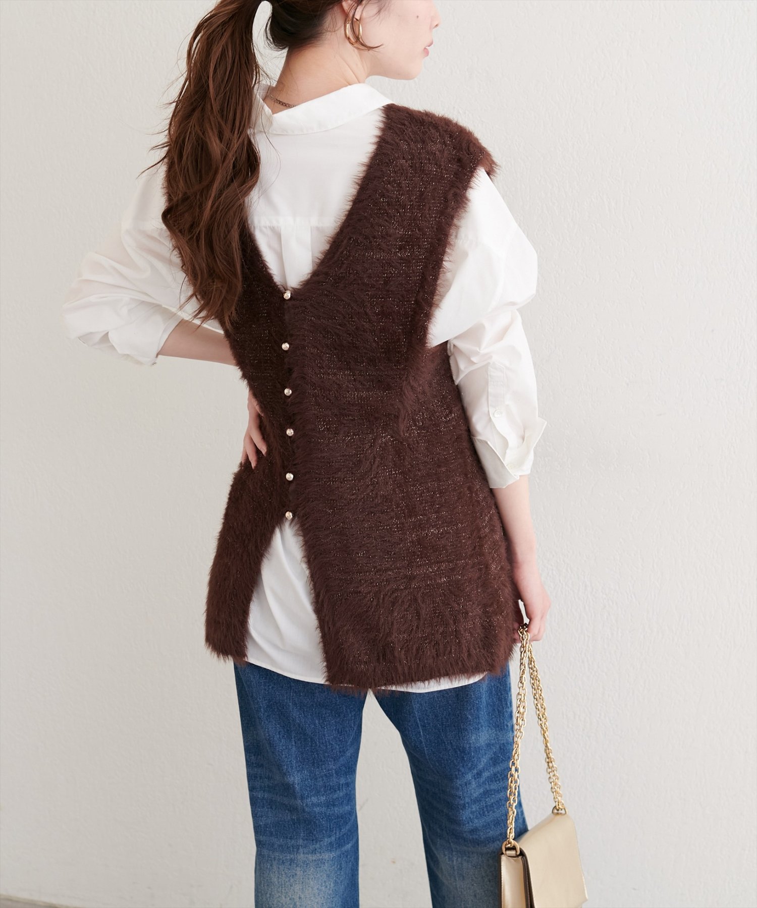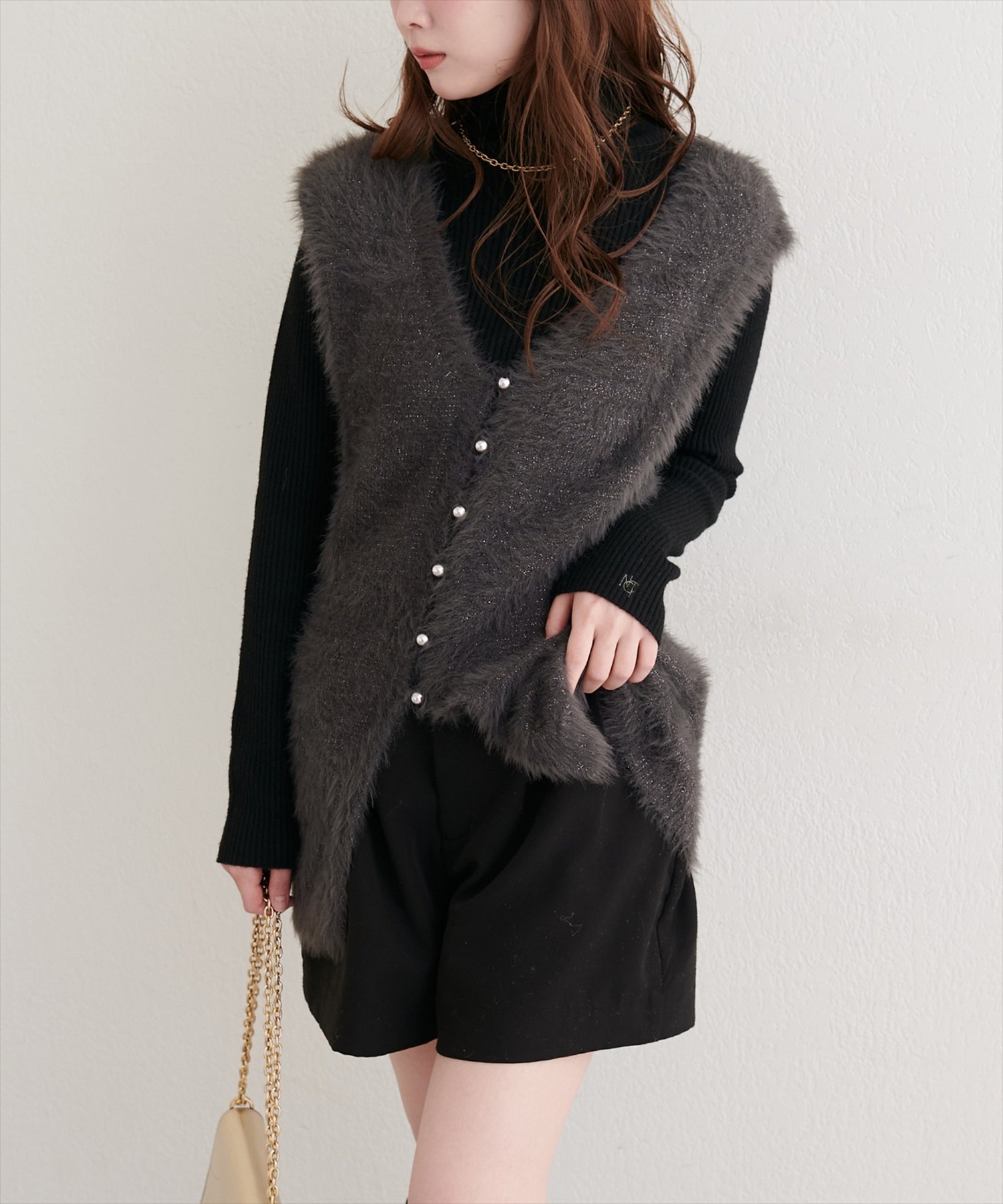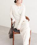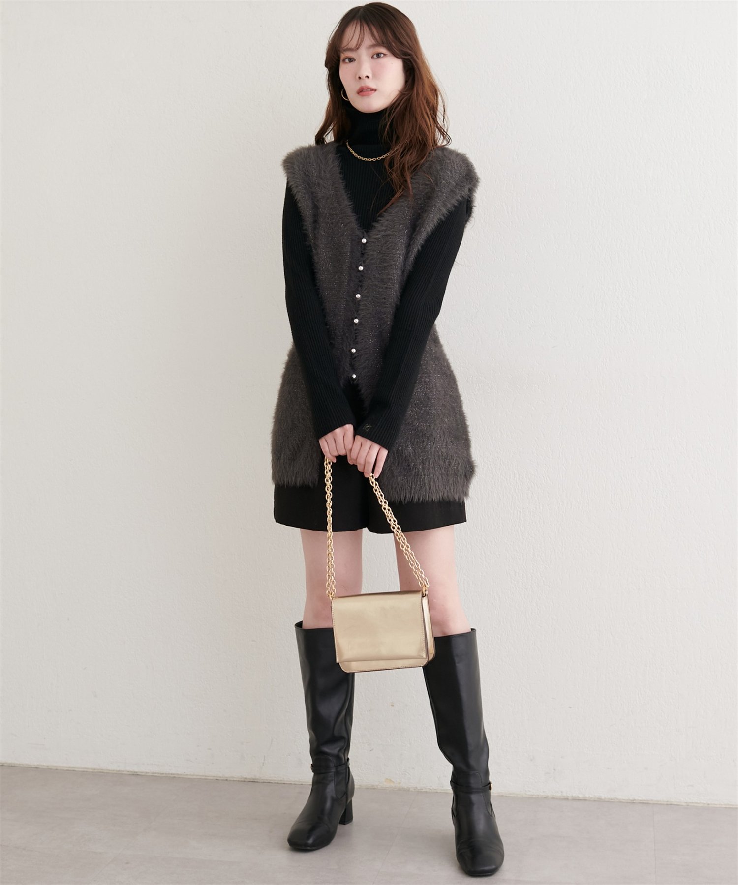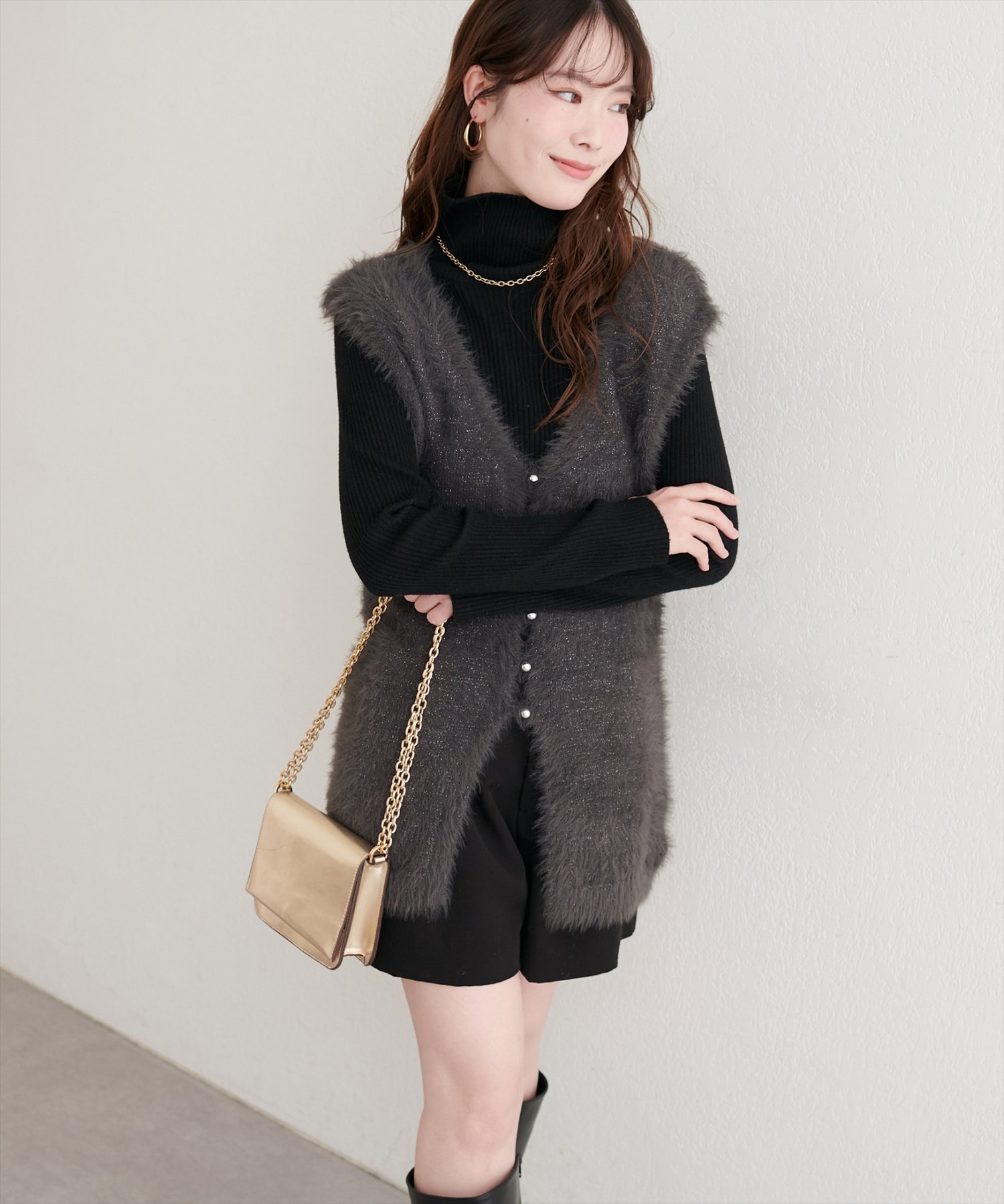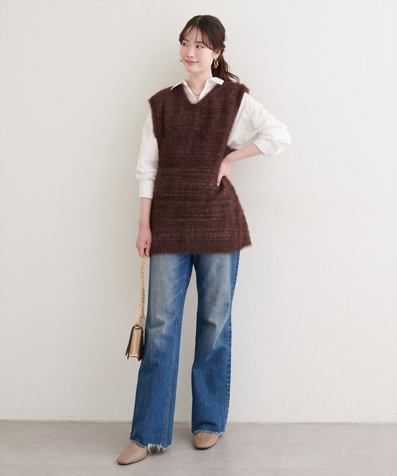 ベストは、繊細なラメが上品に煌めくフェザーニット。ふわふわとした素材感が、女性らしさを引き立てます。