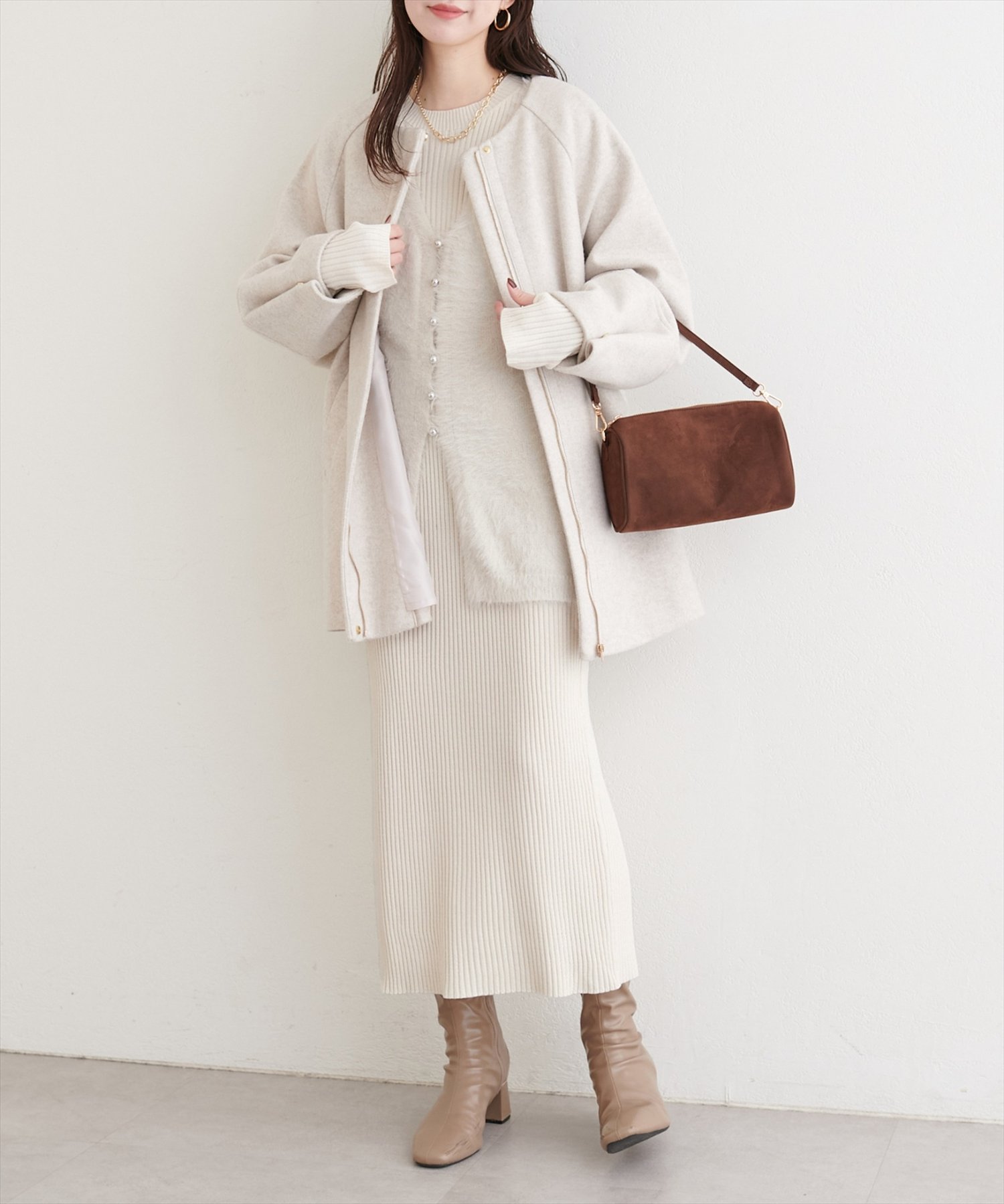 ワンピースは、縦ラインを強調するリブ編みで、スタイルアップ効果も抜群。