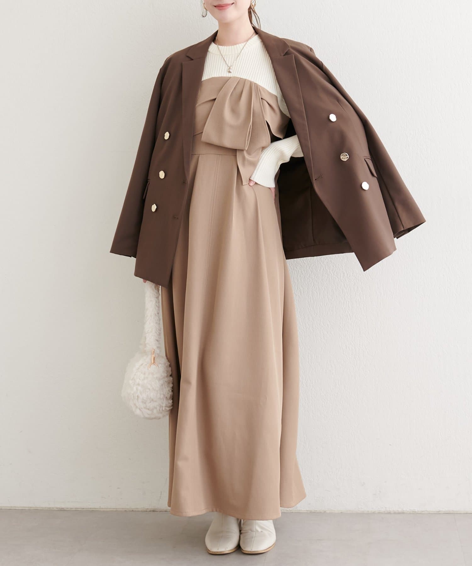 フロントのリボン風デザインは、甘くなりすぎないよう、大人っぽいシルエットで大人の女性にぴったりの一枚です。