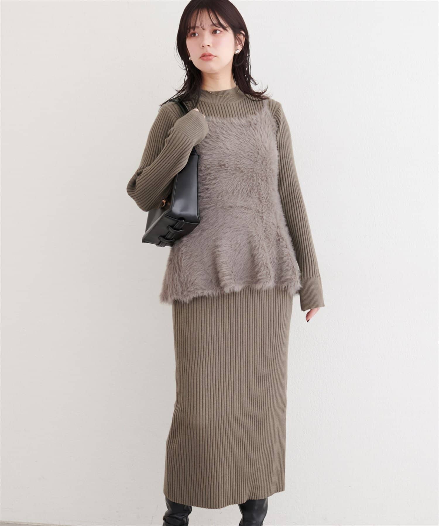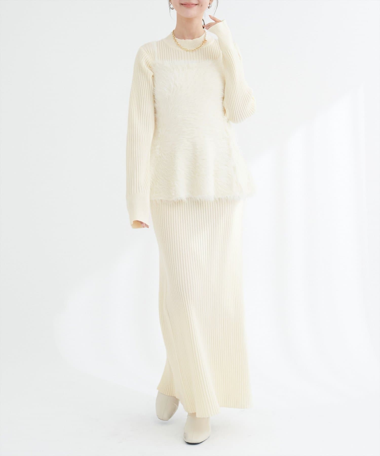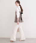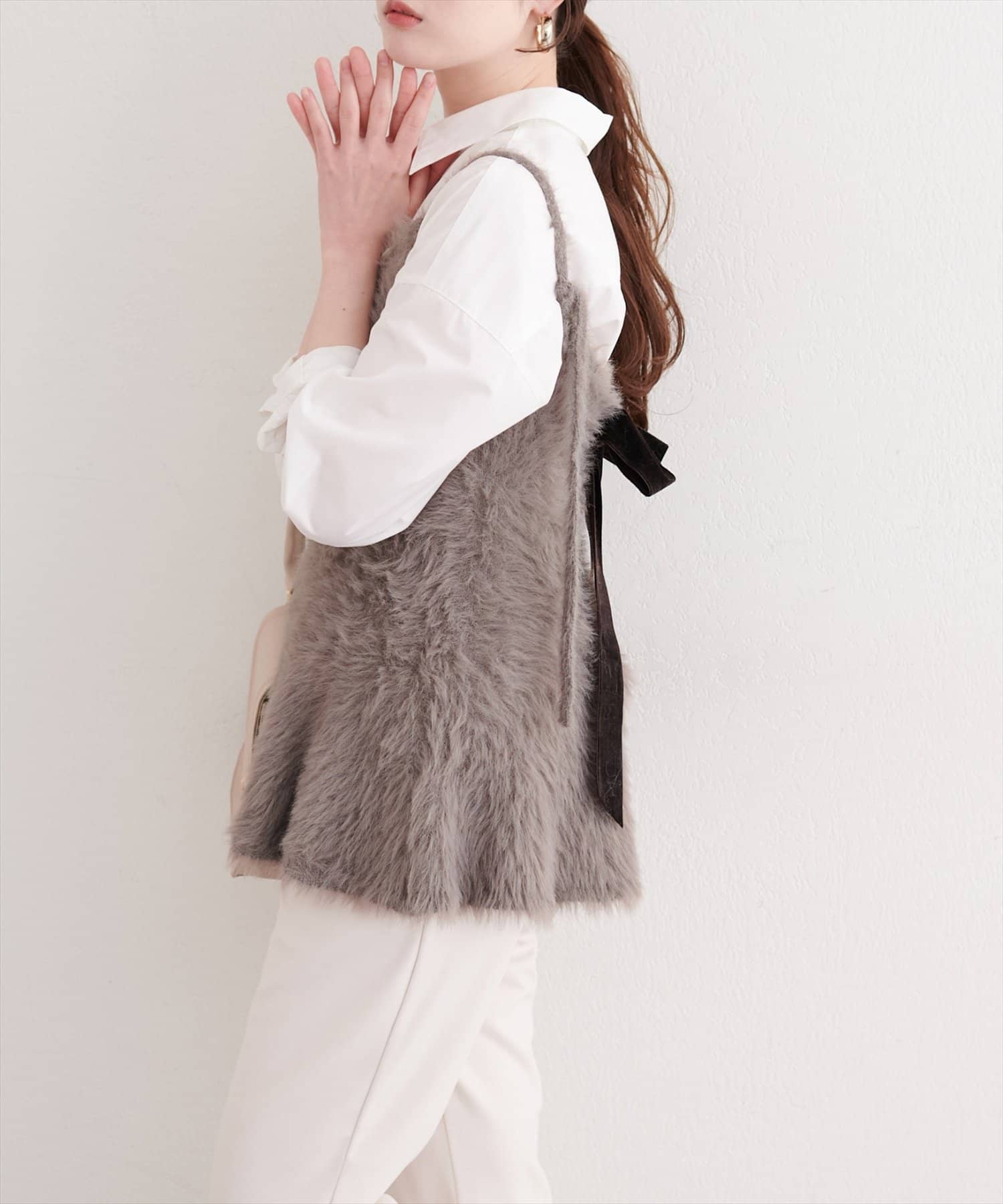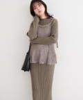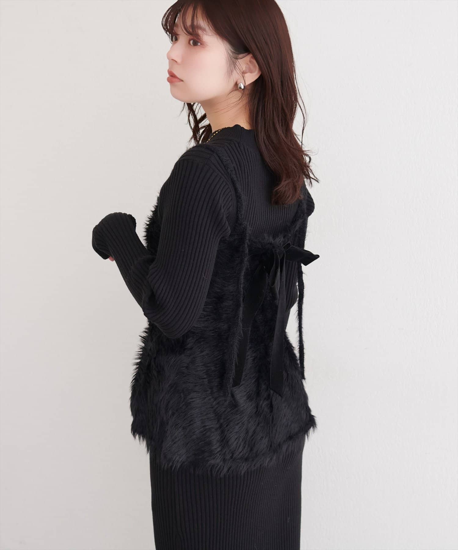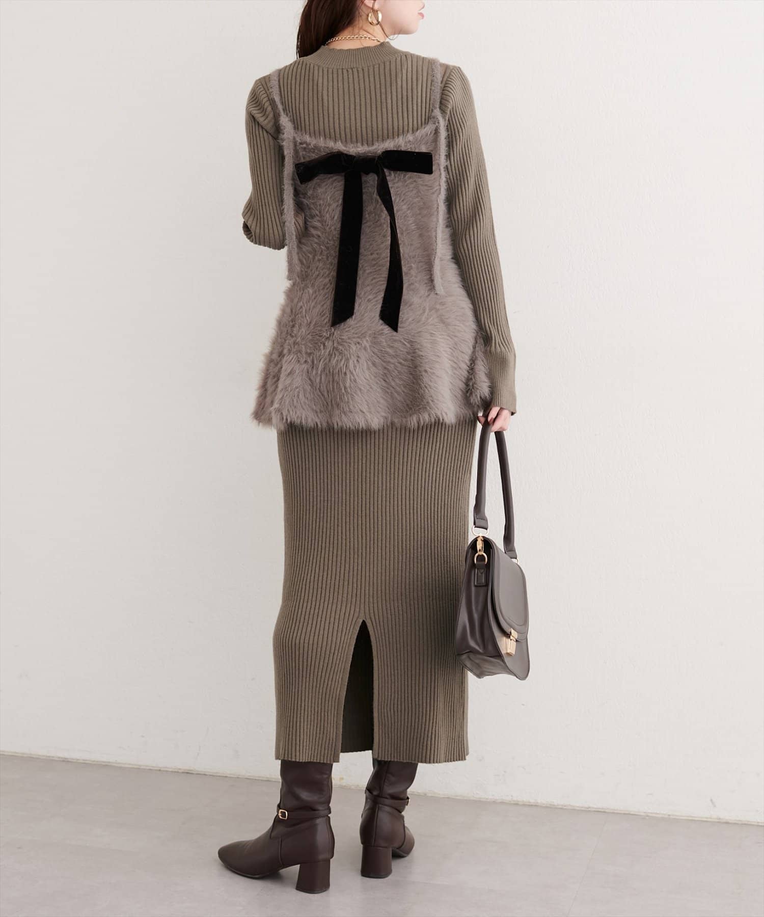 バックリボンが目を惹くペプラムビスチェは、ふわふわとした素材感が、ニットワンピースに奥行きと立体感をプラス。