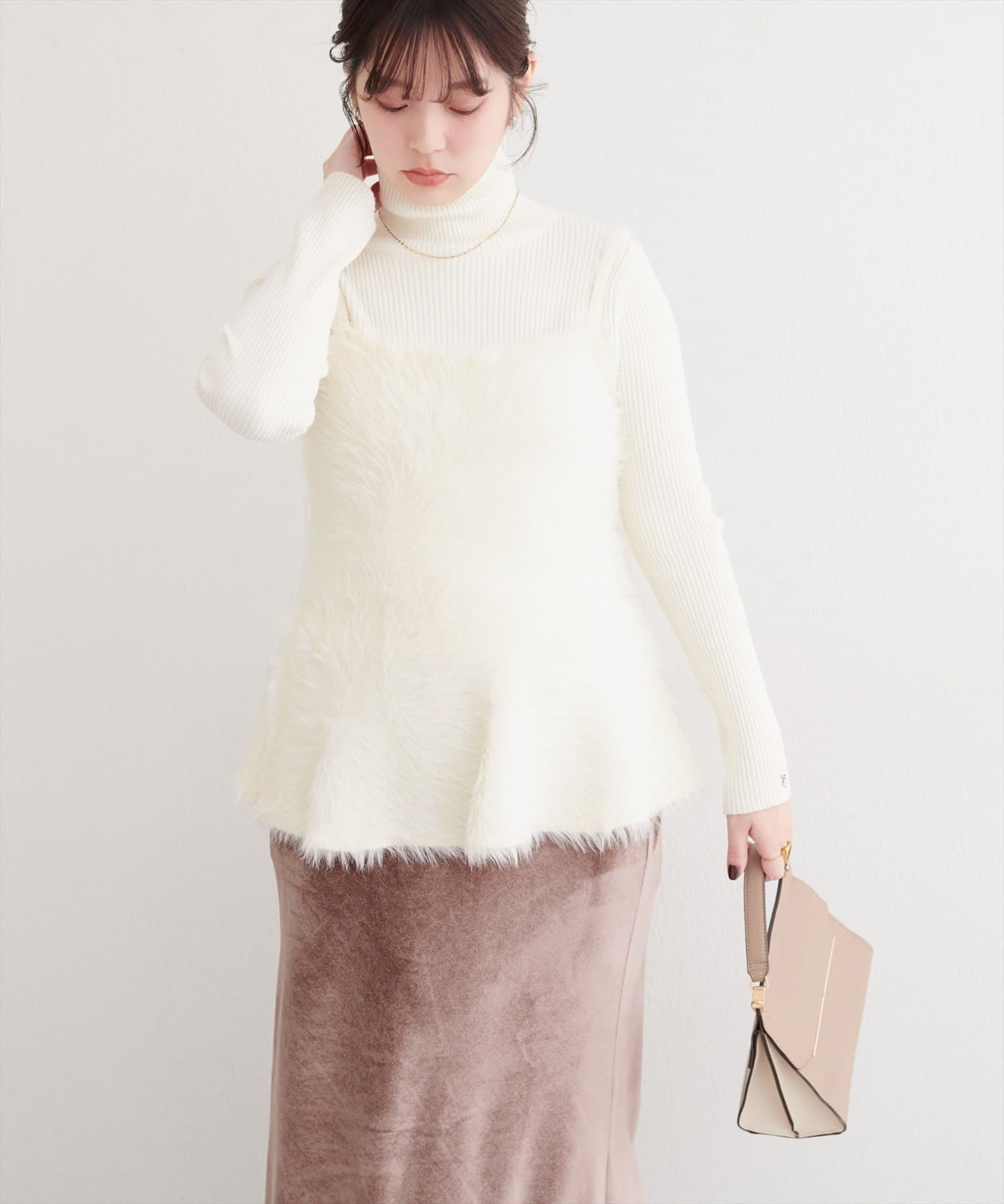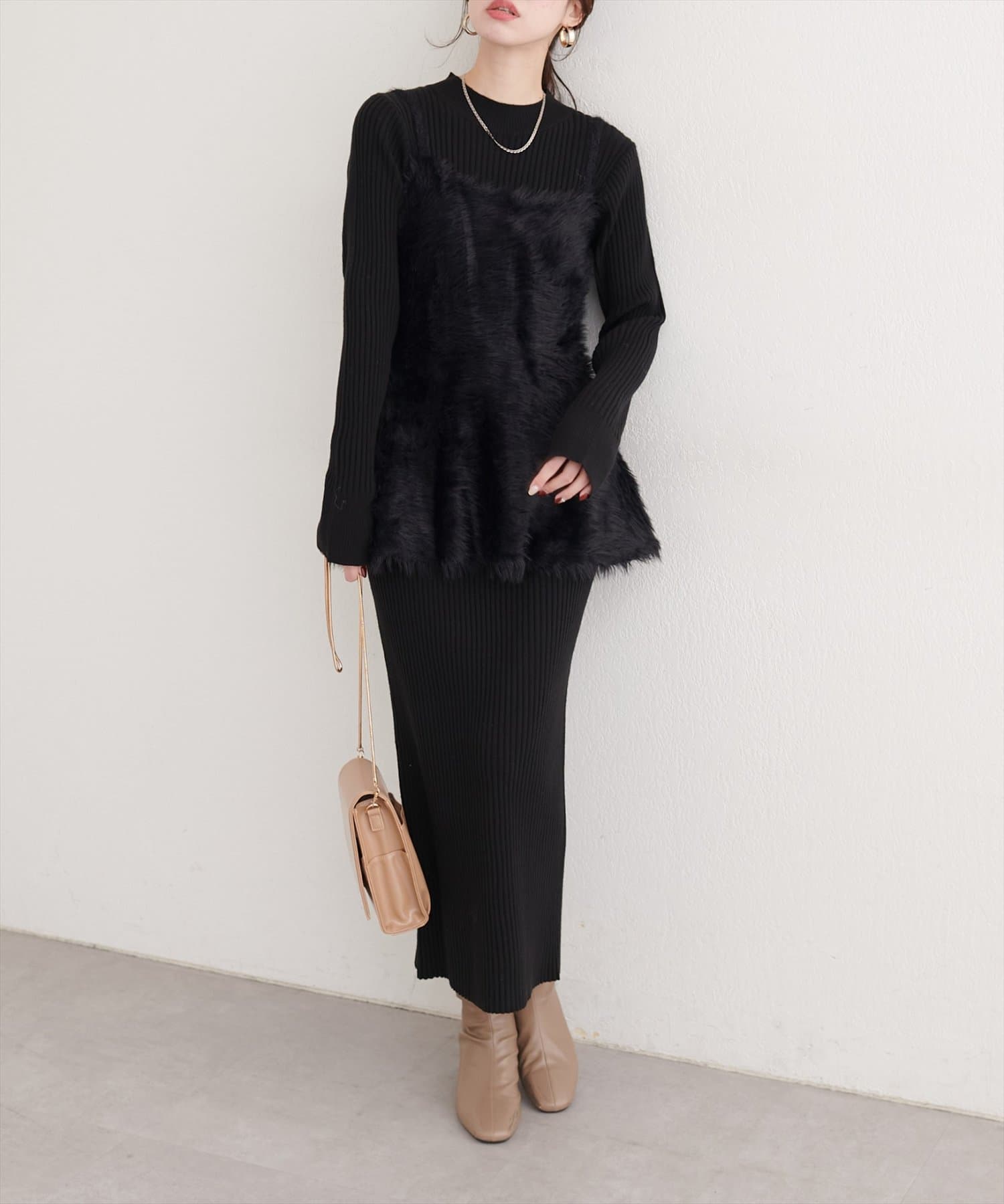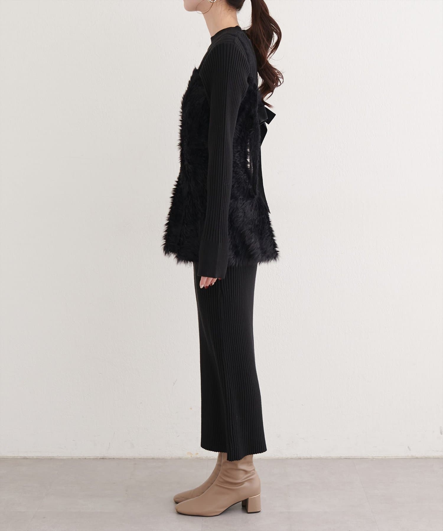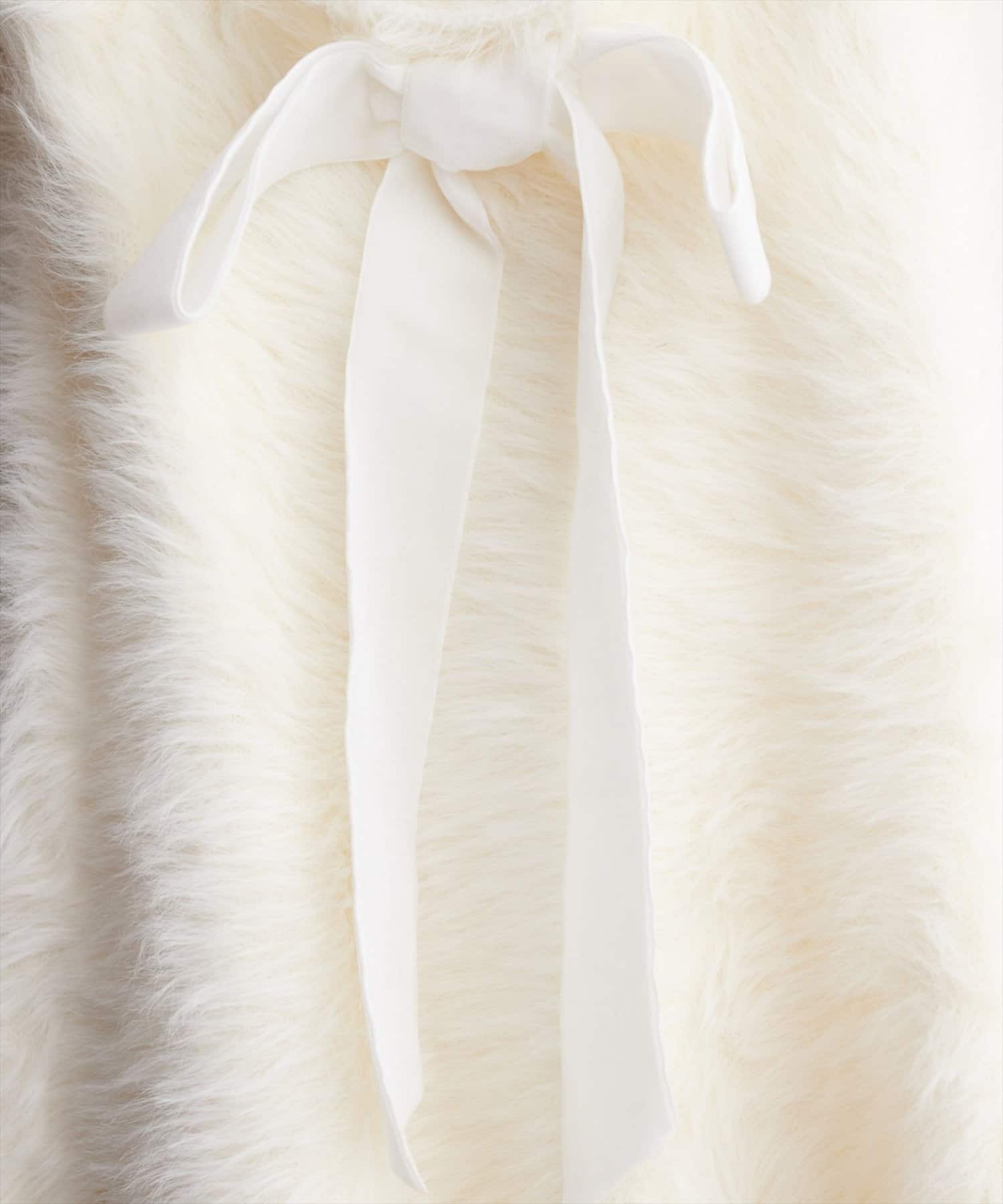 バックリボンが目を惹くペプラムビスチェは、ふわふわとした素材感が、ニットワンピースに奥行きと立体感をプラス。