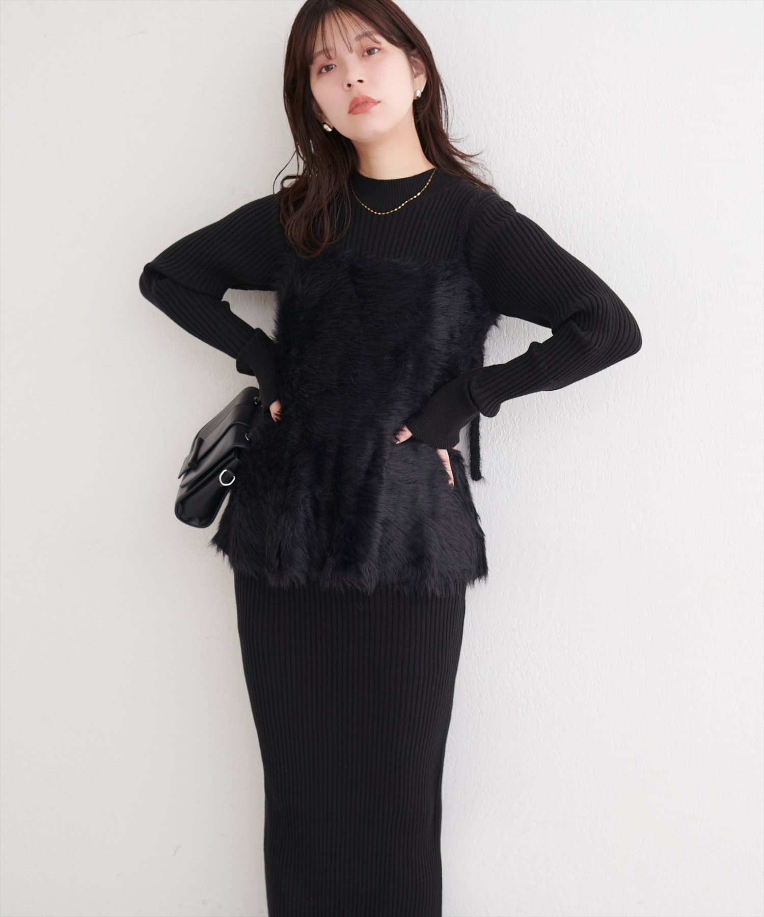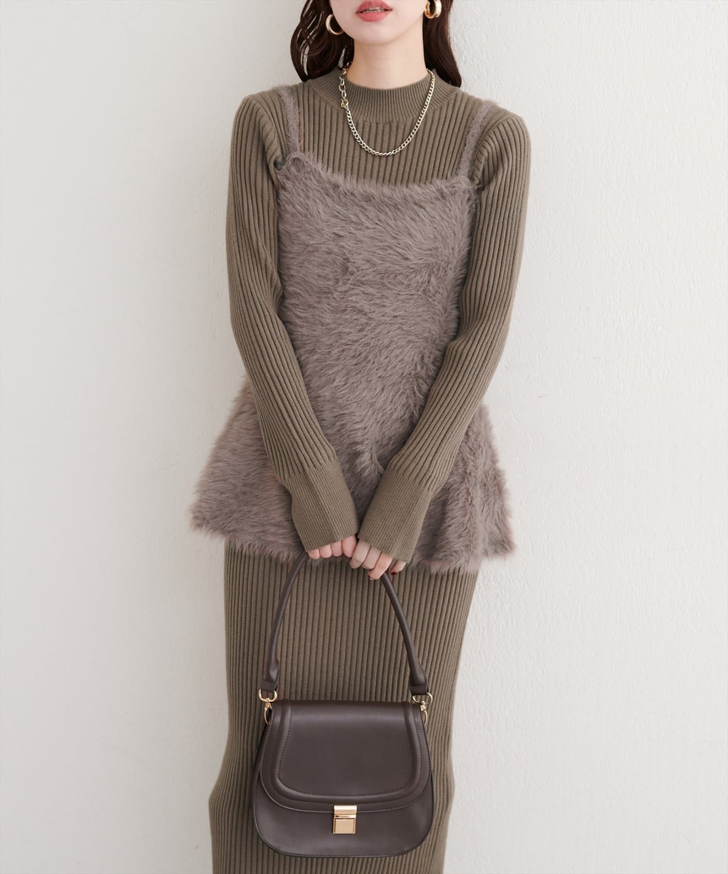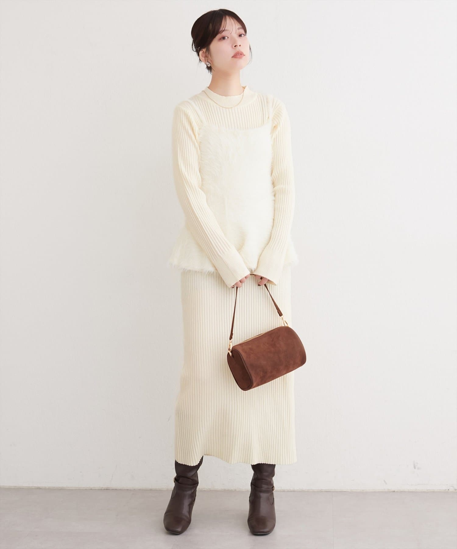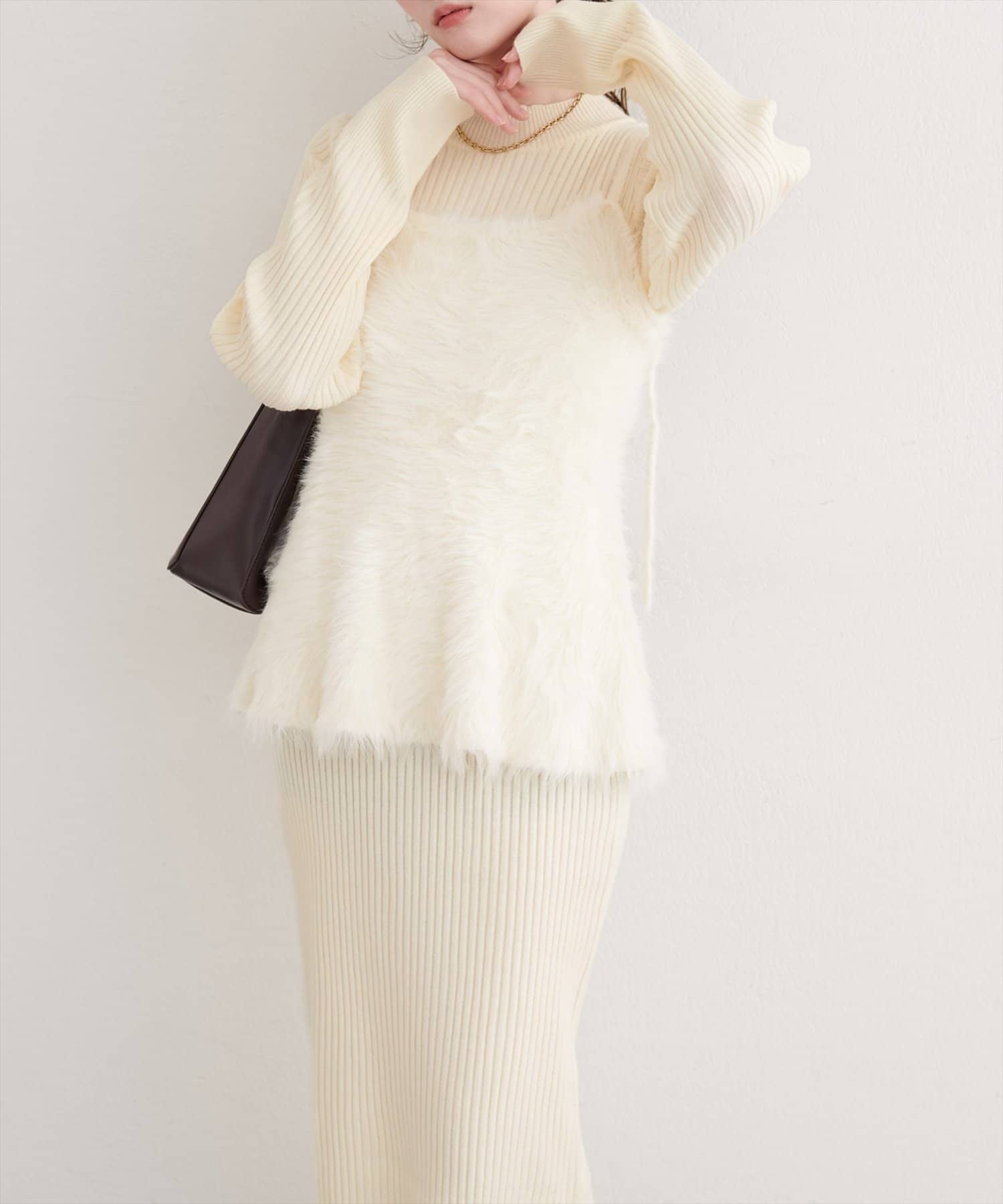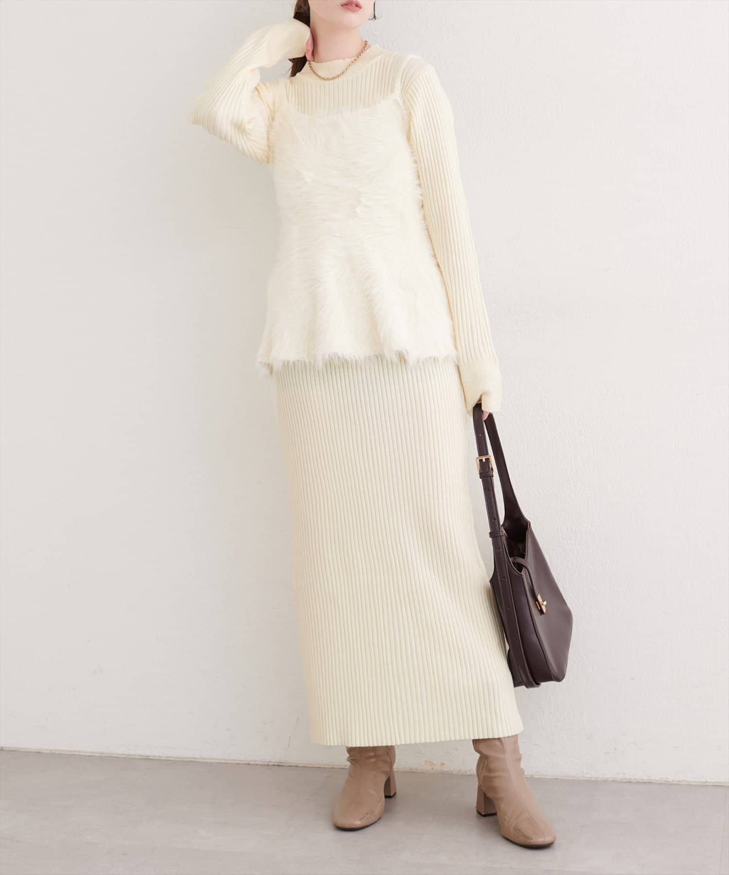 バックリボンが目を惹くペプラムビスチェは、ふわふわとした素材感が、ニットワンピースに奥行きと立体感をプラス。
